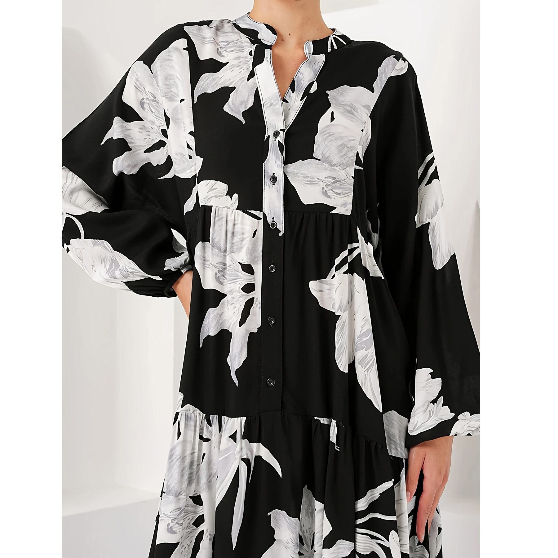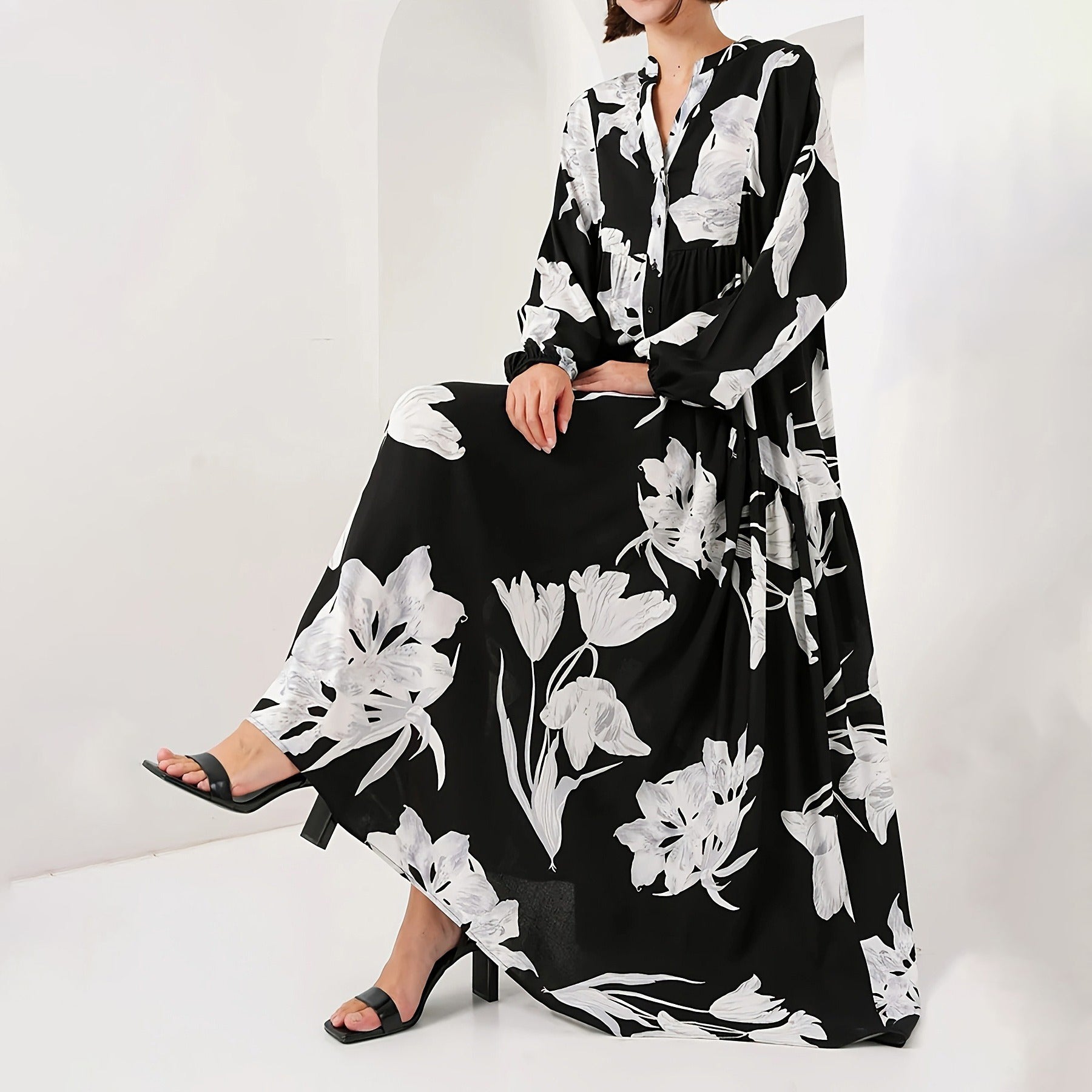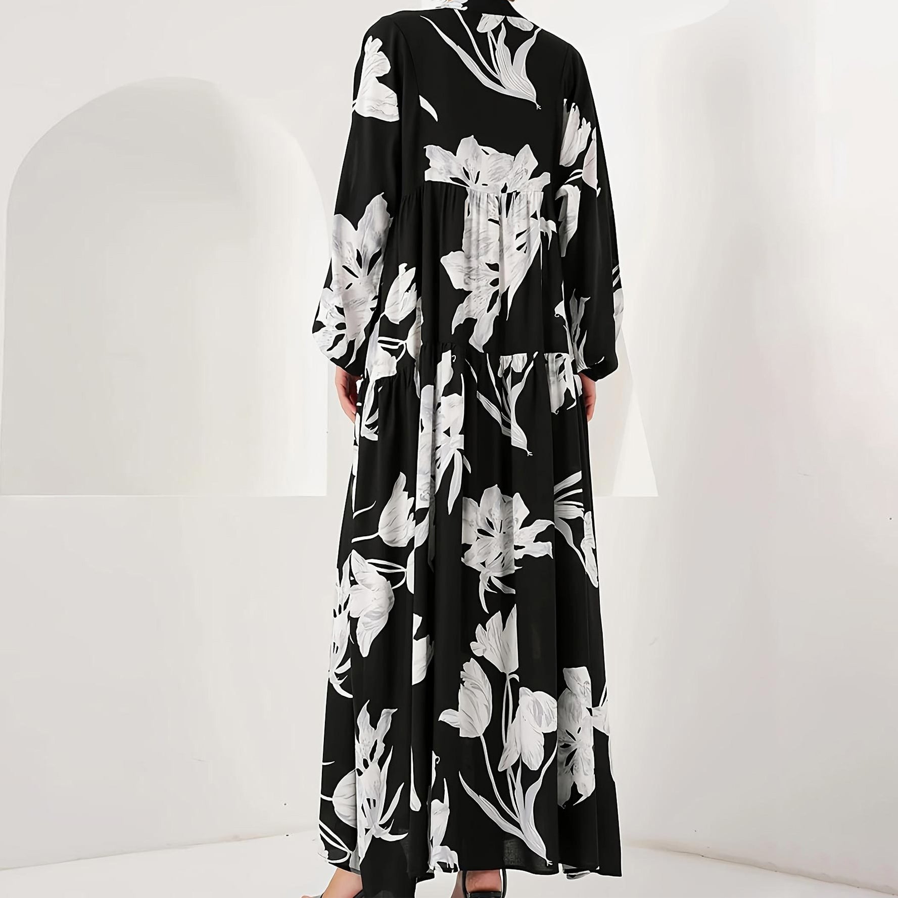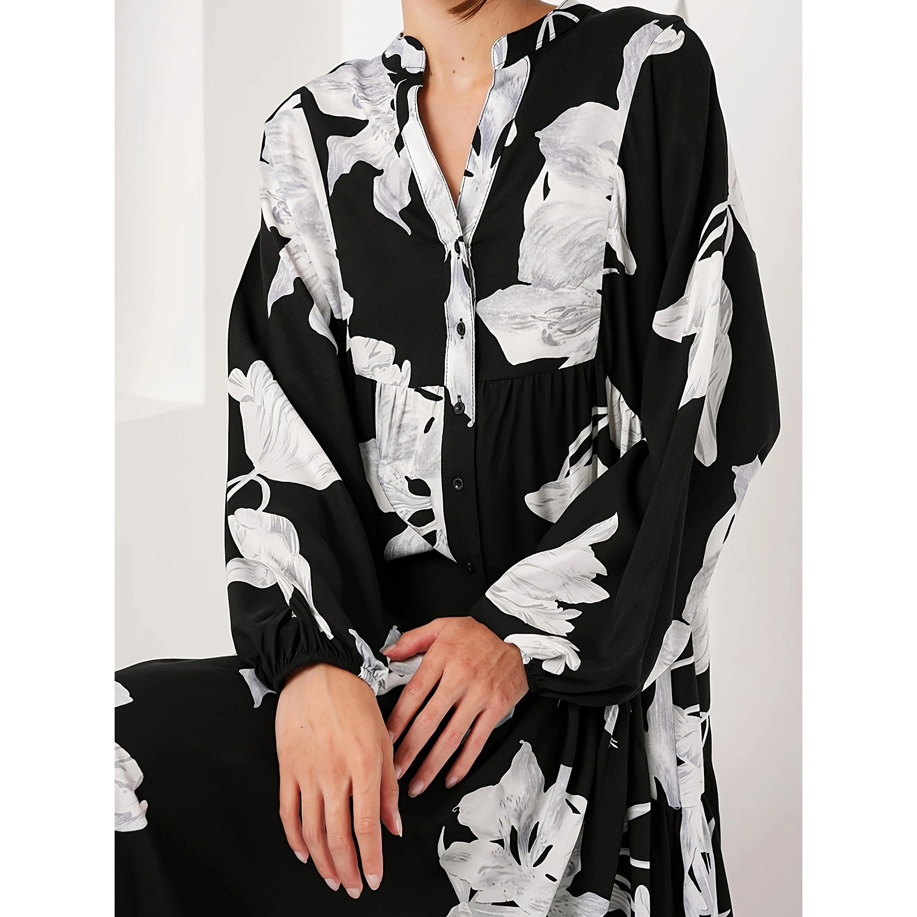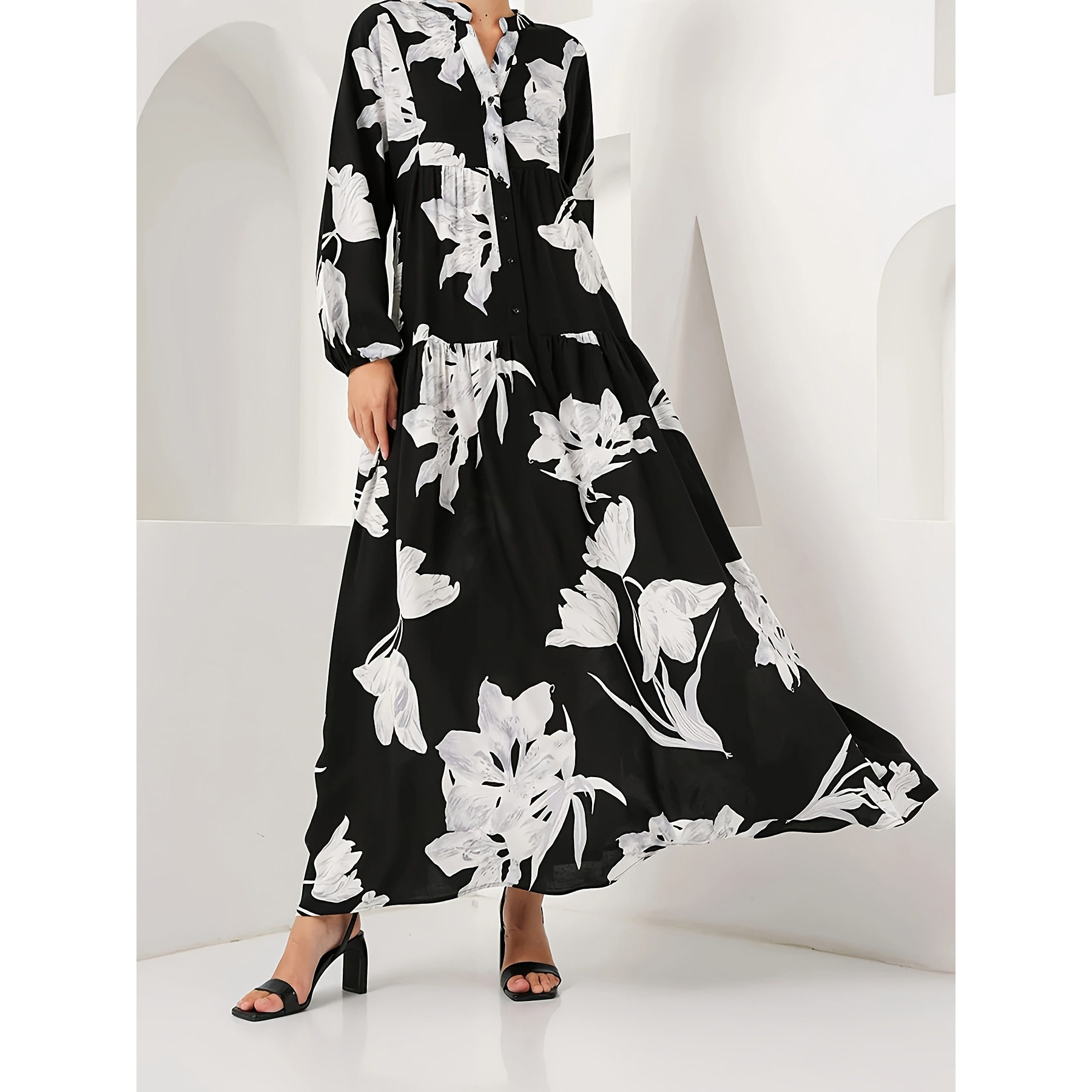 【商品名】【ワンピース】春夏 ブラック 花柄 長袖 ロングワンピース エレガント フレンチ【SHシリーズ】