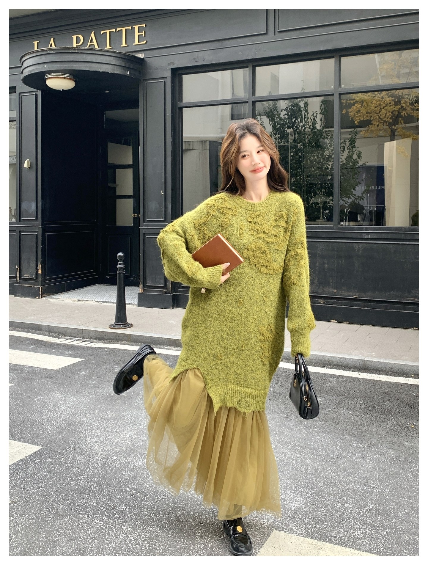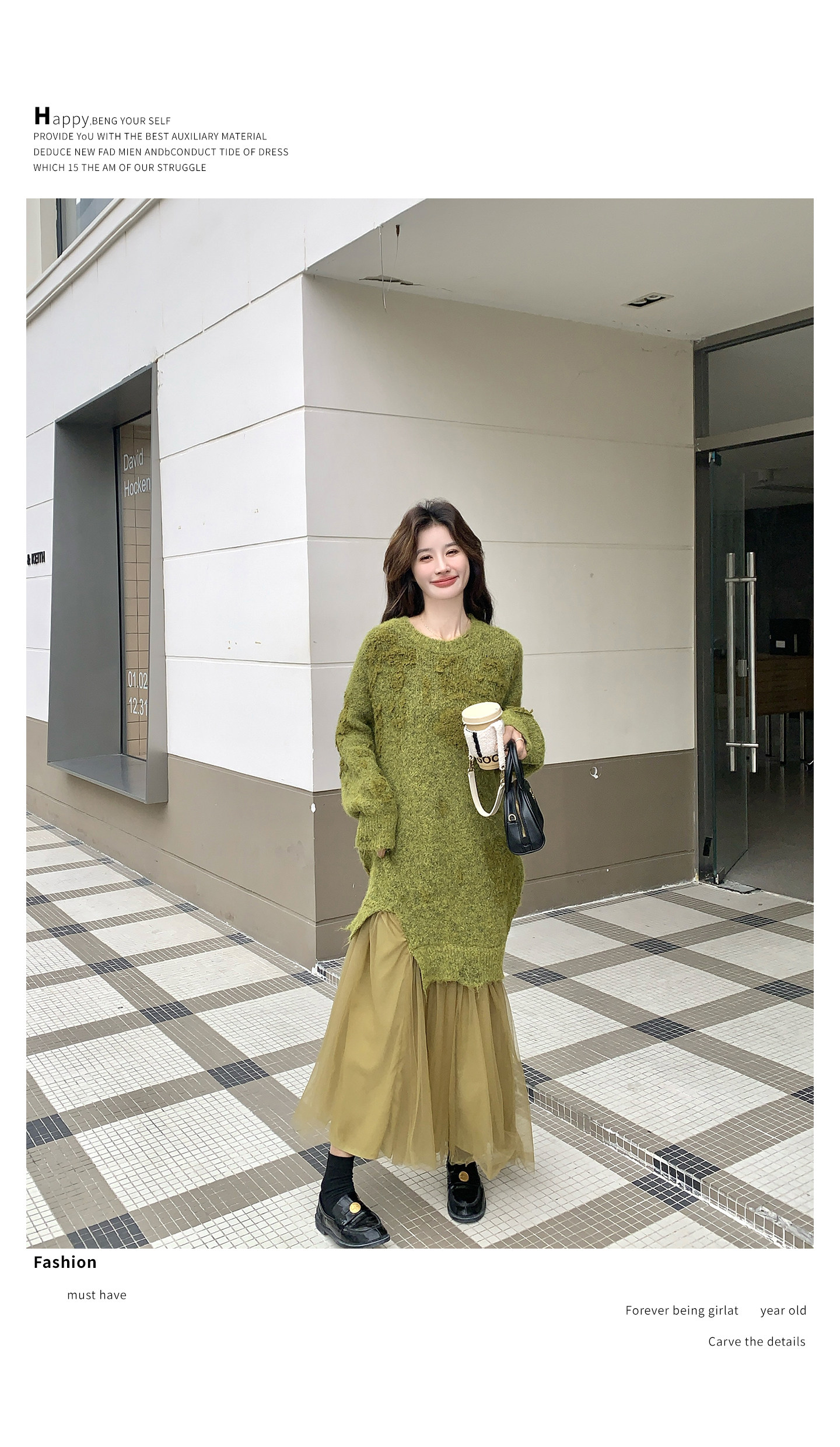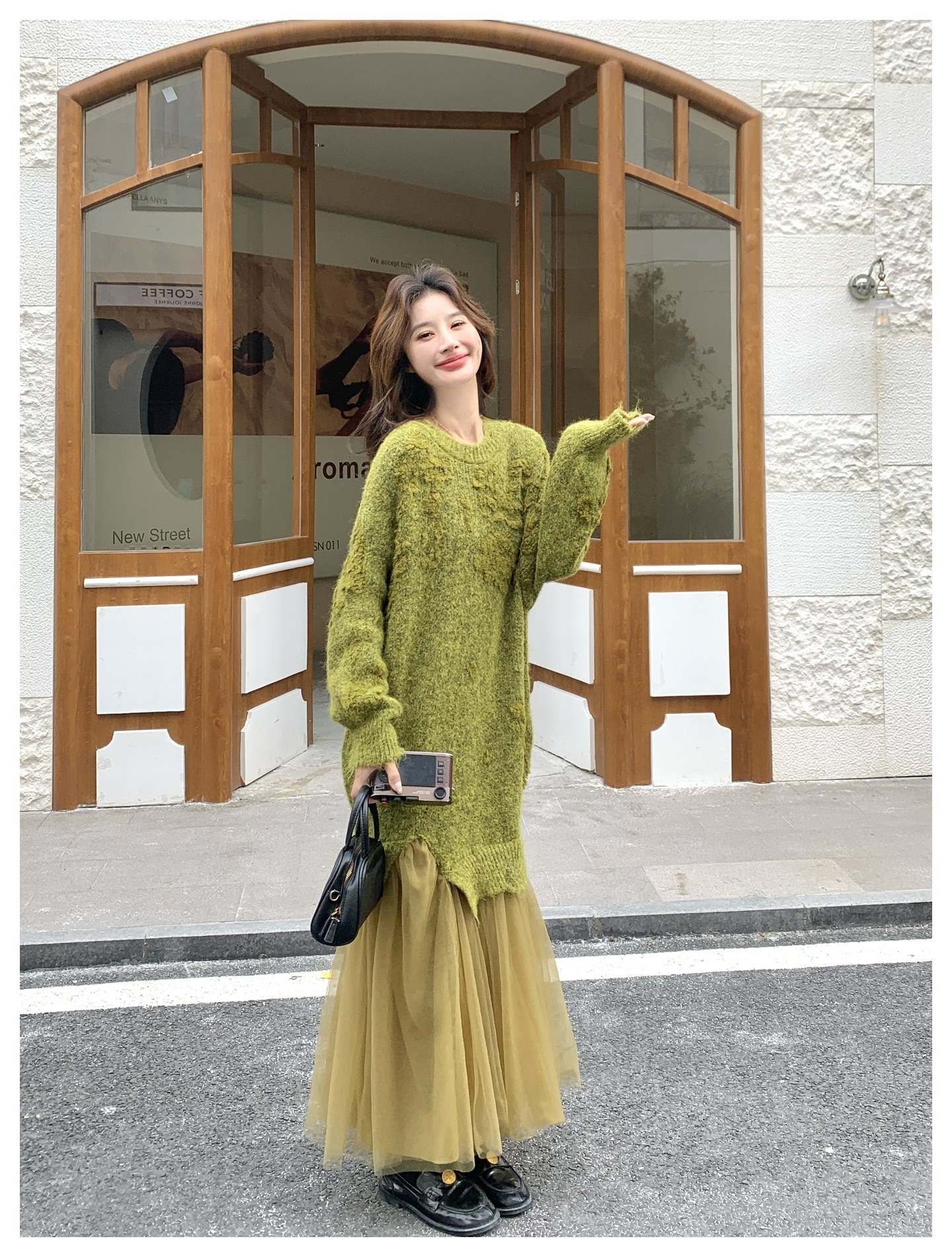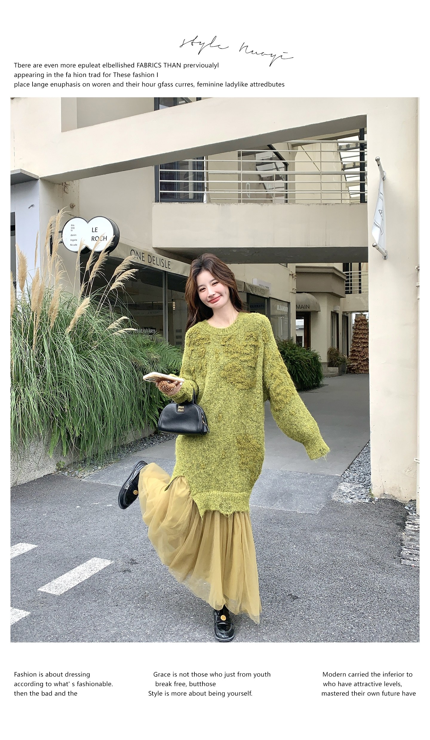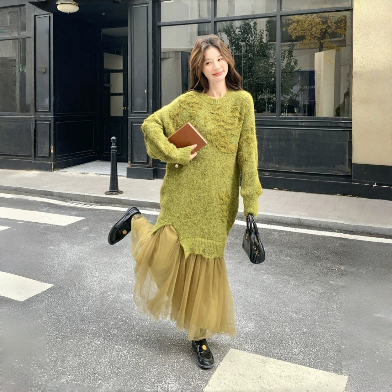【60%OFF⭐️早い者勝ち】【ワンピース】春秋ラウンドネック 長袖 ニット パッチワーク ロング 長袖ワンピース