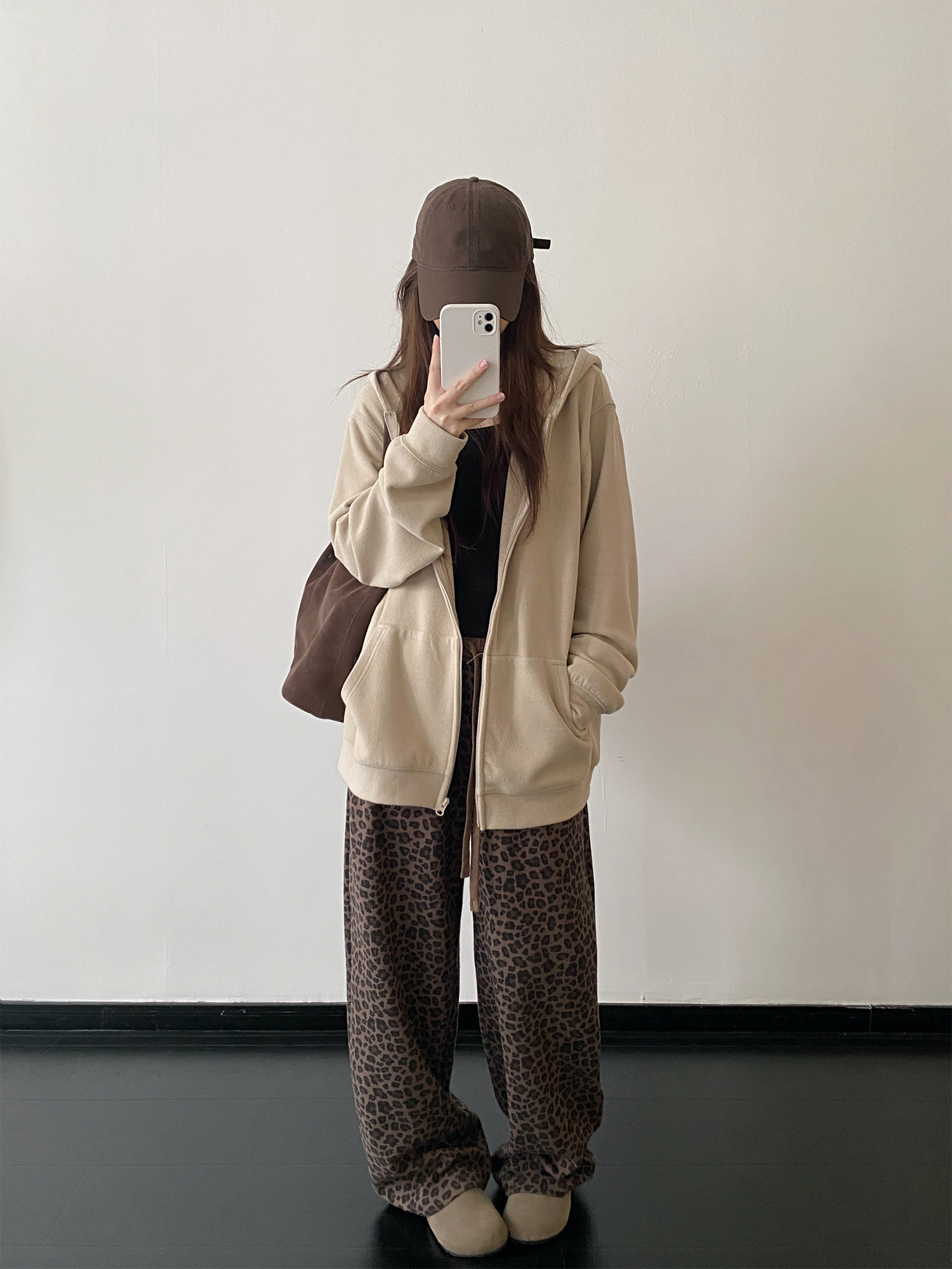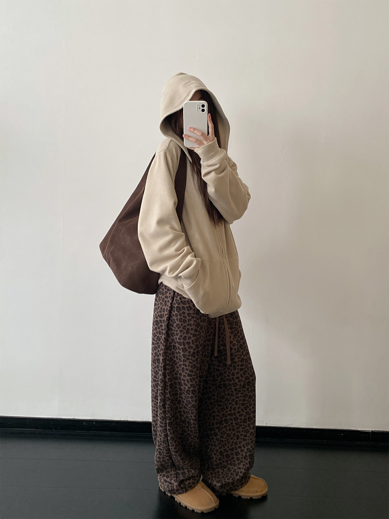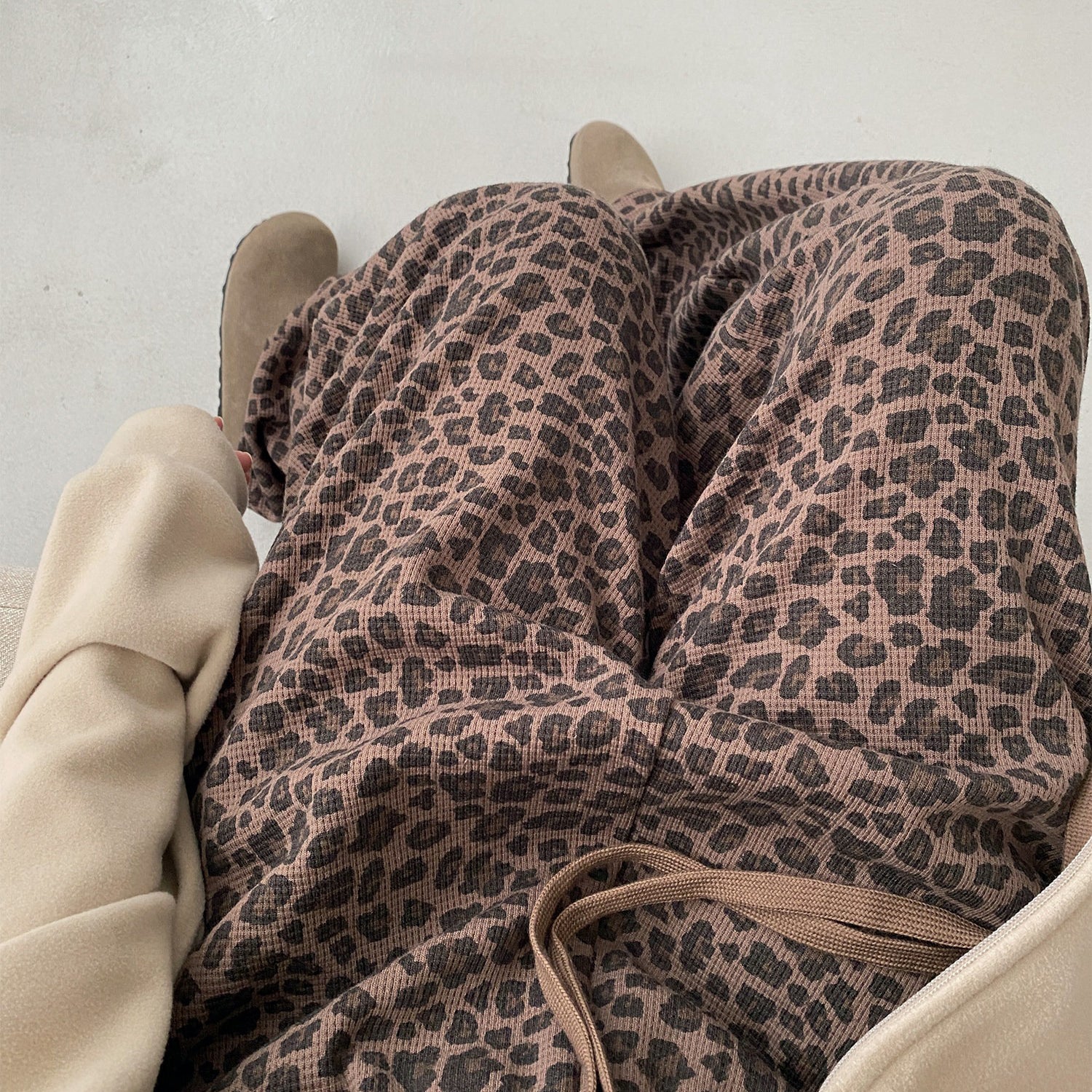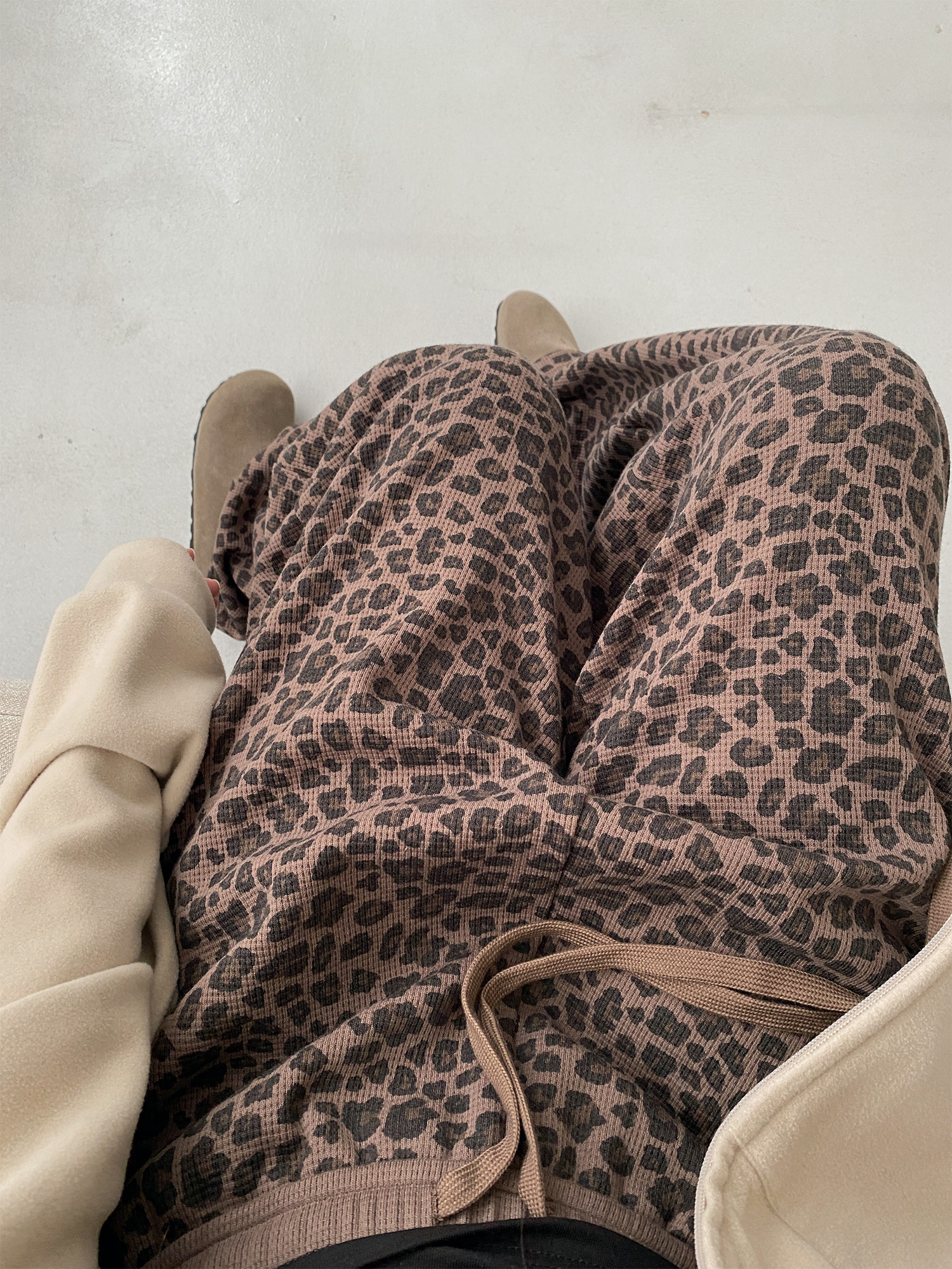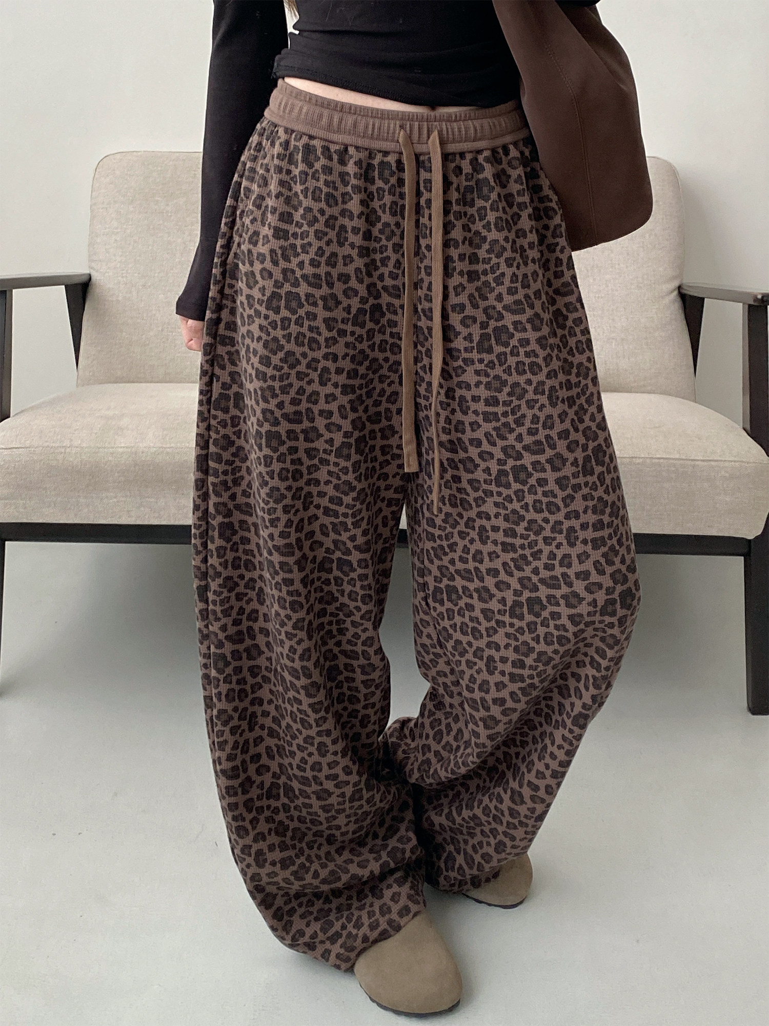 【ボトムス】アメリカンレトロ レオパード柄 ワッフルニット ワイドストレート イージーパンツ ウエストゴム レディース【FCシリーズ】
