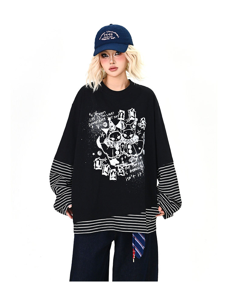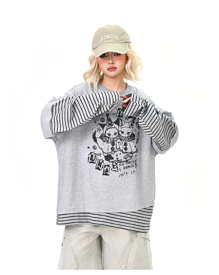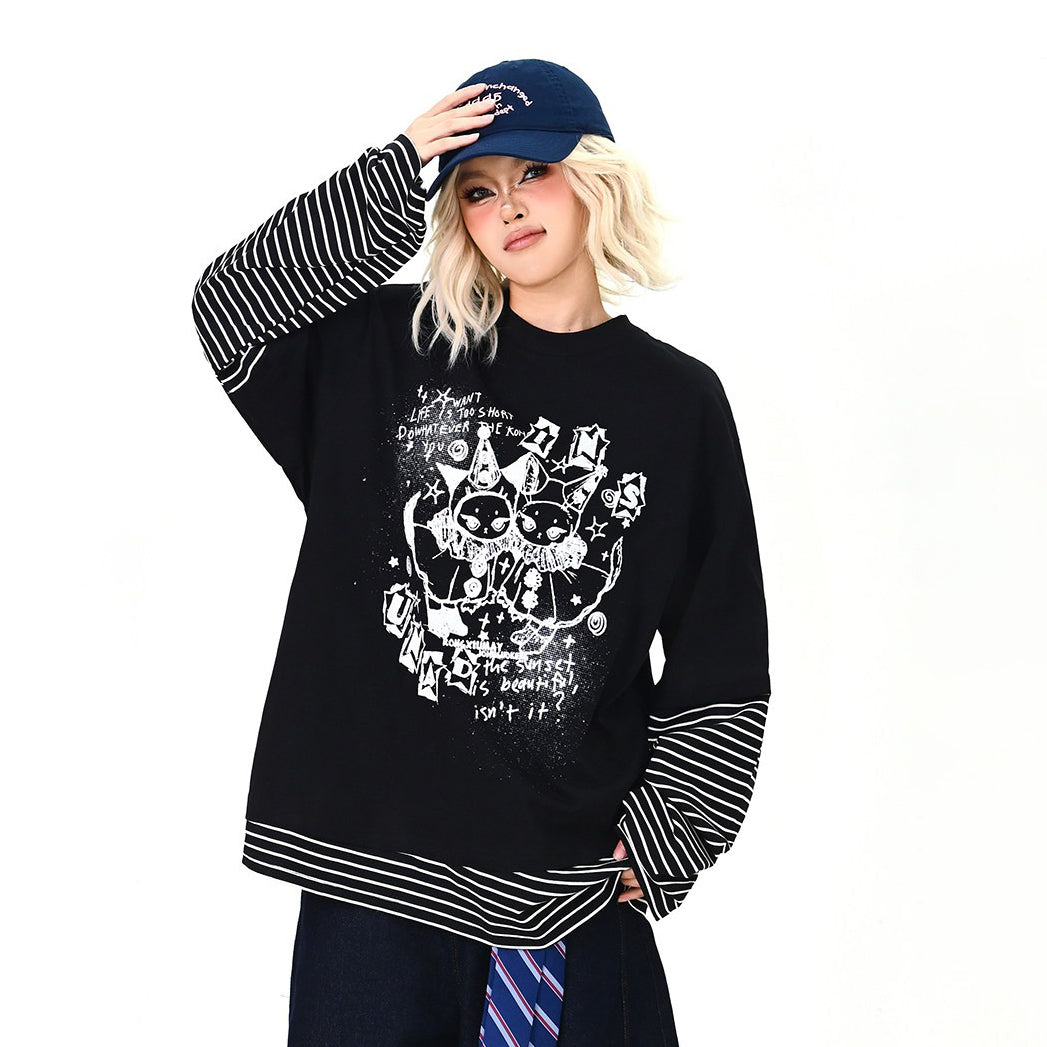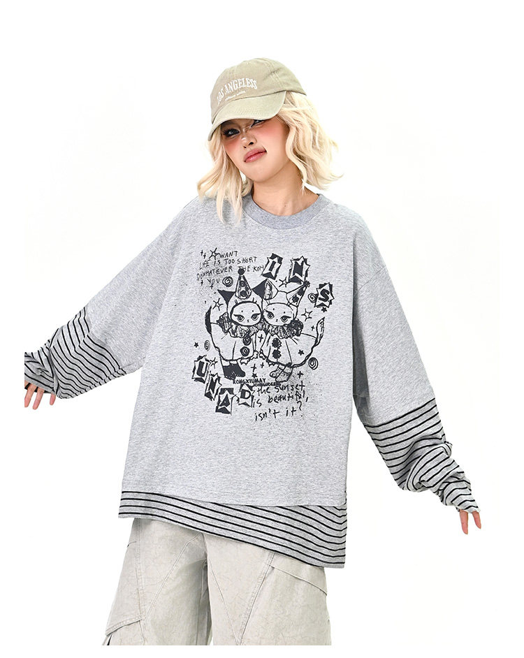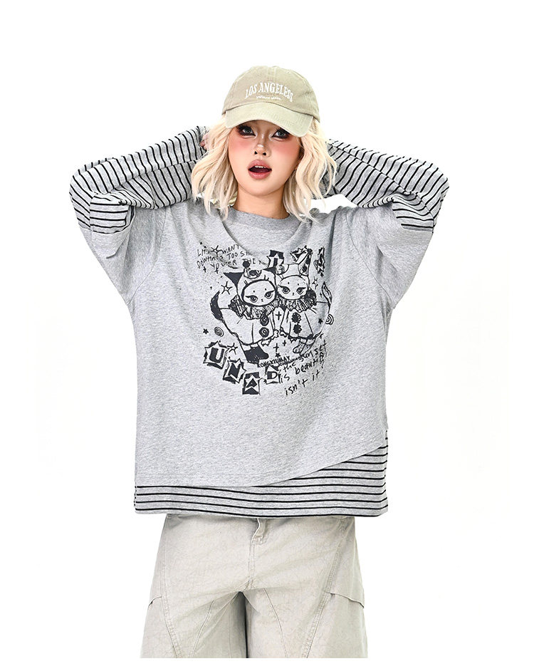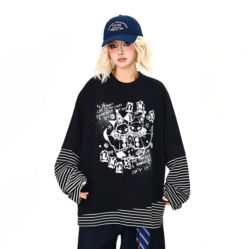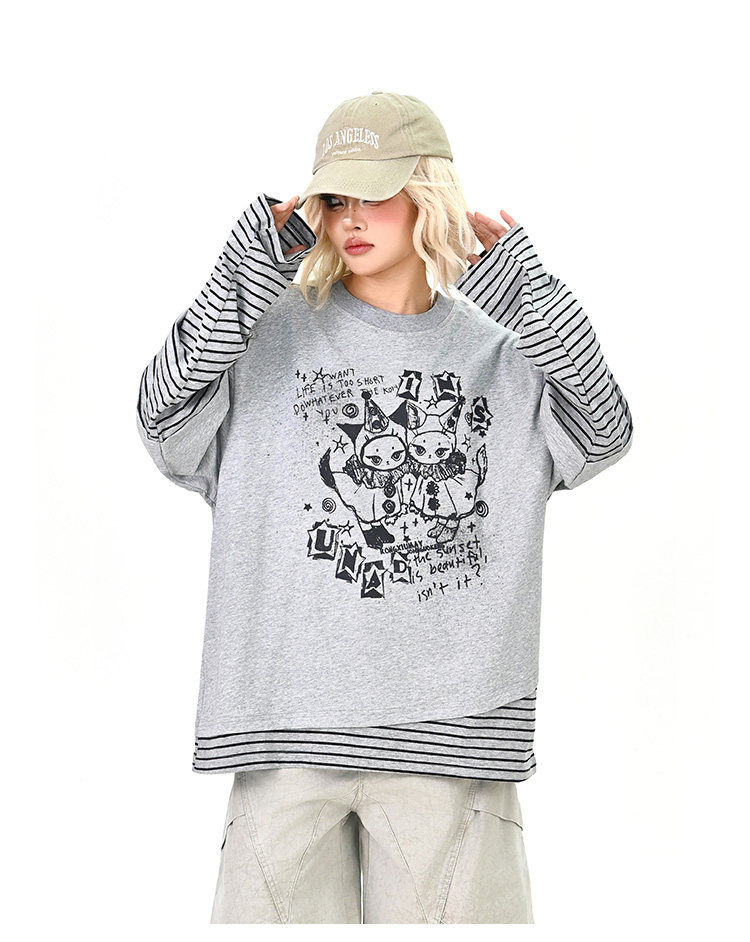 【トップス】レイヤード風 カートゥーン×ボーダー 長袖Tシャツ オーバーサイズ ルーズフィット【FCシリーズ】