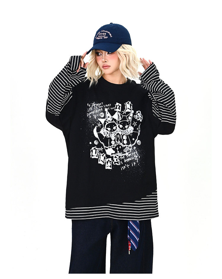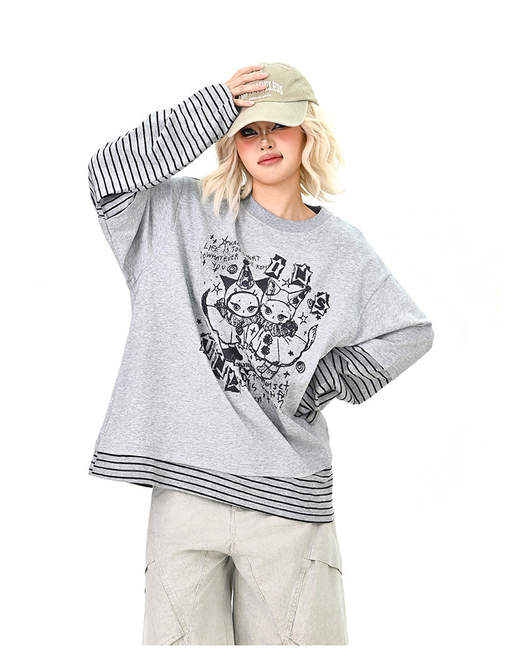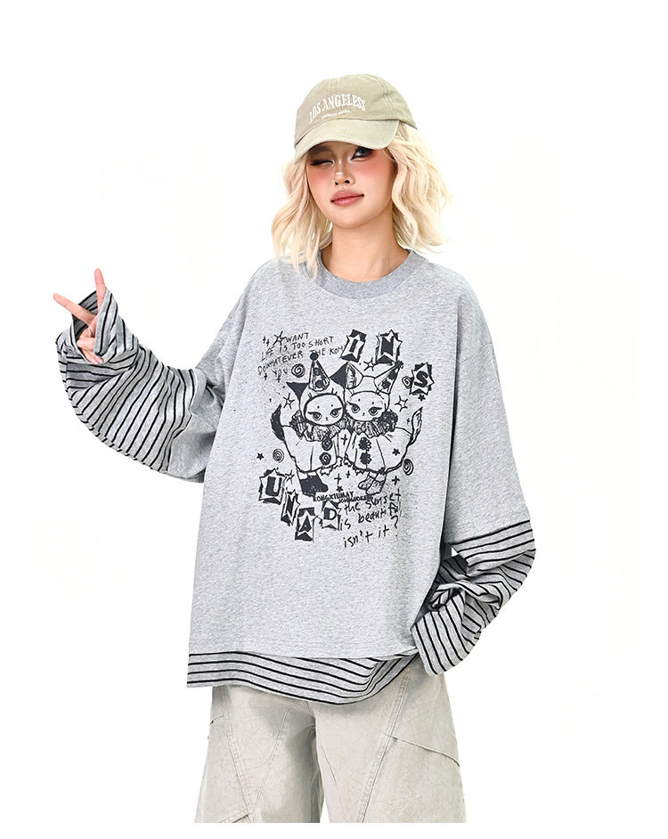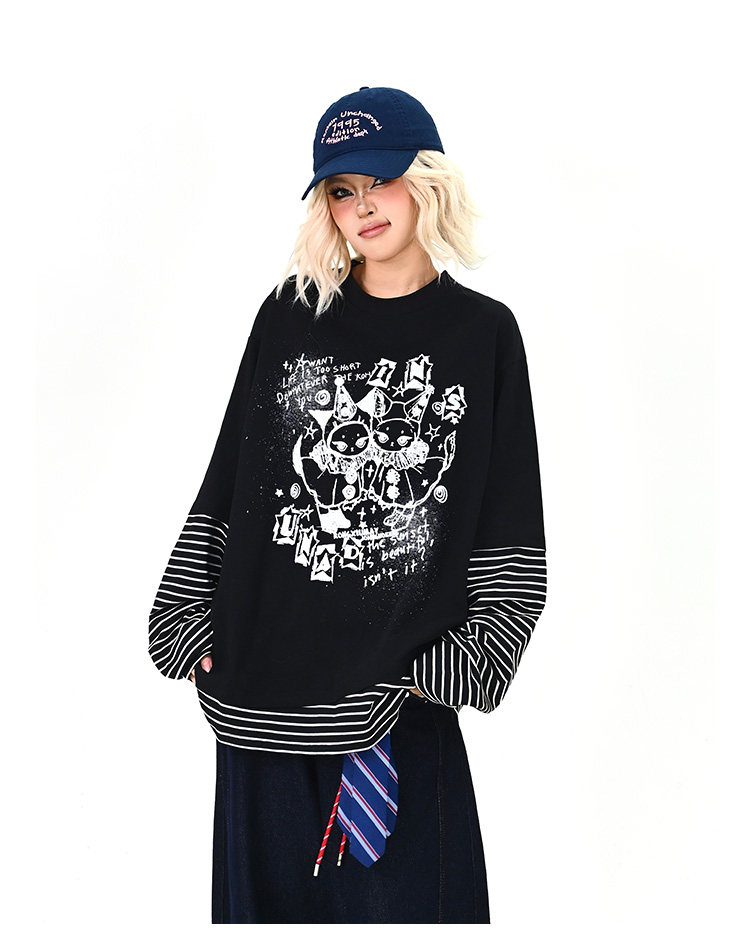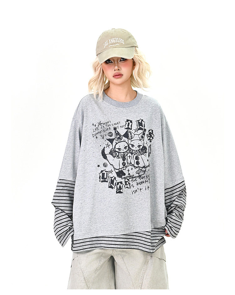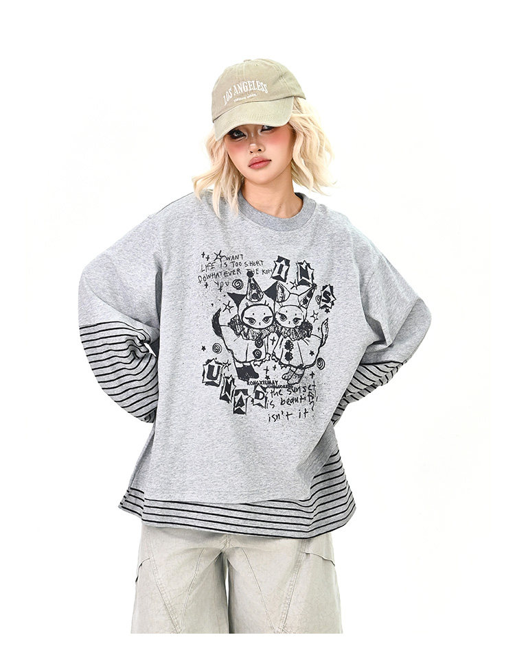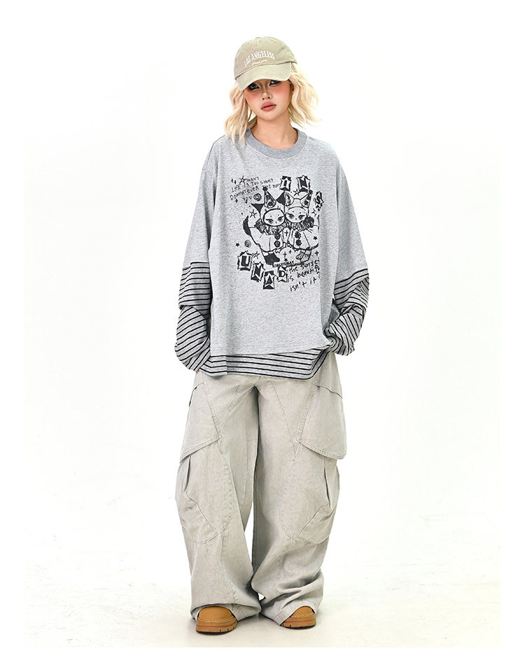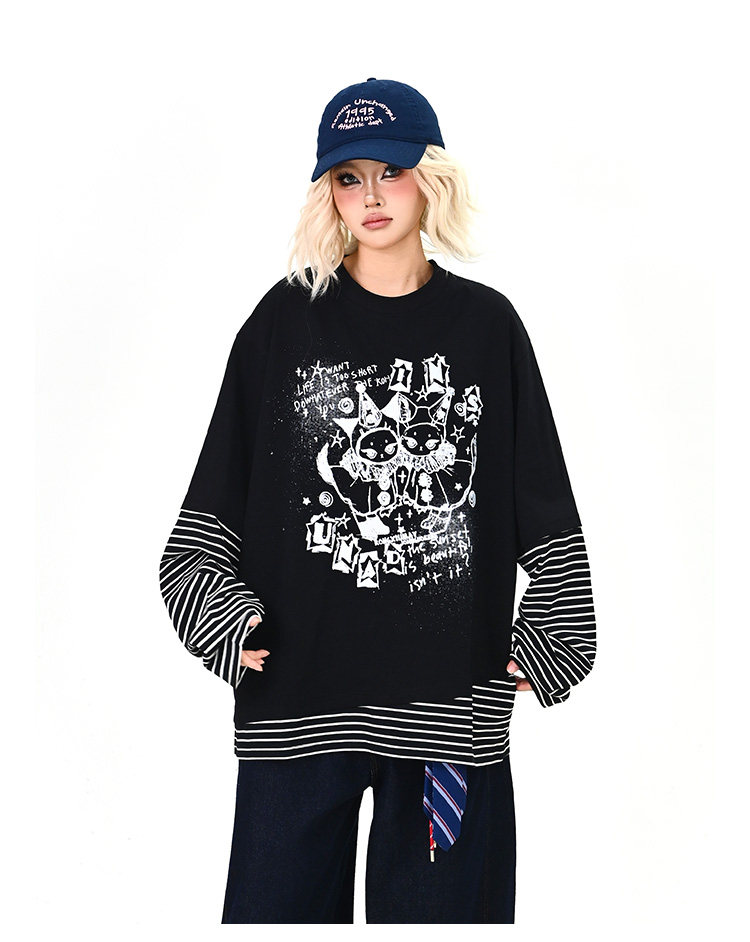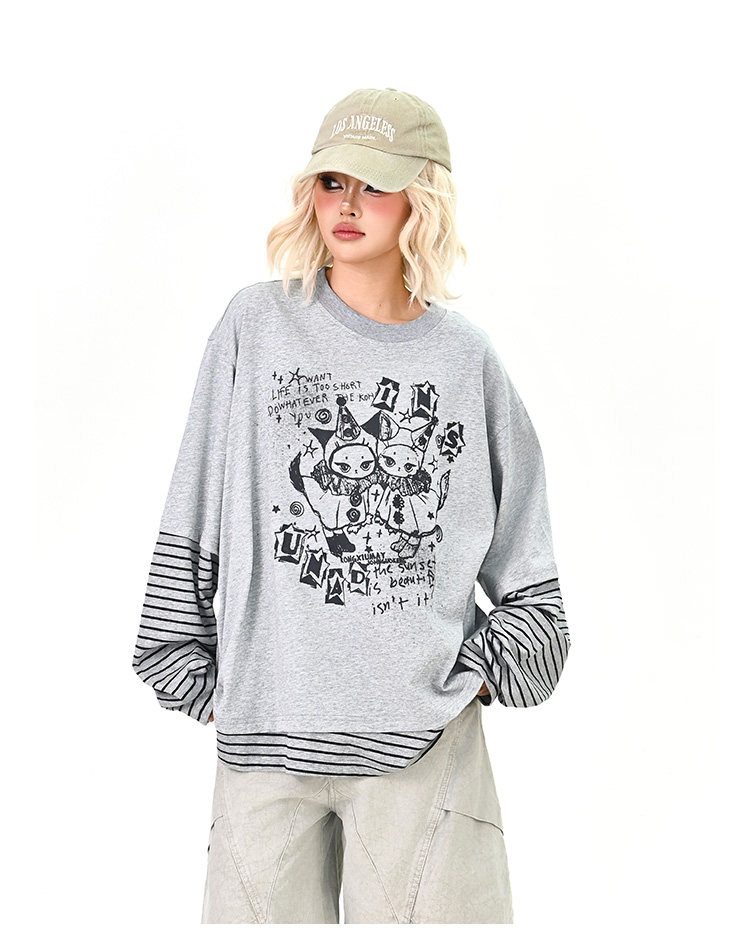 【トップス】レイヤード風 カートゥーン×ボーダー 長袖Tシャツ オーバーサイズ ルーズフィット【FCシリーズ】