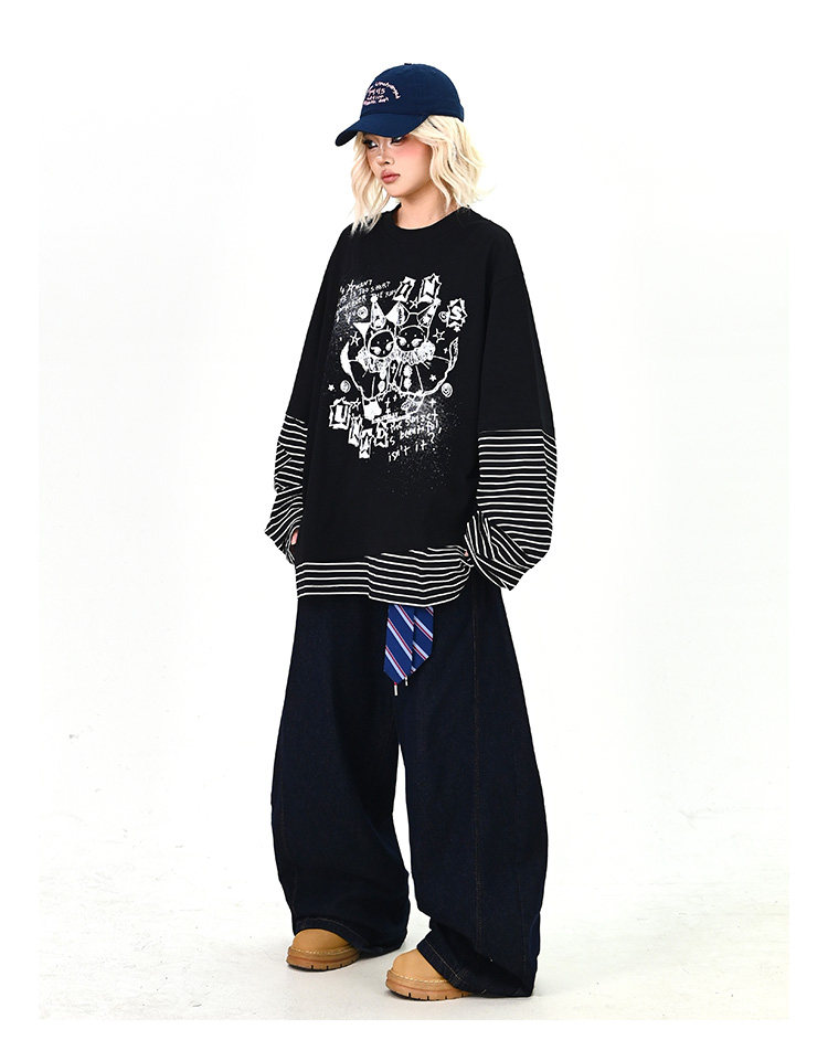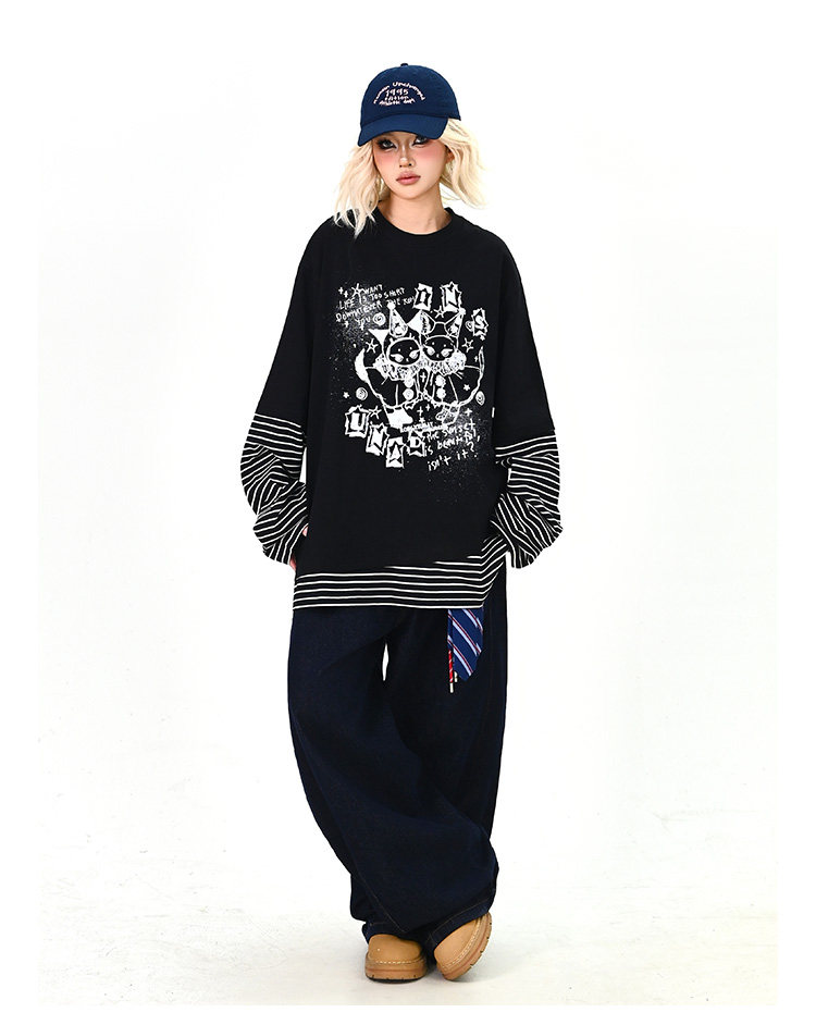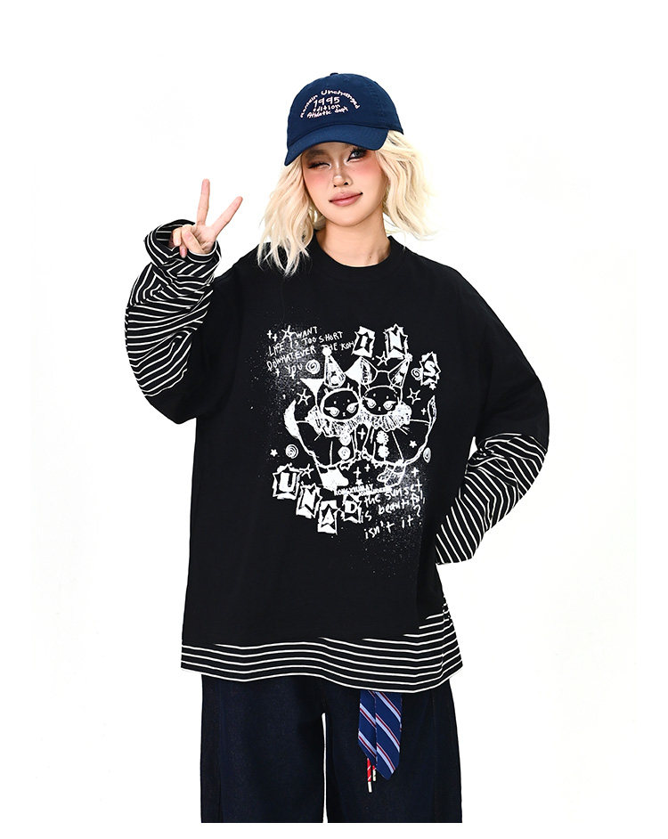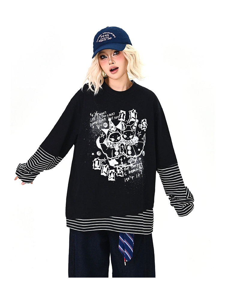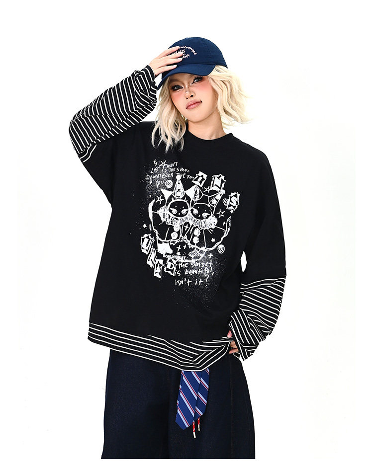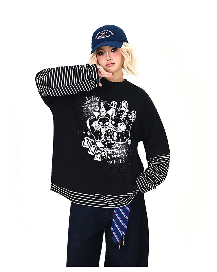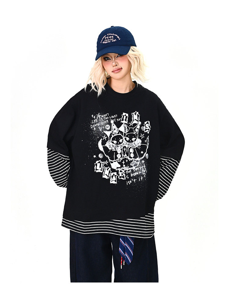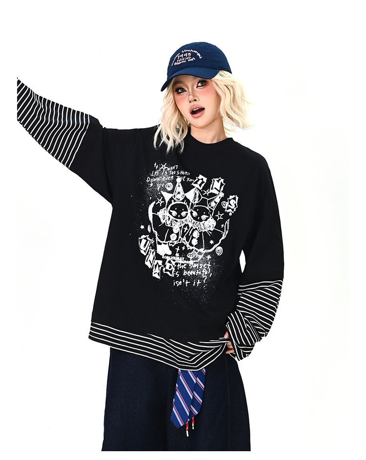 【トップス】レイヤード風 カートゥーン×ボーダー 長袖Tシャツ オーバーサイズ ルーズフィット【FCシリーズ】