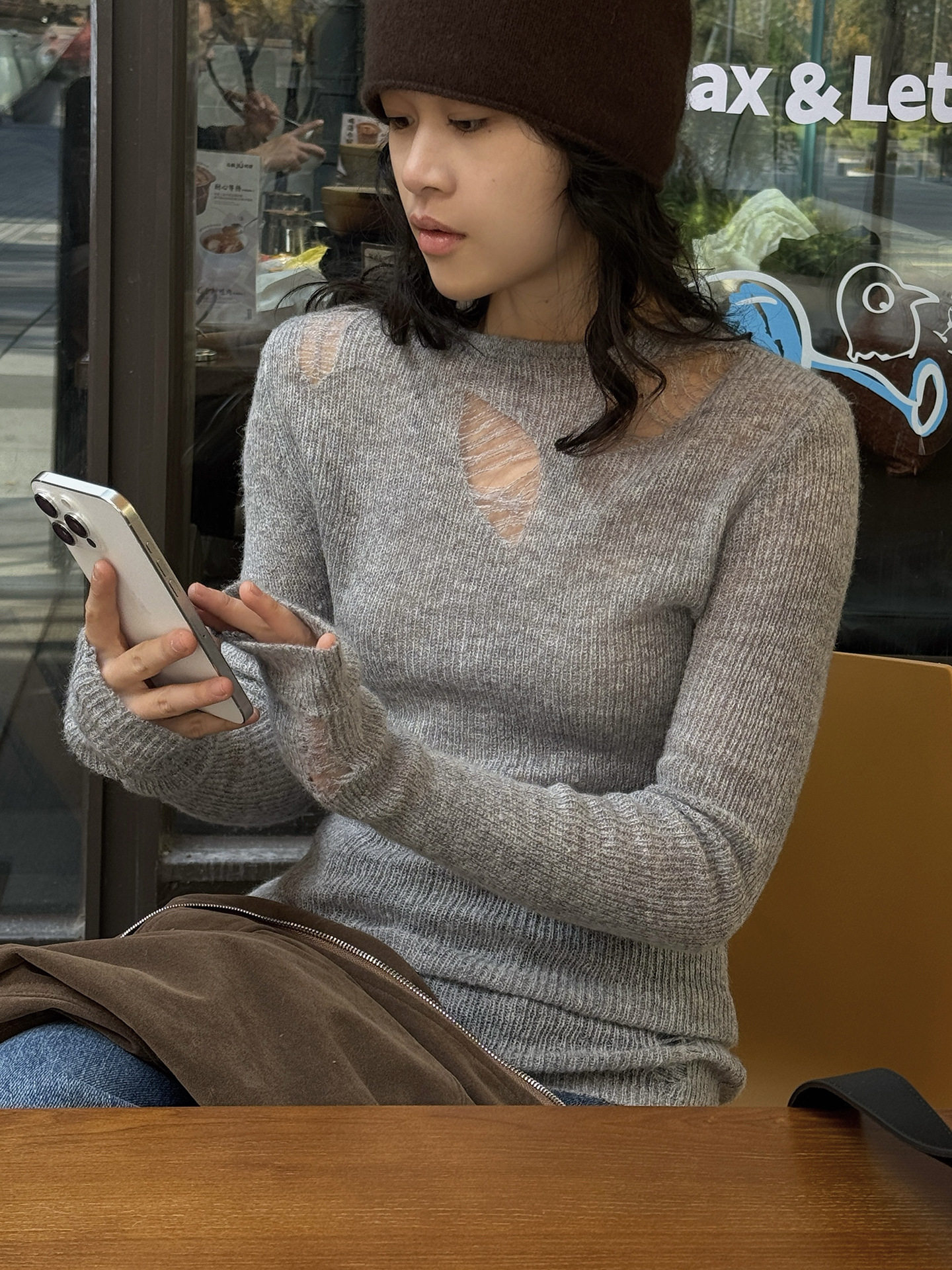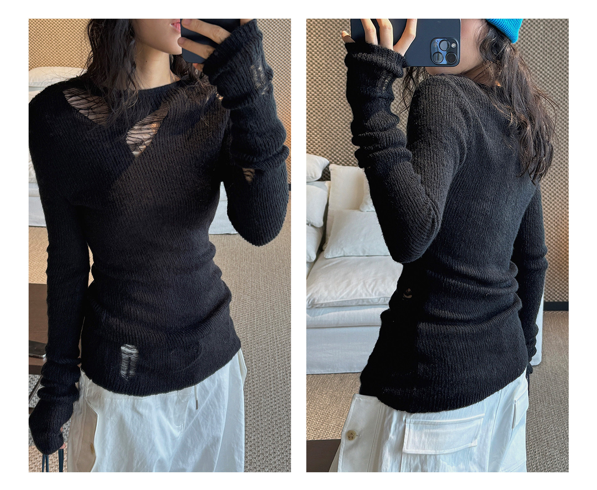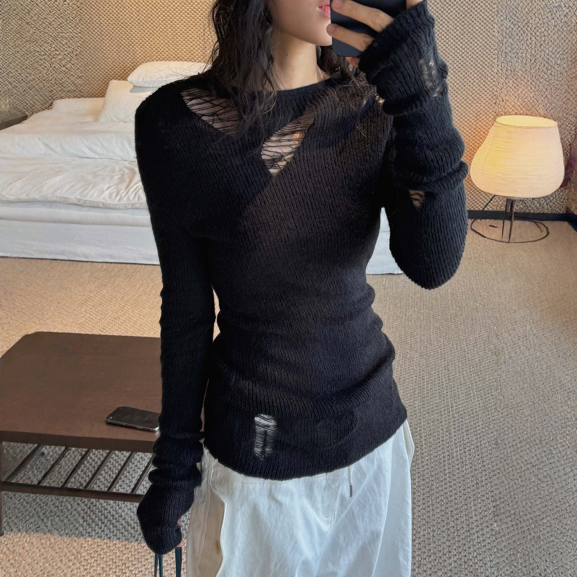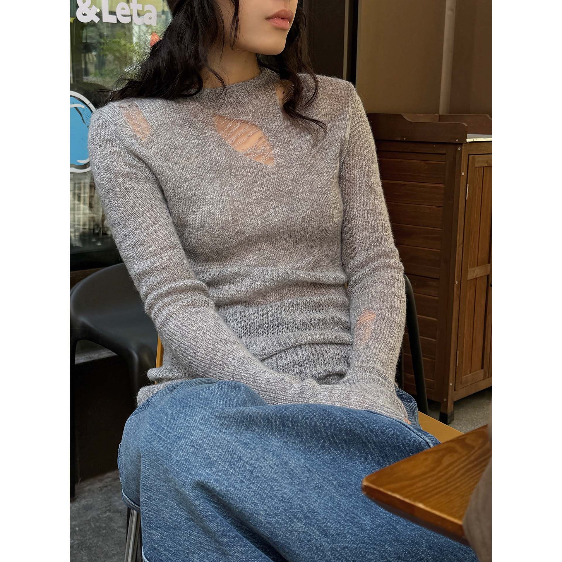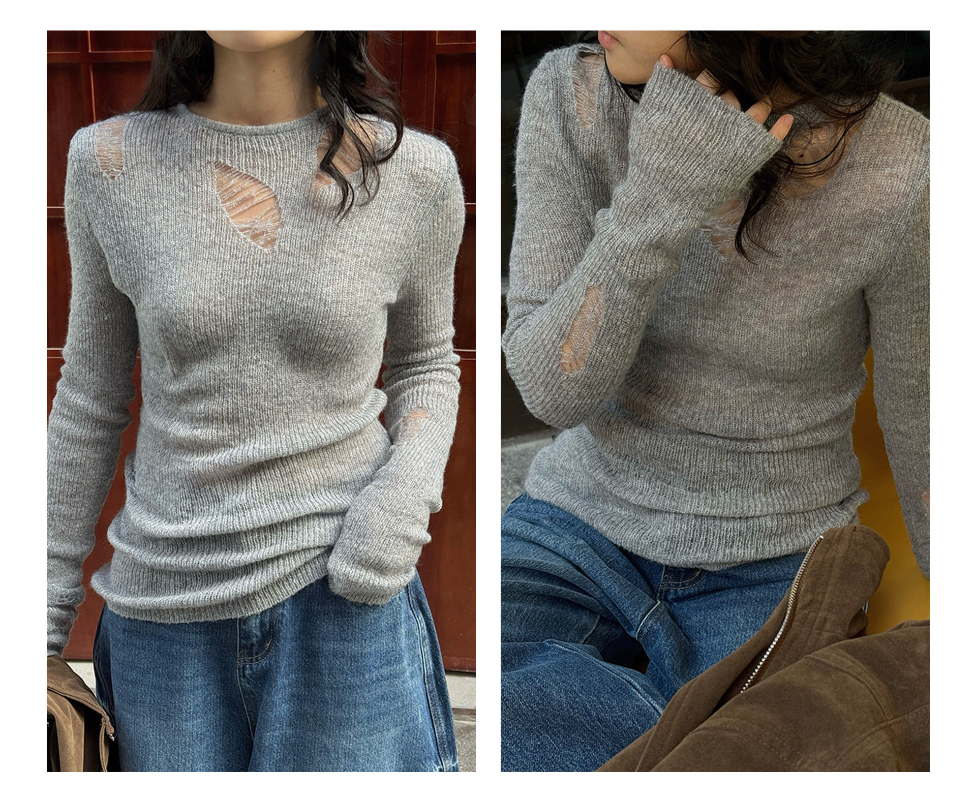 【トップス】ダメージ加工 クルーネック 透かし編み ウール 長袖 Tシャツ 【JZシリーズ】