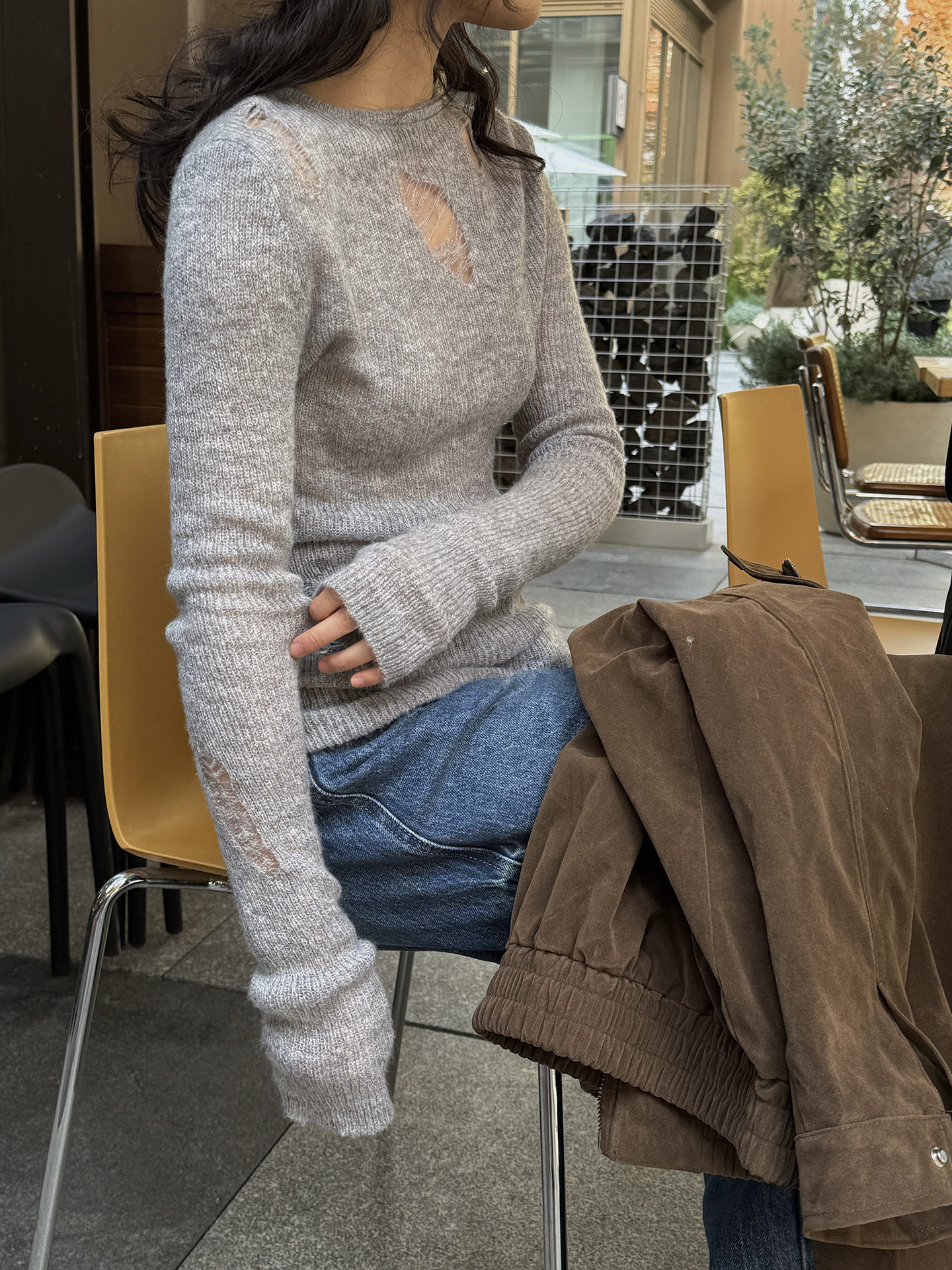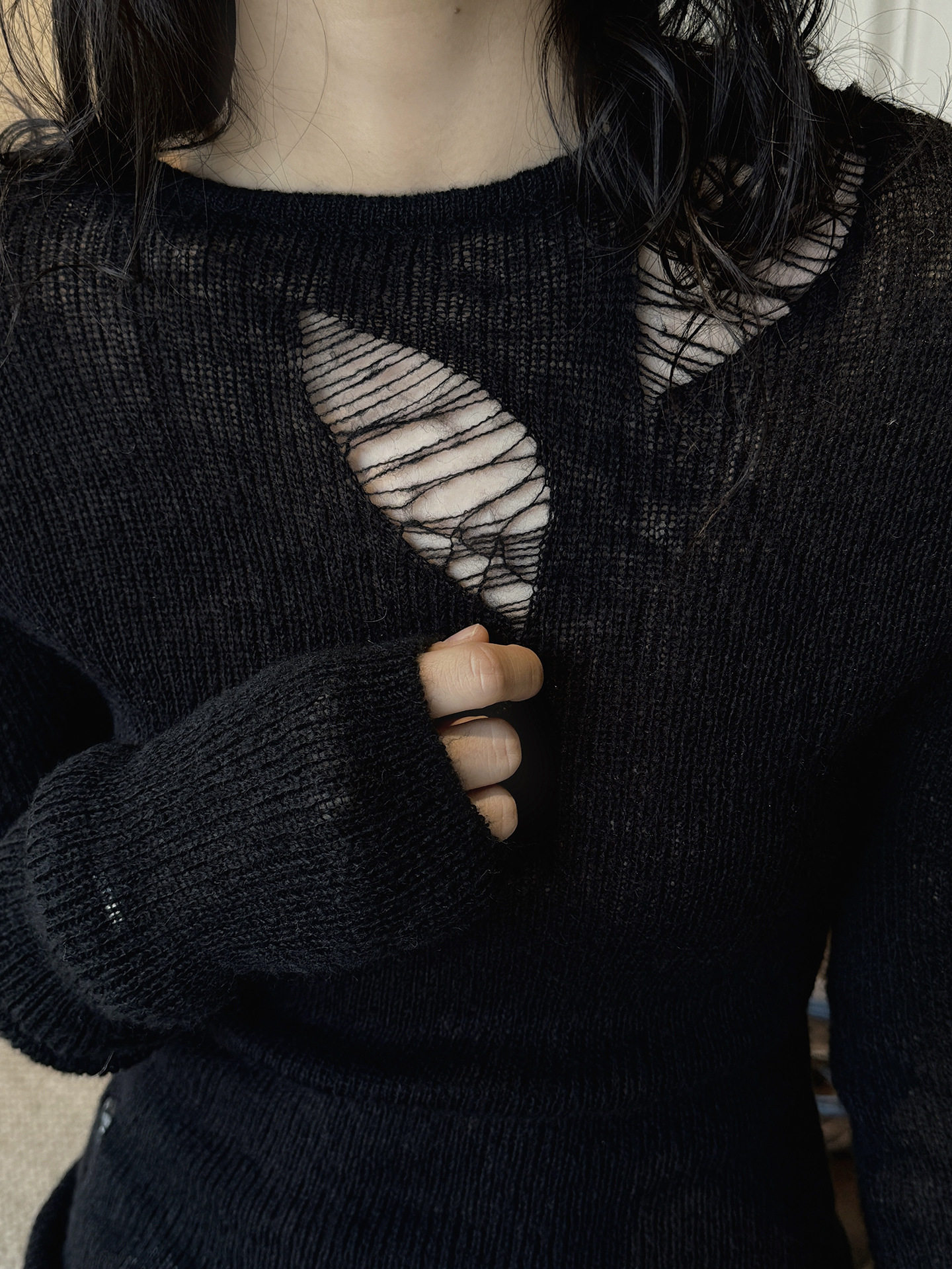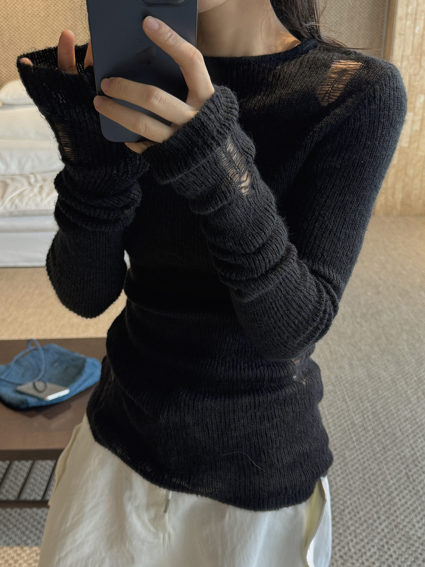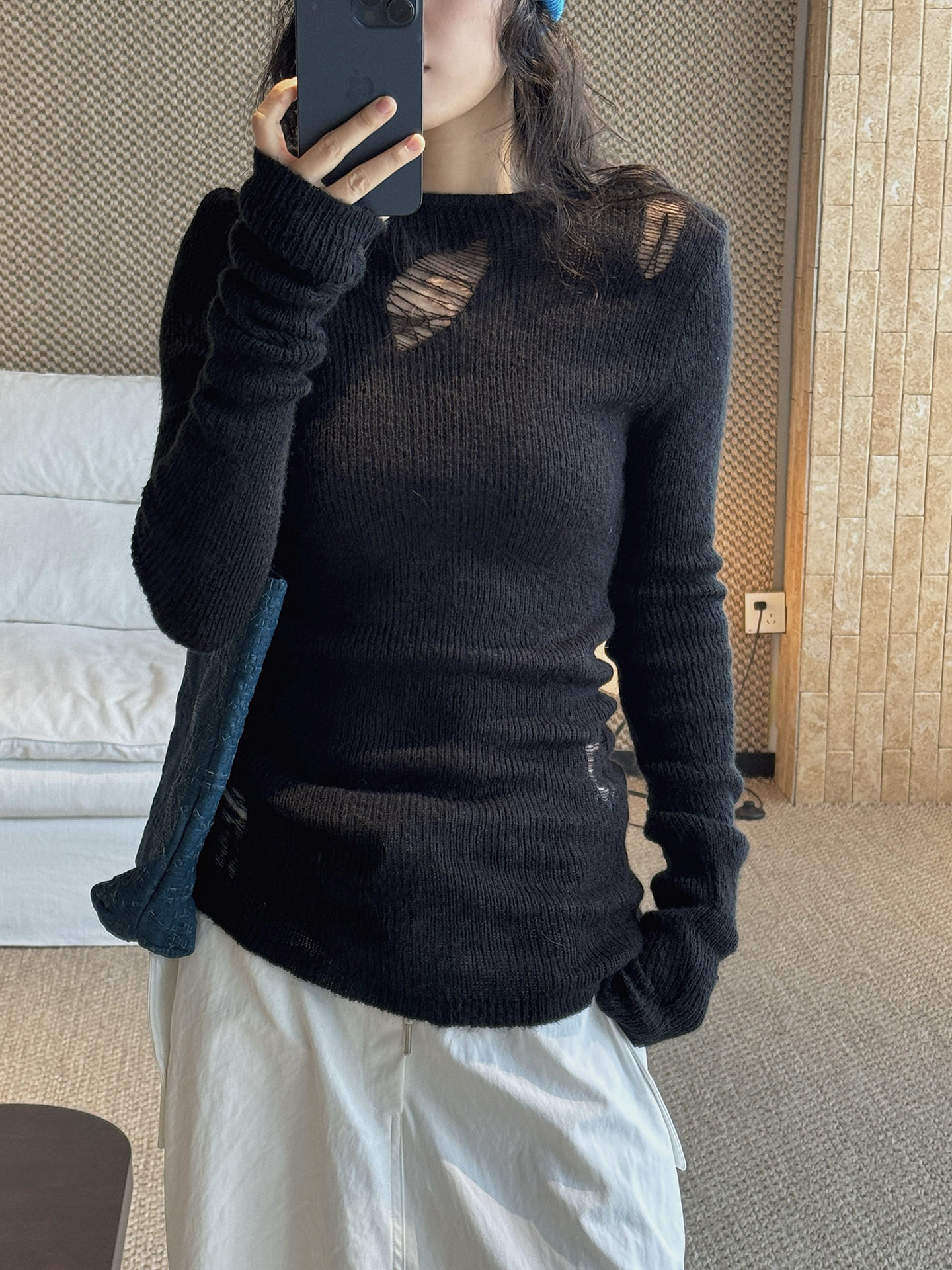 【トップス】ダメージ加工 クルーネック 透かし編み ウール 長袖 Tシャツ 【JZシリーズ】