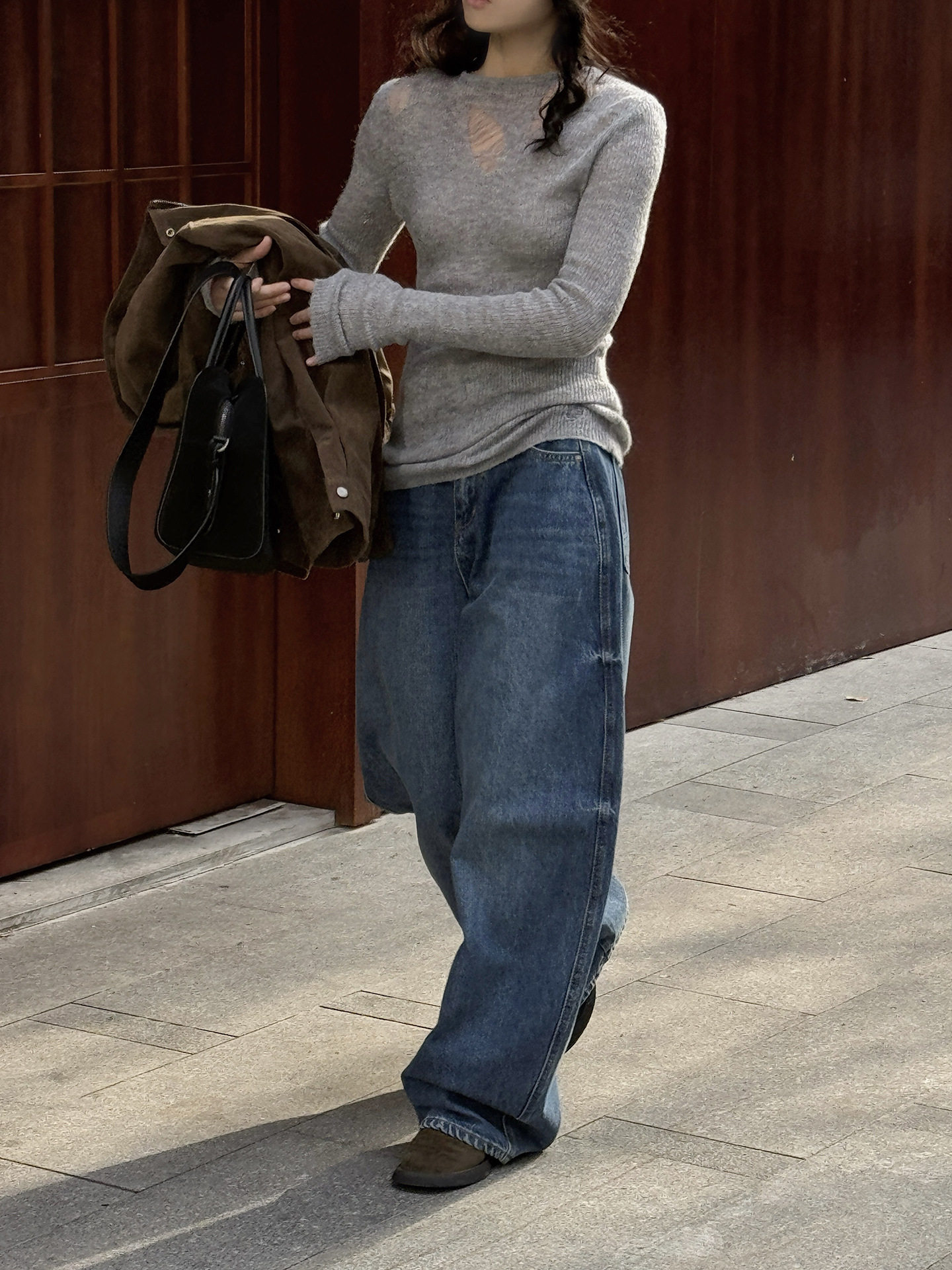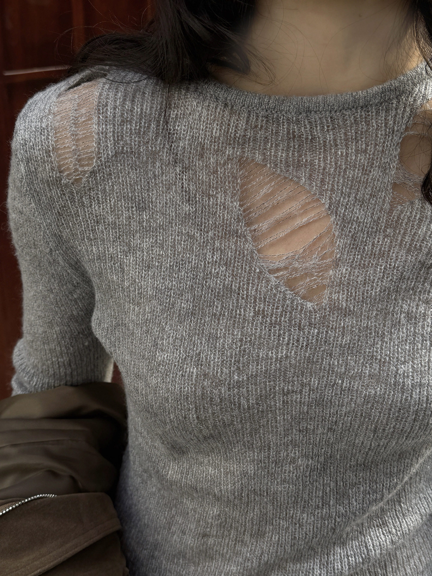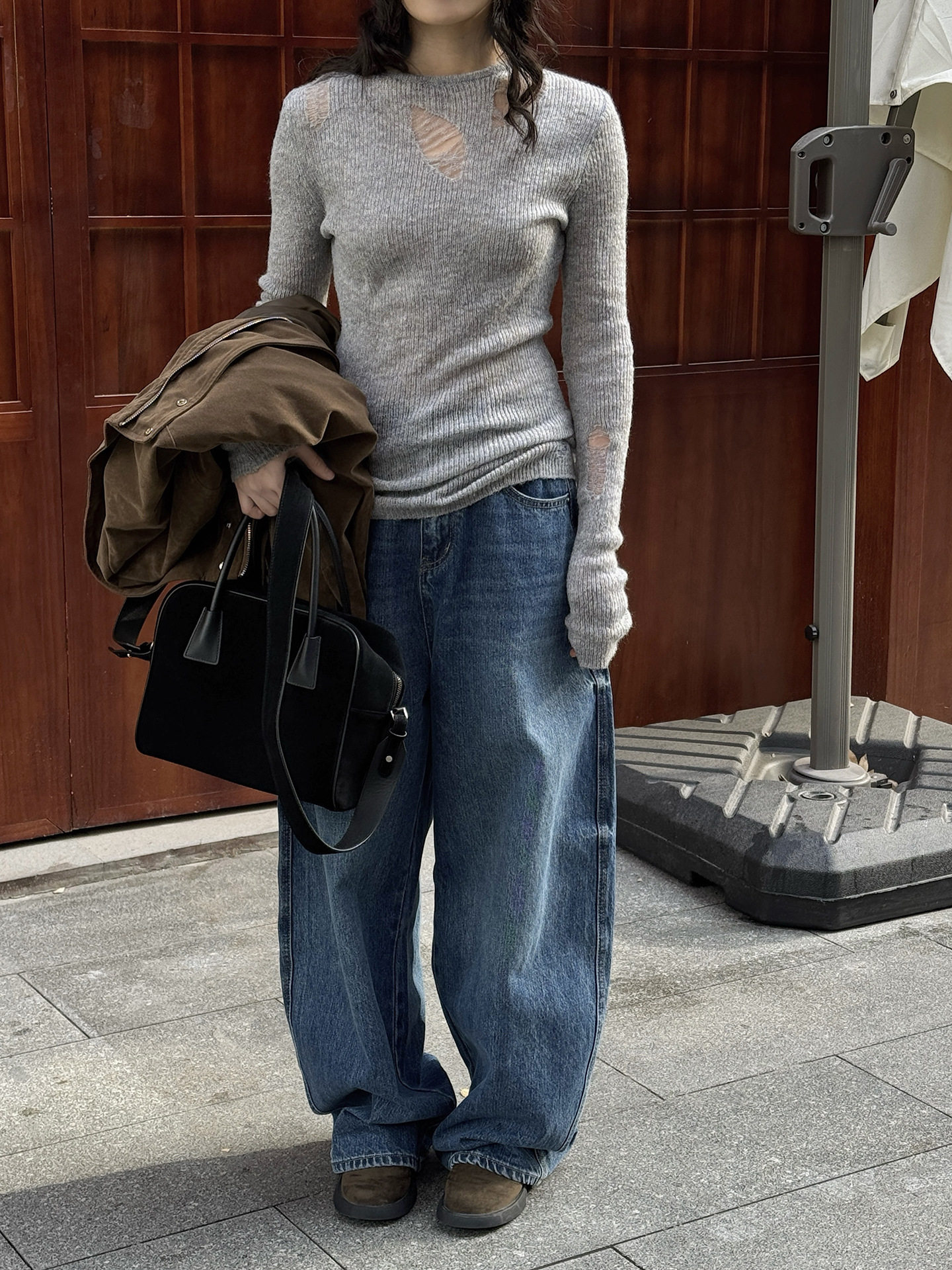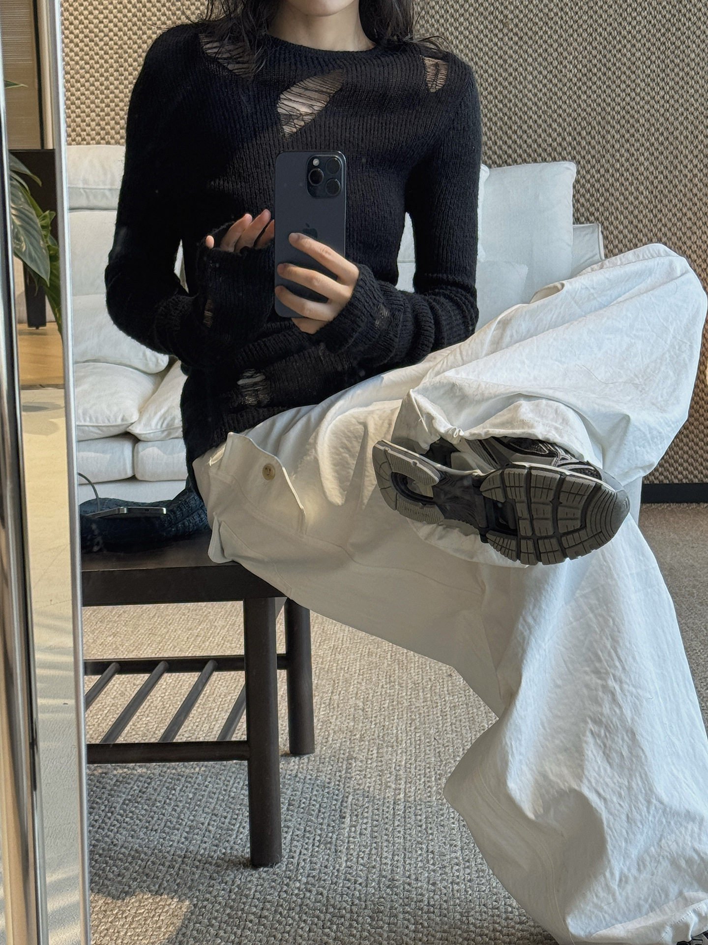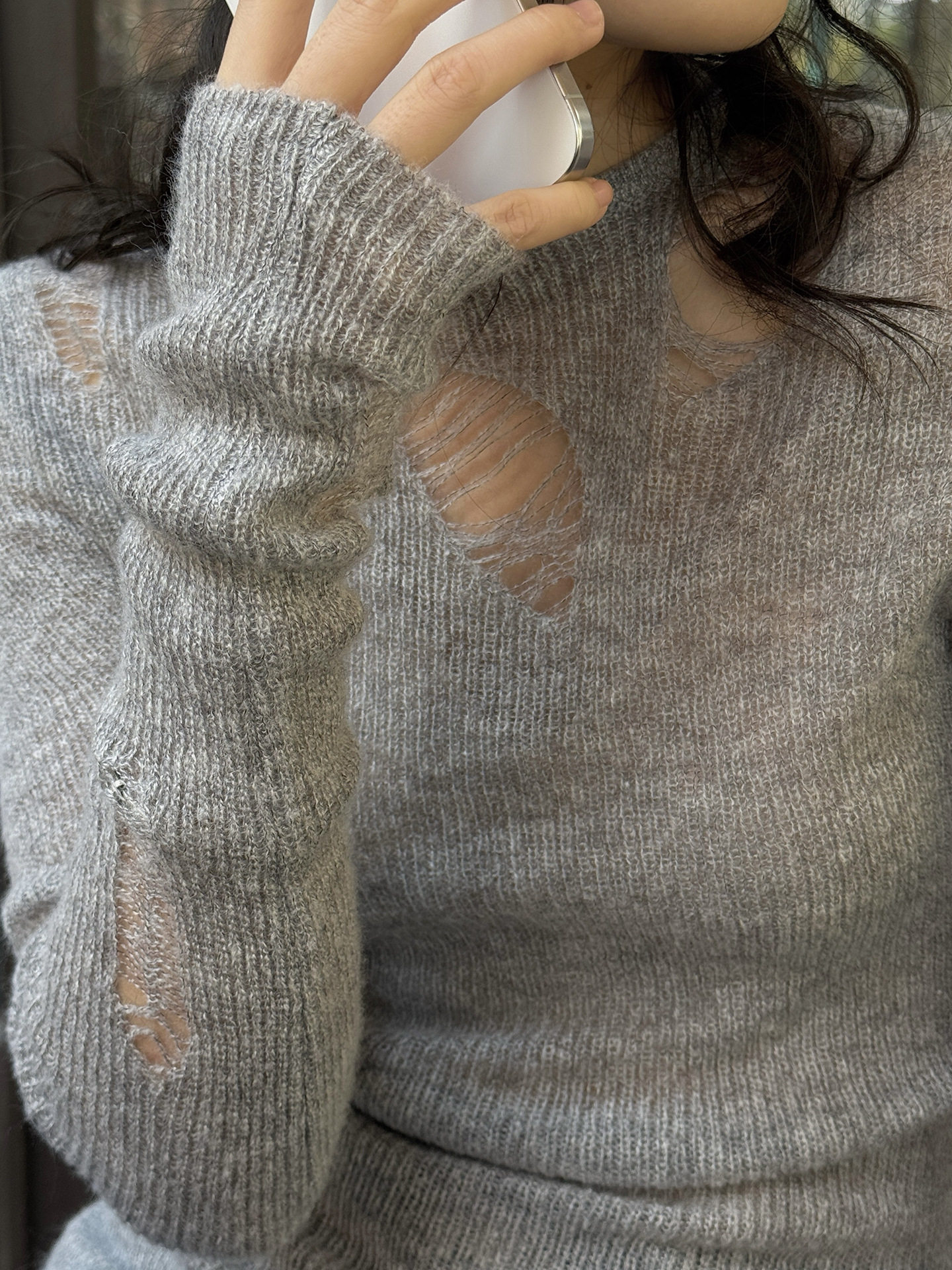 【トップス】ダメージ加工 クルーネック 透かし編み ウール 長袖 Tシャツ 【JZシリーズ】