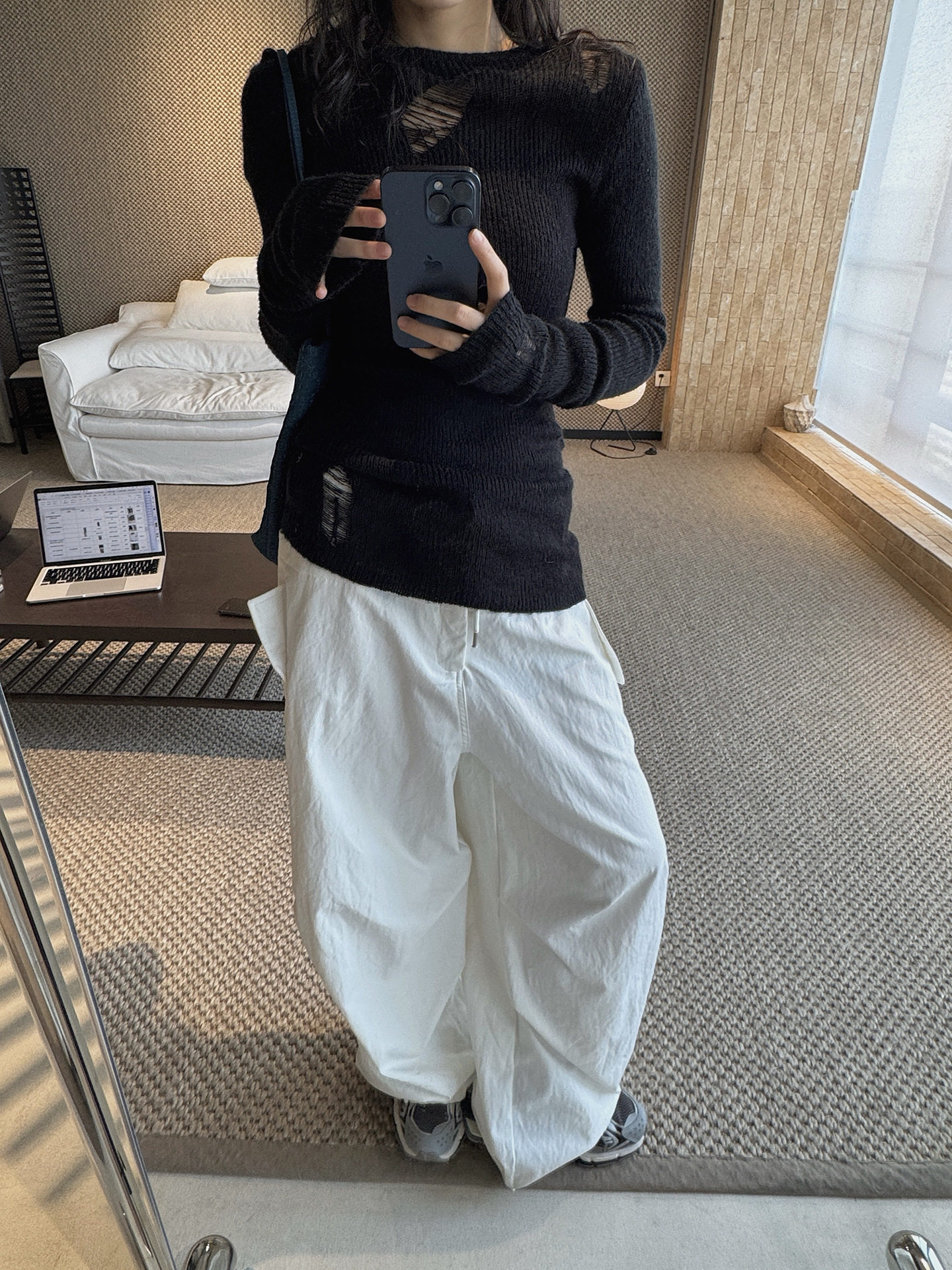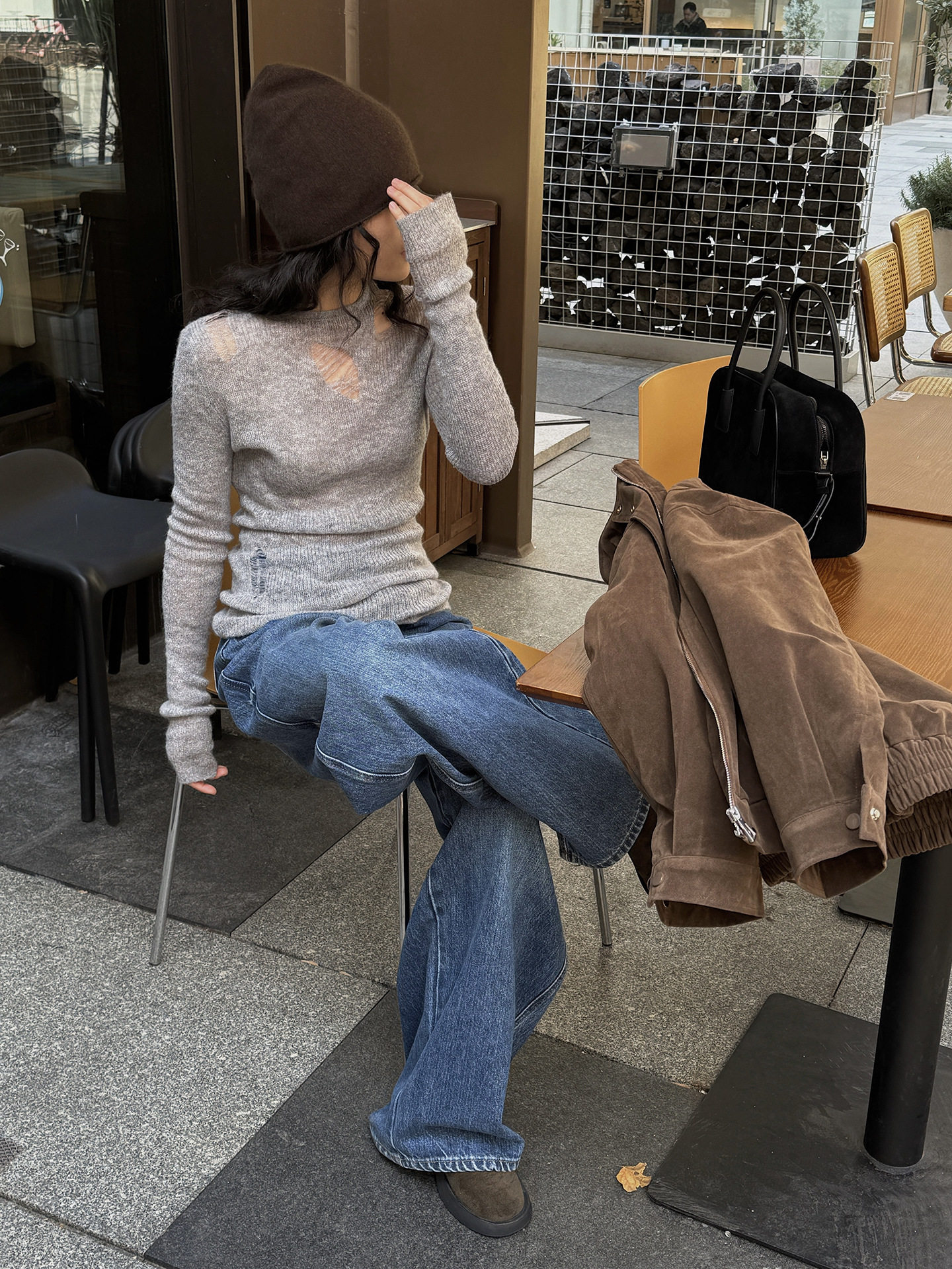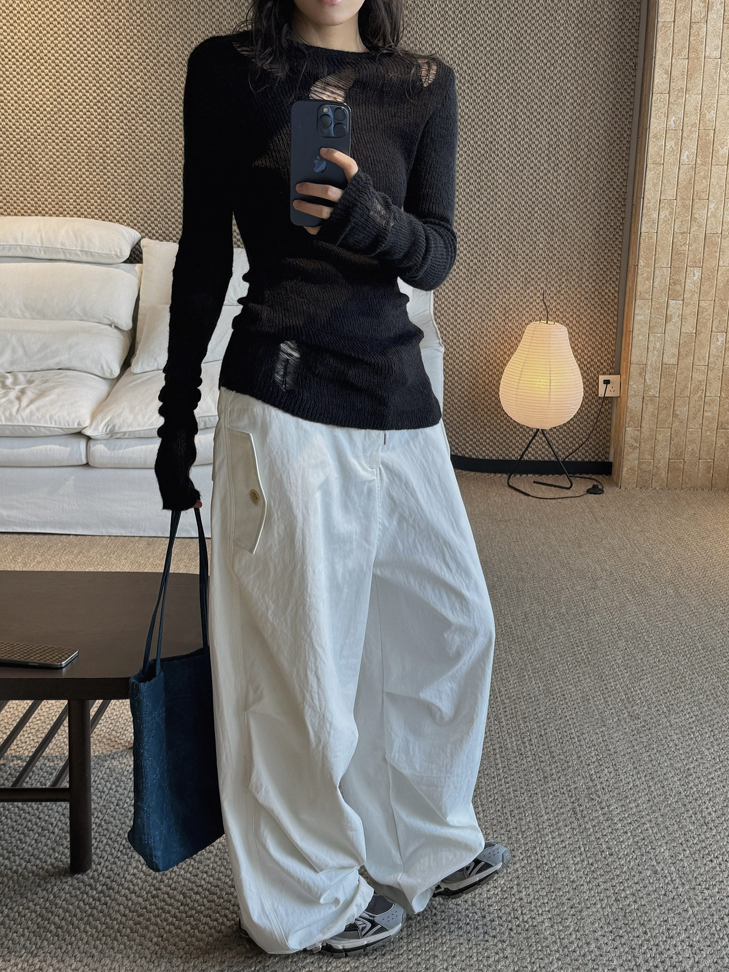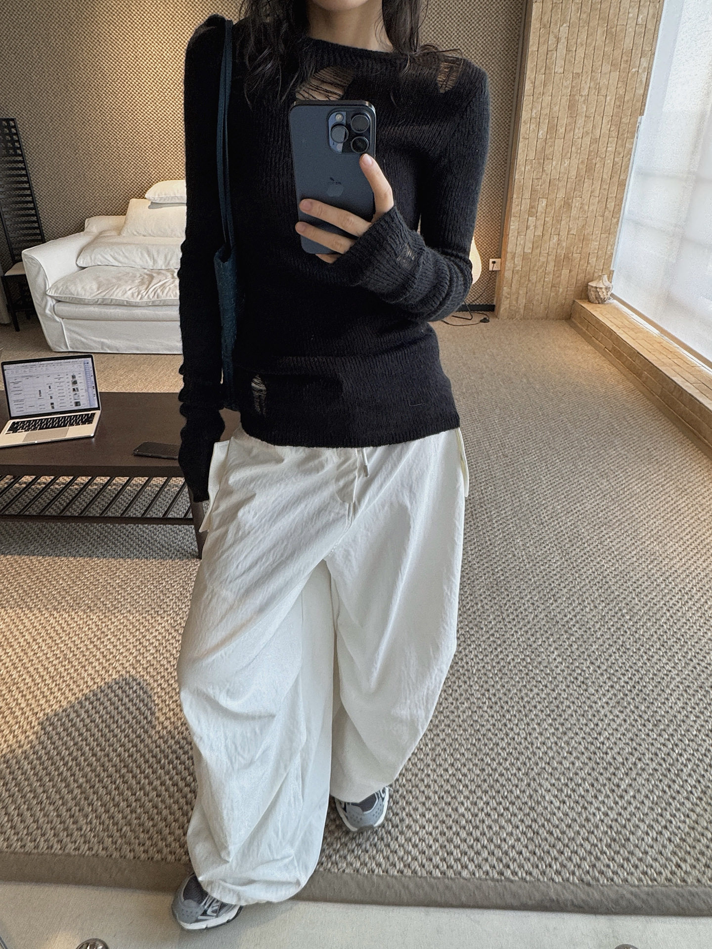 【トップス】ダメージ加工 クルーネック 透かし編み ウール 長袖 Tシャツ 【JZシリーズ】