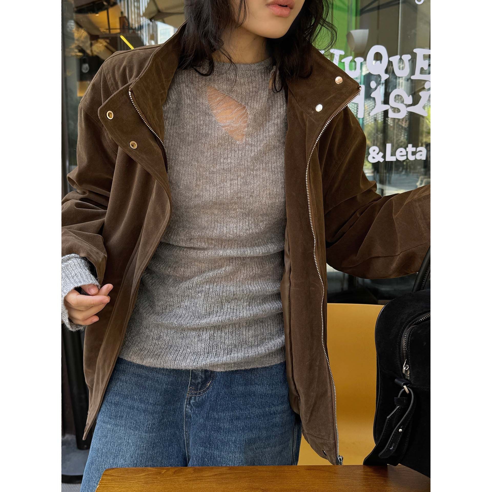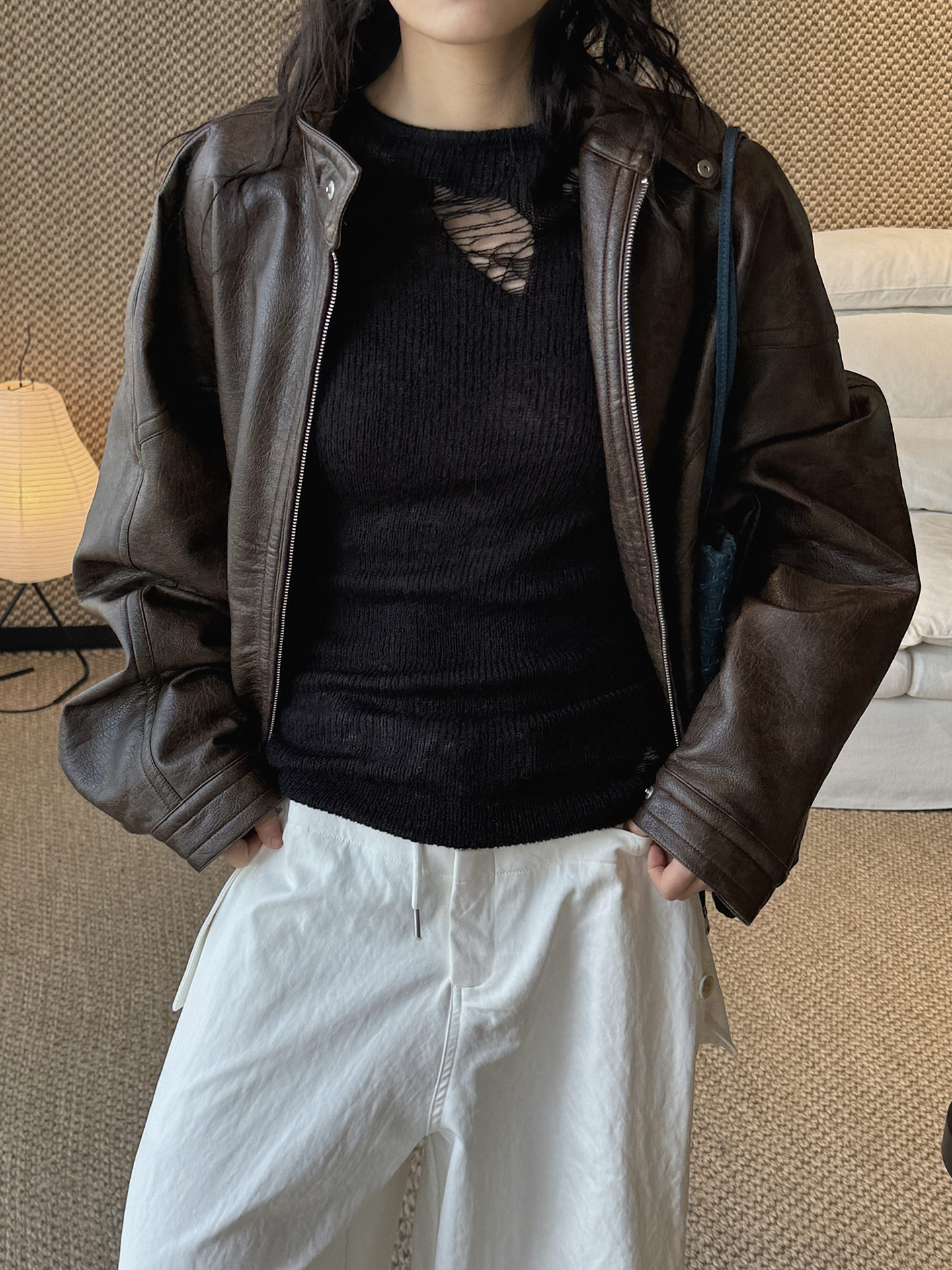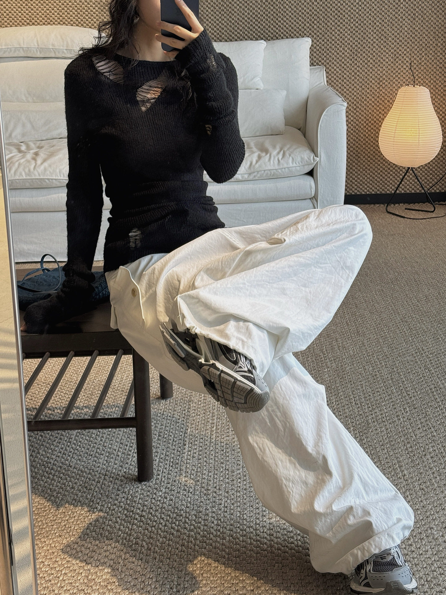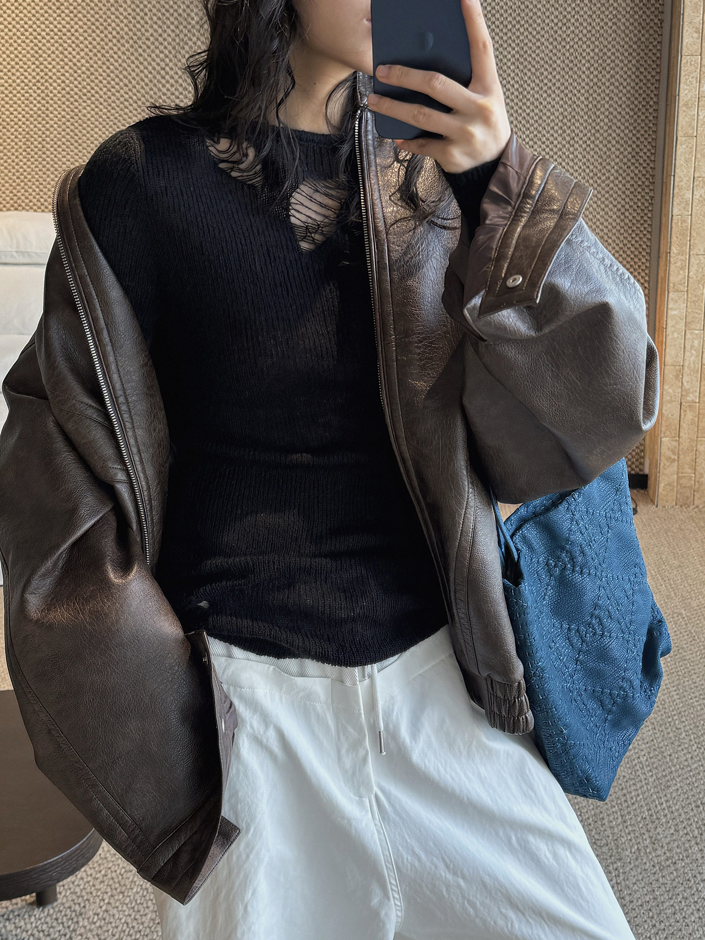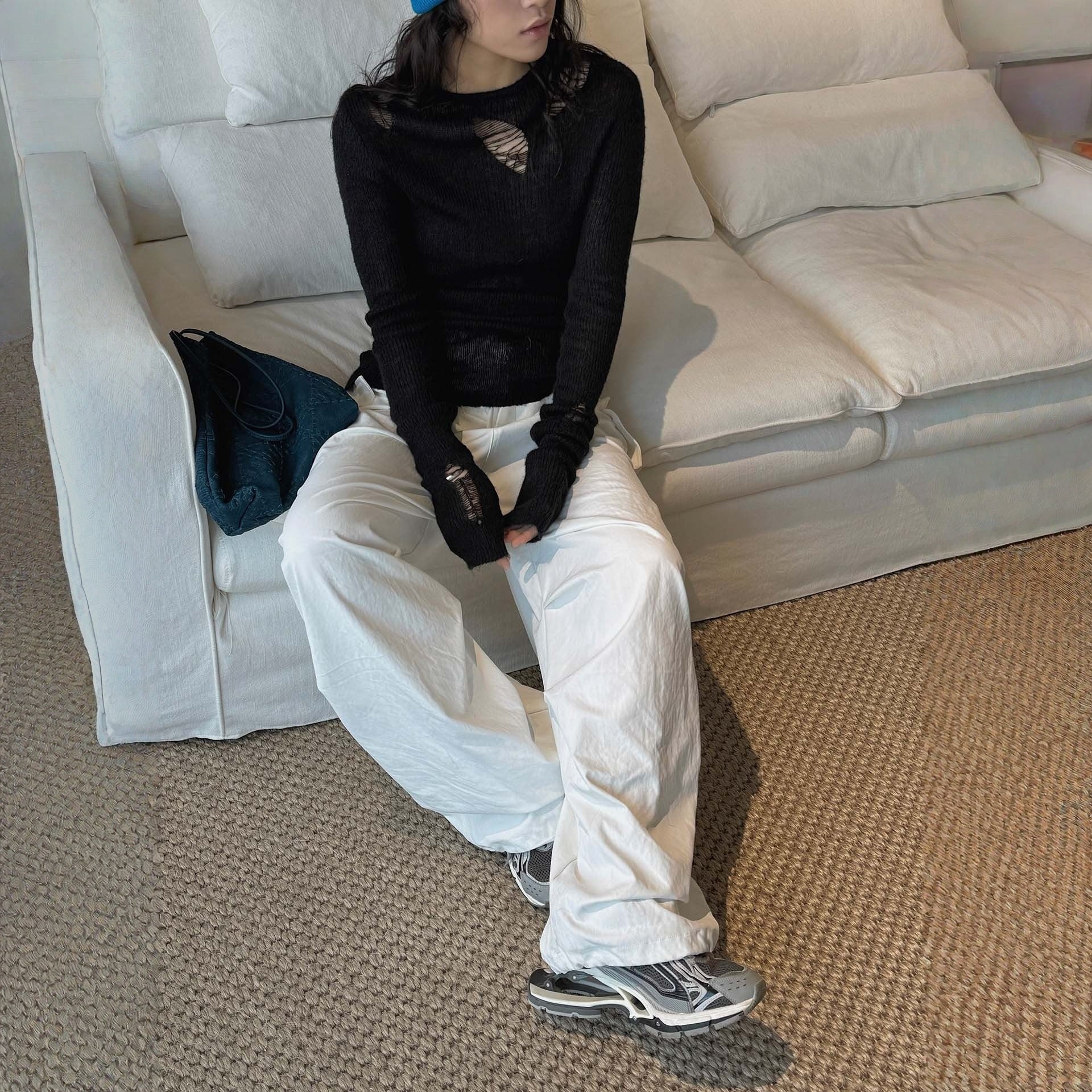 【トップス】ダメージ加工 クルーネック 透かし編み ウール 長袖 Tシャツ 【JZシリーズ】