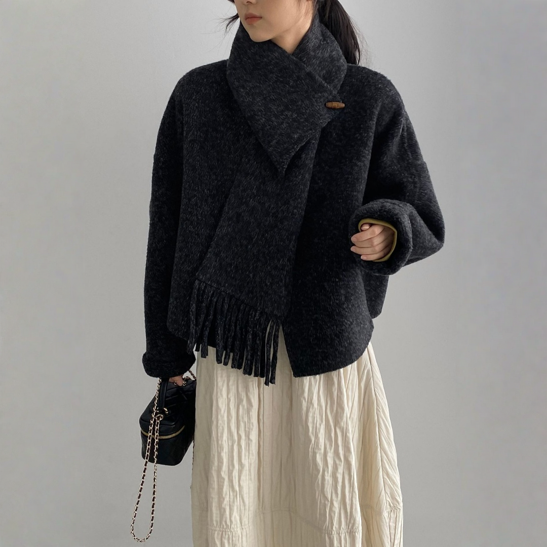 【トップス】レトロ 猫柄ジャカード クルーネック ニット レディース フリンジデザイン ゆったり 着回し セーター【FCシリーズ】