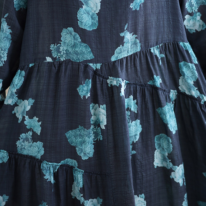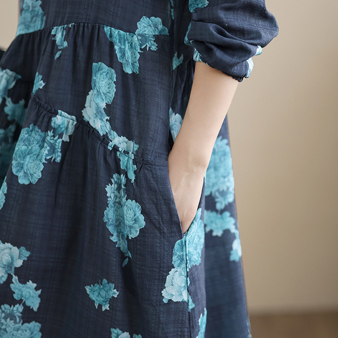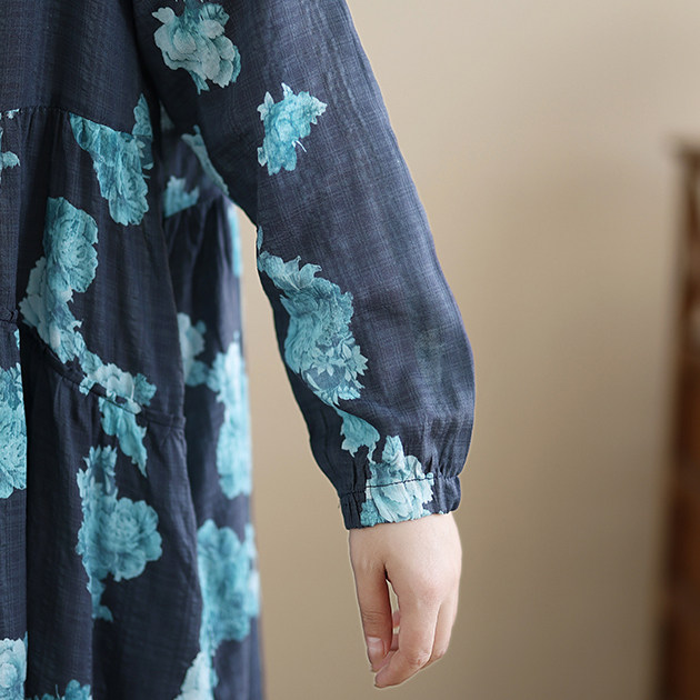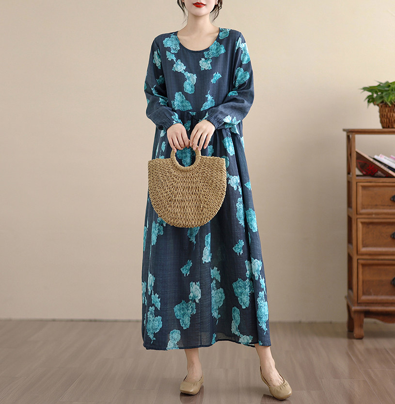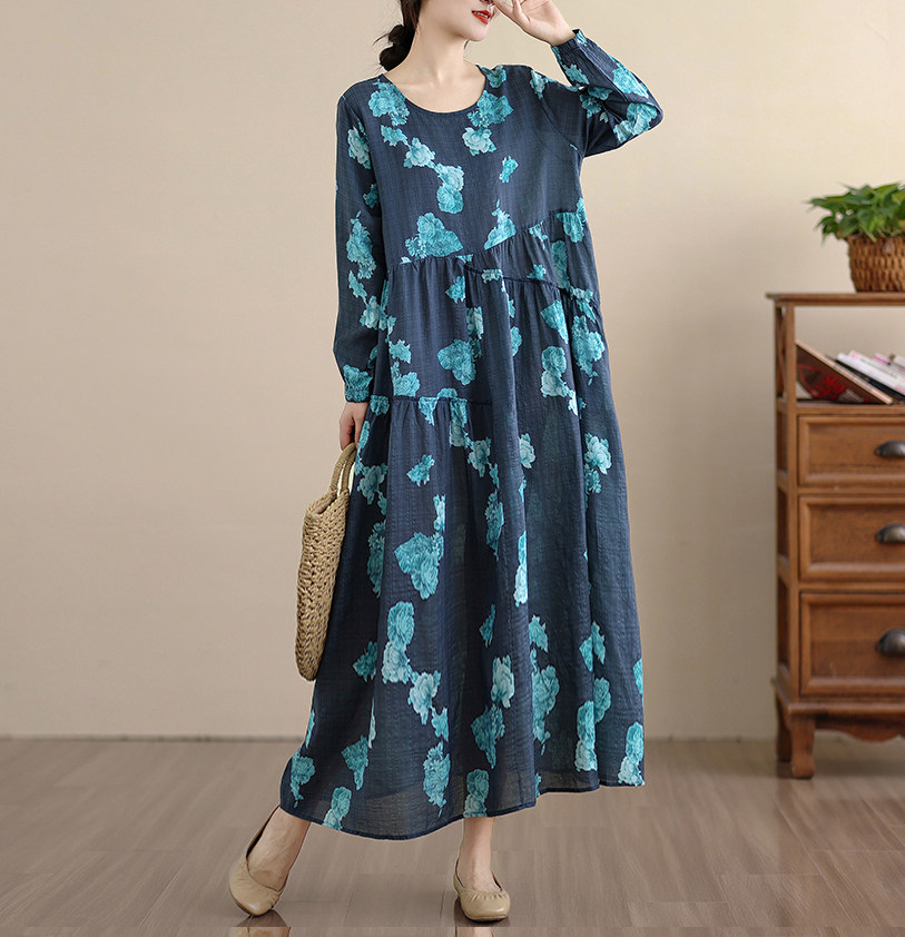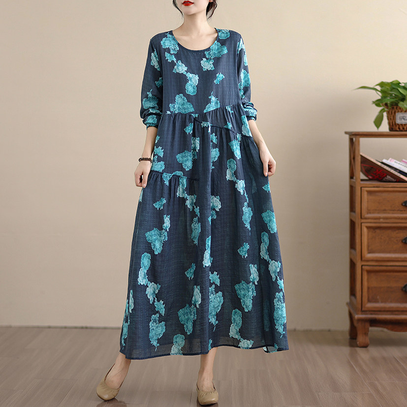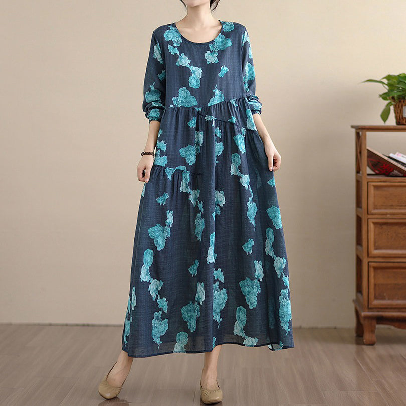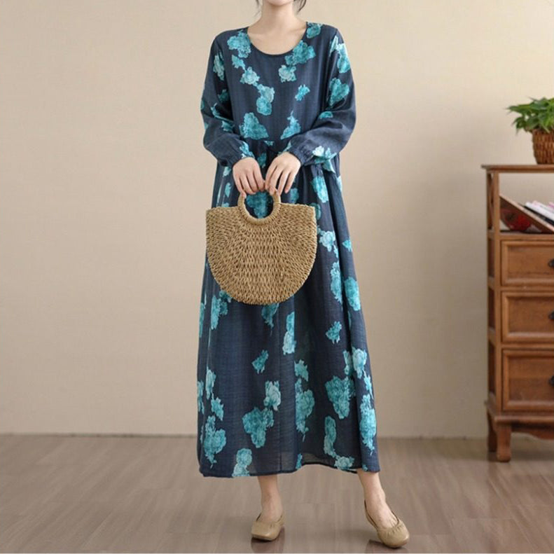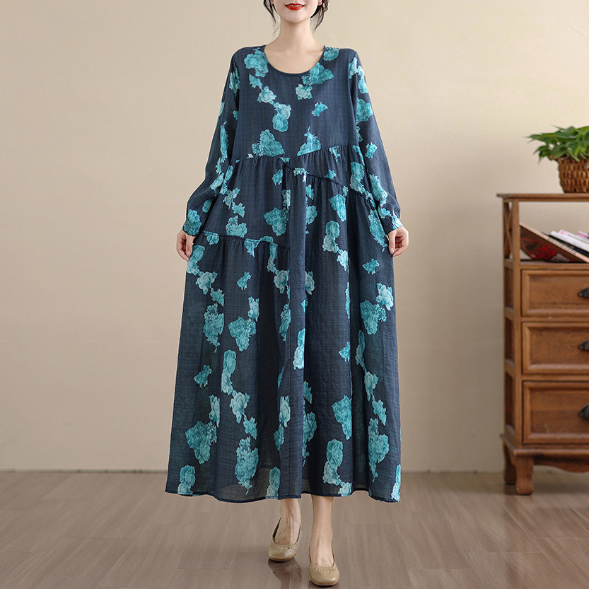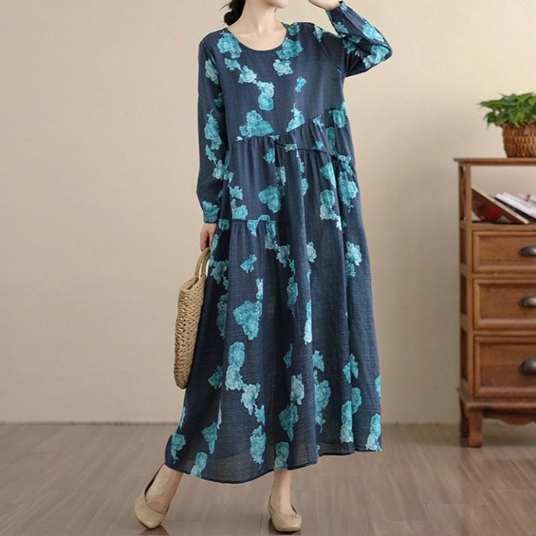 【ワンピース】レトロ 花柄プリント 長袖 ロング Aライン ゆったり 裾フレア ワンピース【SHシリーズ】