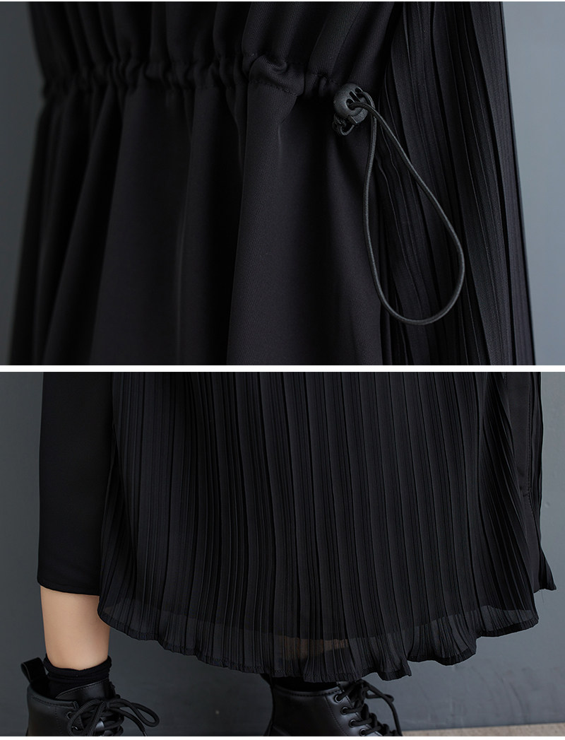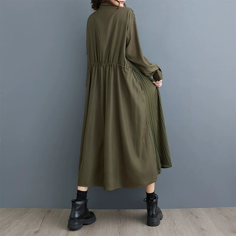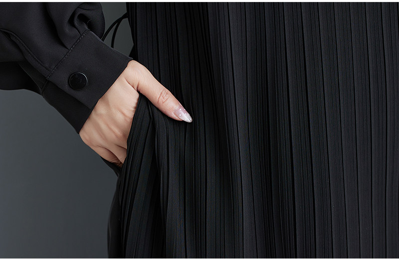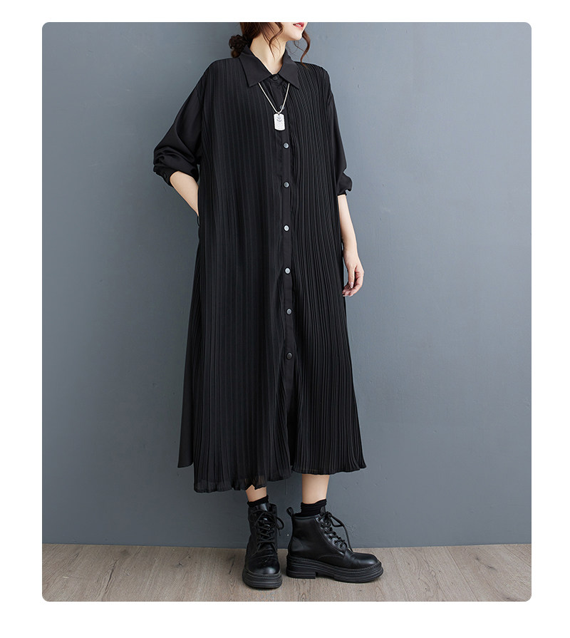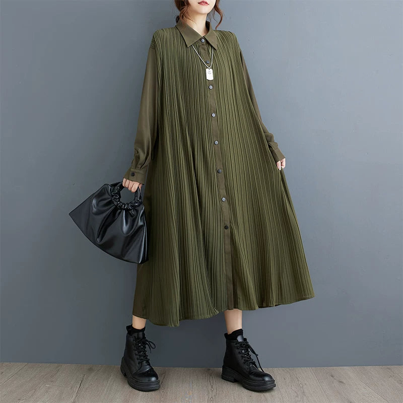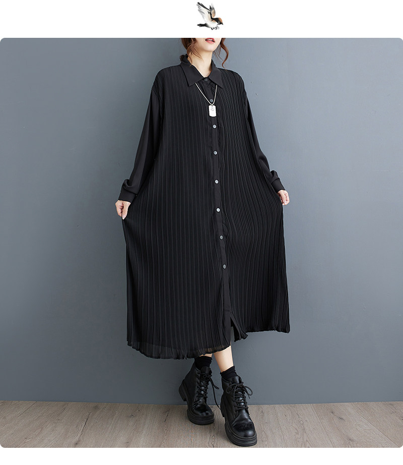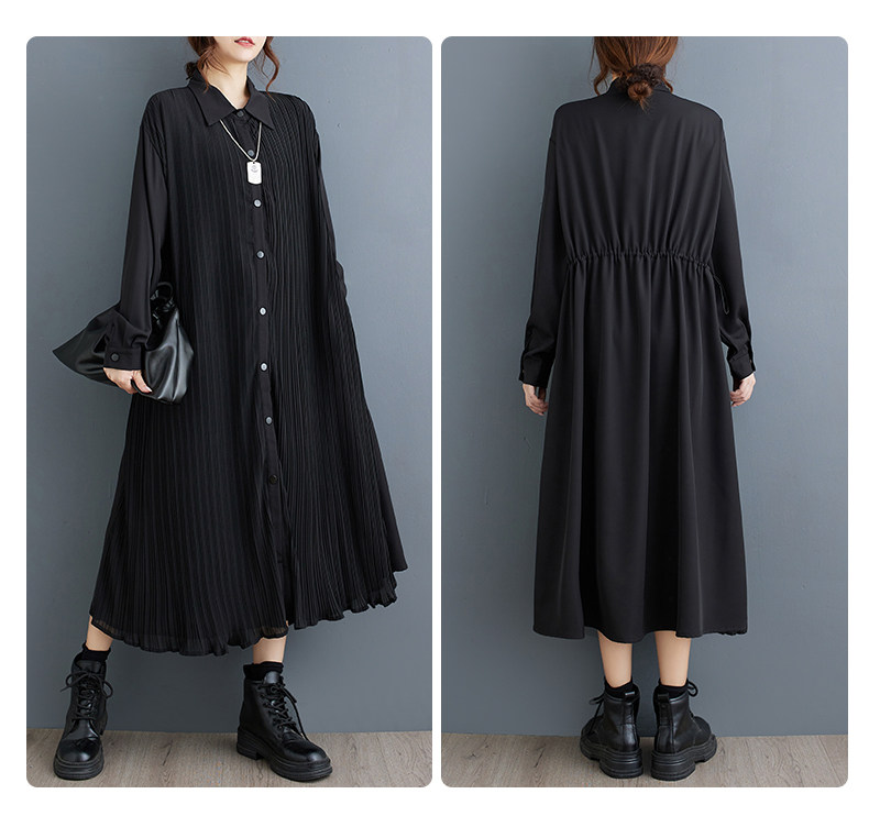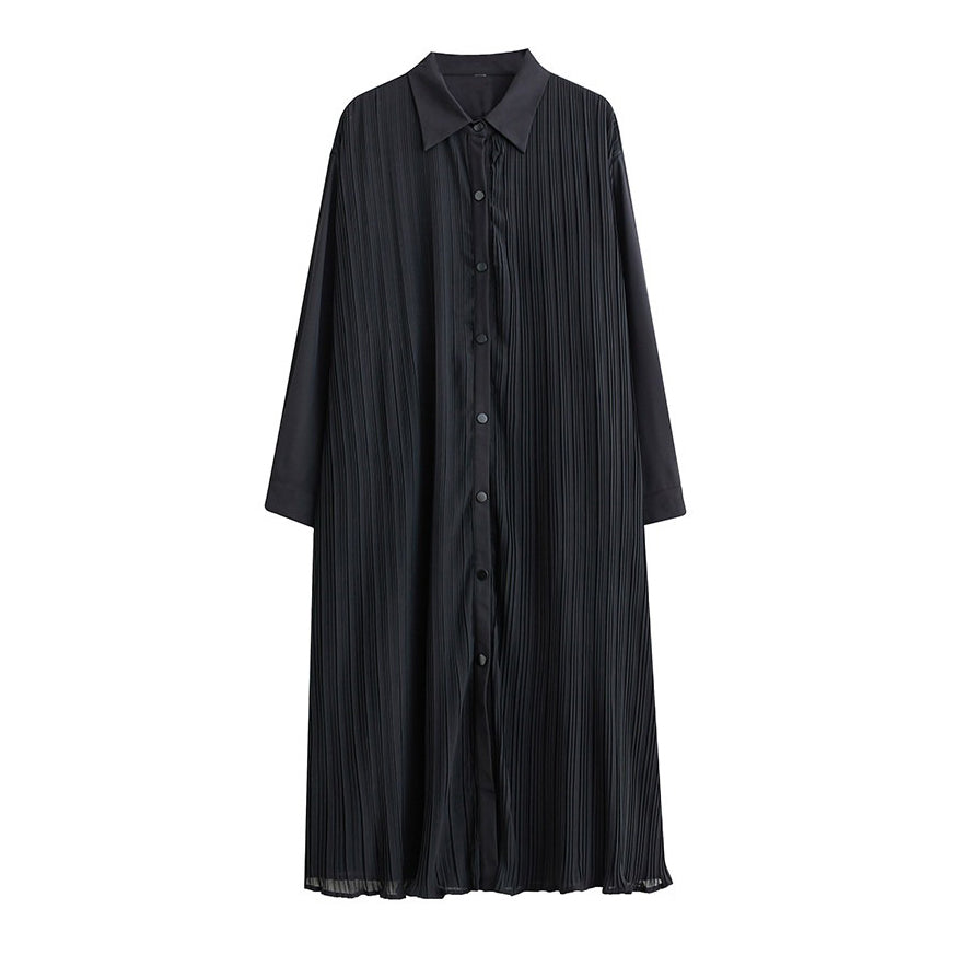 【商品名】【ワンピース】ダーク系 無地 切替 プリーツ 長袖 シャツワンピース ゆるシルエット 垂れ感【AHシリーズ】