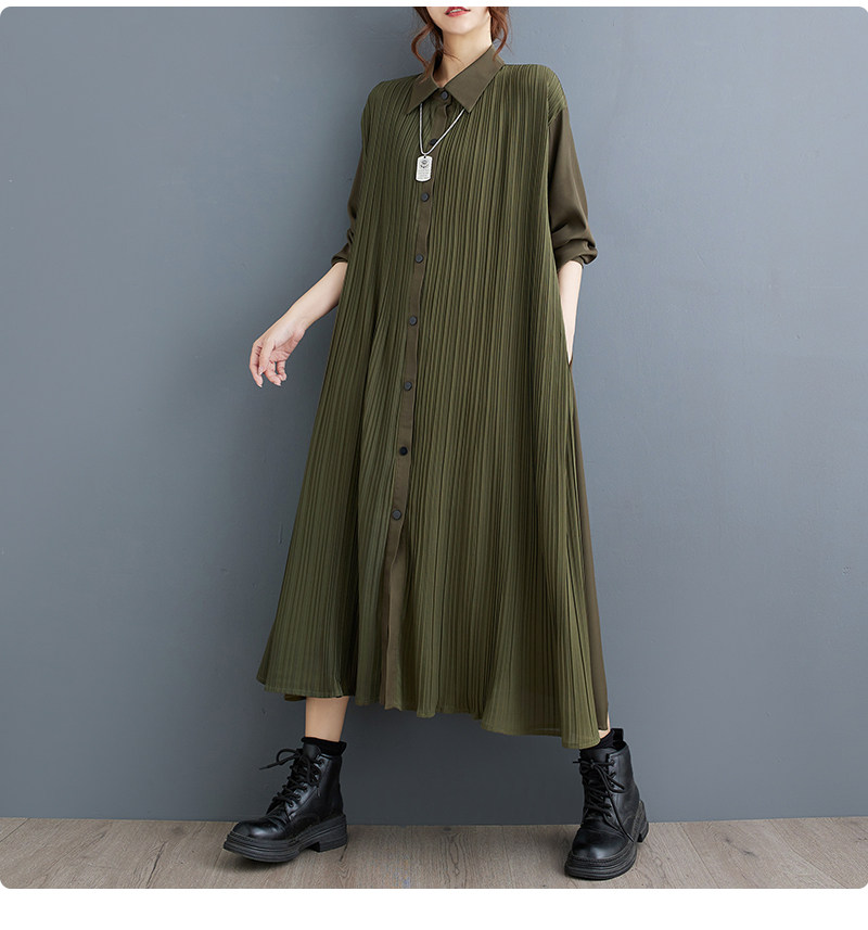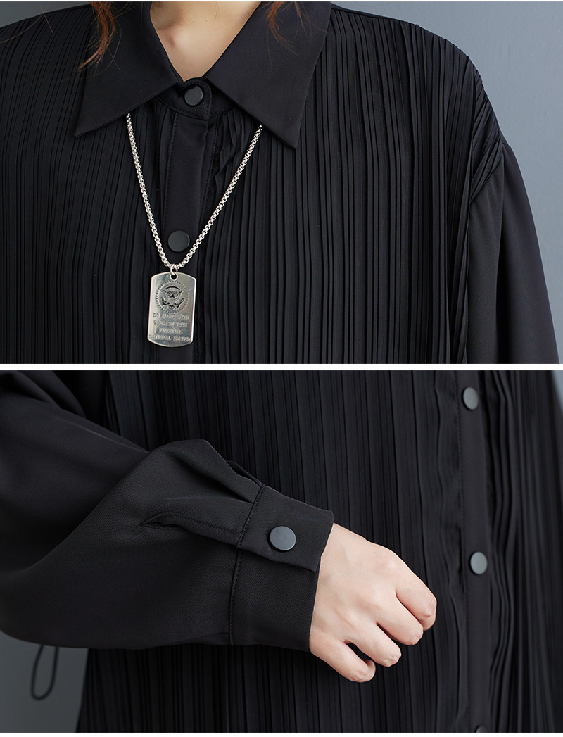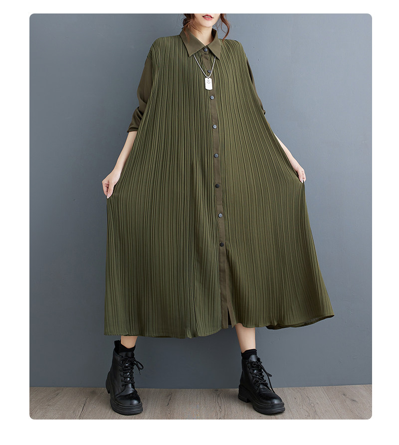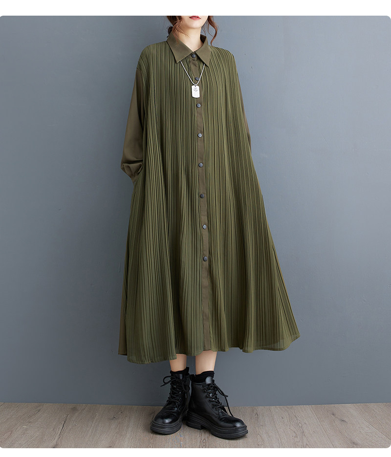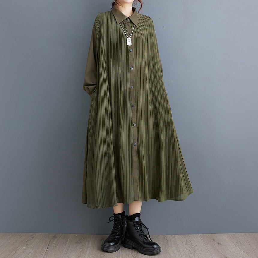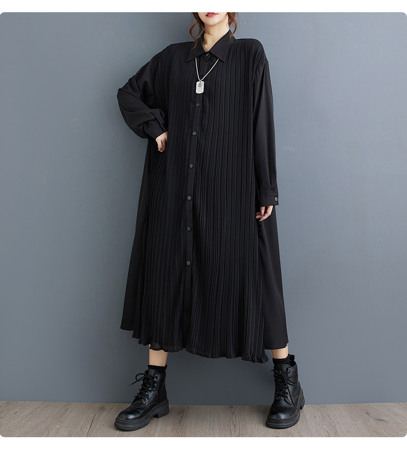 【ワンピース】ダーク系 無地 切替 プリーツ 長袖 シャツワンピース ゆるシルエット 垂れ感【AHシリーズ】