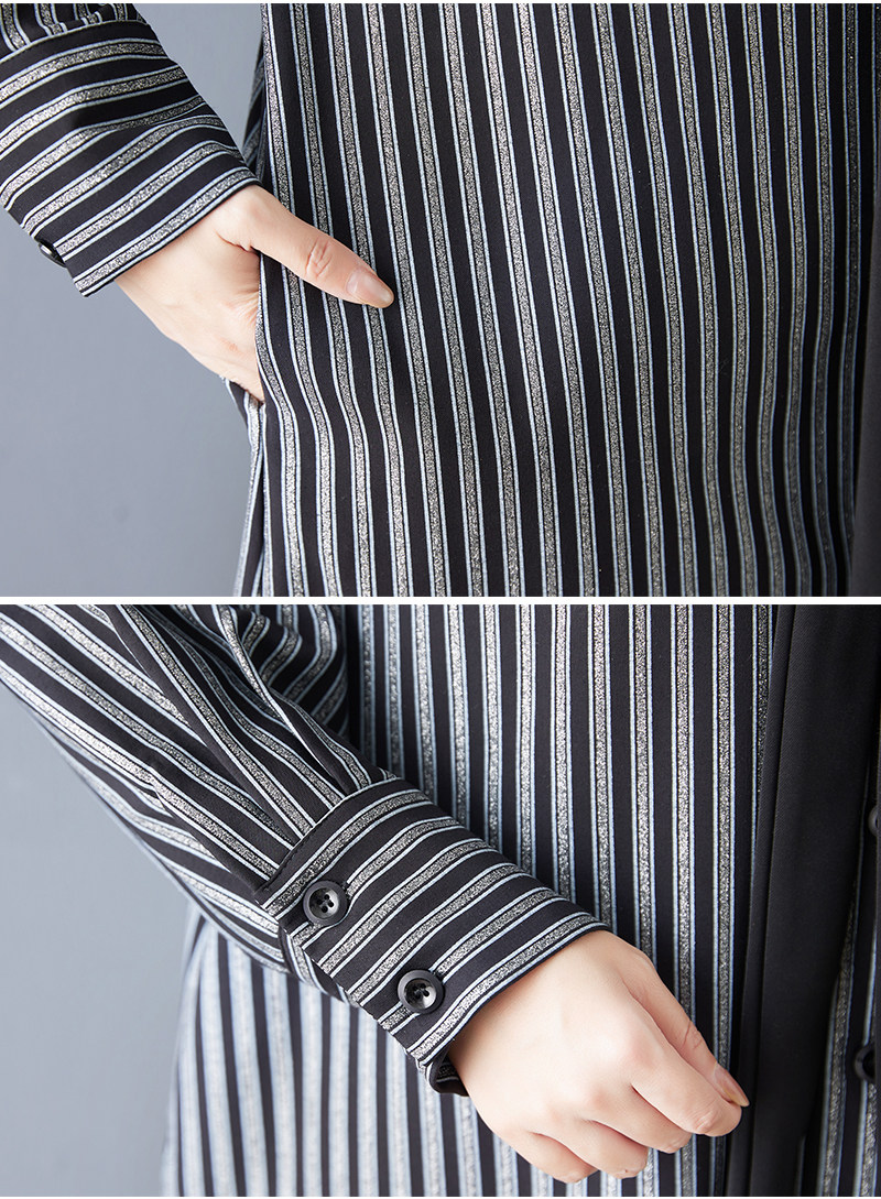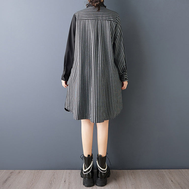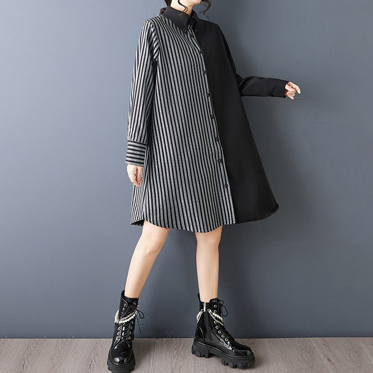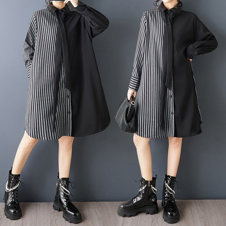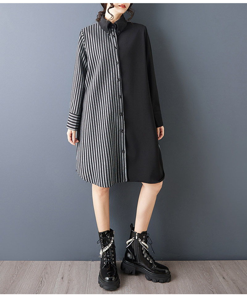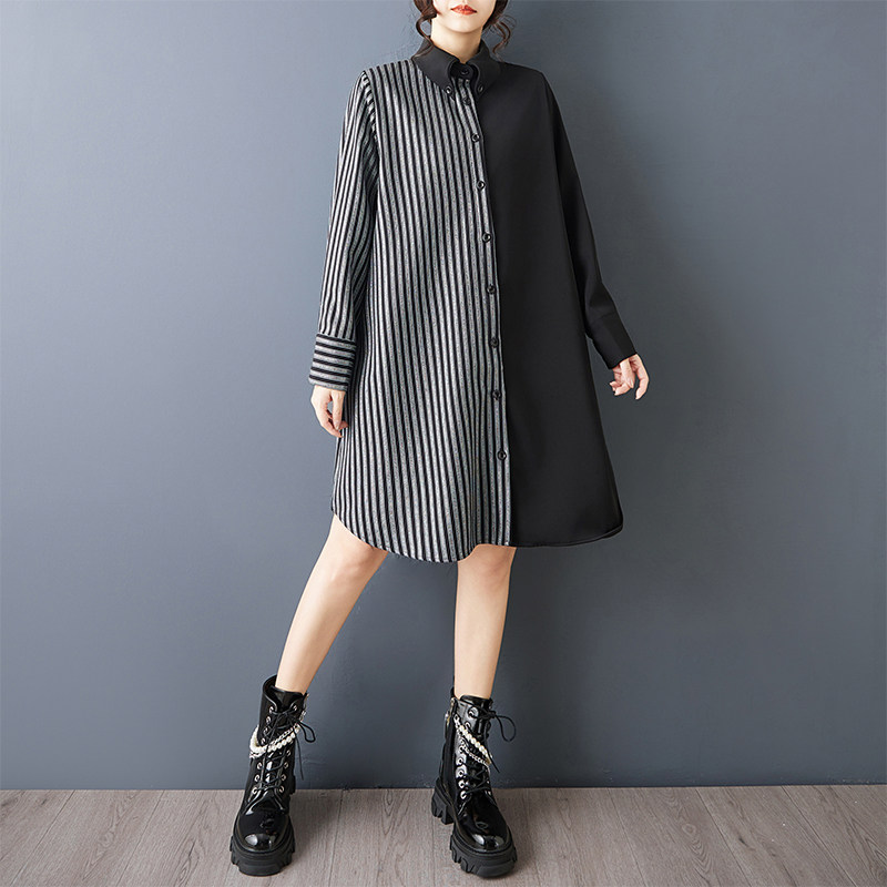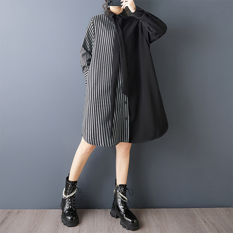【商品名】【ワンピース】ダークデザイン 無地×ストライプ 切替 長袖 ワンピース ゆったり【AHシリーズ】