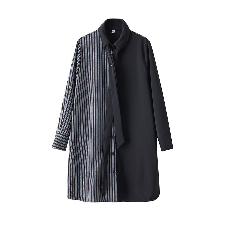 【ワンピース】香港風 クルーネック 切替 シャツ生地 大きめサイズ 長袖 ワンピース ビッグシルエット ゆったり【JZシリーズ】