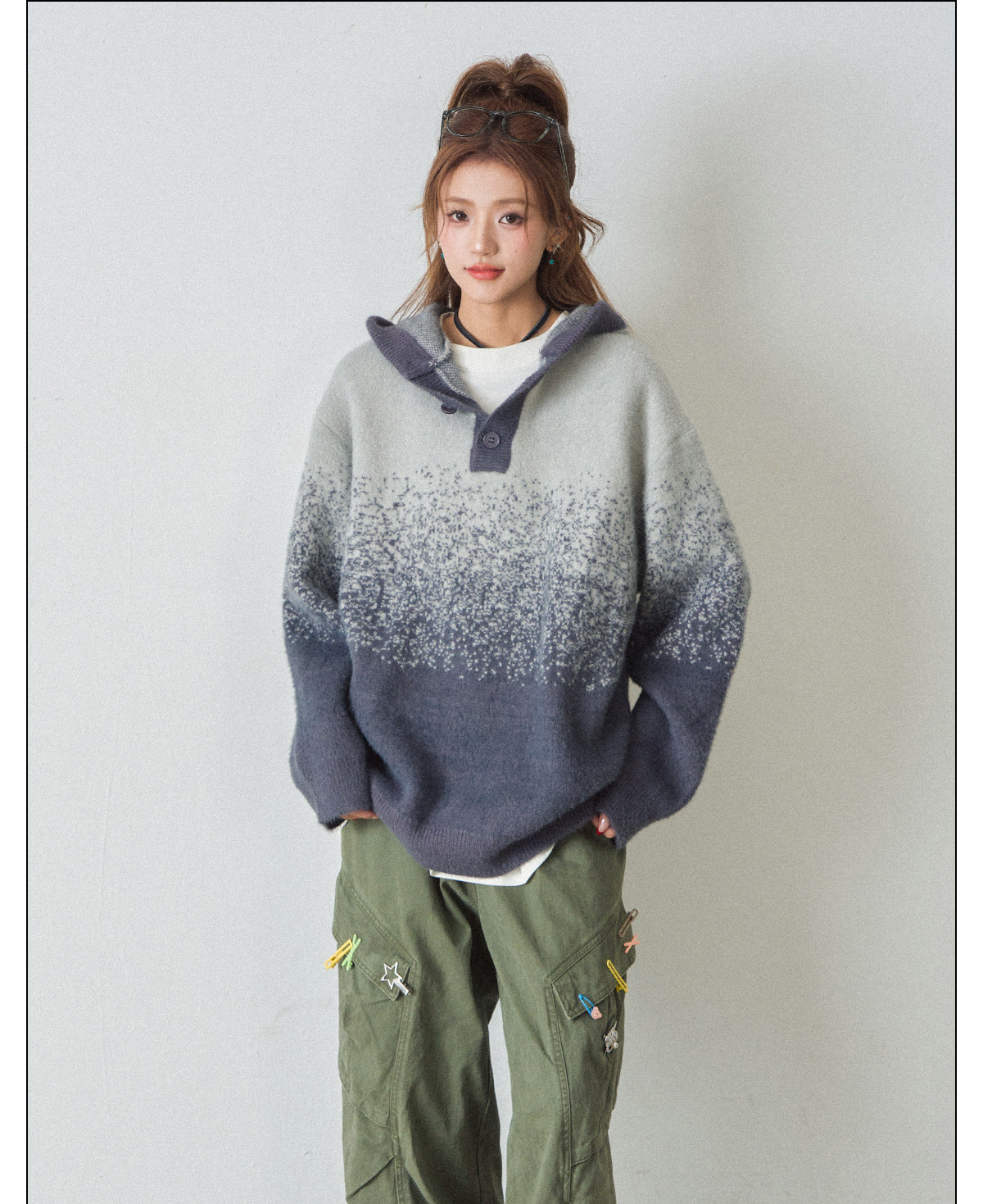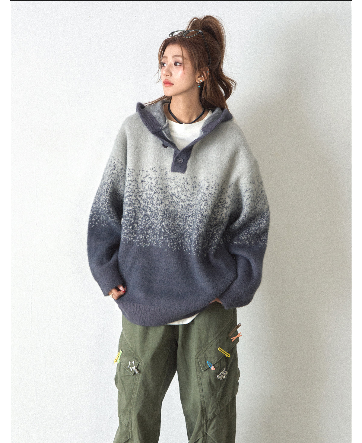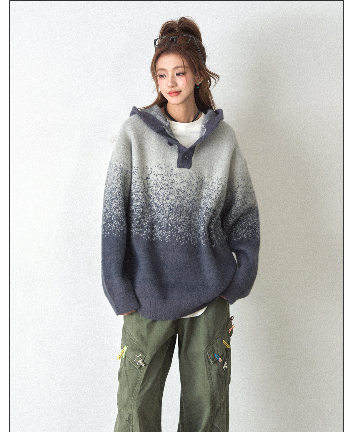 【トップス】ふわふわ カートゥーン柄 フード付きニットセーター レディース 新作 オーバーサイズ BF風 韓国風 ゆるニット【FCシリーズ】