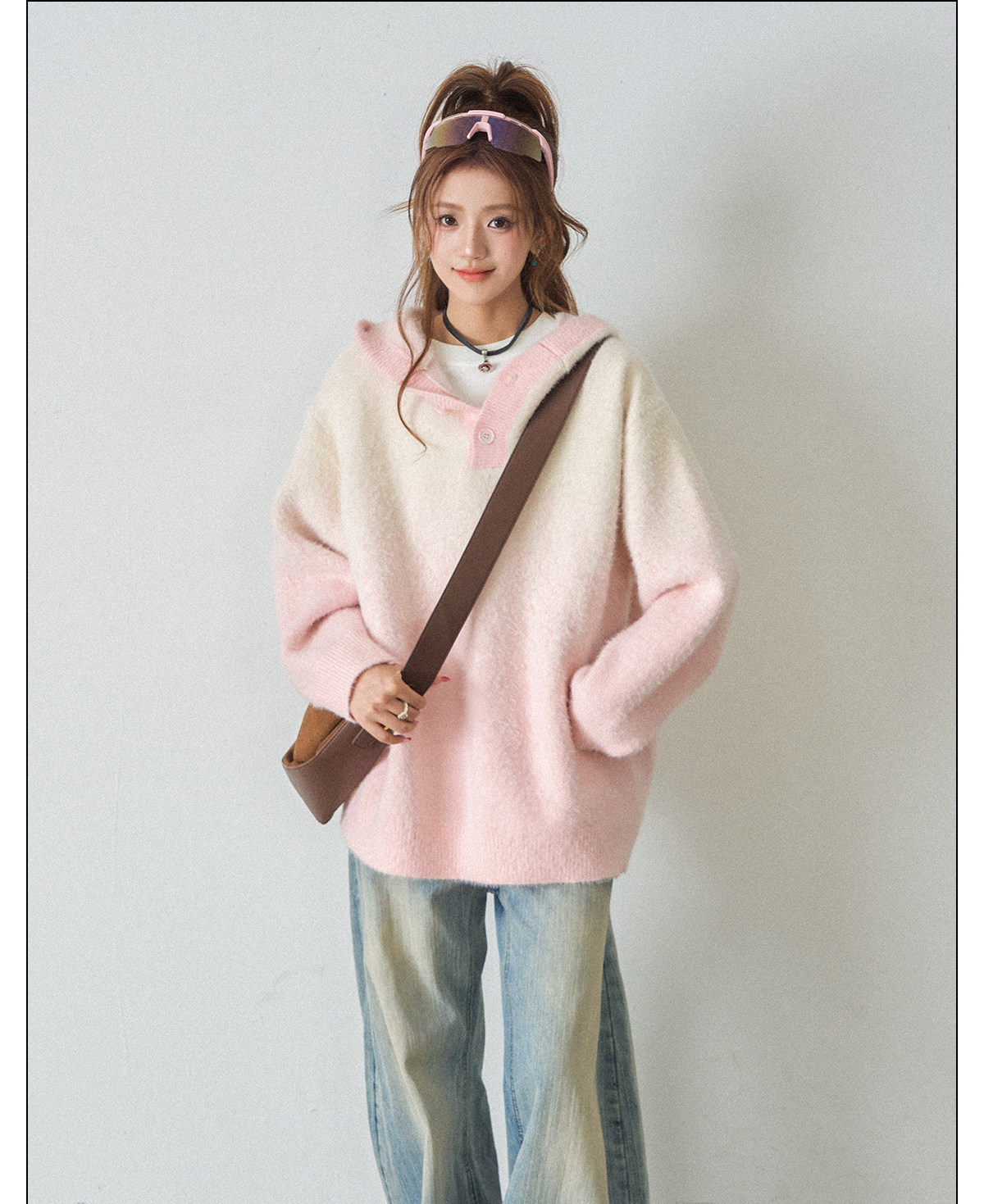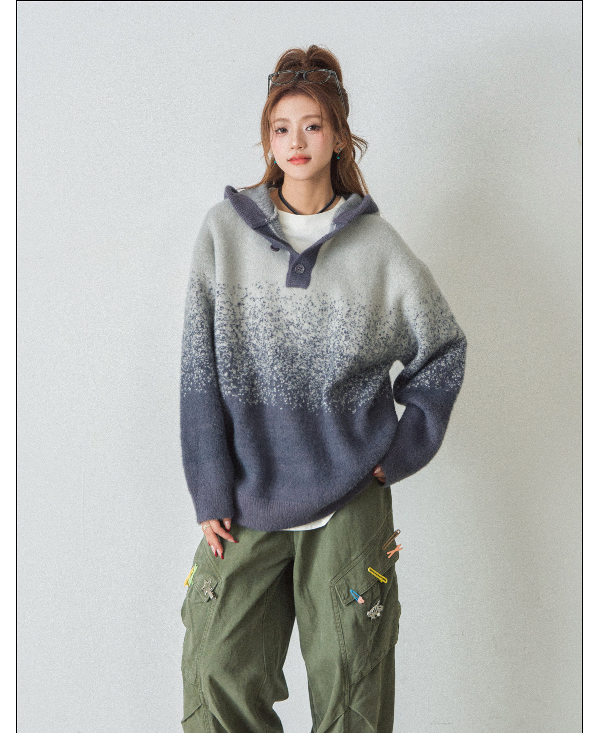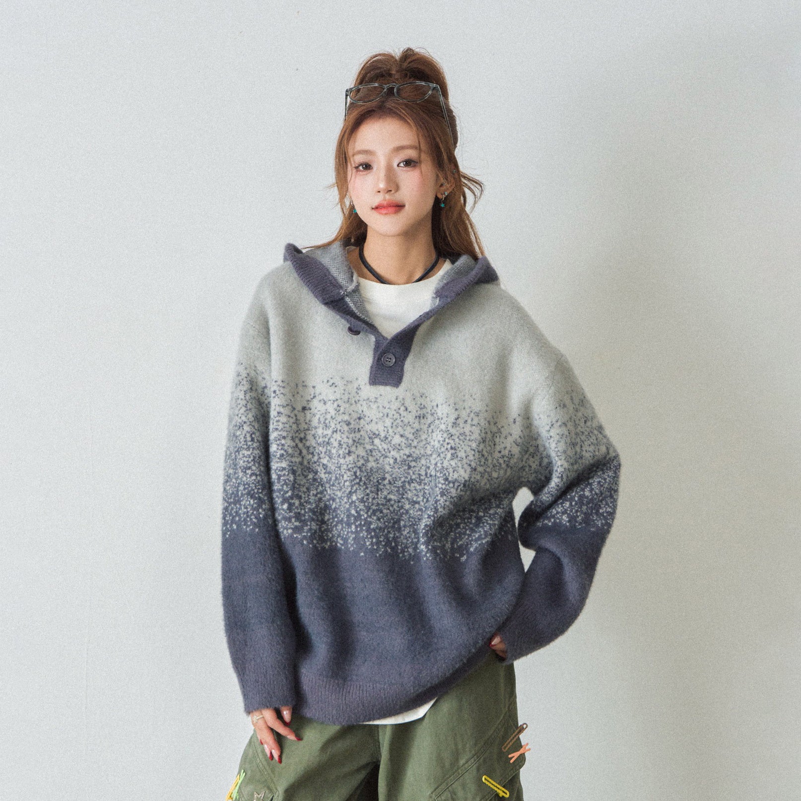 【トップス】ふわふわ カートゥーン柄 フード付きニットセーター レディース 新作 オーバーサイズ BF風 韓国風 ゆるニット【FCシリーズ】