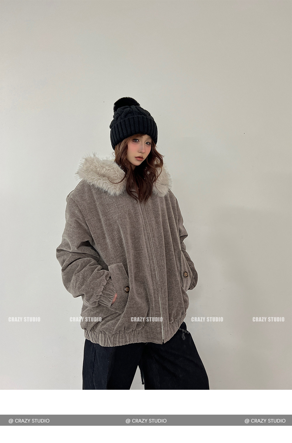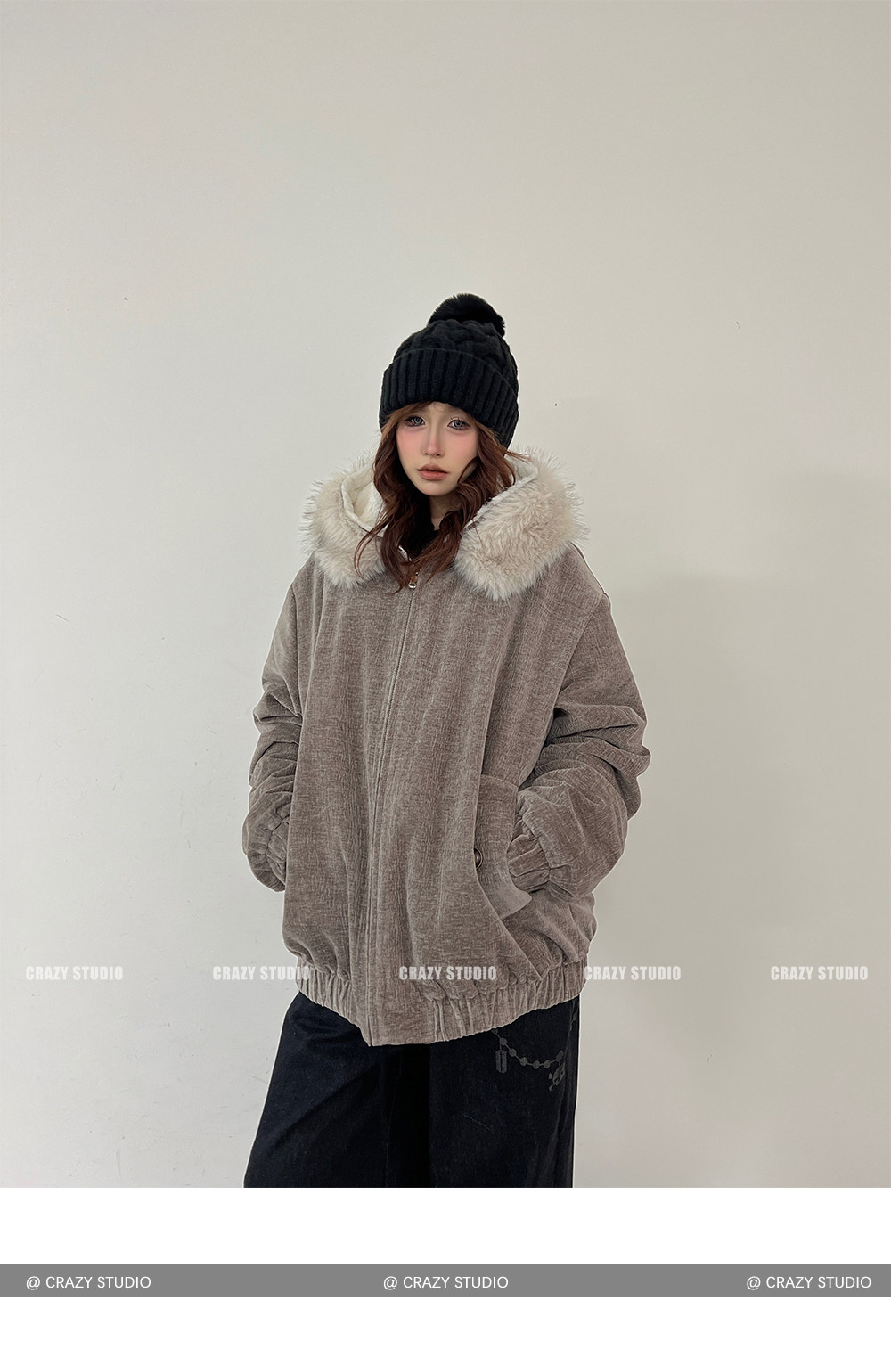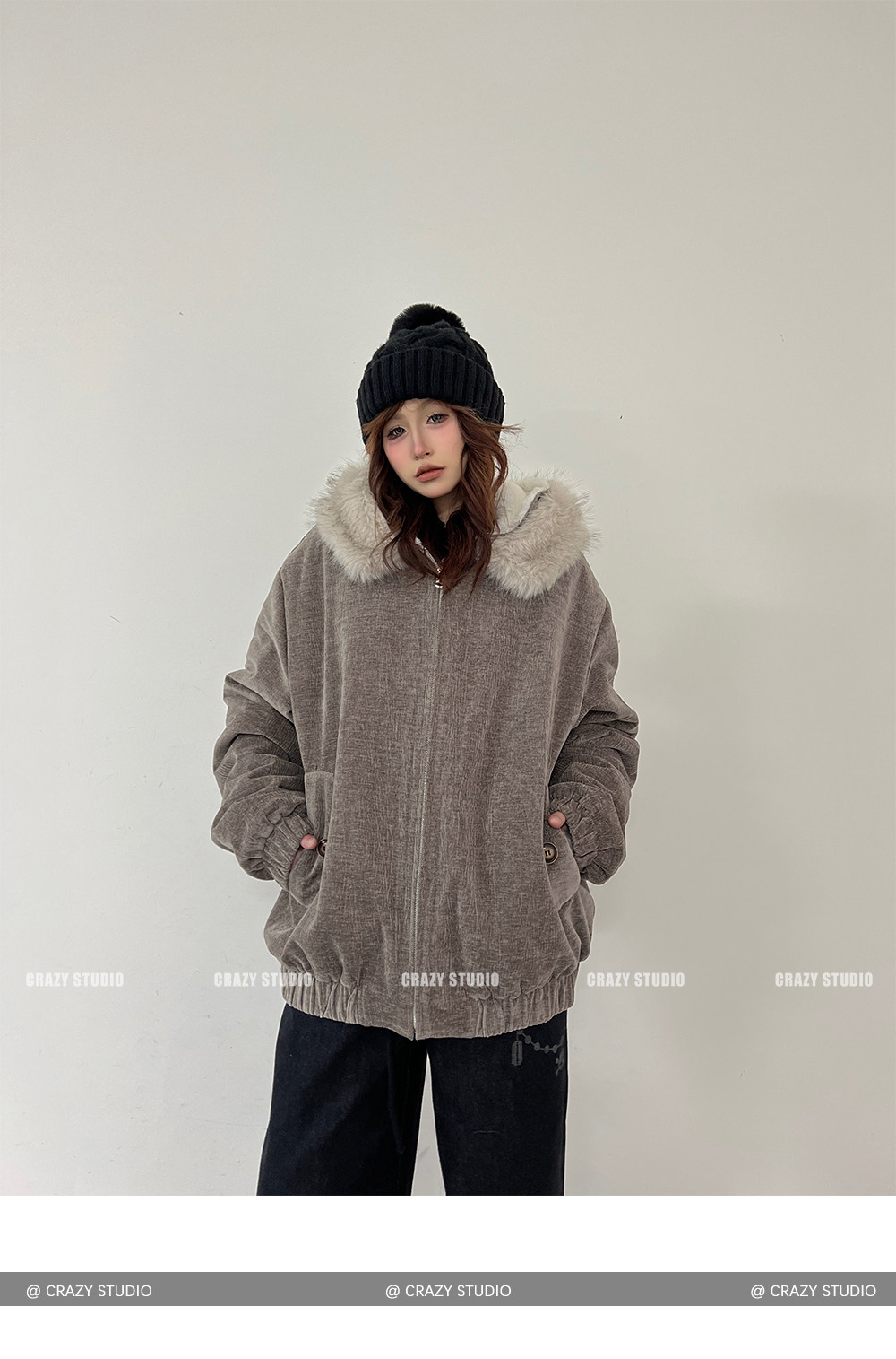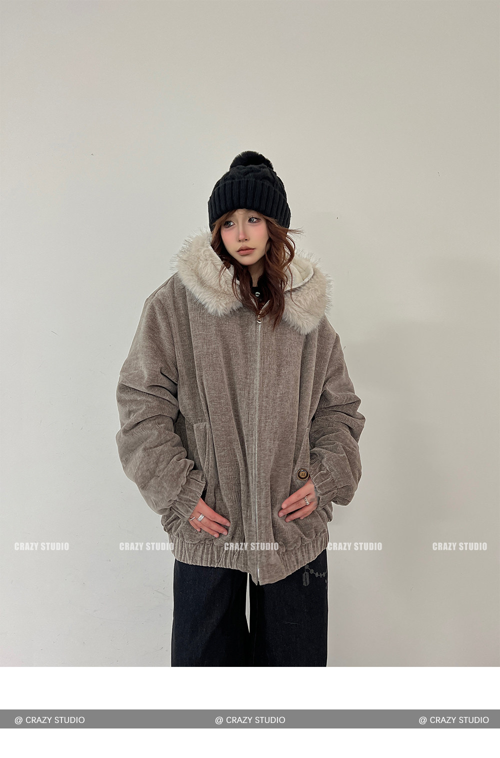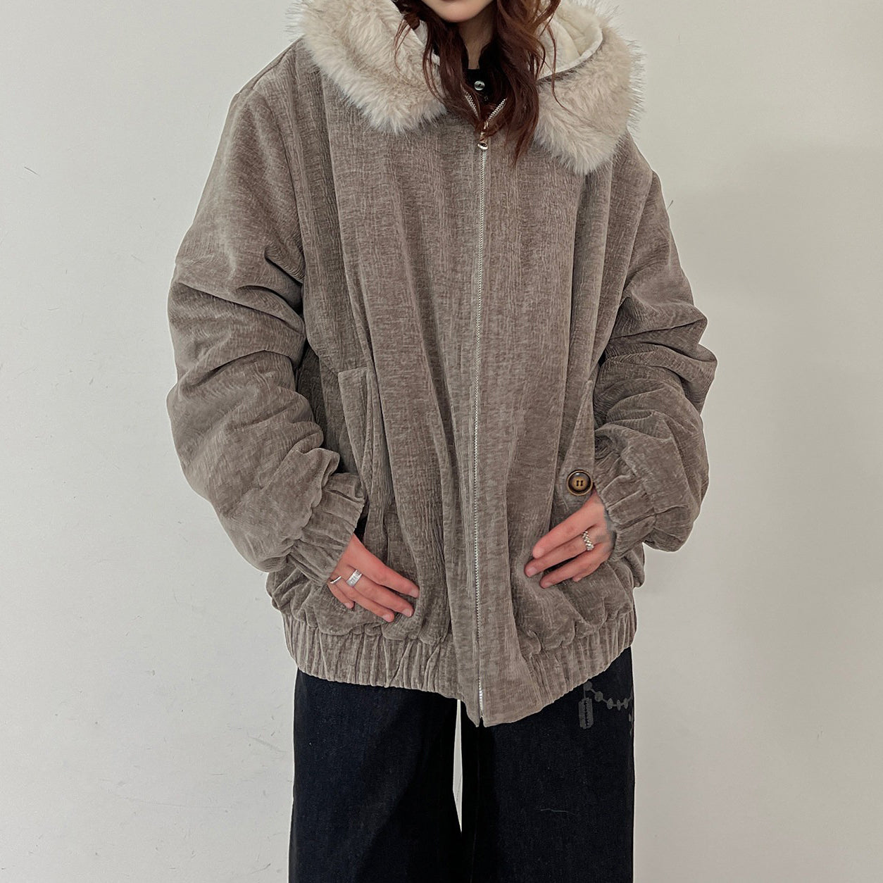 【商品名】【アウター】ヴィンテージ フード 中綿ジャケット レディース 秋冬 裏起毛 保温 オーバーサイズ ジップアップ【FCシリーズ】【20~25日内発送】