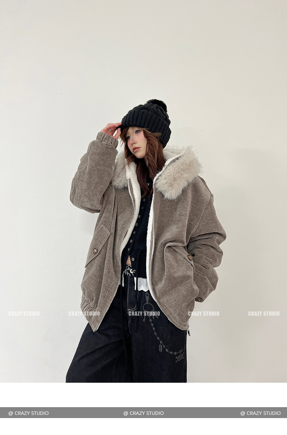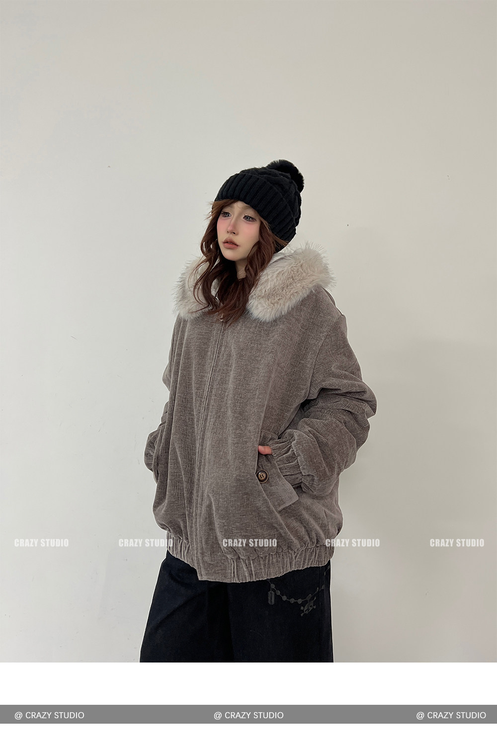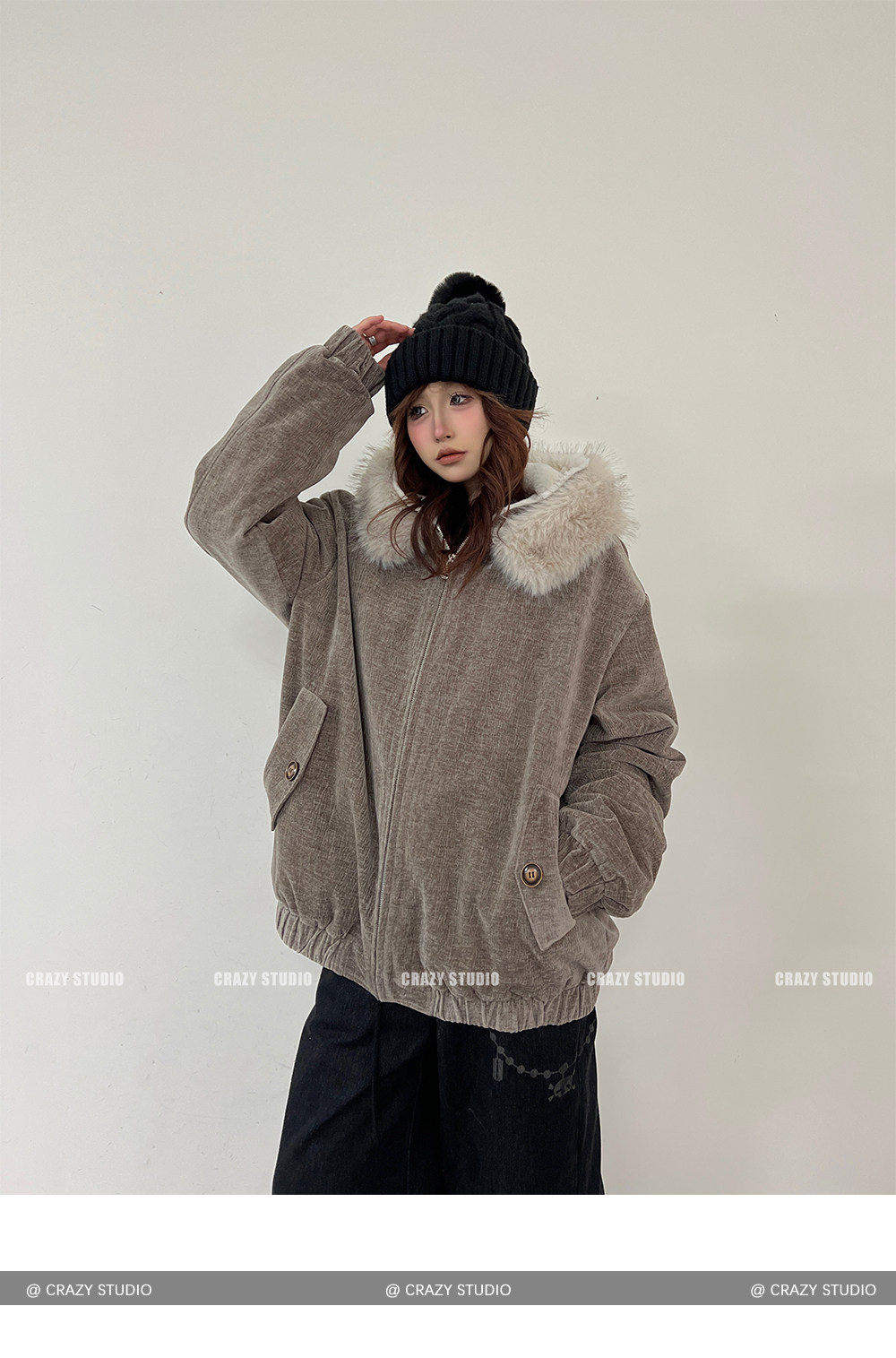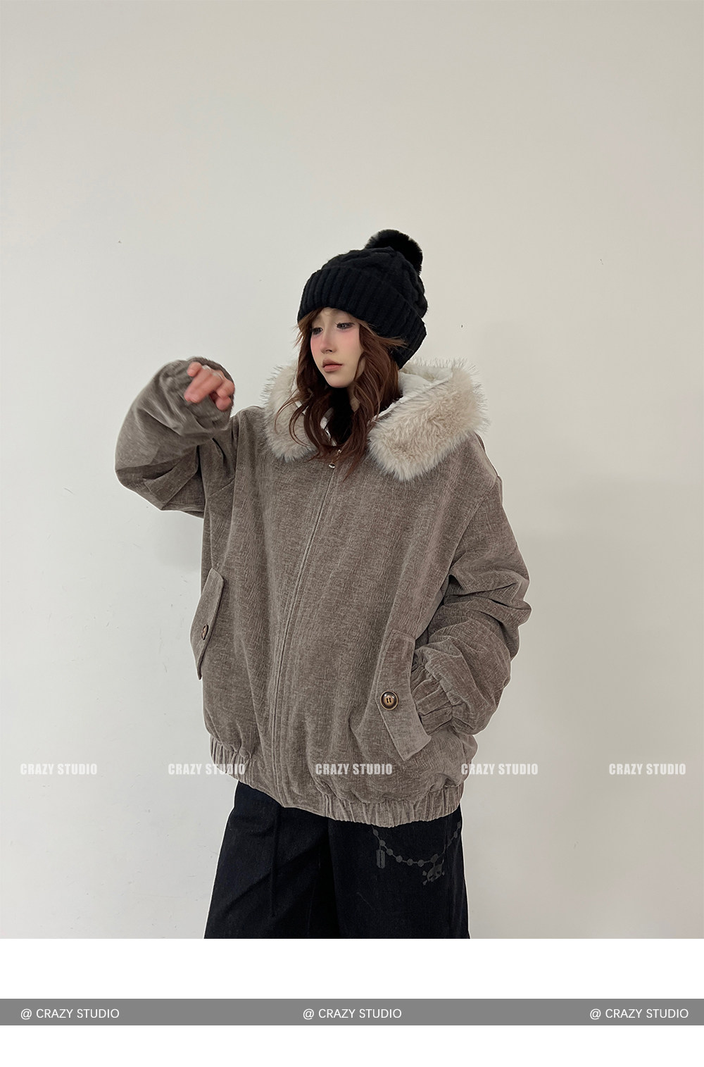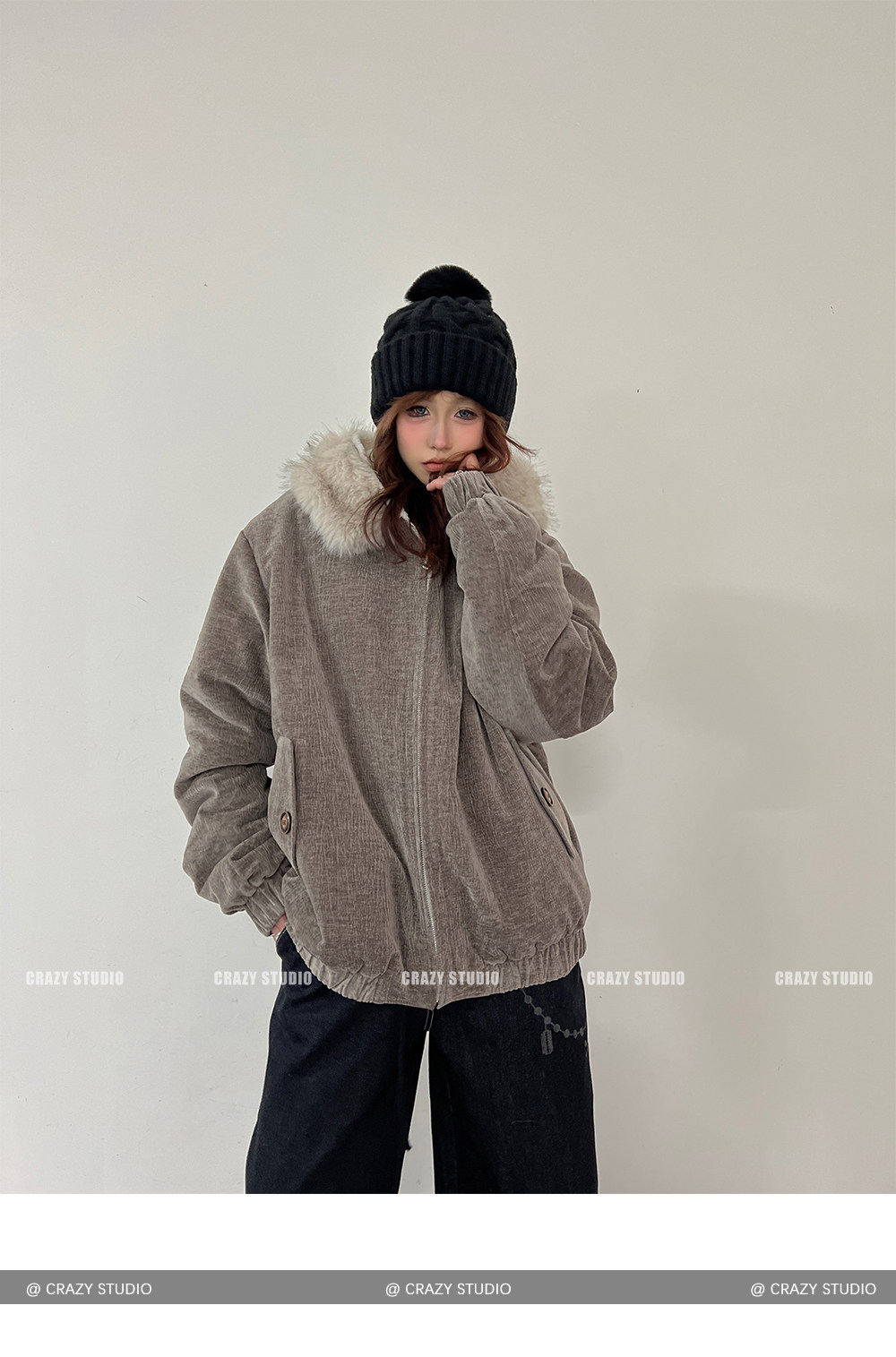 【商品名】【アウター】ヴィンテージ フード 中綿ジャケット レディース 秋冬 裏起毛 保温 オーバーサイズ ジップアップ【FCシリーズ】【20~25日内発送】