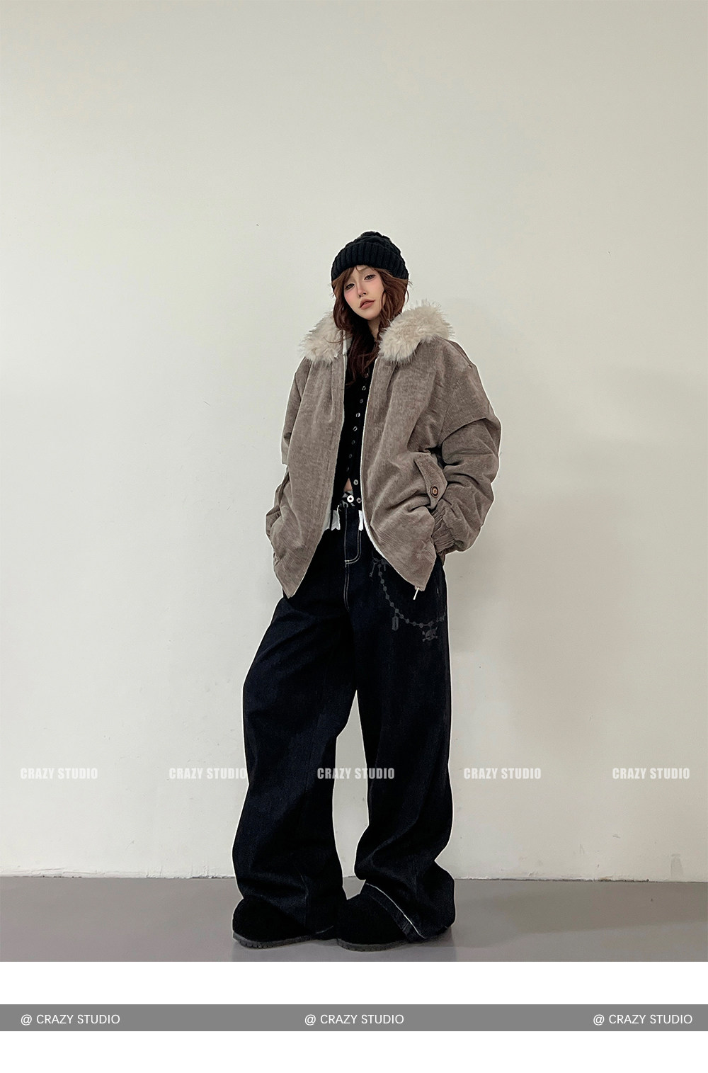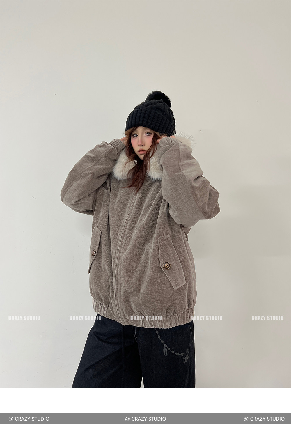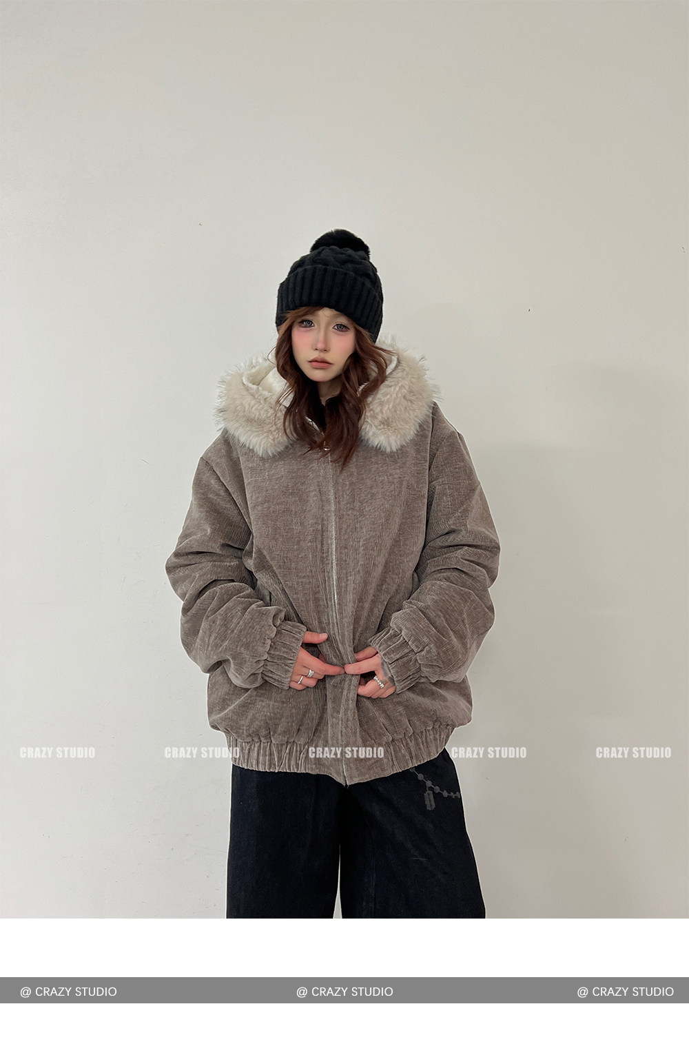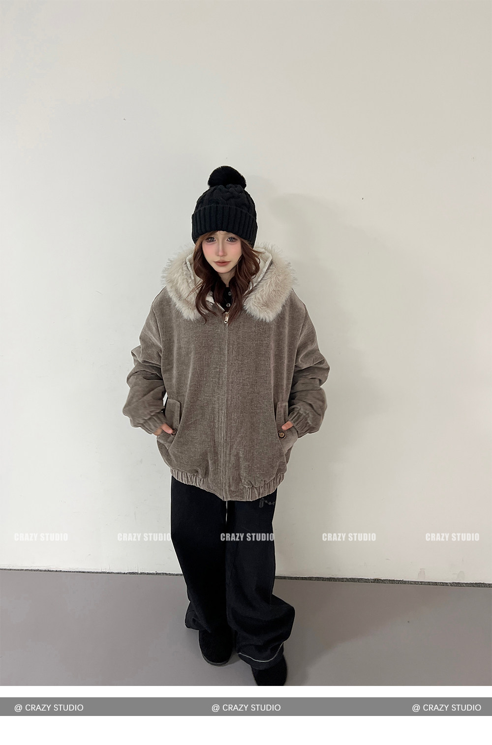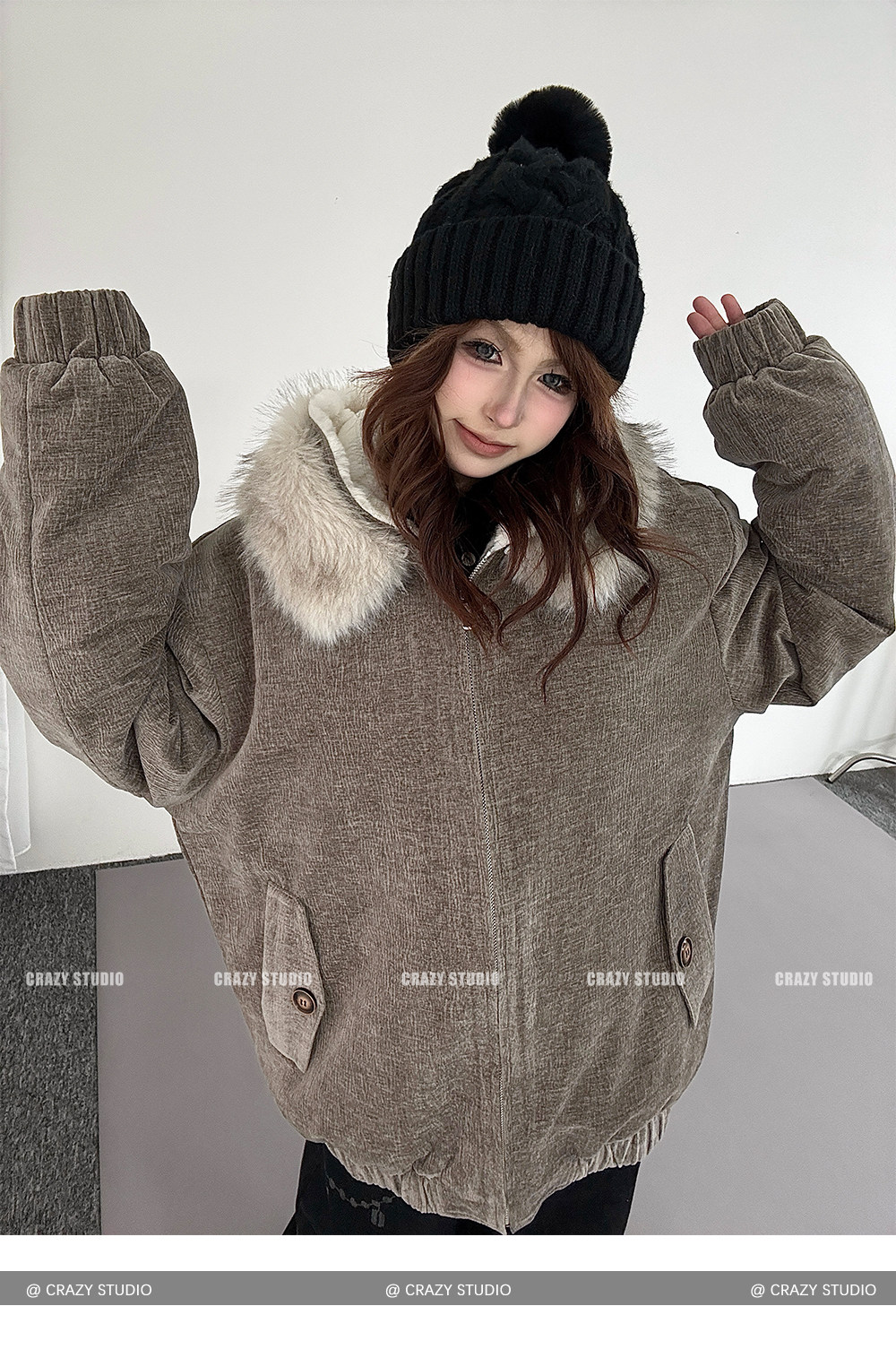 【商品名】【アウター】ヴィンテージ フード 中綿ジャケット レディース 秋冬 裏起毛 保温 オーバーサイズ ジップアップ【FCシリーズ】【20~25日内発送】