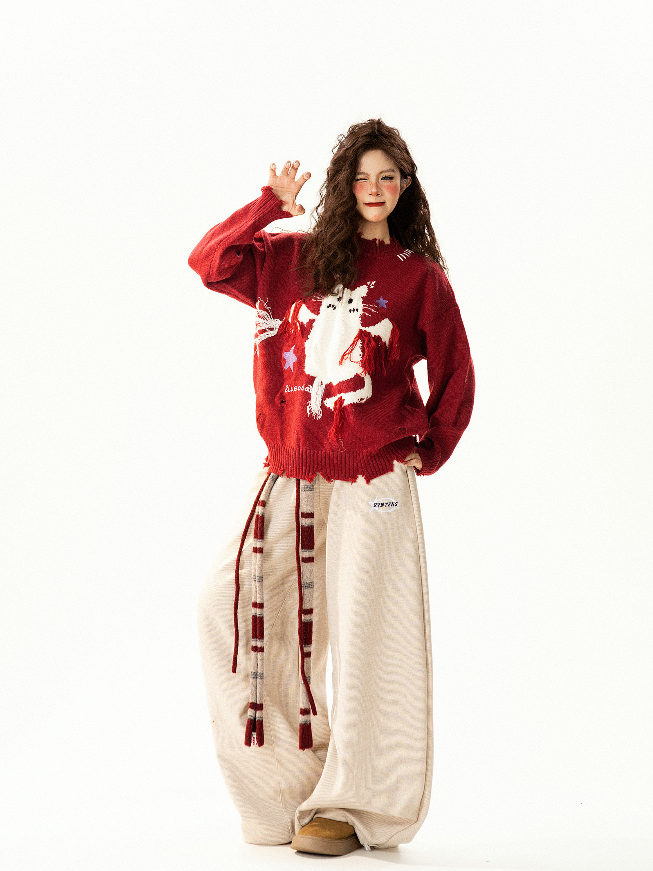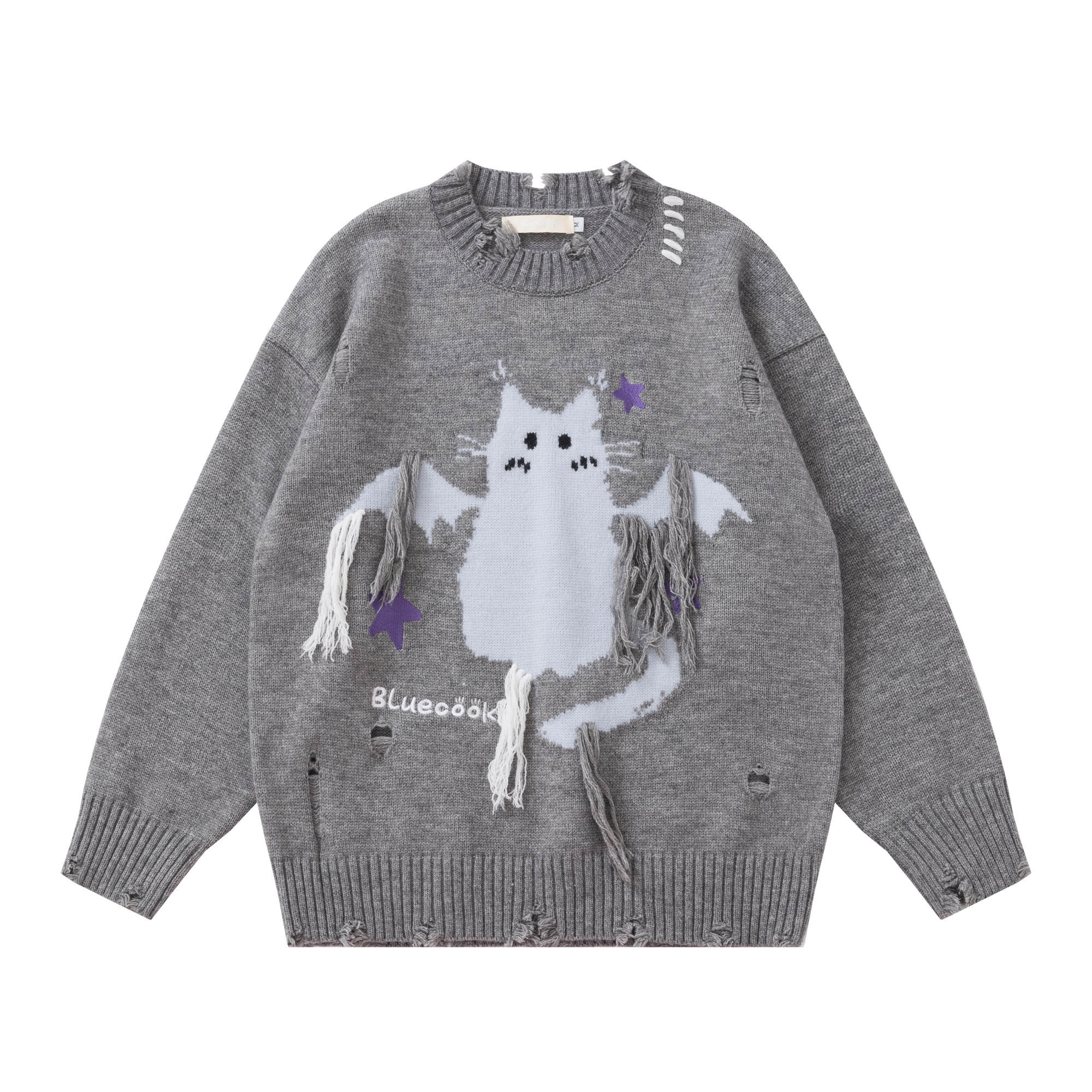 【商品名】【トップス】レトロ 猫柄ジャカード クルーネック ニット レディース フリンジデザイン ゆったり 着回し セーター【FCシリーズ】