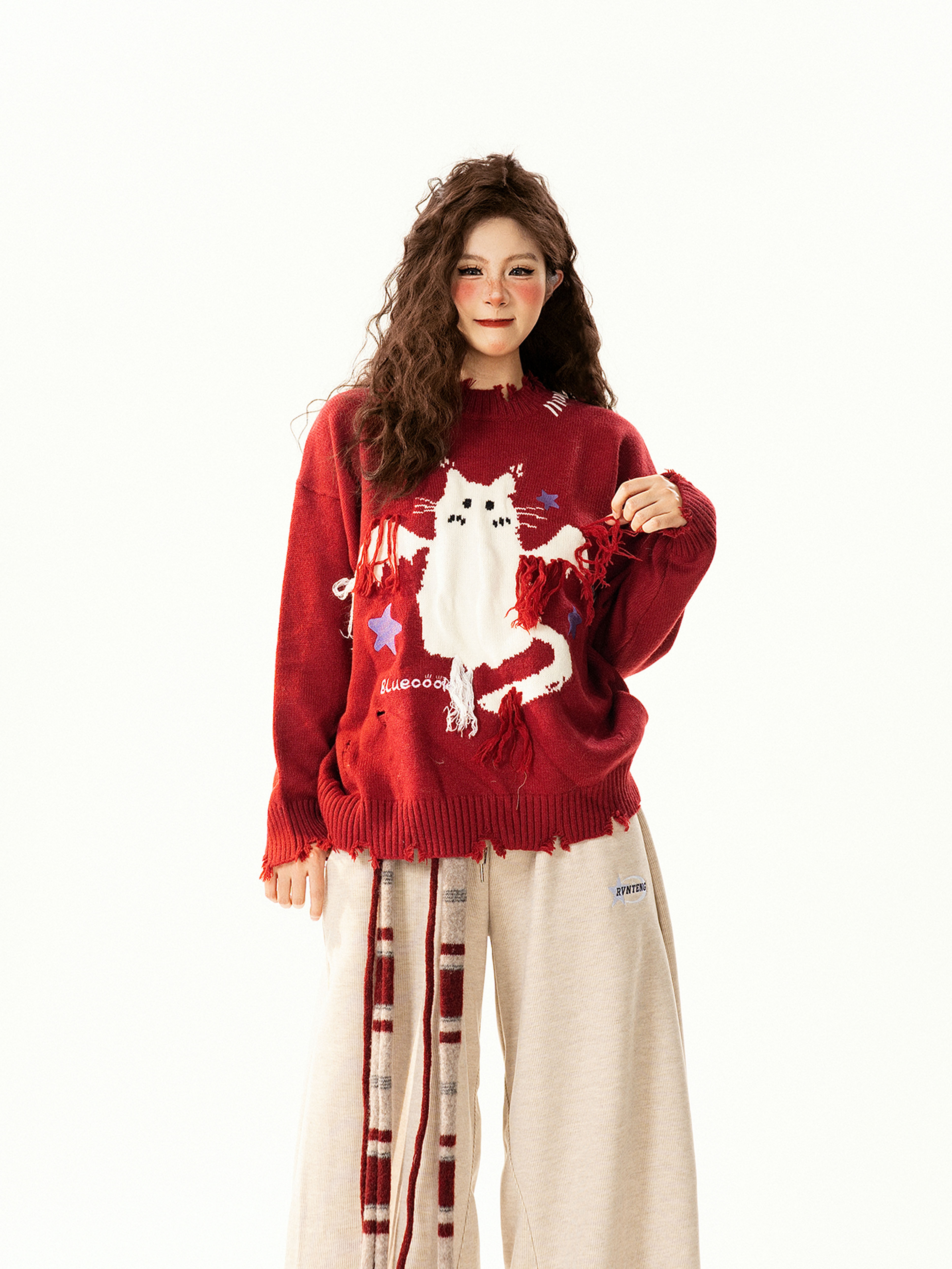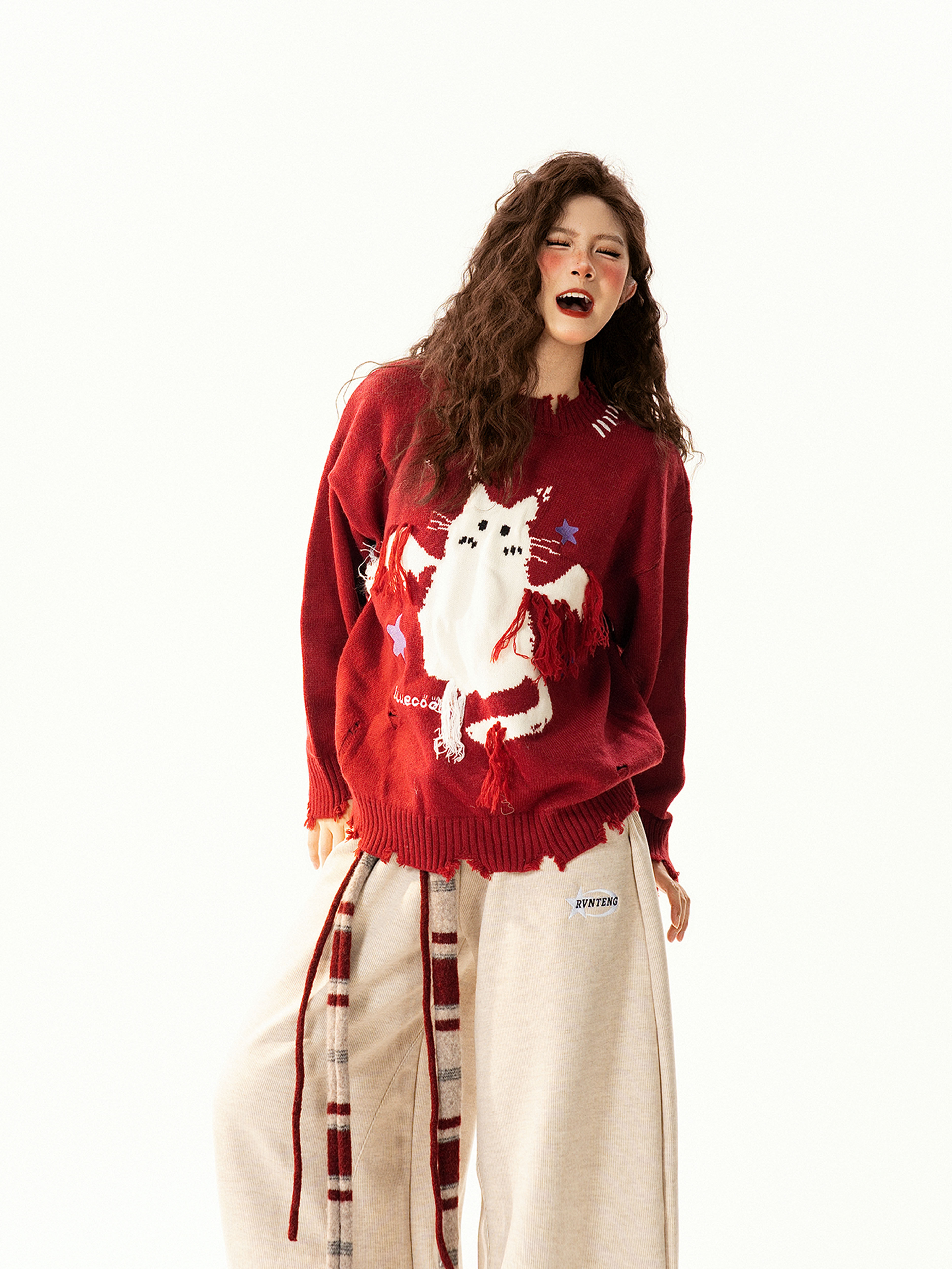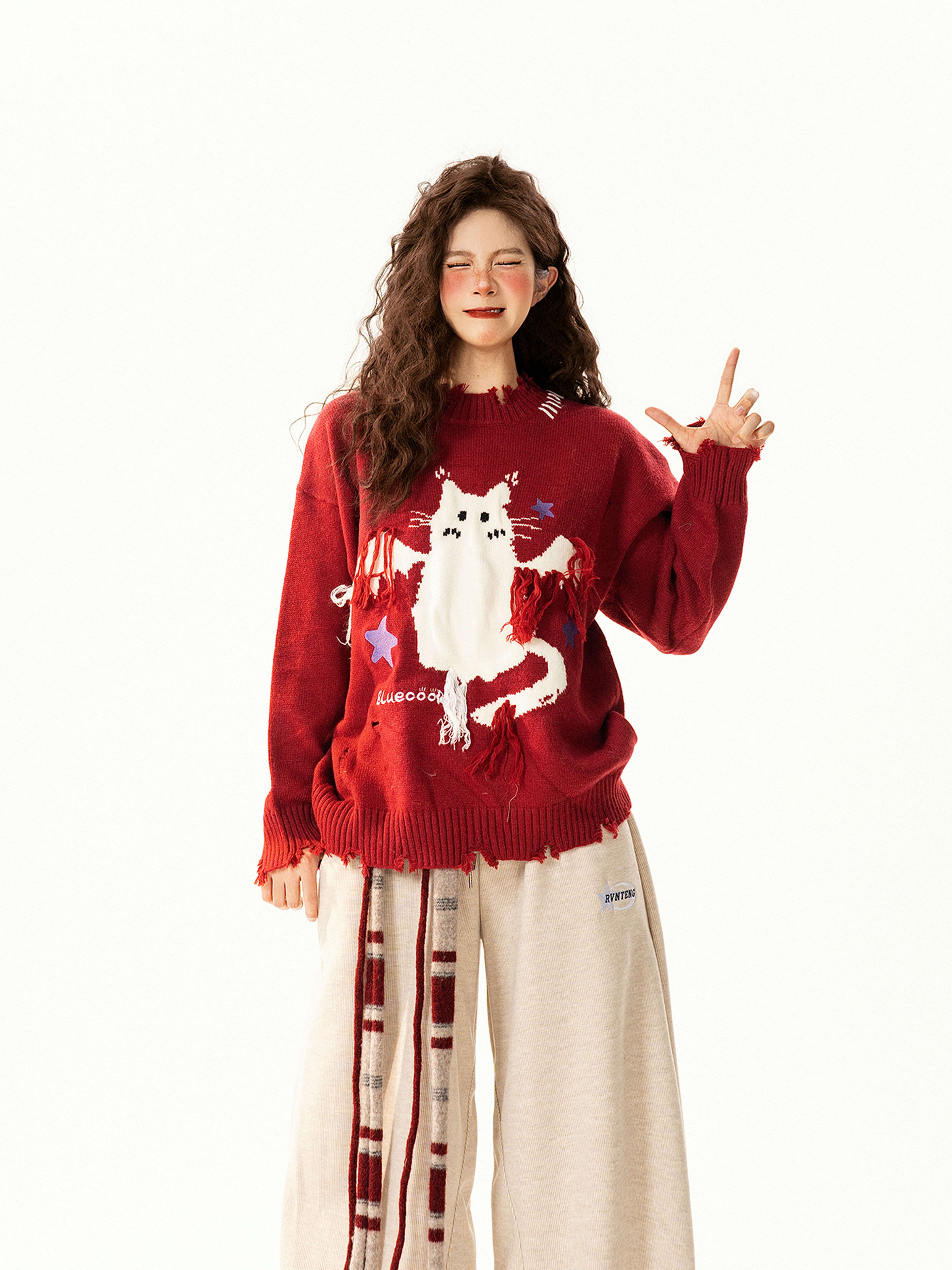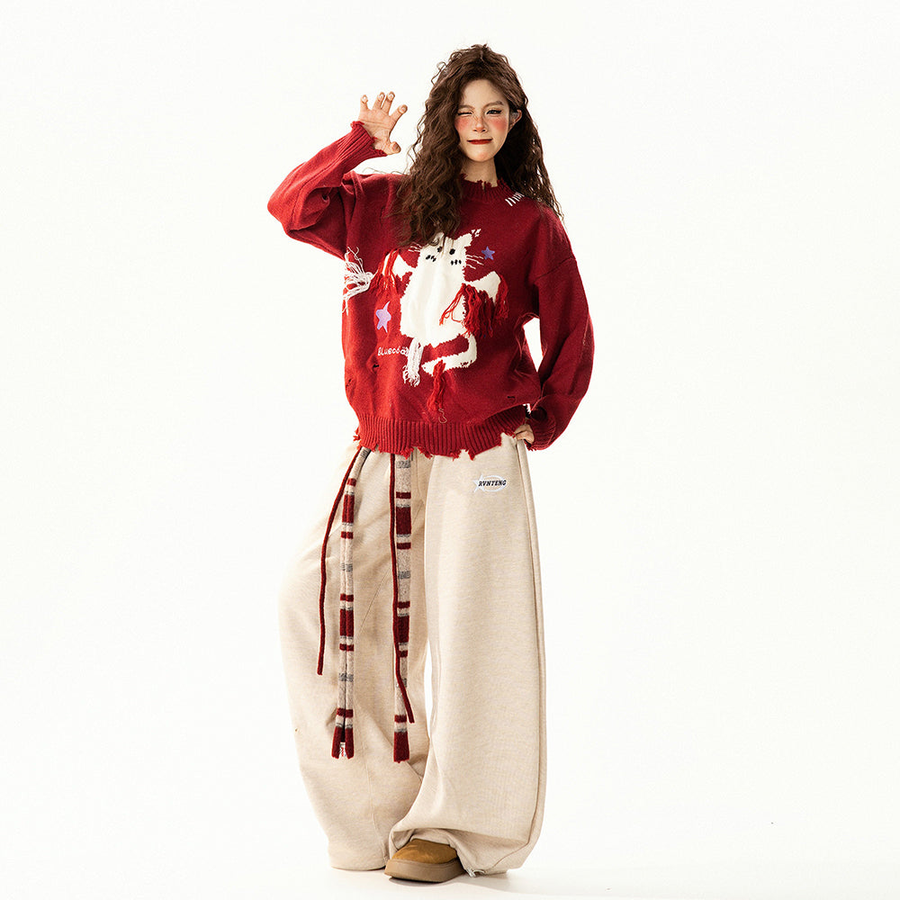 【トップス】レトロ 猫柄ジャカード クルーネック ニット レディース フリンジデザイン ゆったり 着回し セーター【FCシリーズ】