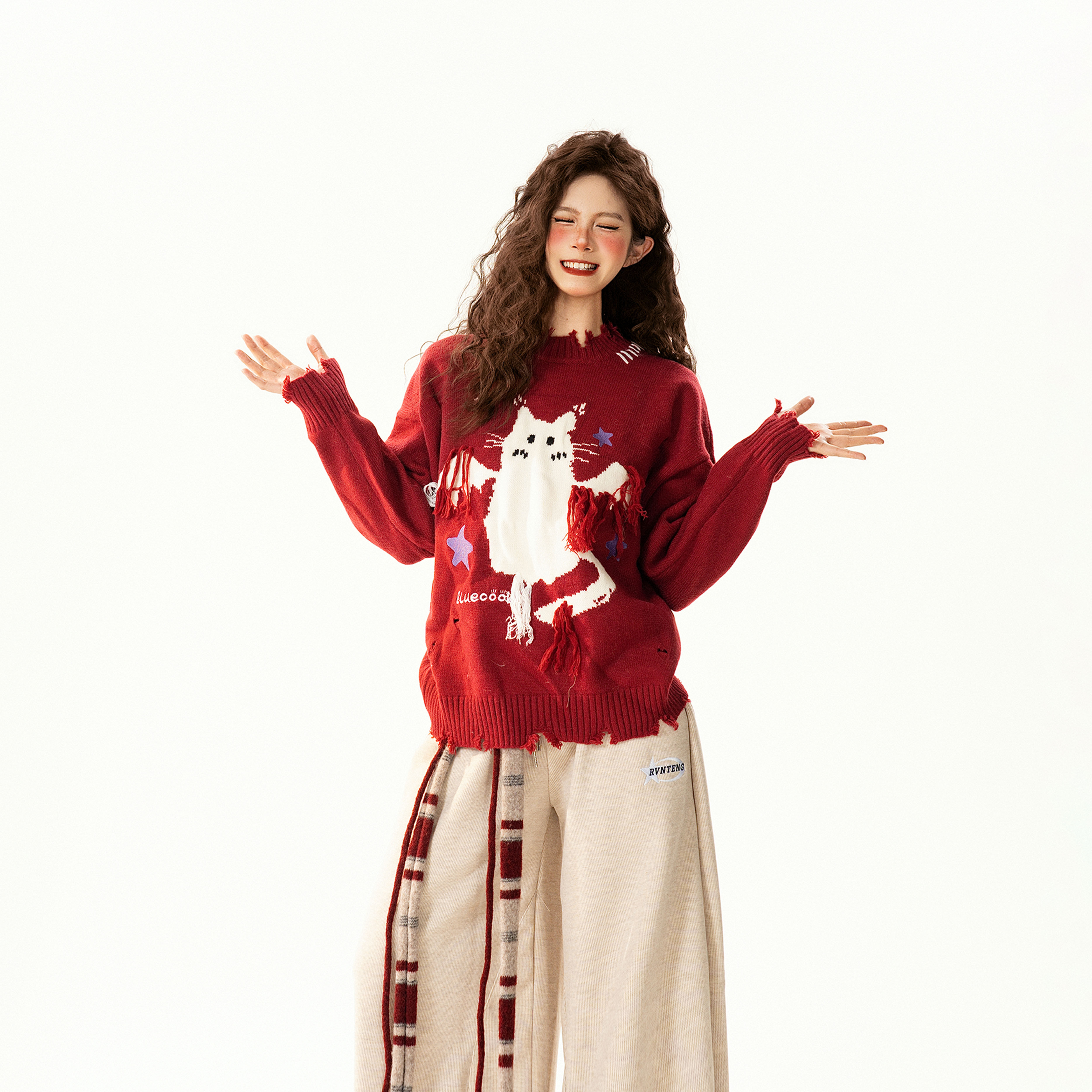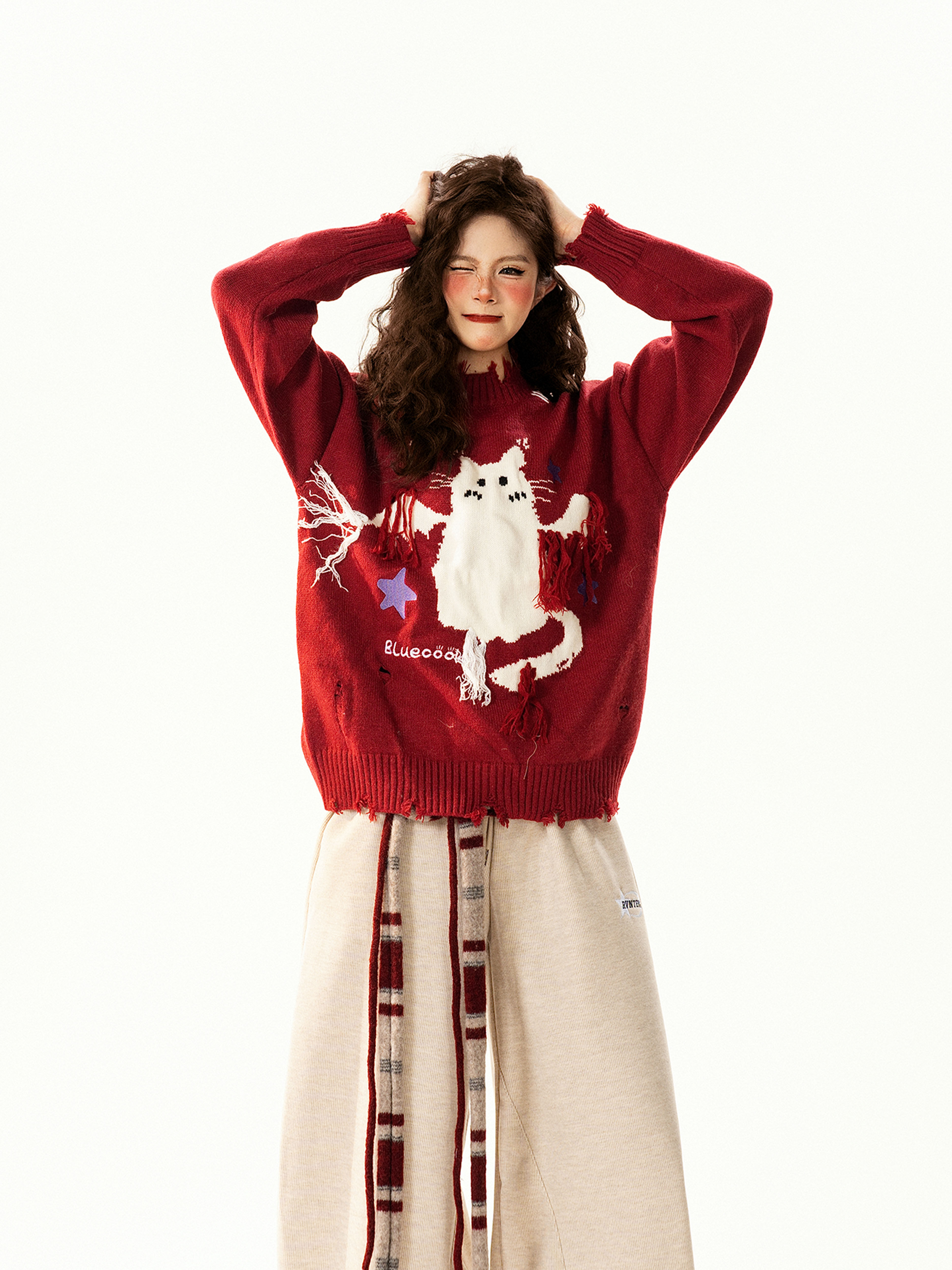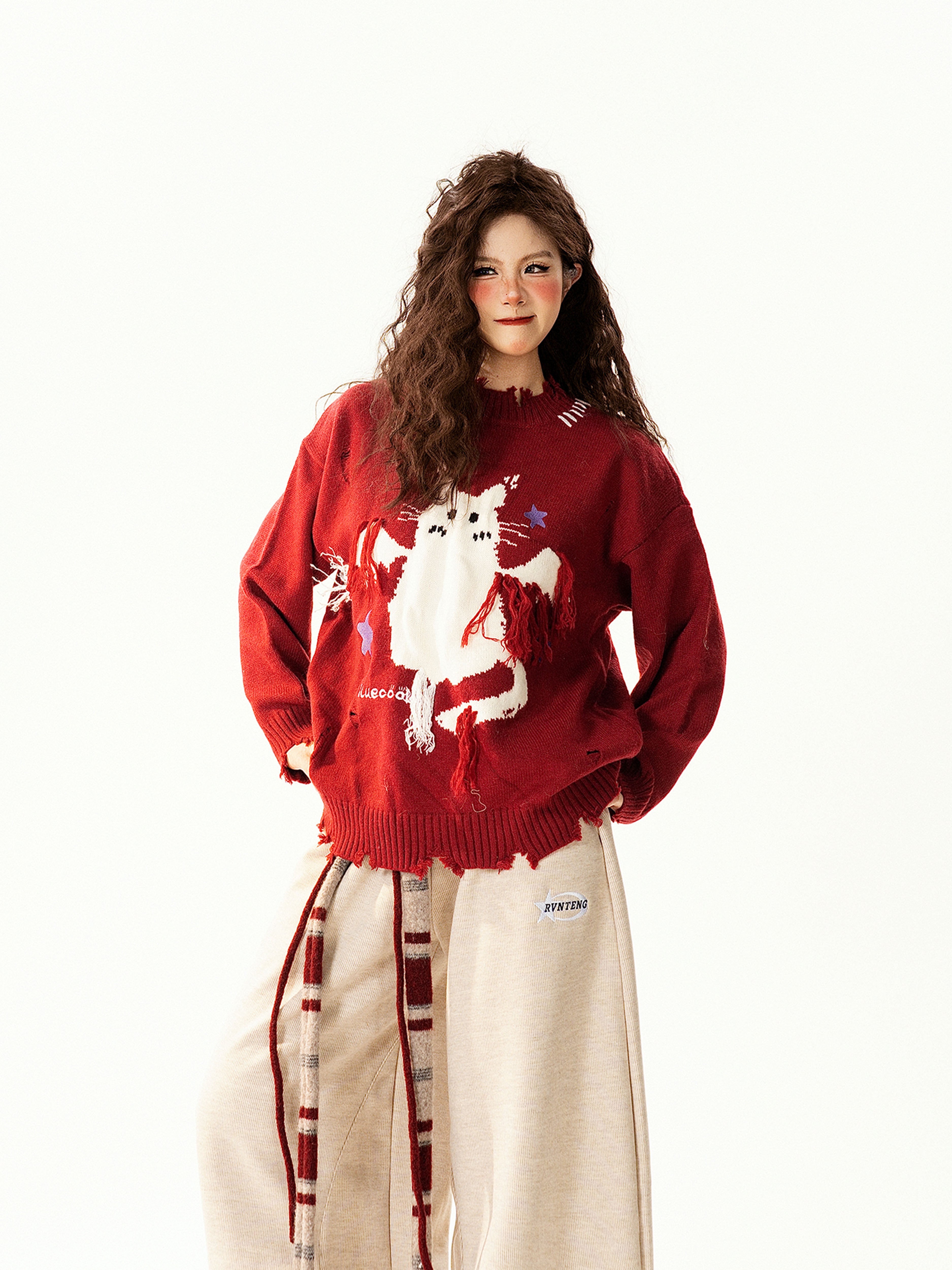 【トップス】レトロ 猫柄ジャカード クルーネック ニット レディース フリンジデザイン ゆったり 着回し セーター【FCシリーズ】
