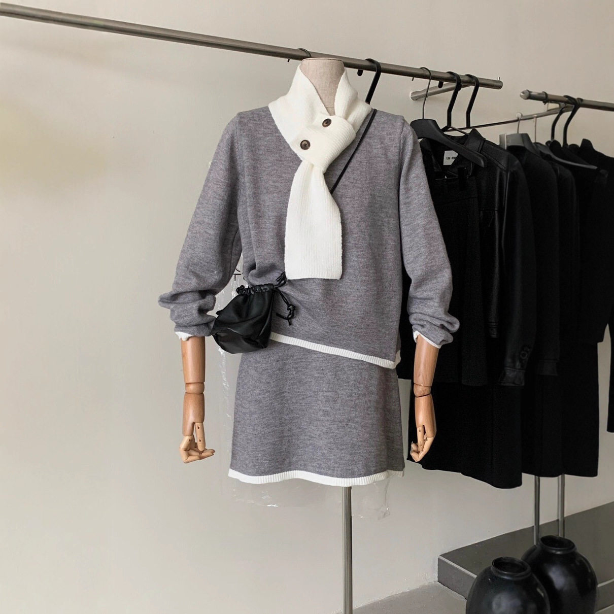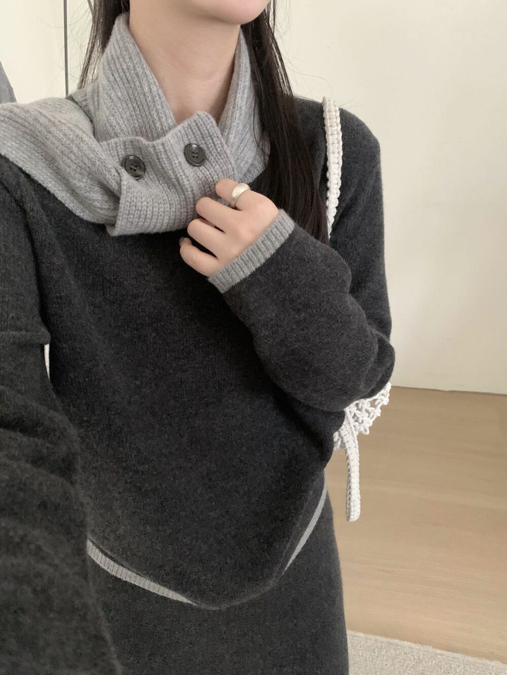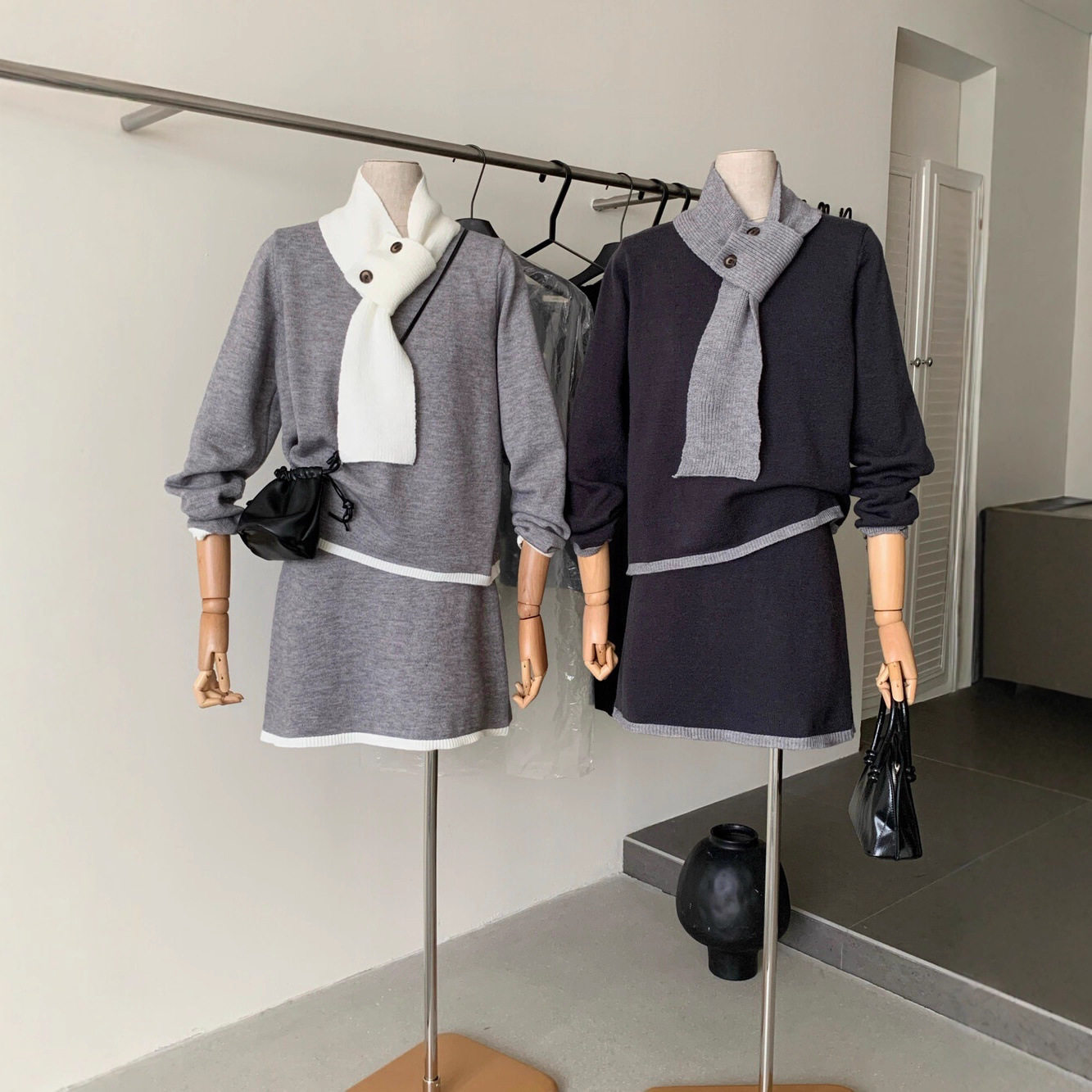 【セットアップ】韓国風 リラックス 配色デザイン ツイード風 ニットトップス+ミニスカート+マフラー 3点上下セット レディース【JZシリーズ】
