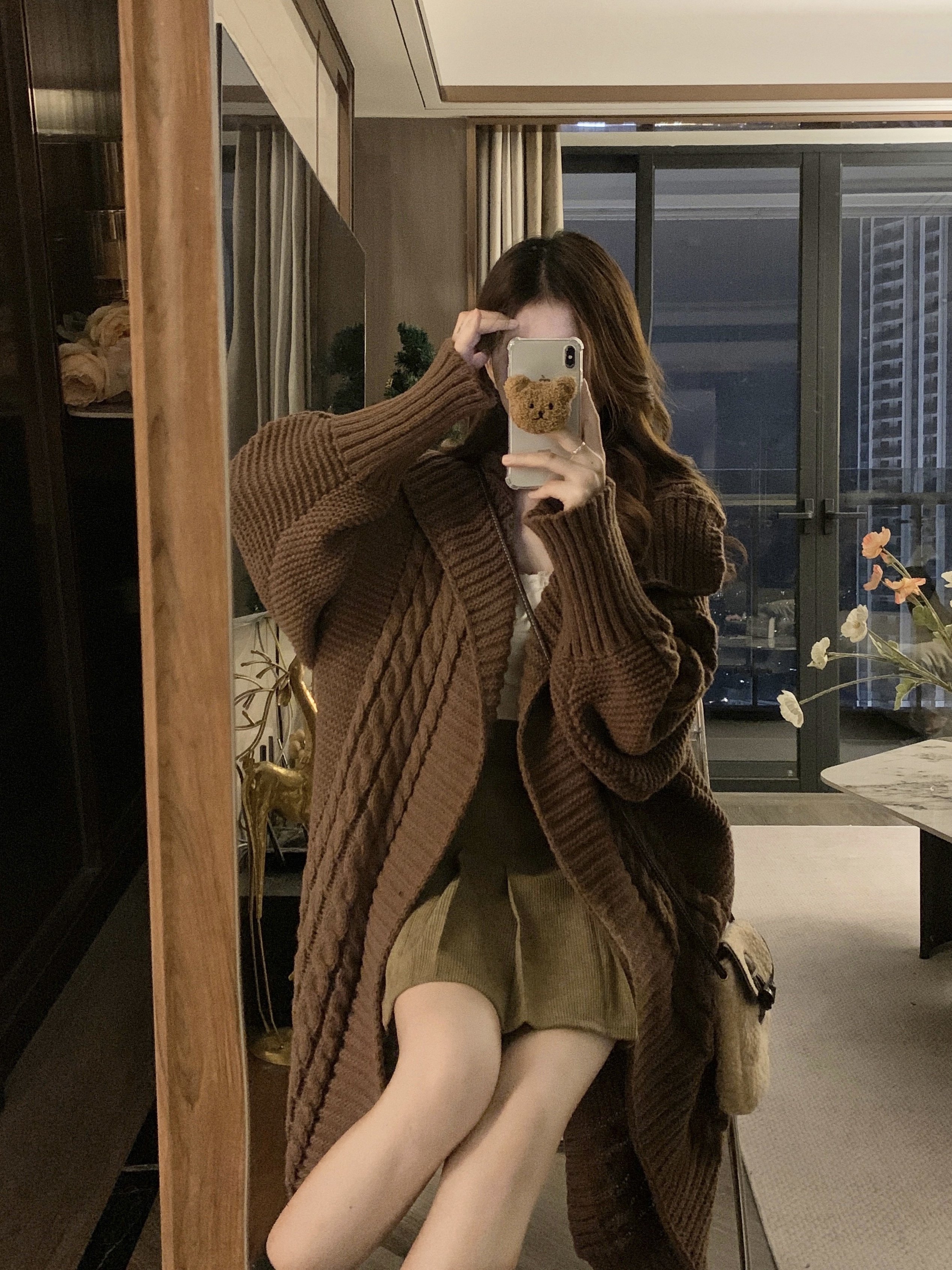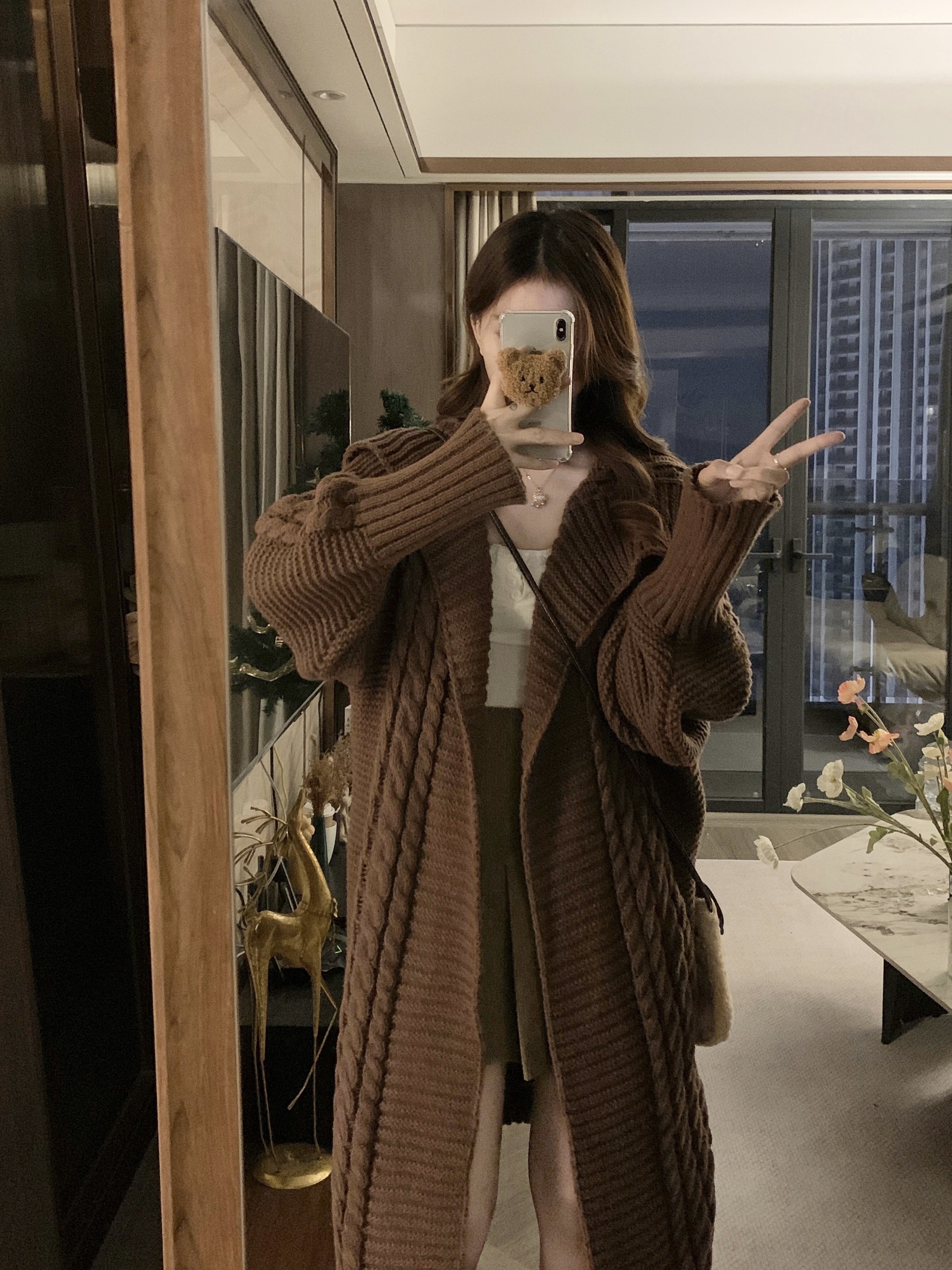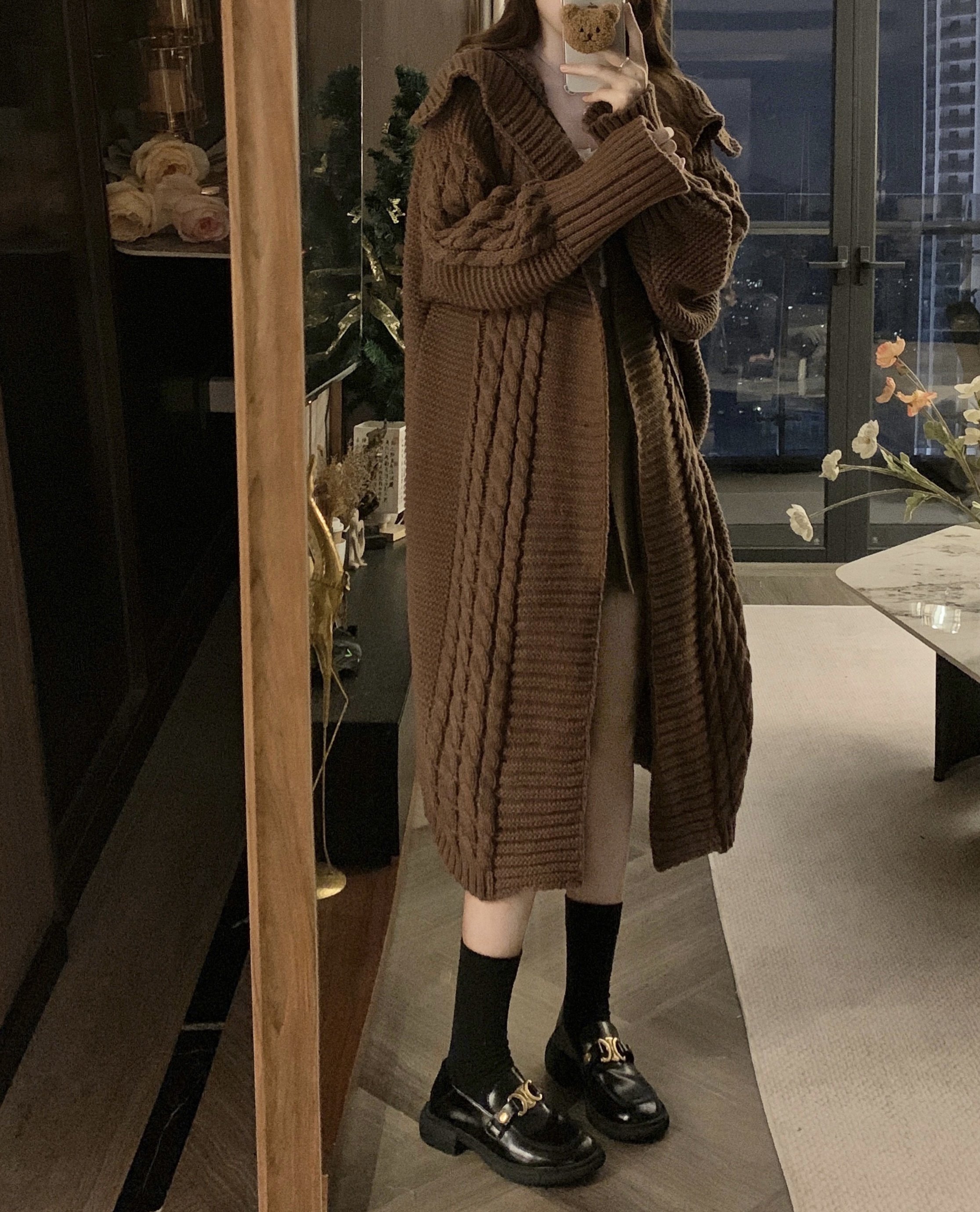 【アウター】リラックス感 キャメル 大きめ襟 ケーブル編み ニットカーディガン 中長丈 【JZシリーズ】
