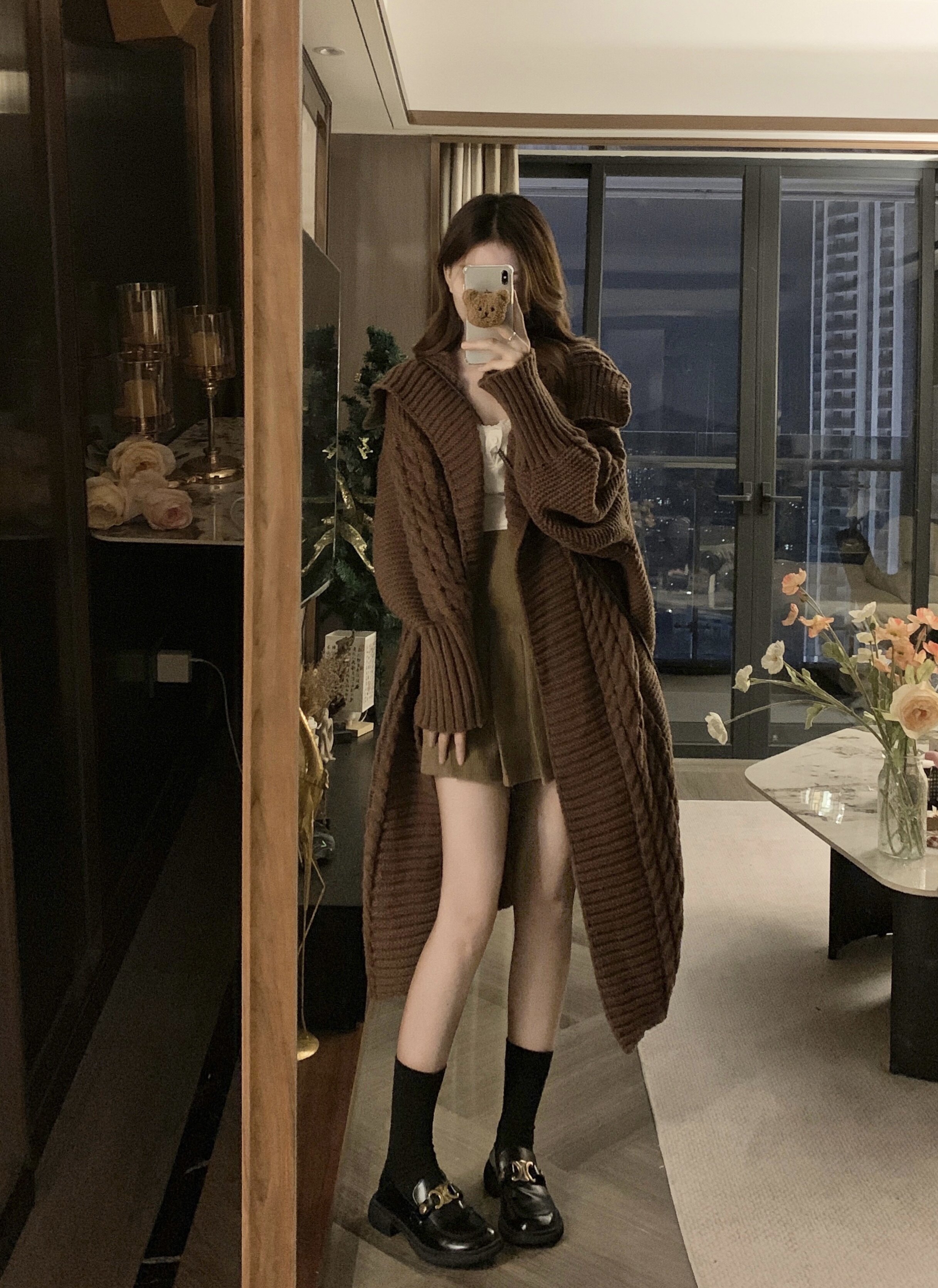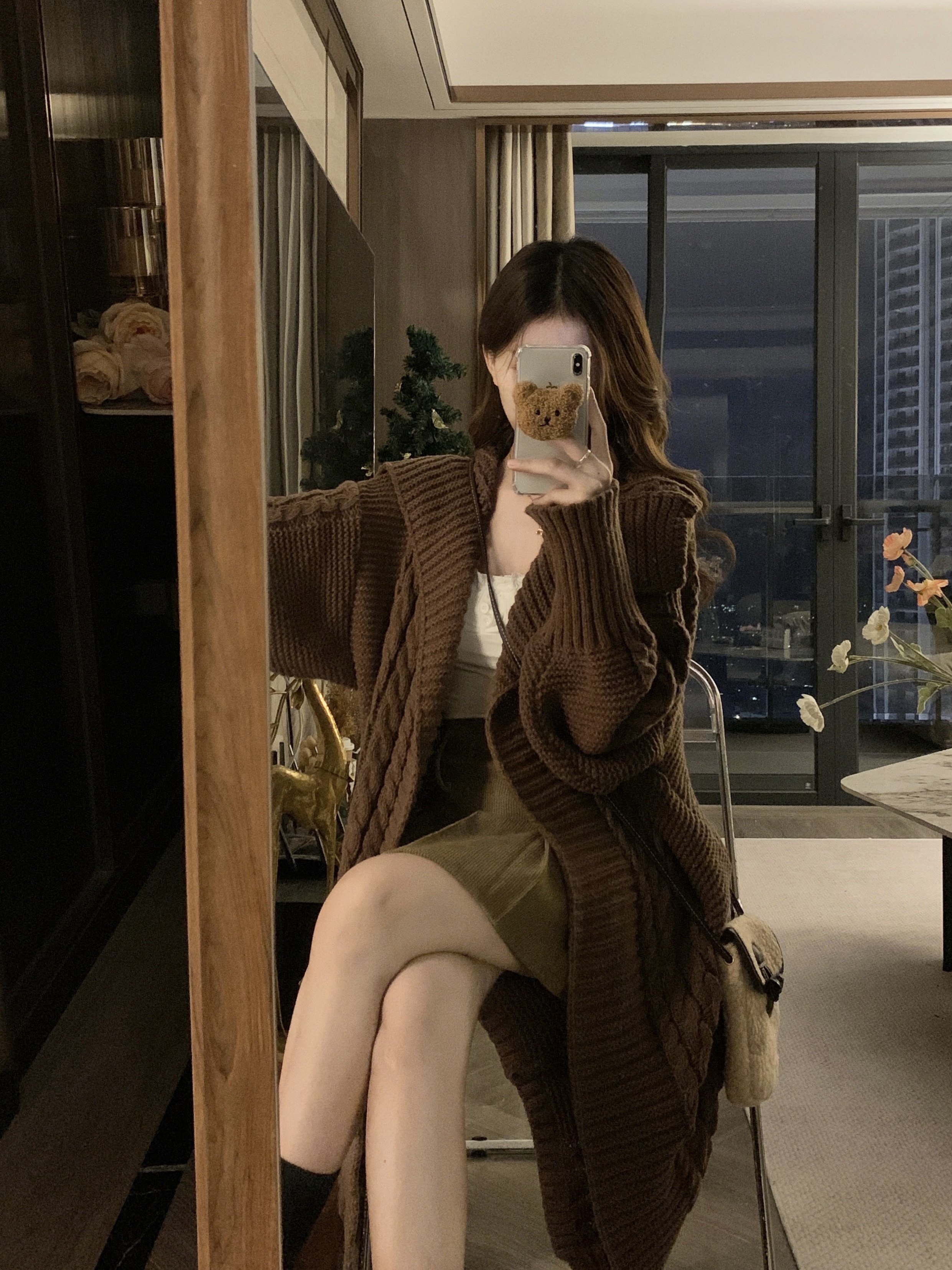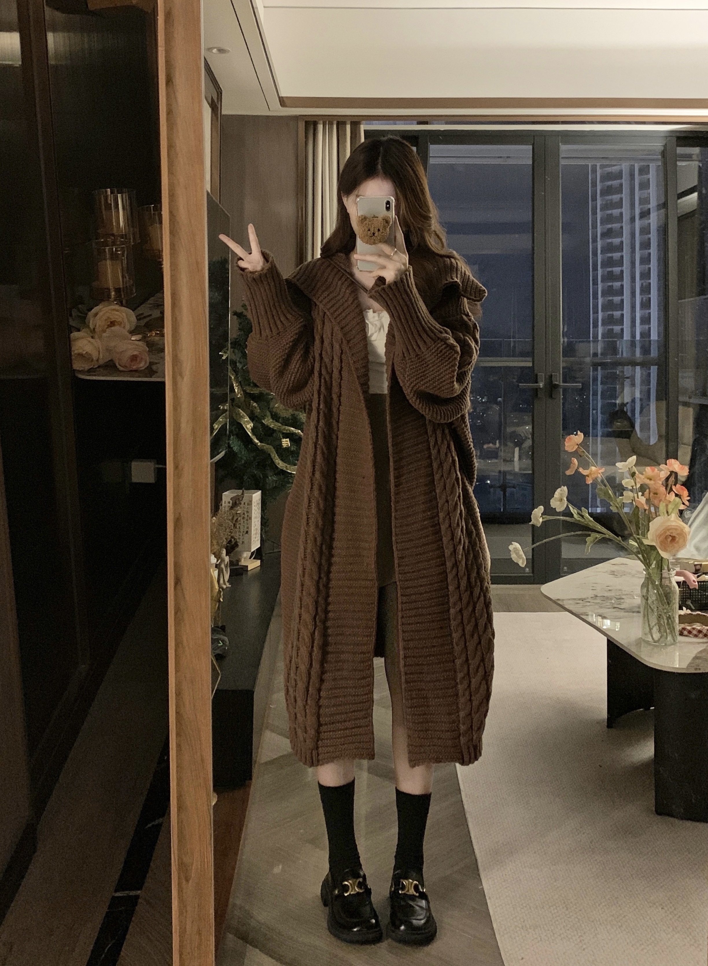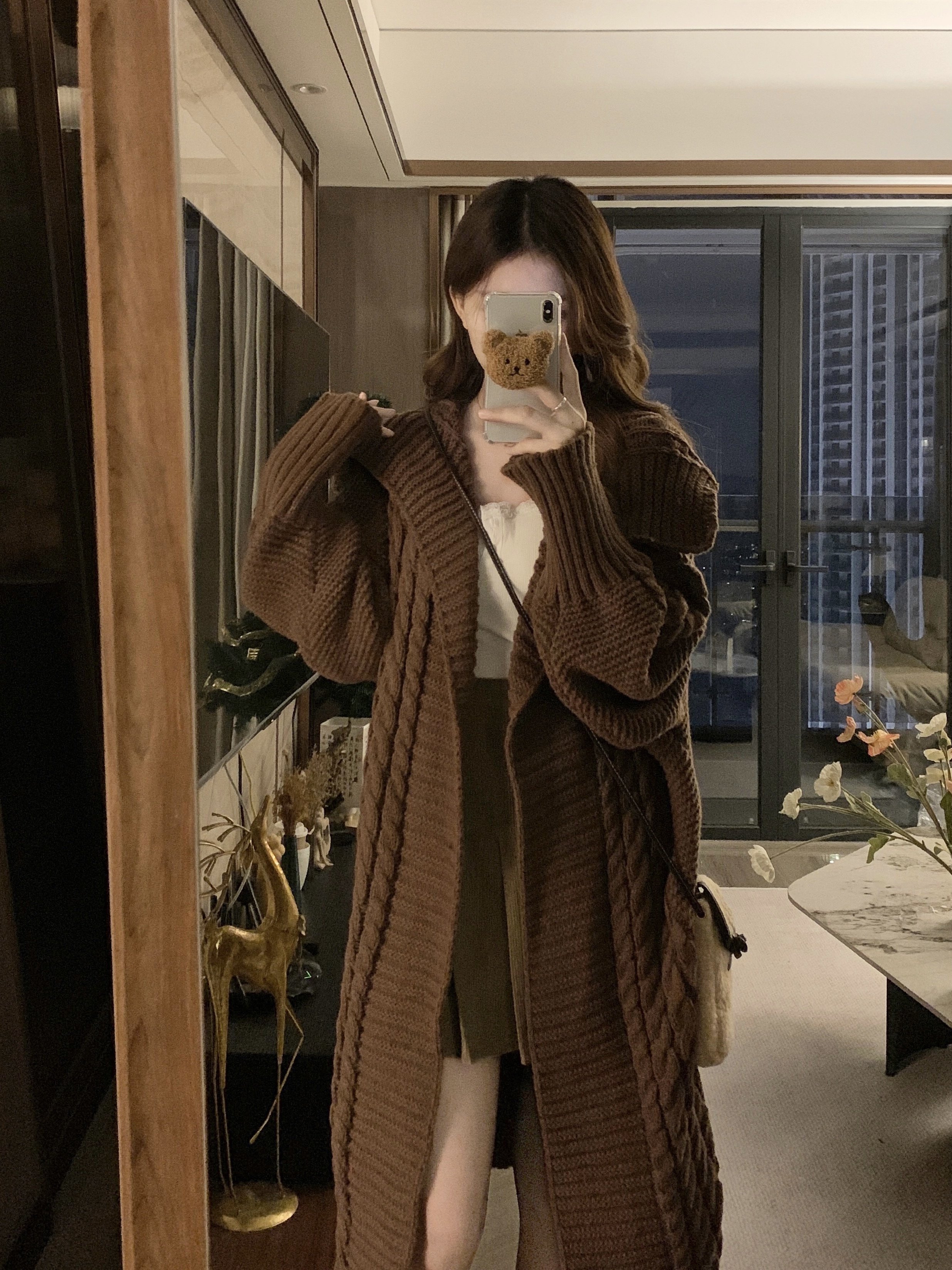 【アウター】リラックス感 キャメル 大きめ襟 ケーブル編み ニットカーディガン 中長丈 【JZシリーズ】