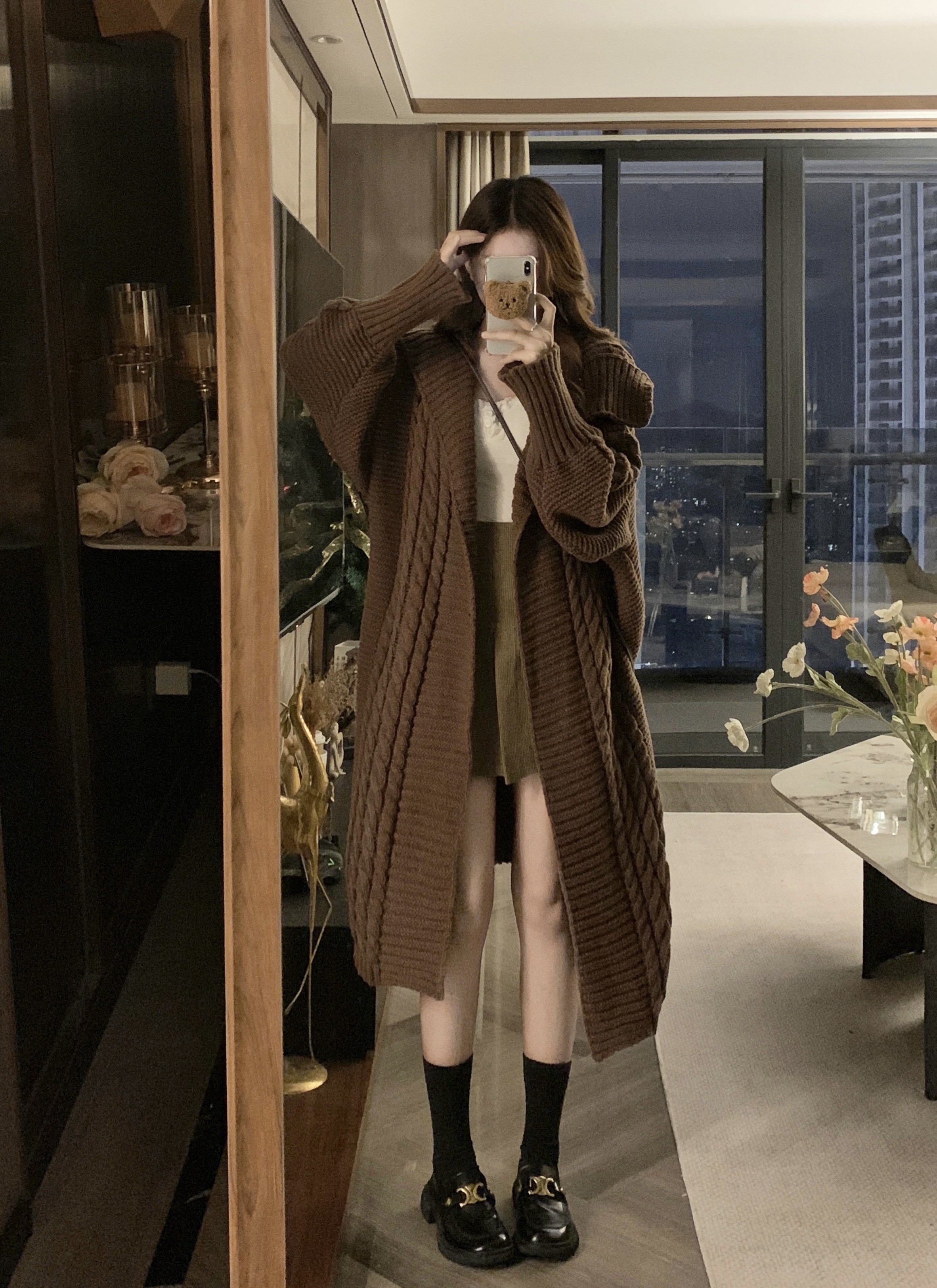 【ワンピース】Vネック ジャカードニットワンピース 秋冬 厚手 ルーズ トレンド 長袖 ロングワンピ【AHシリーズ】