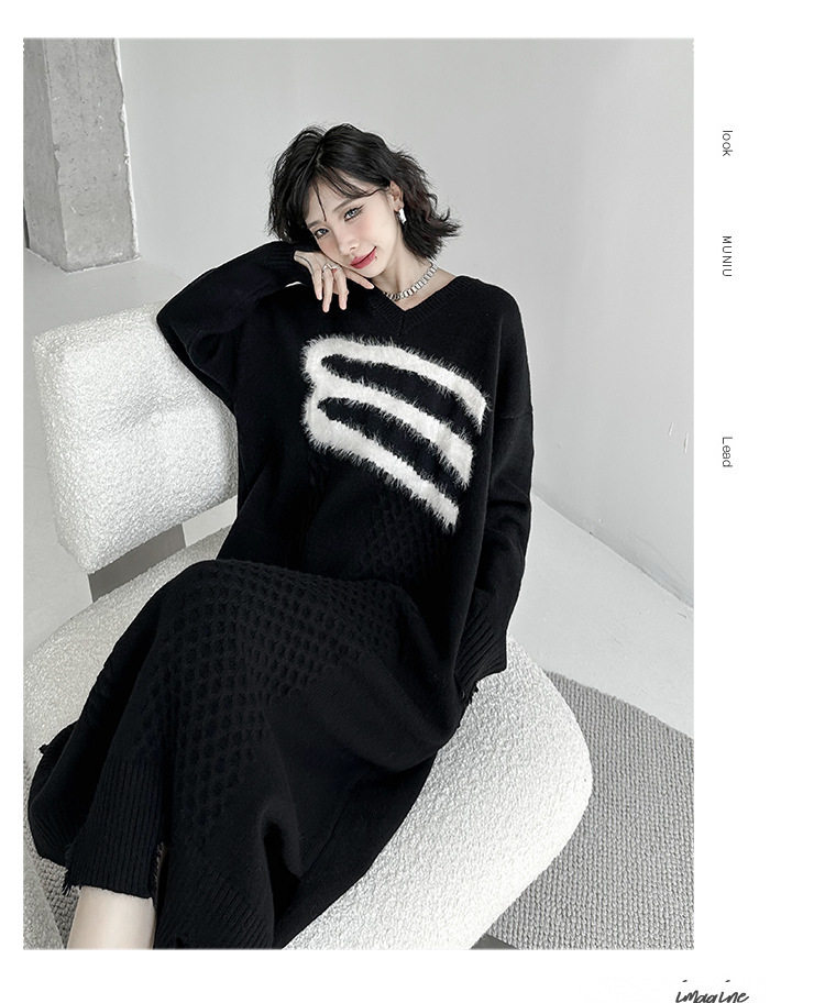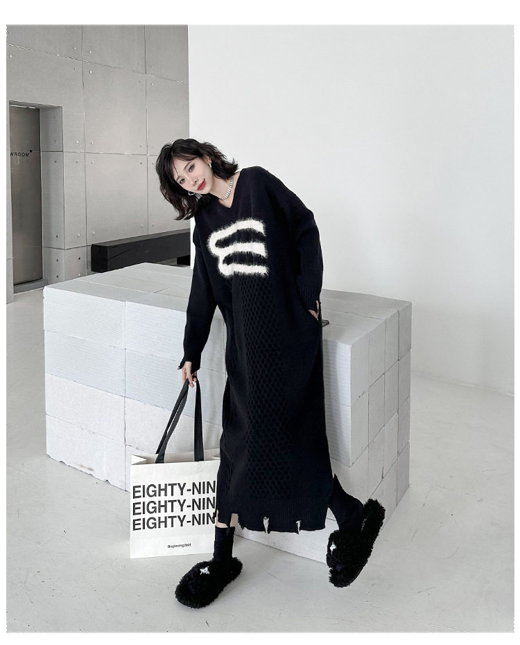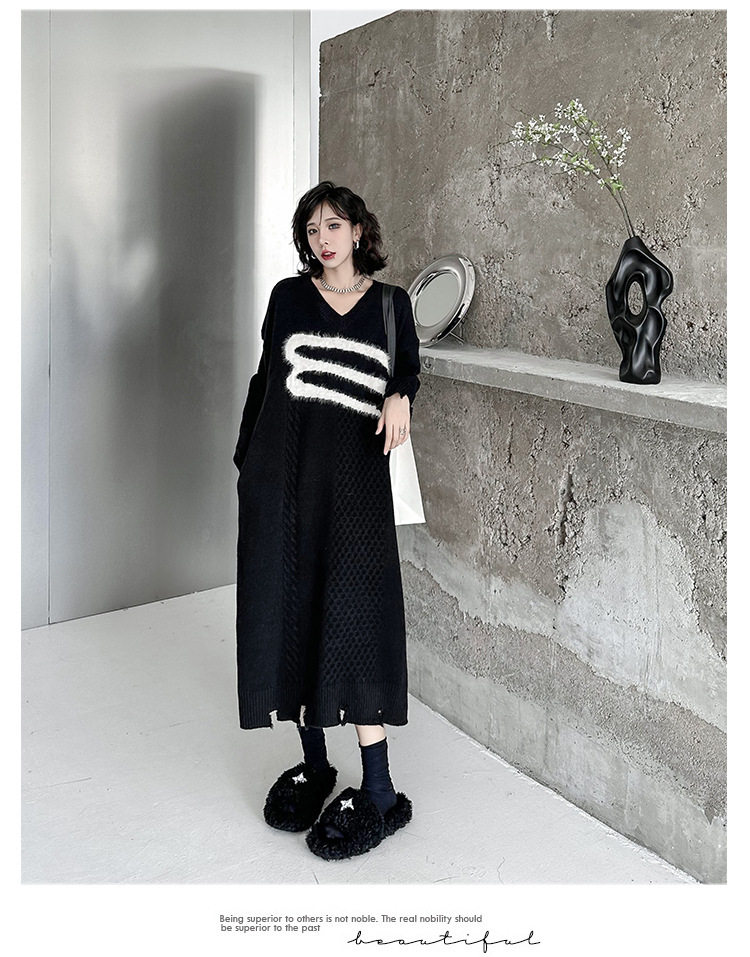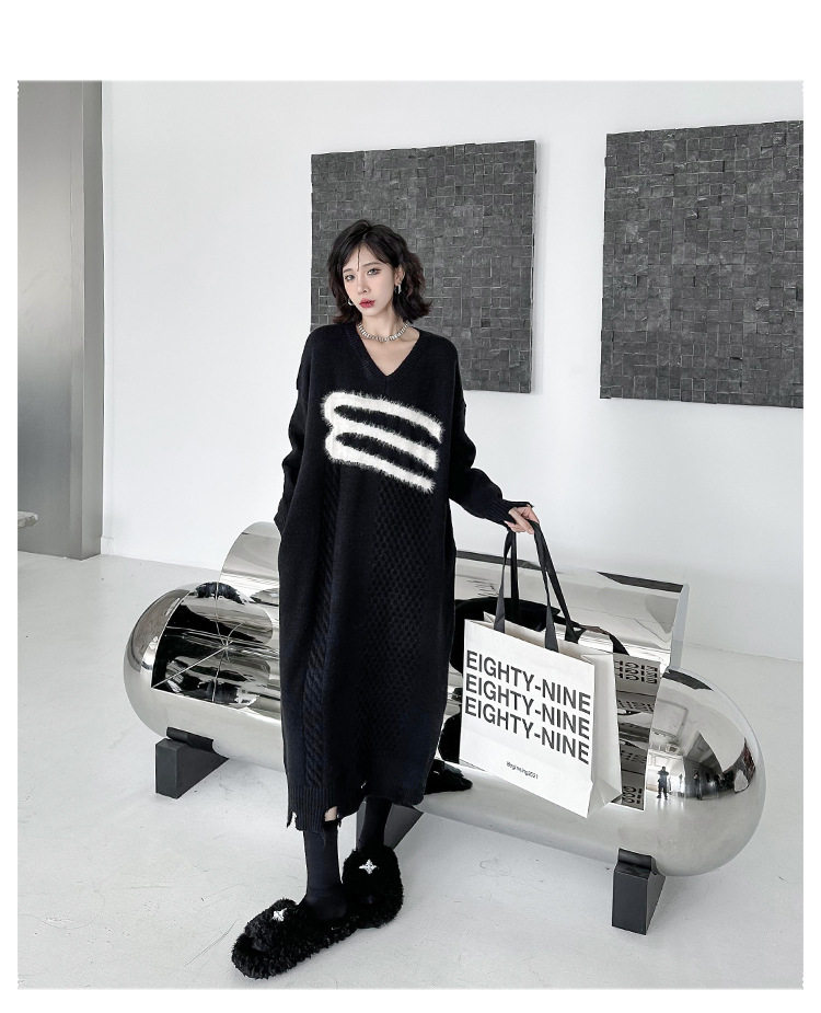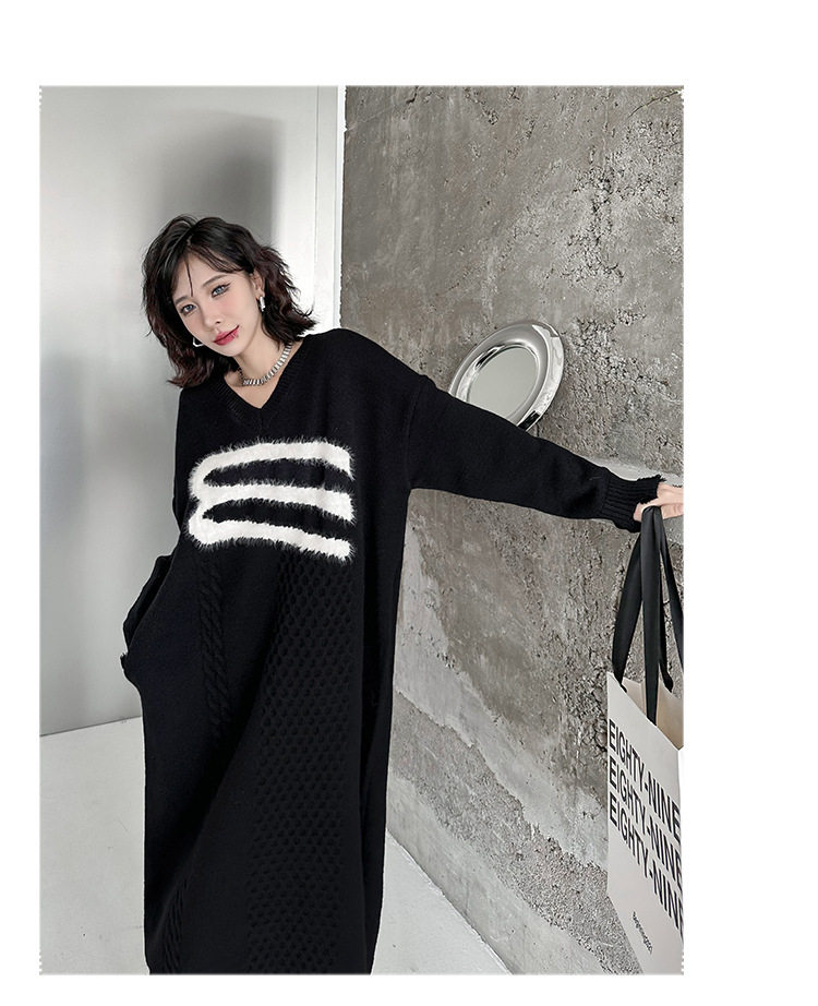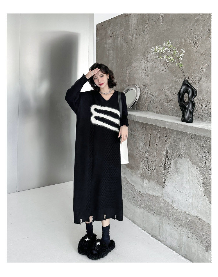 【ワンピース】Vネック ジャカードニットワンピース 秋冬 厚手 ルーズ トレンド 長袖 ロングワンピ【AHシリーズ】