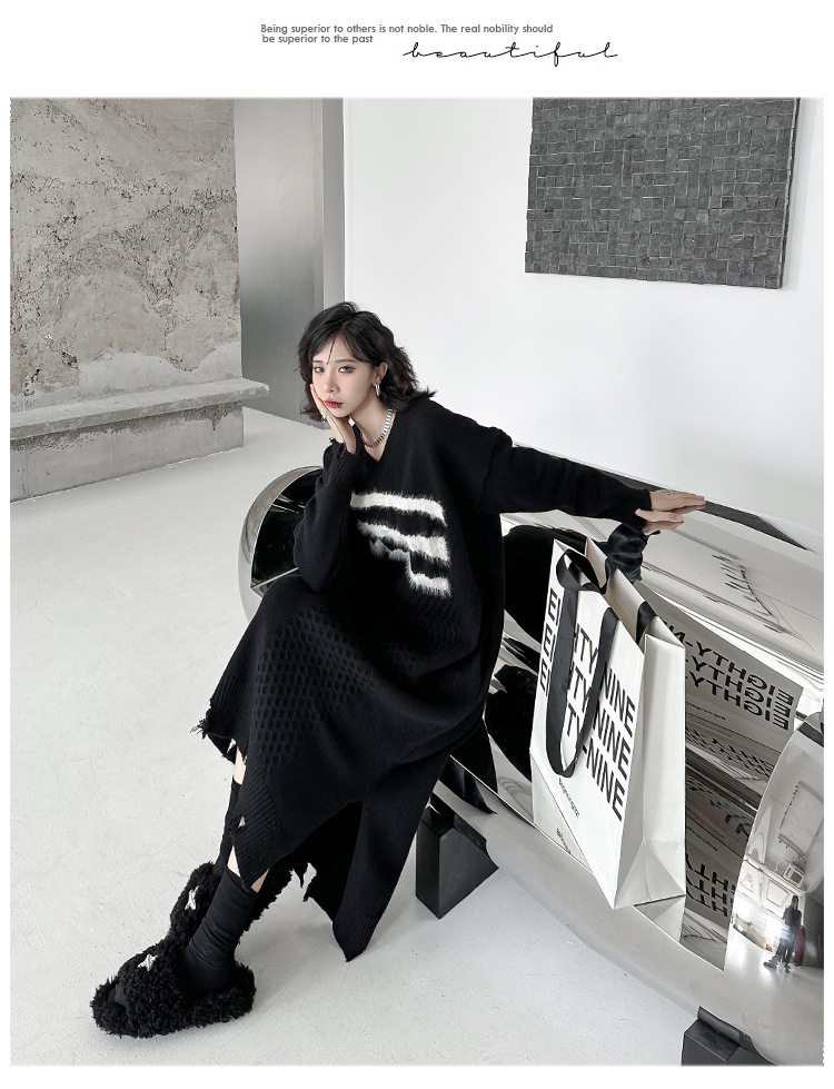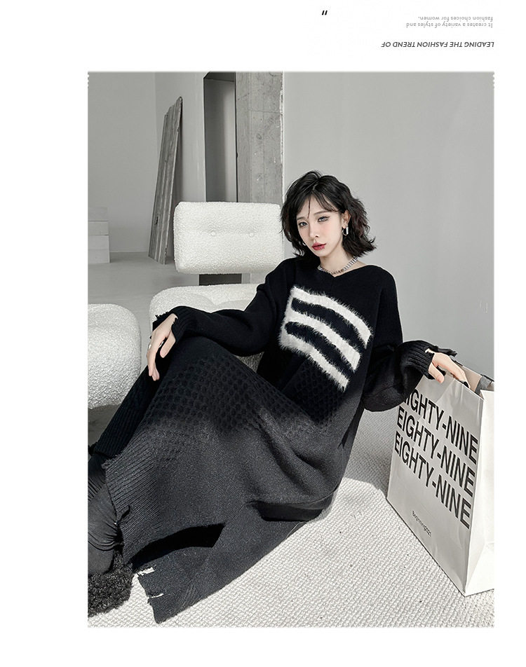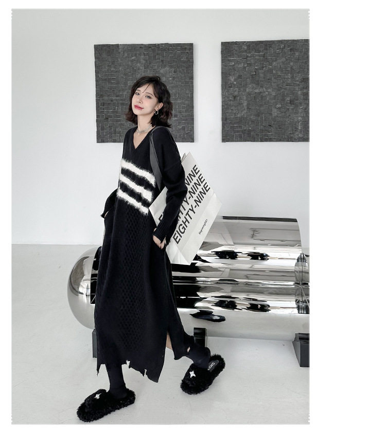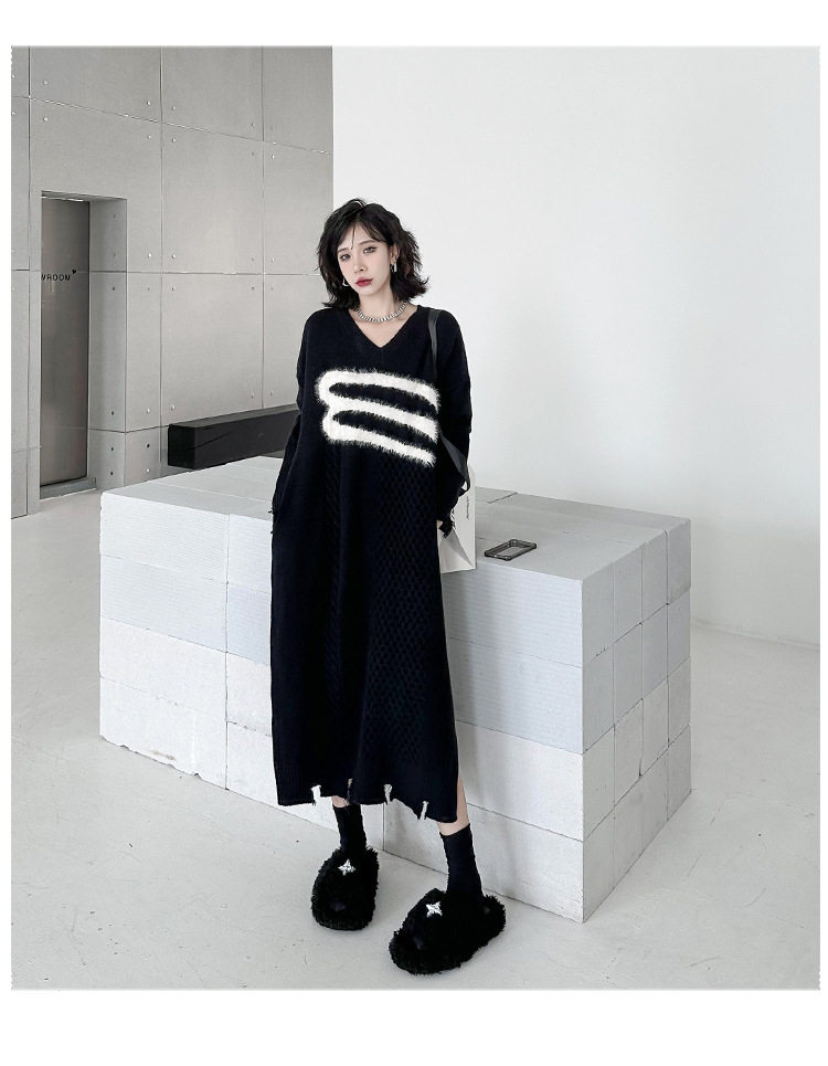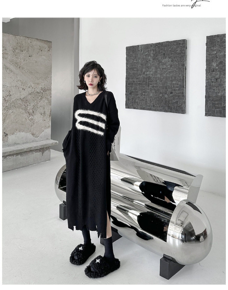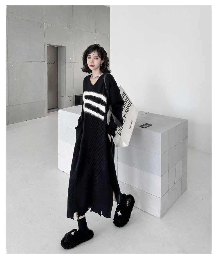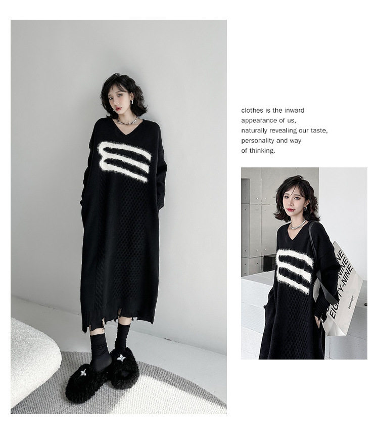 【ワンピース】Vネック ジャカードニットワンピース 秋冬 厚手 ルーズ トレンド 長袖 ロングワンピ【AHシリーズ】