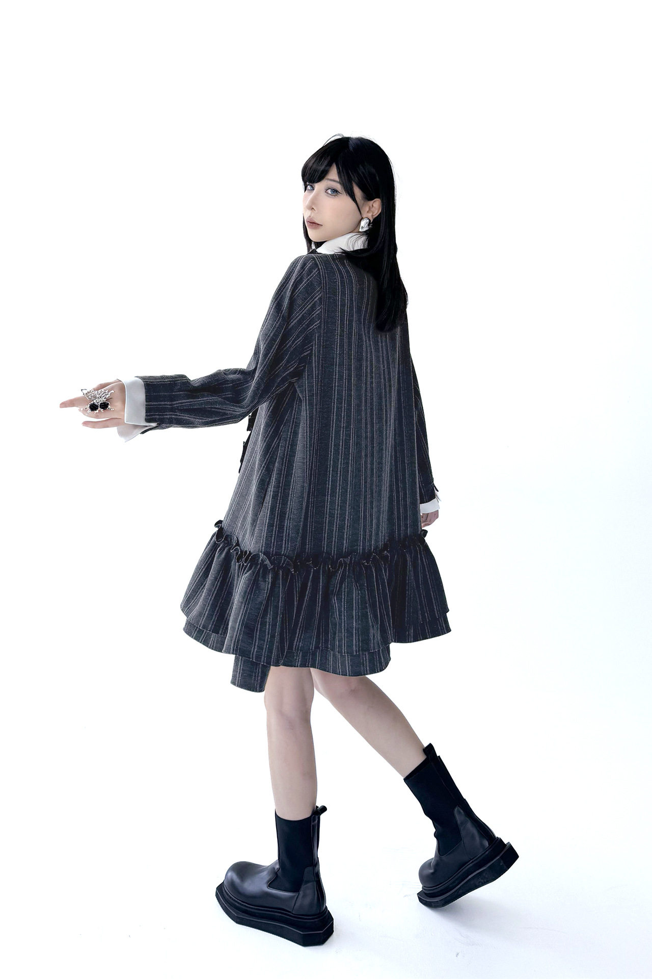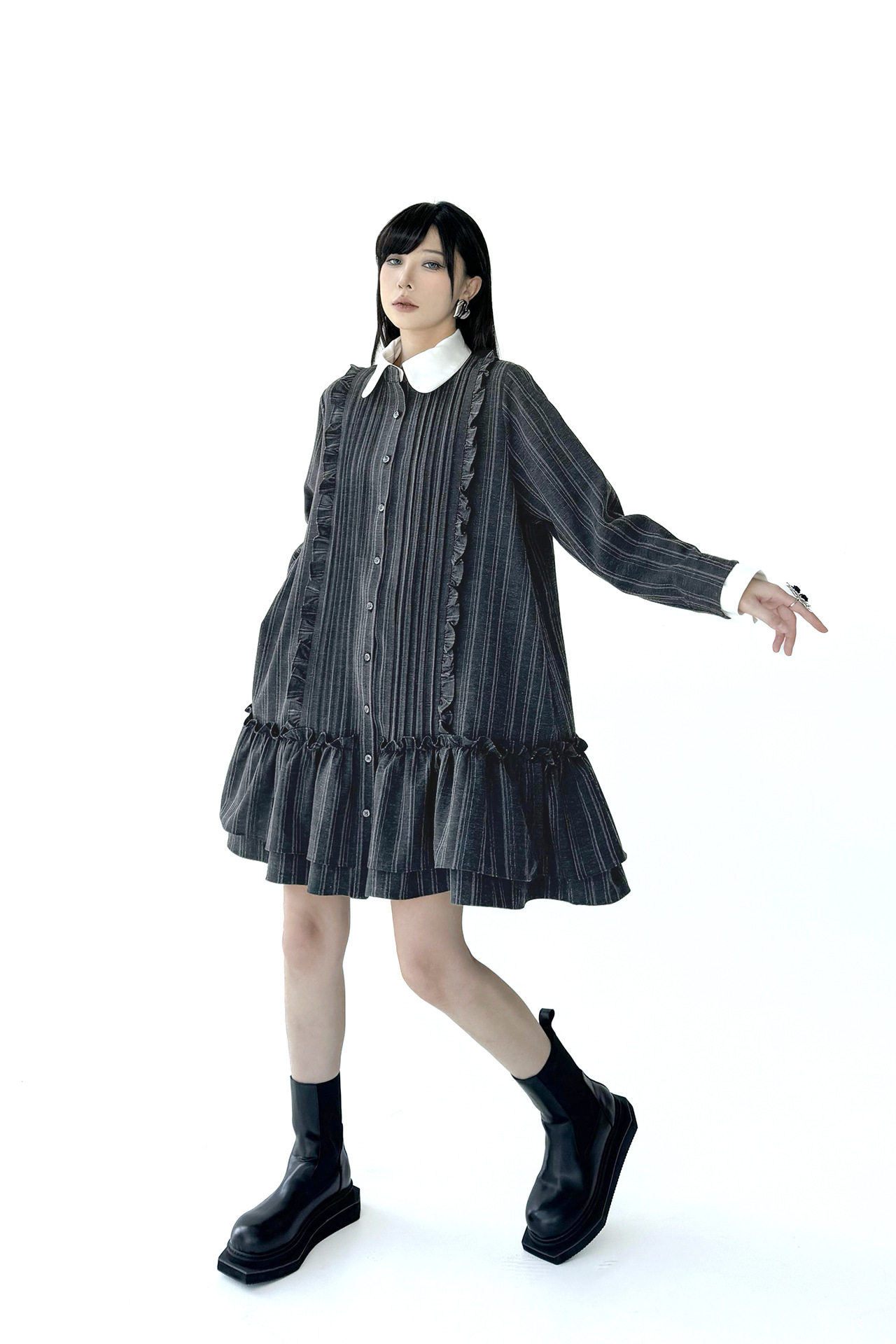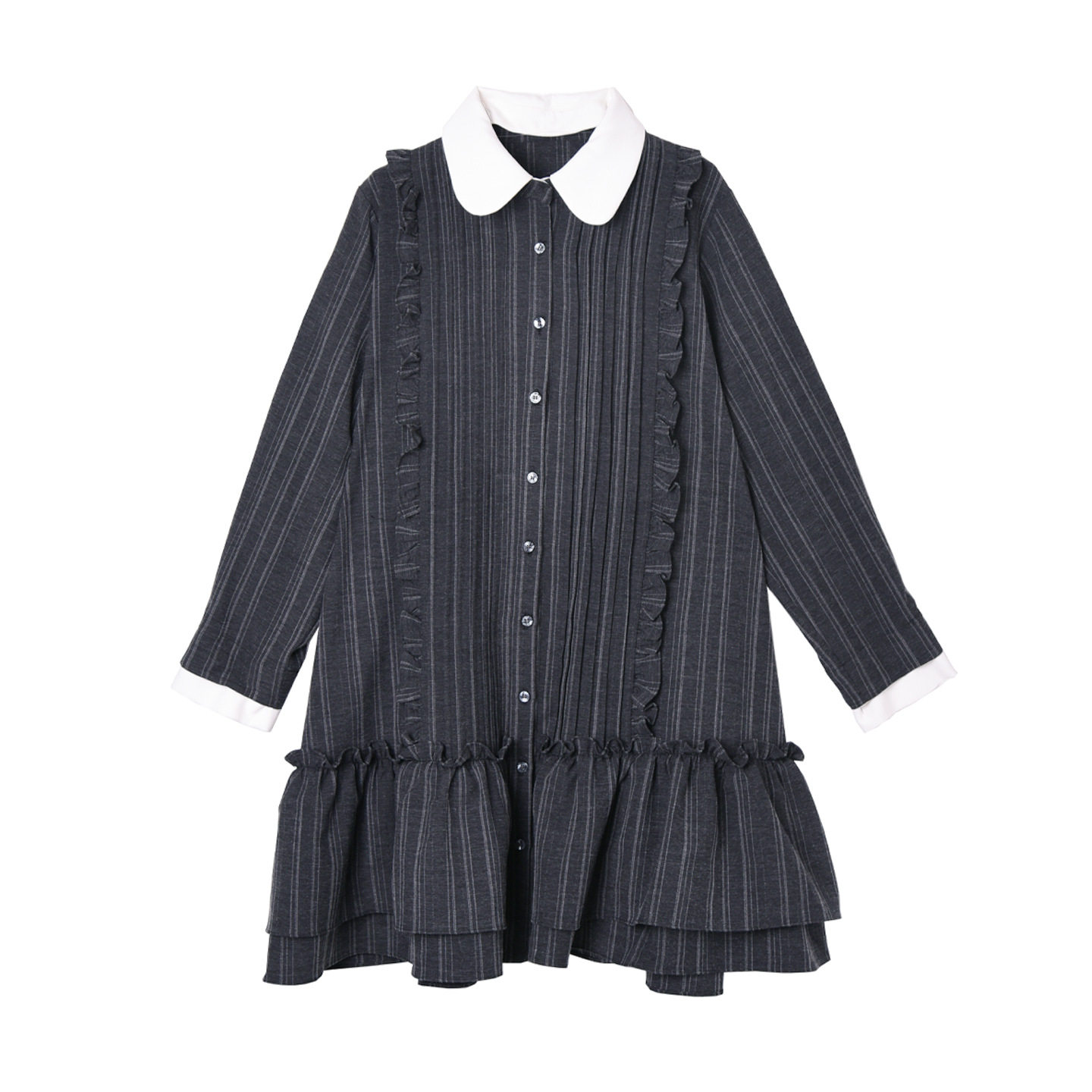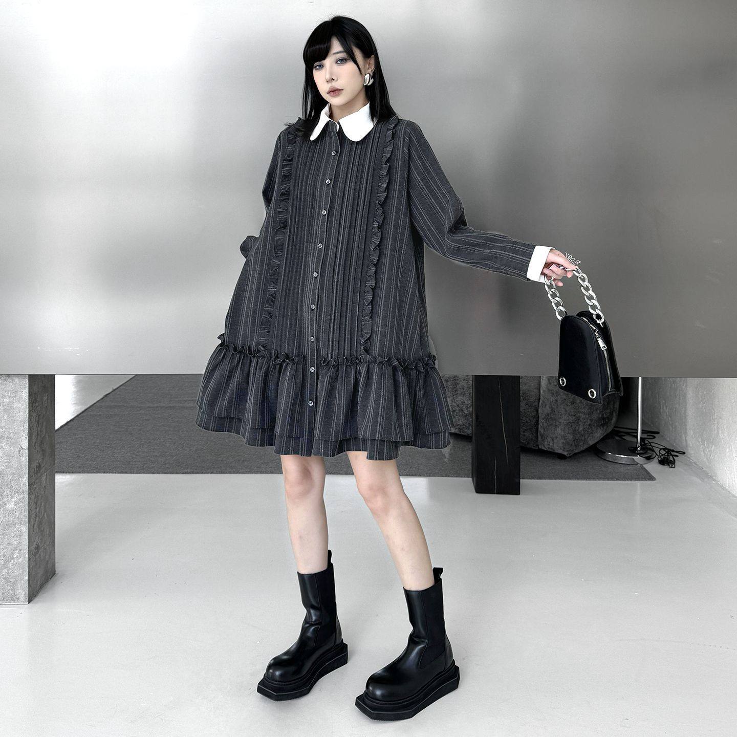 【ワンピース】ミニマル配色 グレーストライプ シャツワンピース 春 長袖 2WAYデザイン【AHシリーズ】