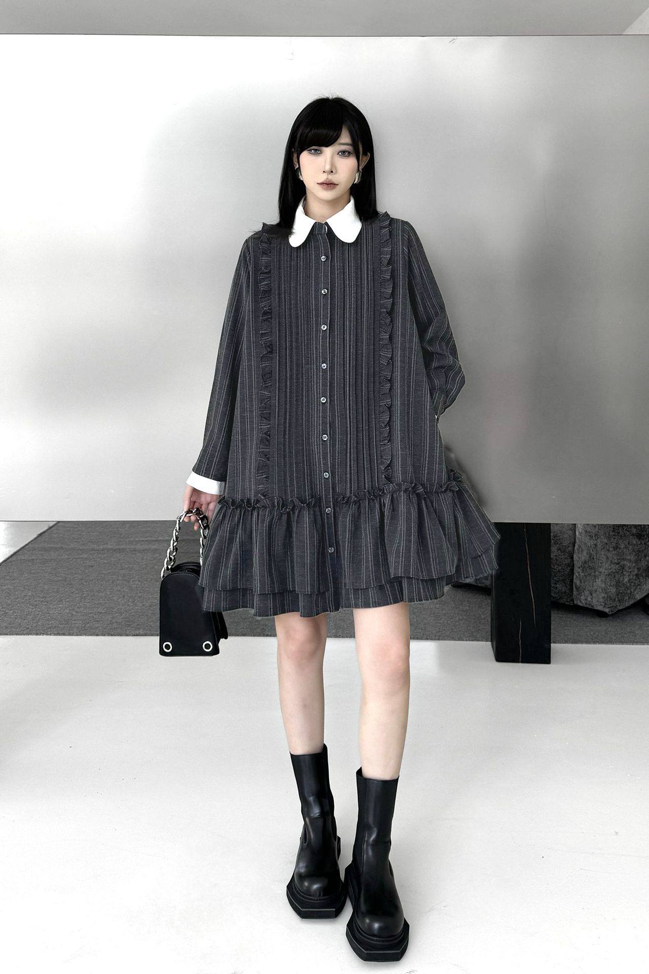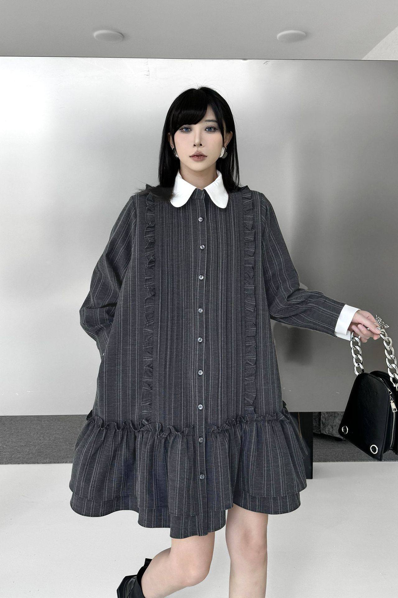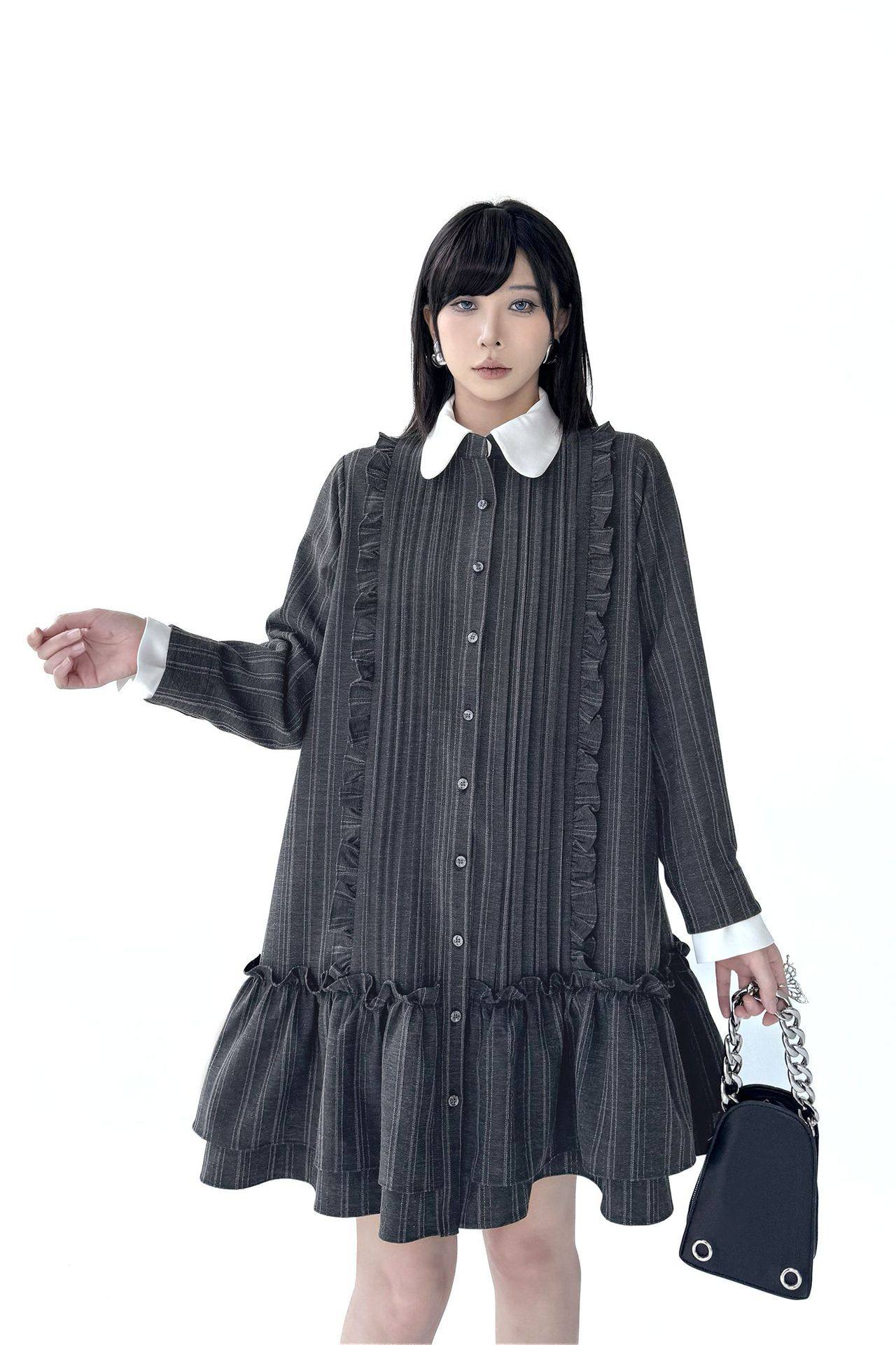 【商品名】【ワンピース】ミニマル配色 グレーストライプ シャツワンピース 春 長袖 2WAYデザイン【AHシリーズ】