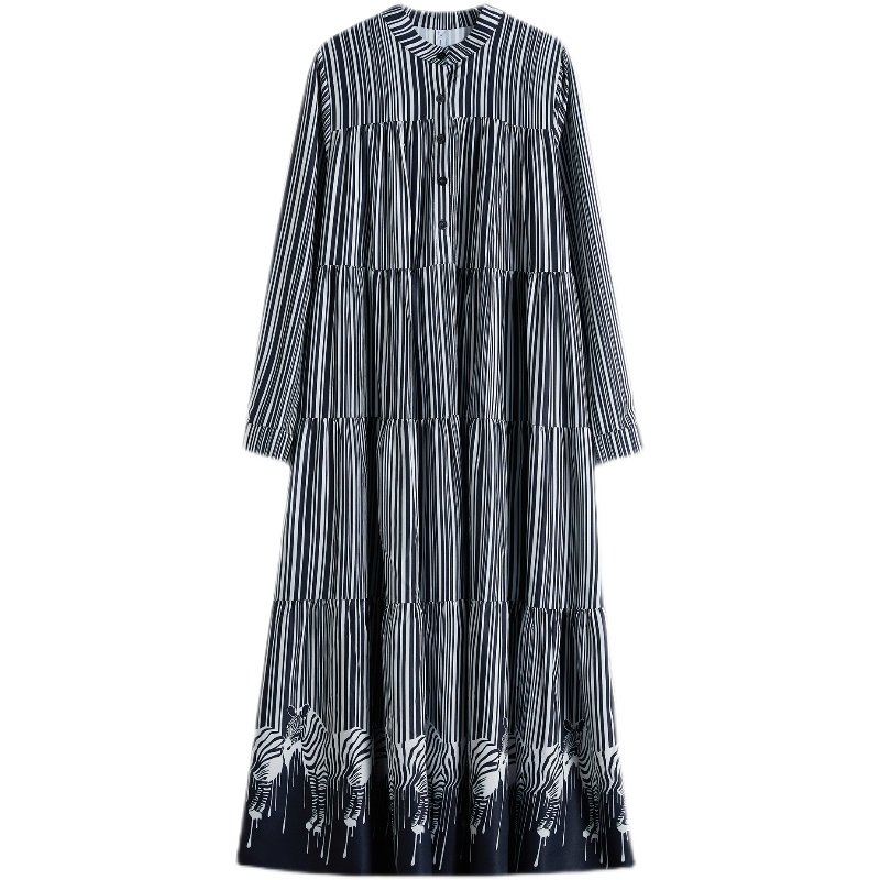 【商品名】【ワンピース】レディースワンピース ストライプ切替 フレンチフレア ロング 長袖ワンピース【AHシリーズ】