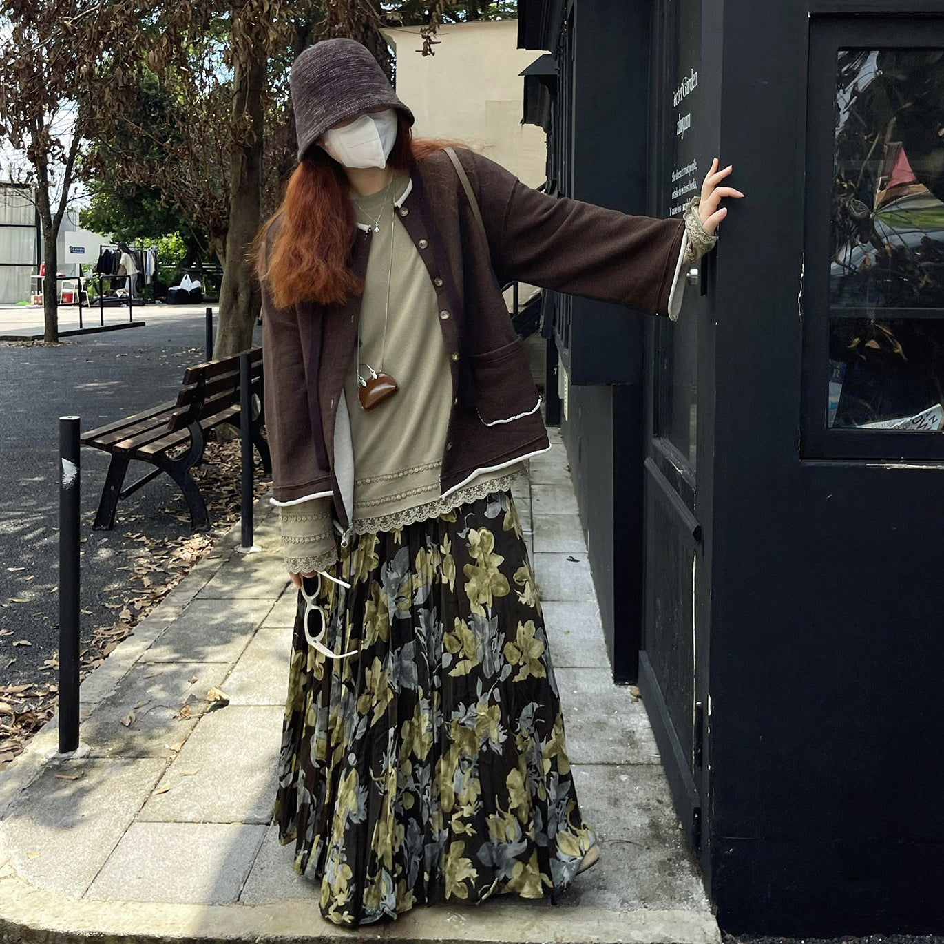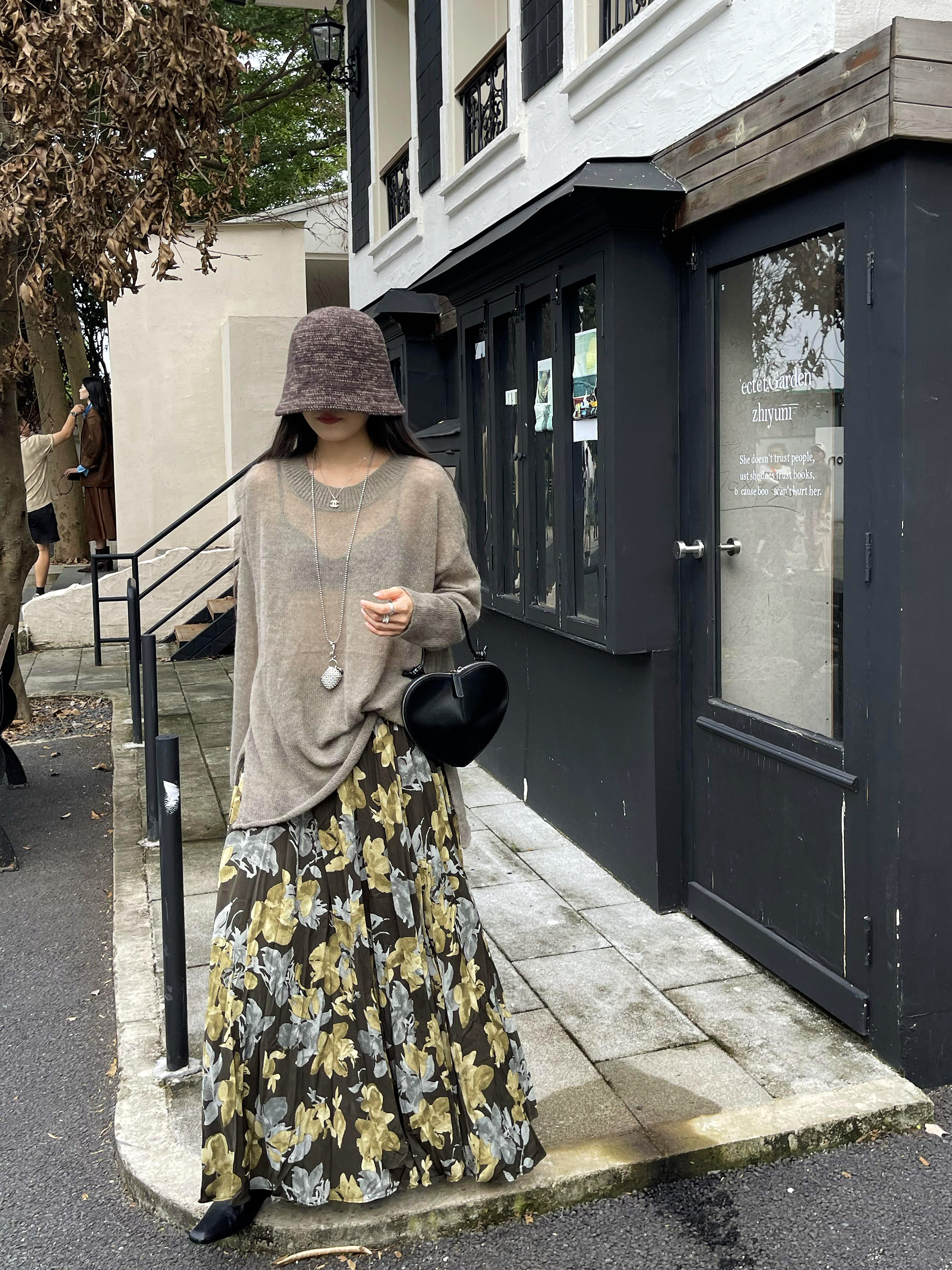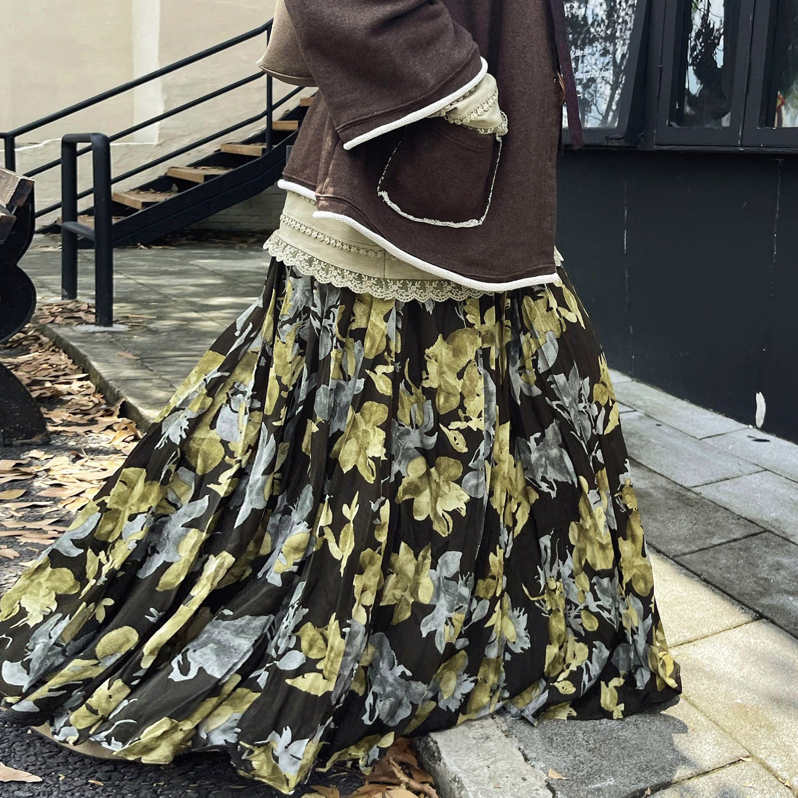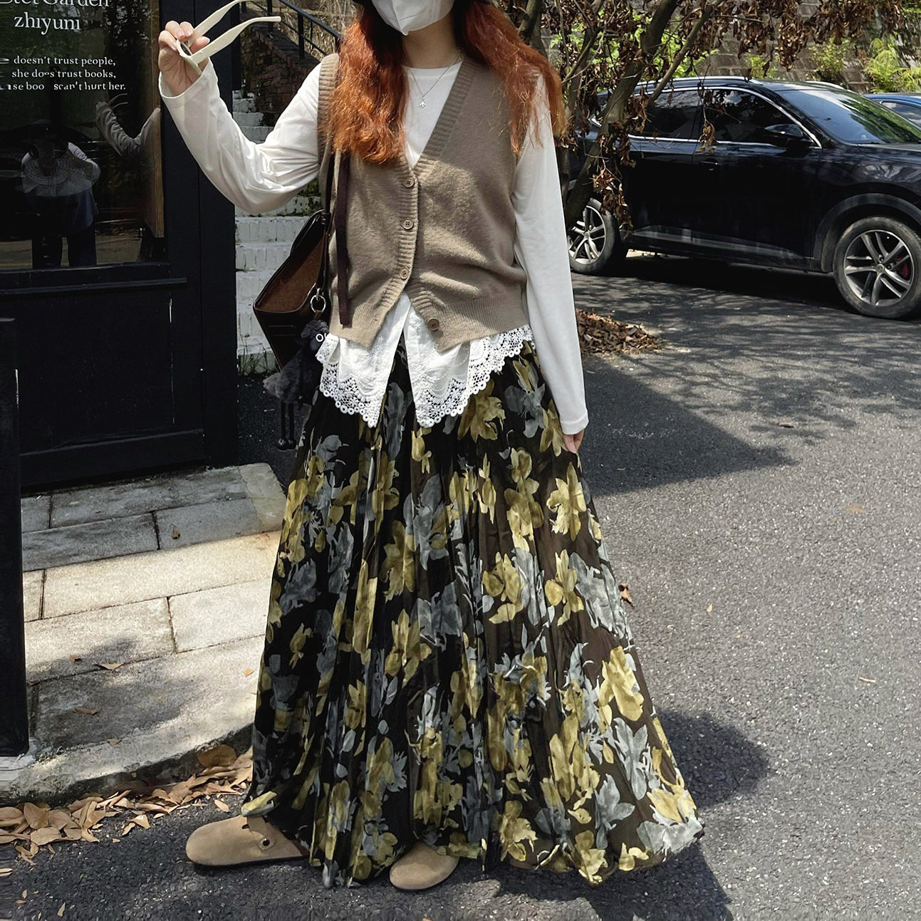 【ボトムス】ブラック花柄 ロングスカート 秋冬 ハイウエスト 体型カバー 小众デザイン【SHシリーズ】