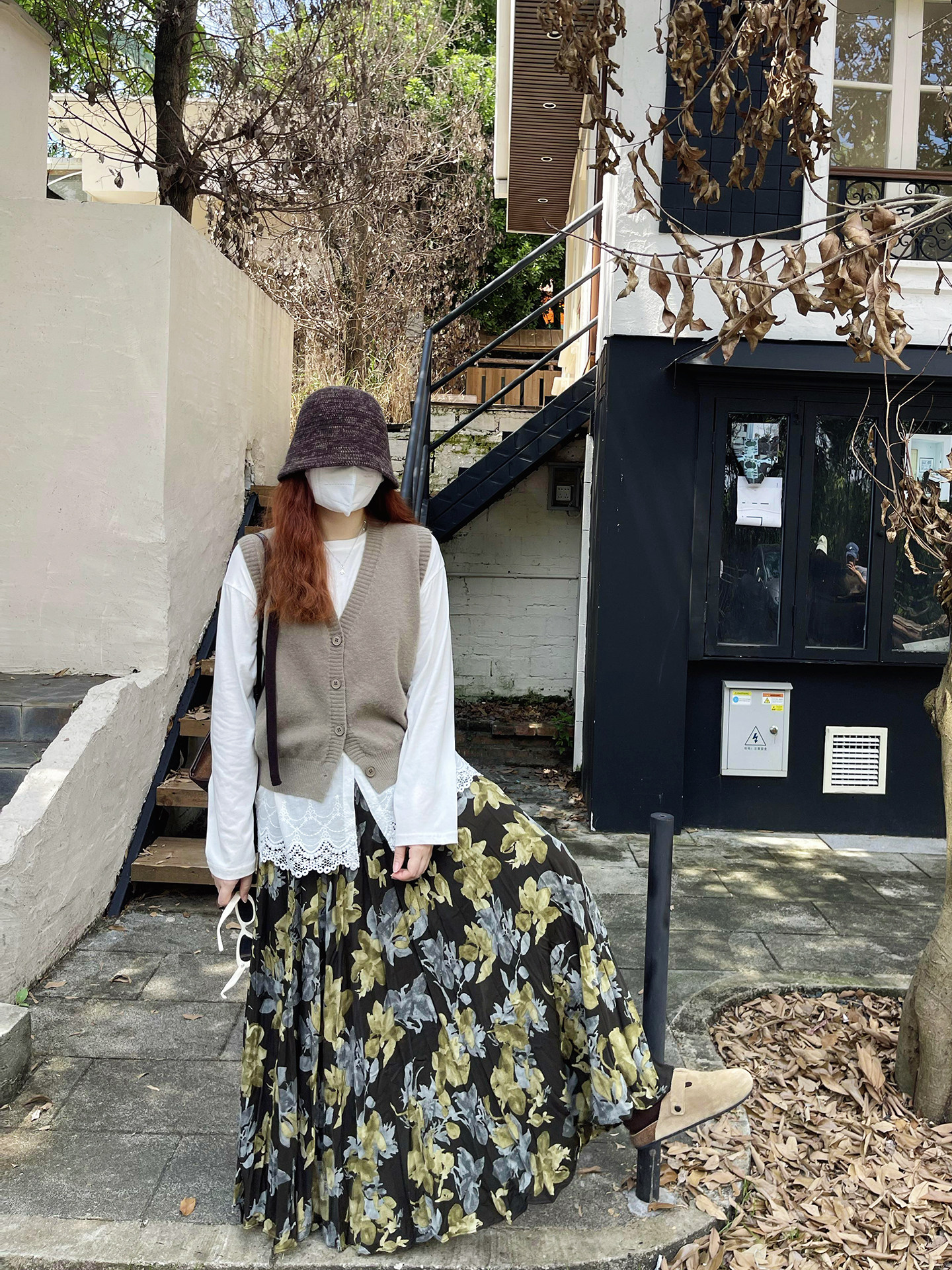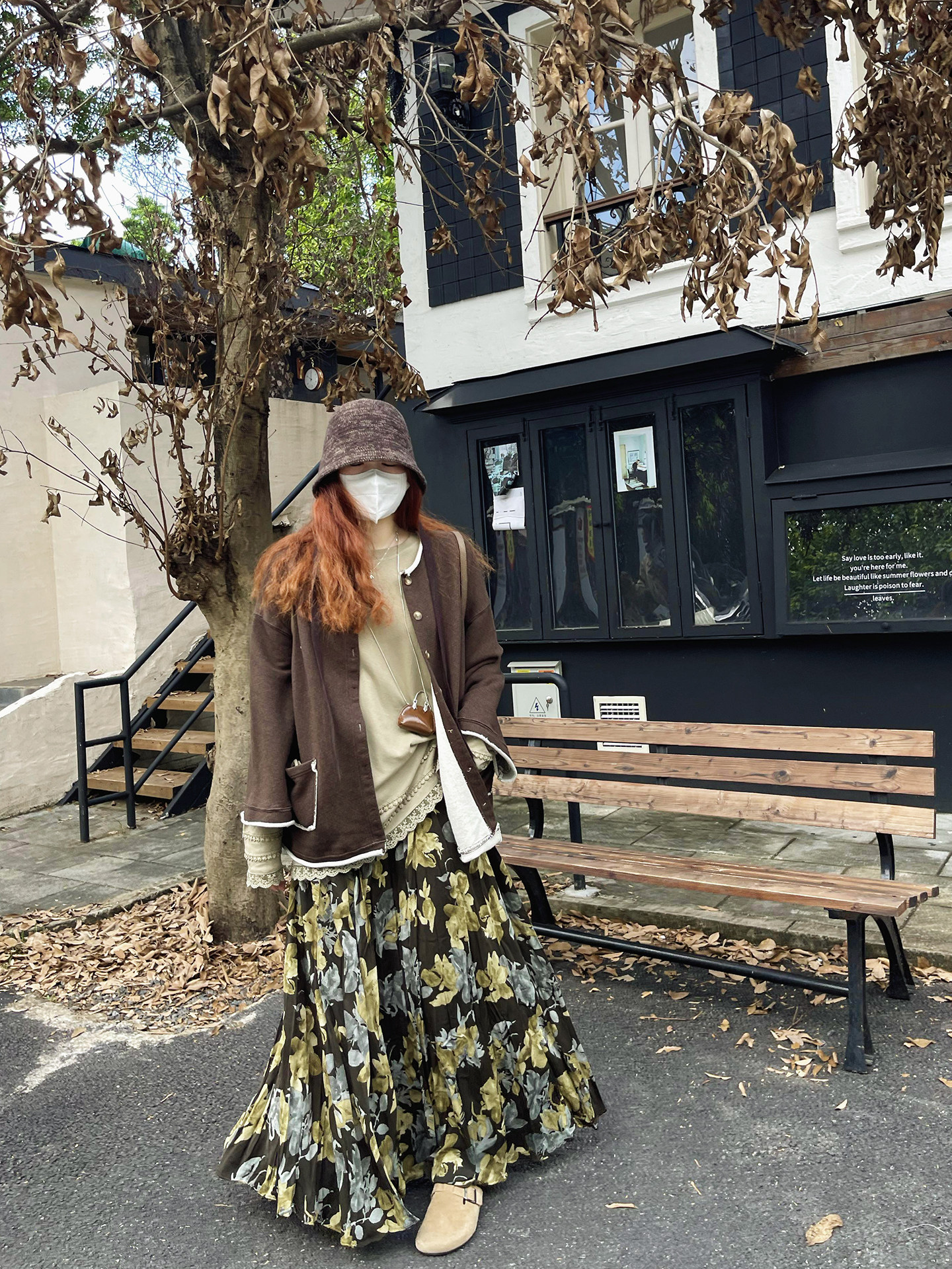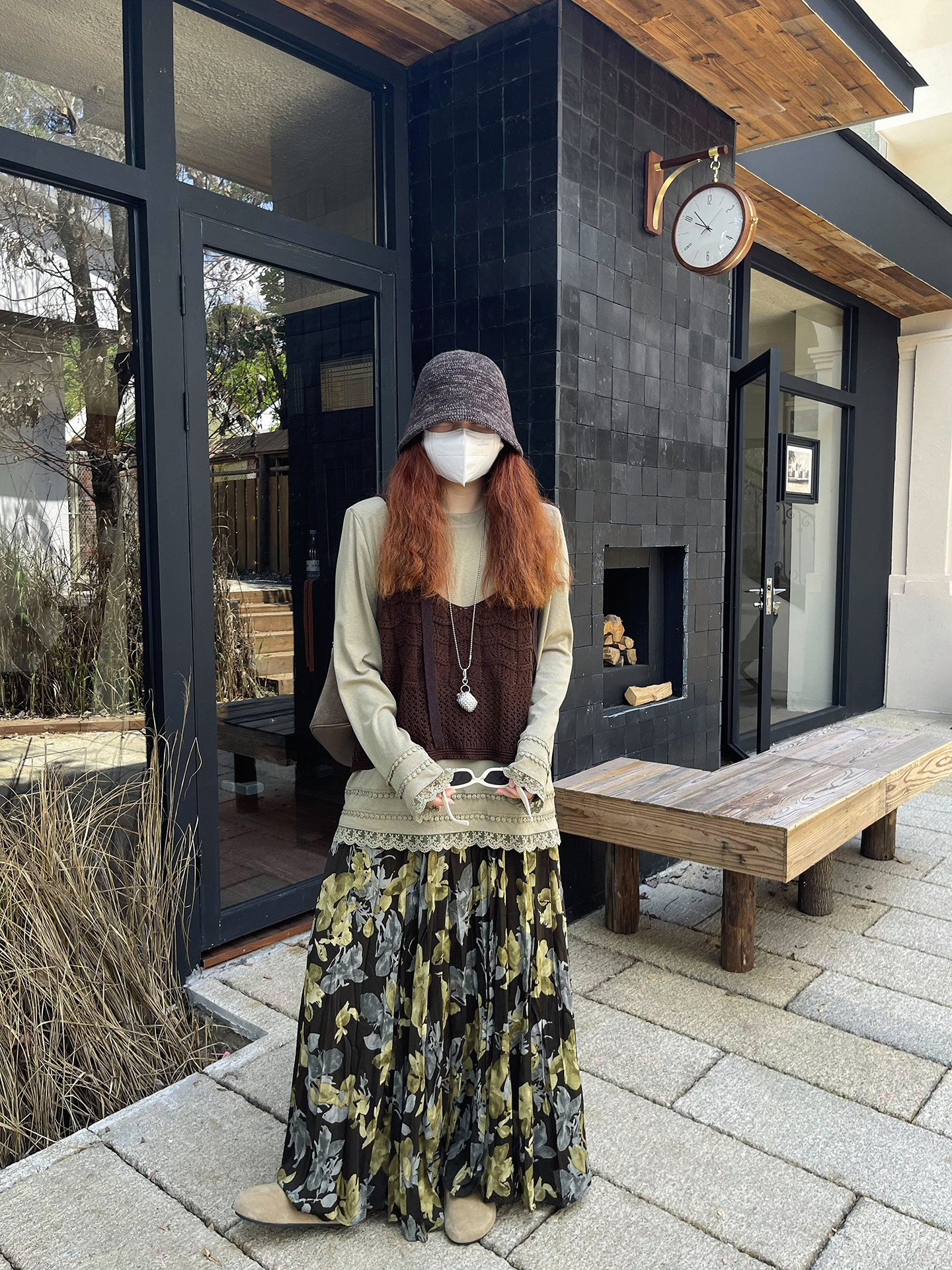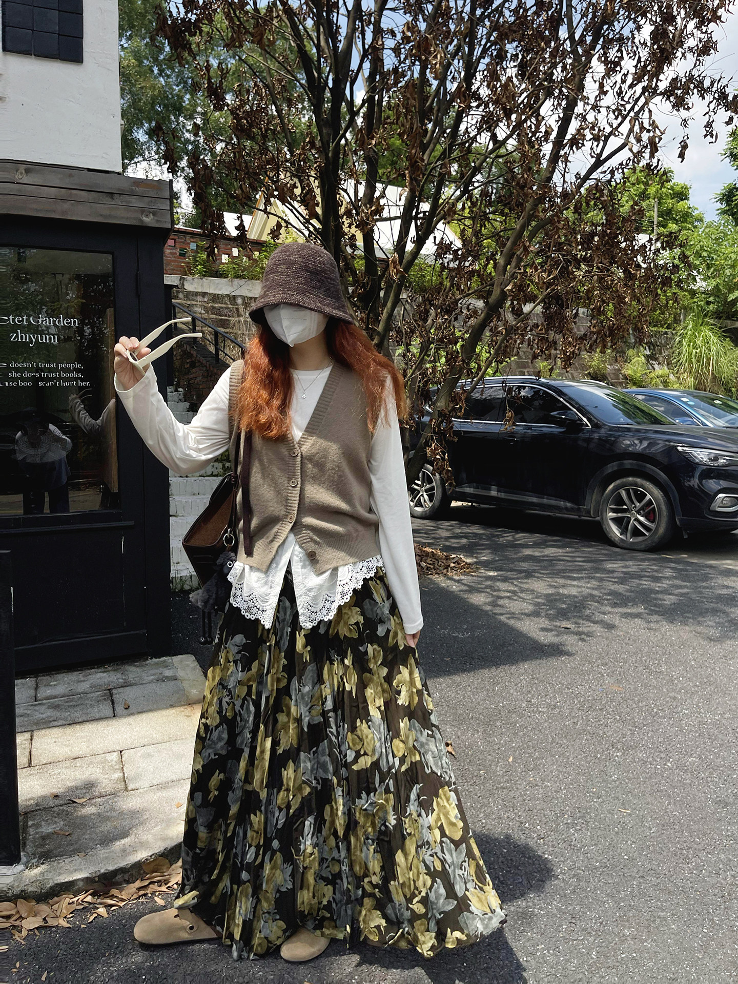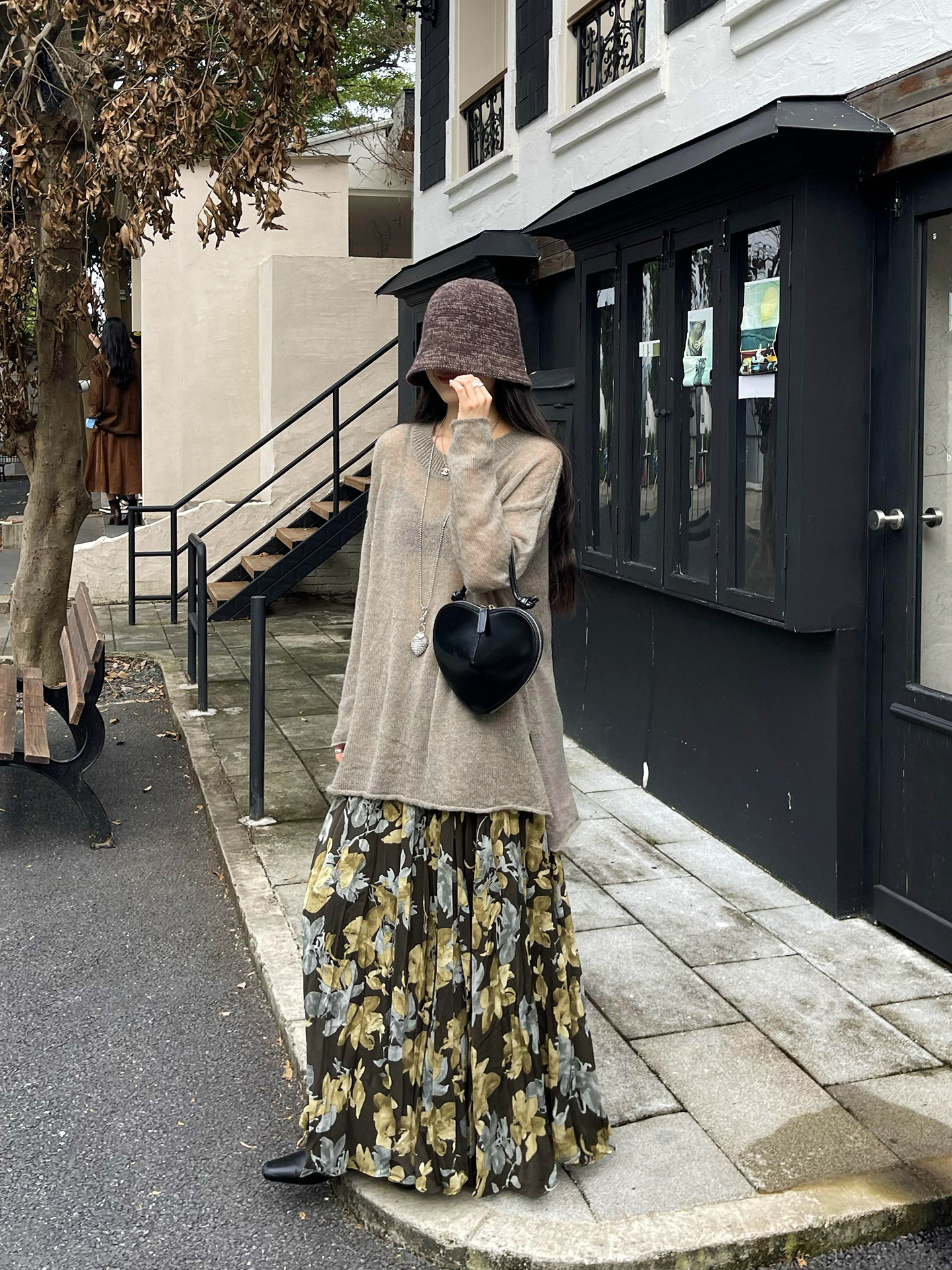 【ボトムス】ブラック花柄 ロングスカート 秋冬 ハイウエスト 体型カバー 小众デザイン【SHシリーズ】