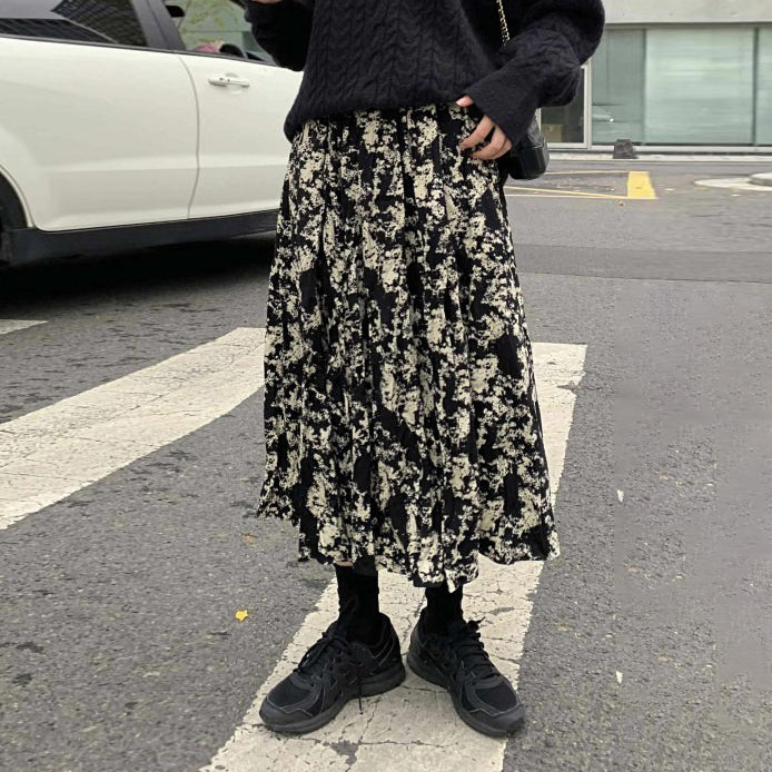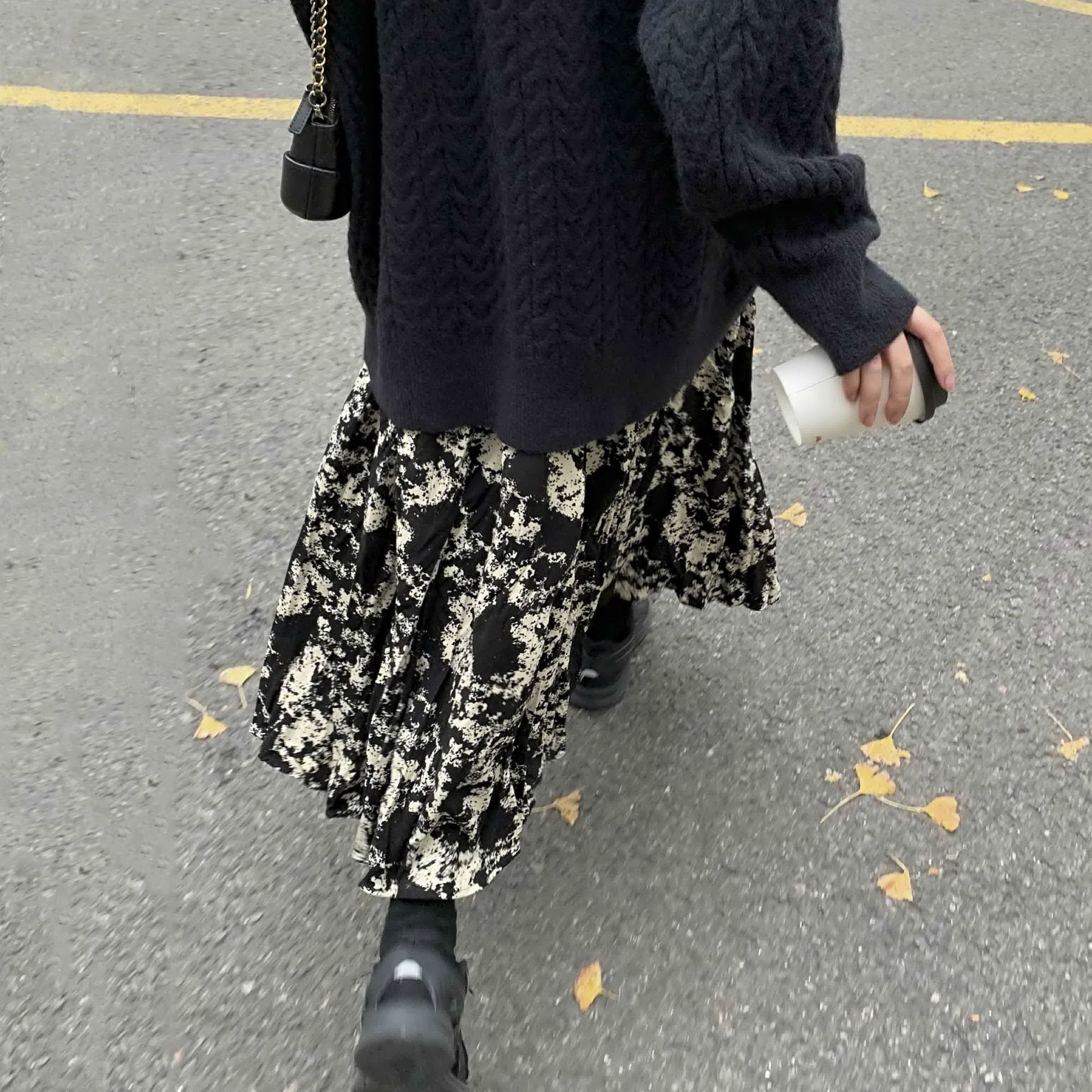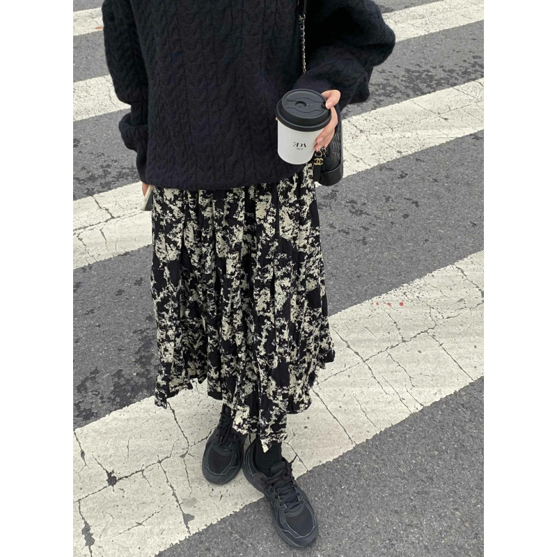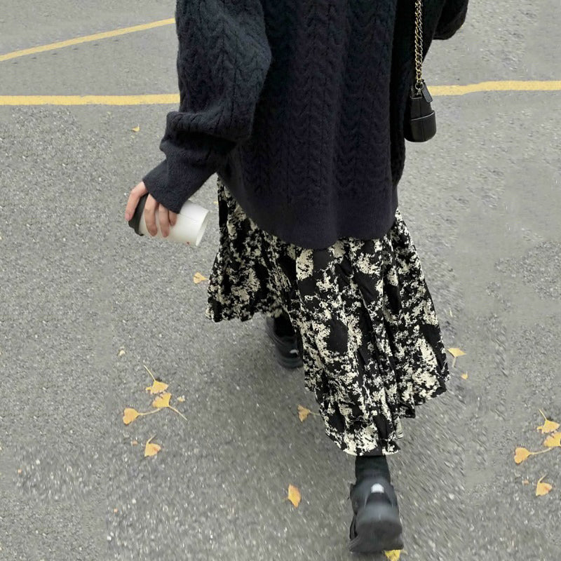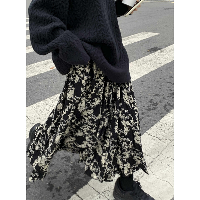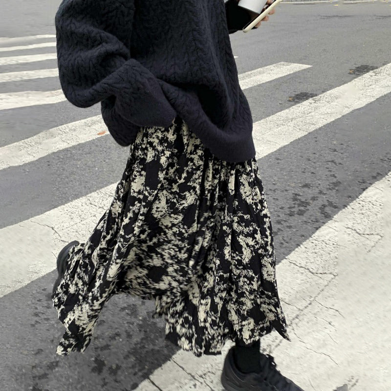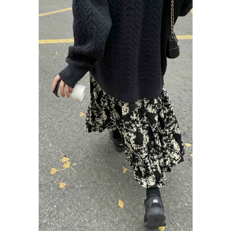 【ボトムス】ブラック花柄 ロングスカート 秋冬 ハイウエスト 体型カバー 小众デザイン【SHシリーズ】
