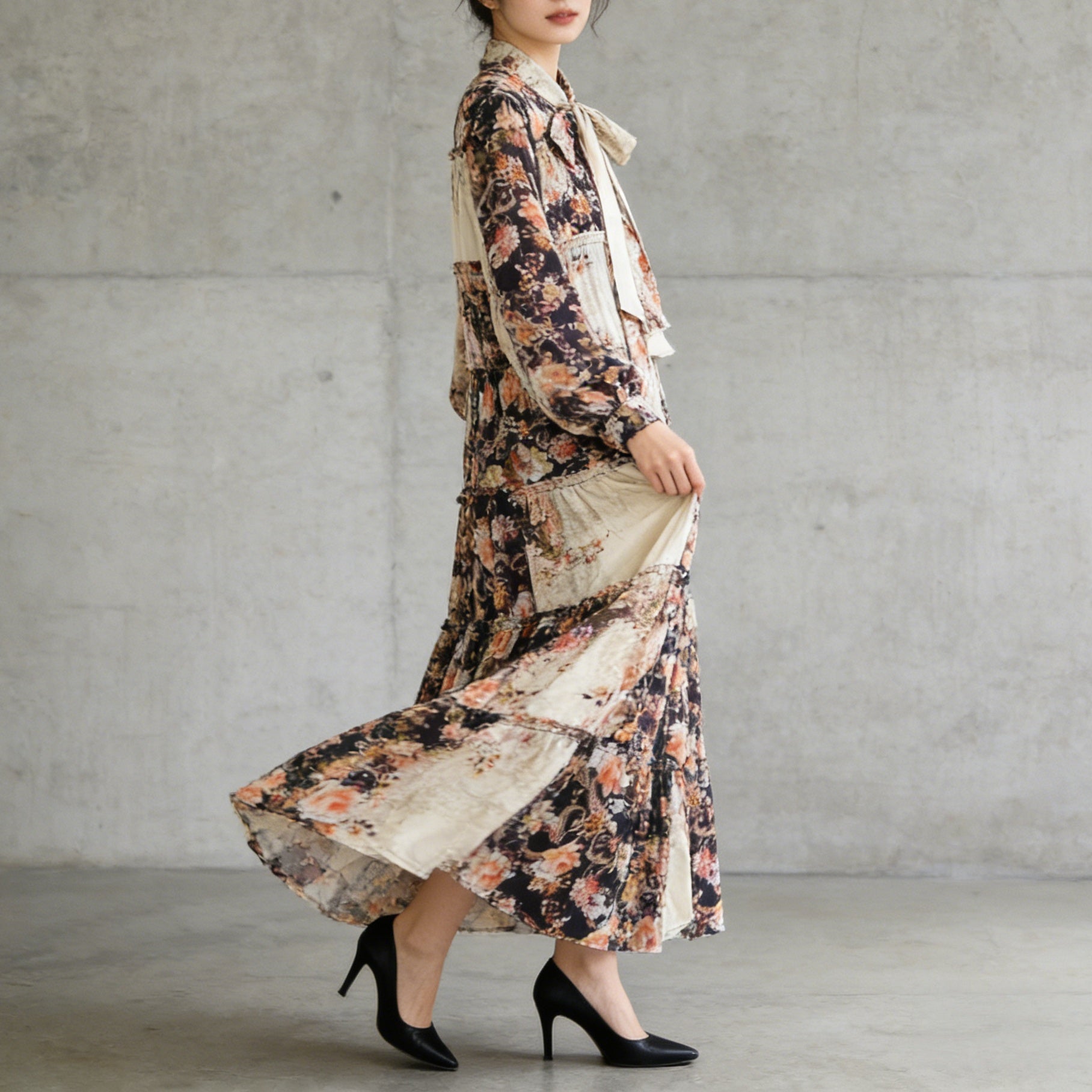 【ボトムス】ブラック花柄 ロングスカート 秋冬 ハイウエスト 体型カバー 小众デザイン【SHシリーズ】