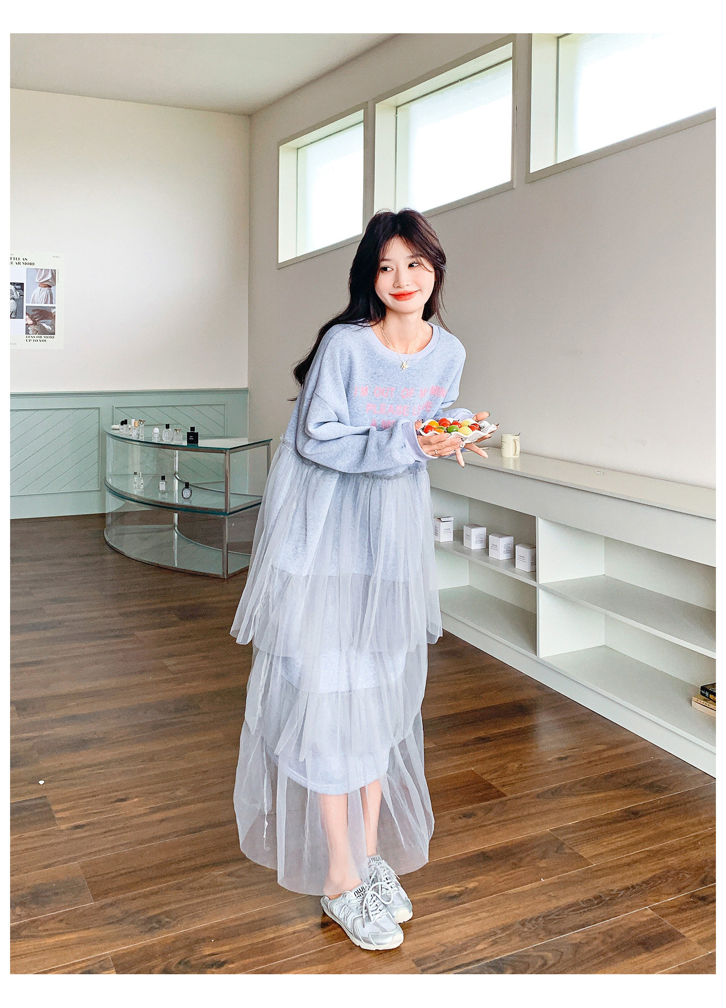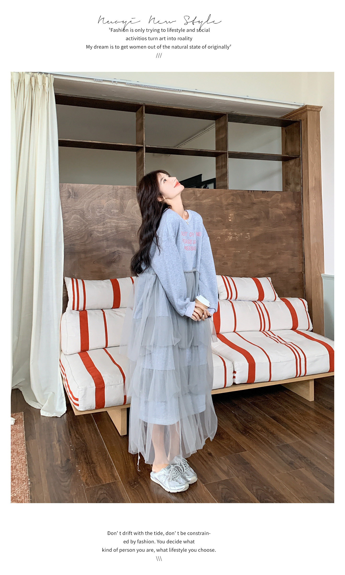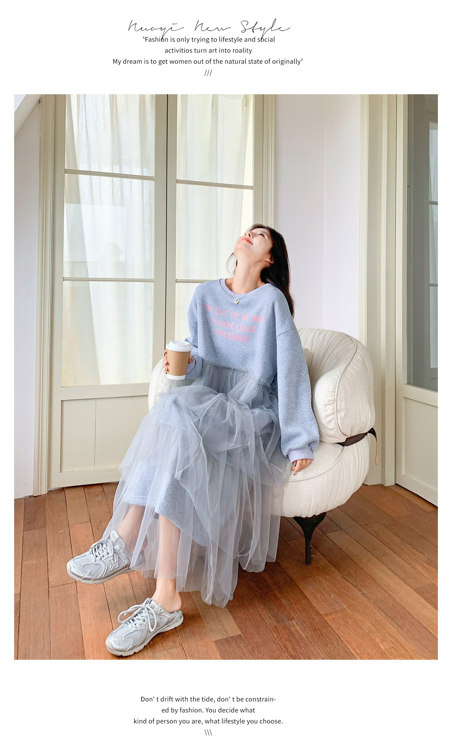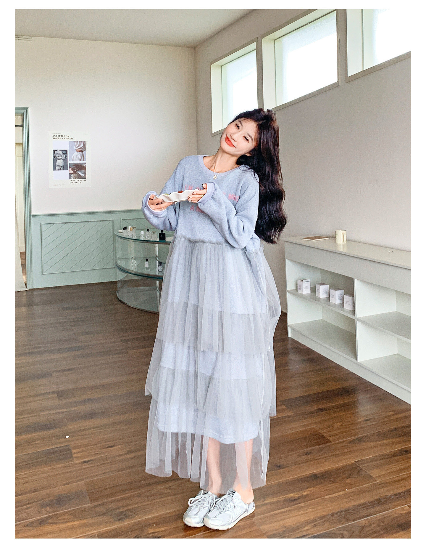 【商品名】【ワンピース】カジュアル スリム見え チュール ミックス アルファベット 長袖ワンピース【JZシリーズ】