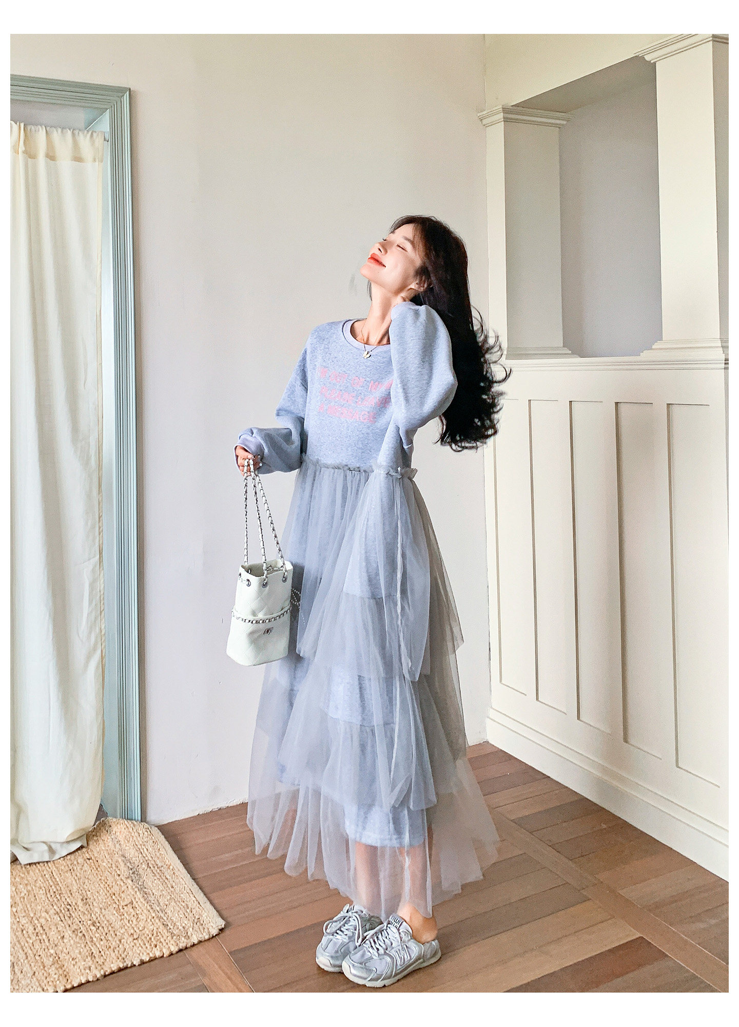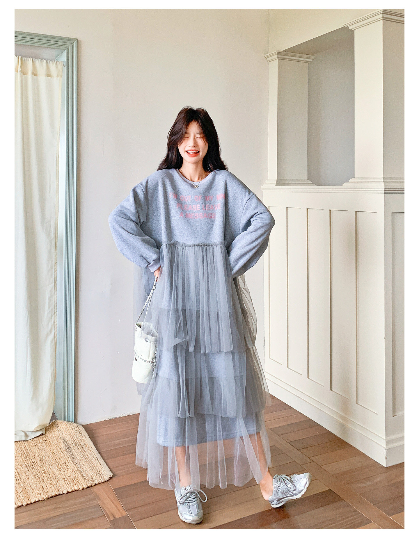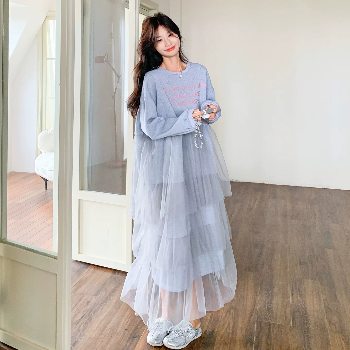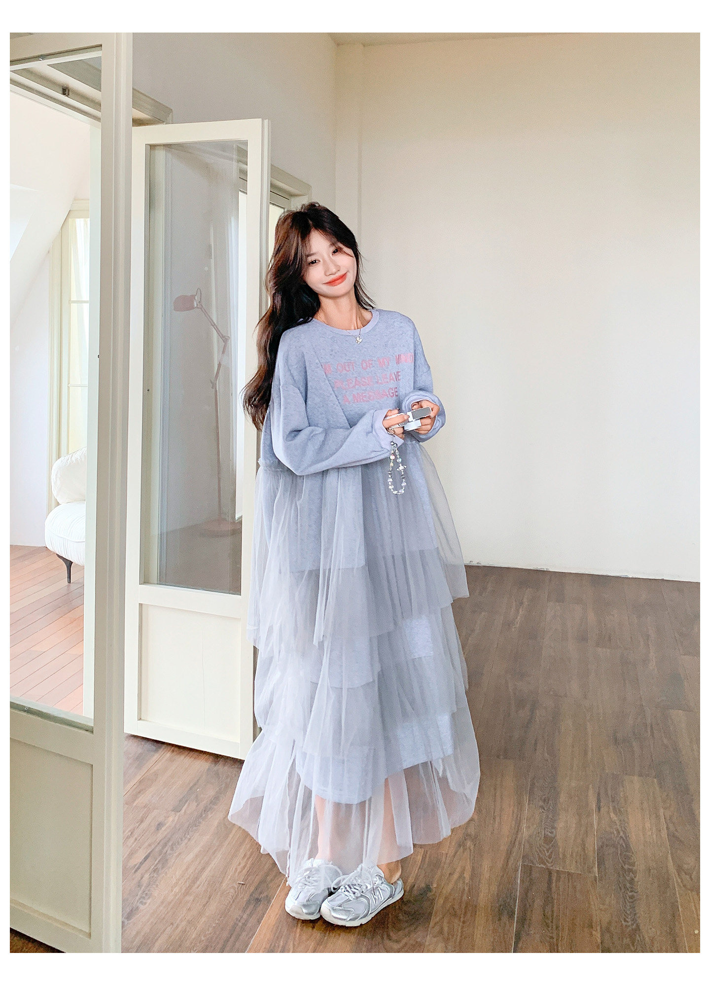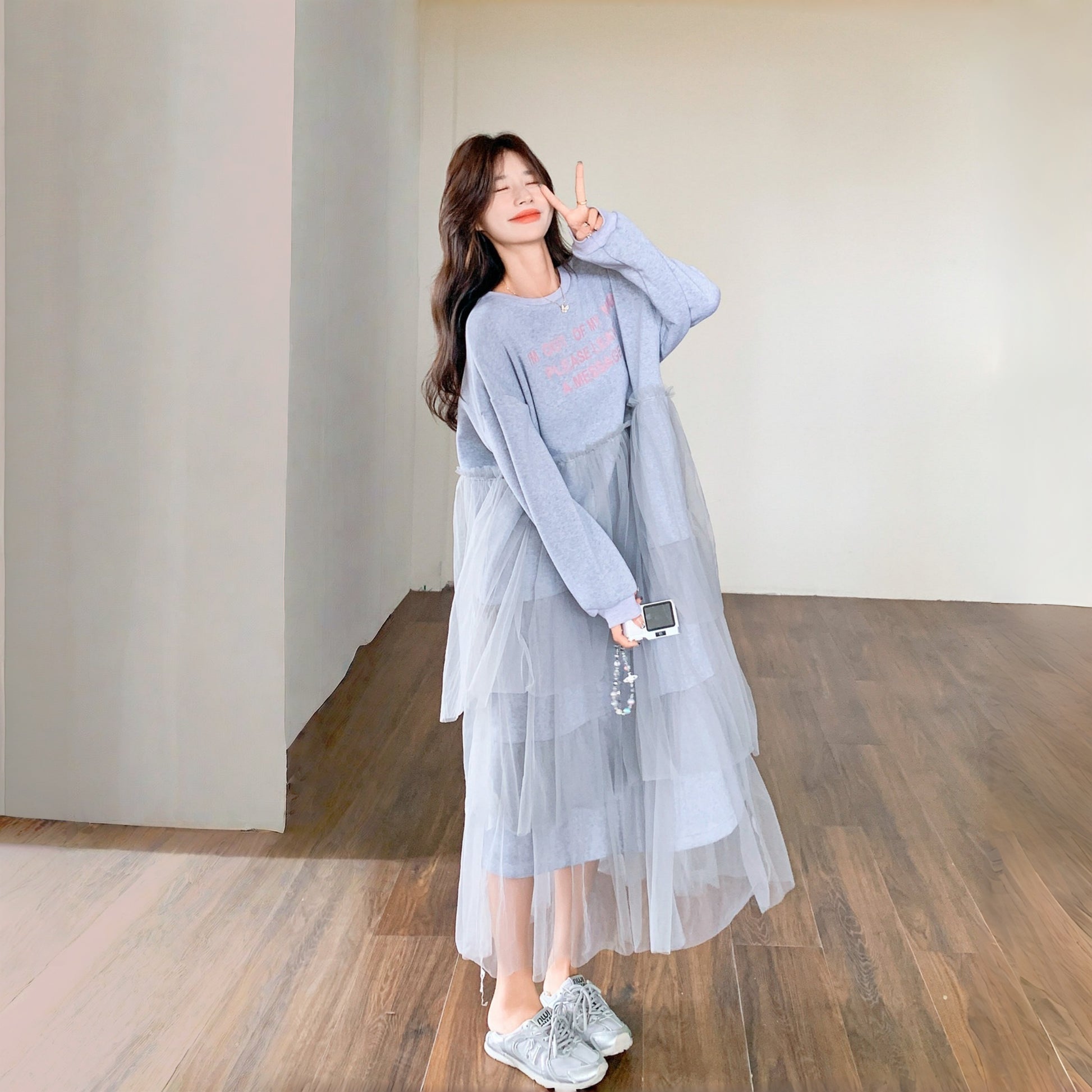 【ワンピース】カジュアル スリム見え チュール ミックス アルファベット 長袖ワンピース【JZシリーズ】