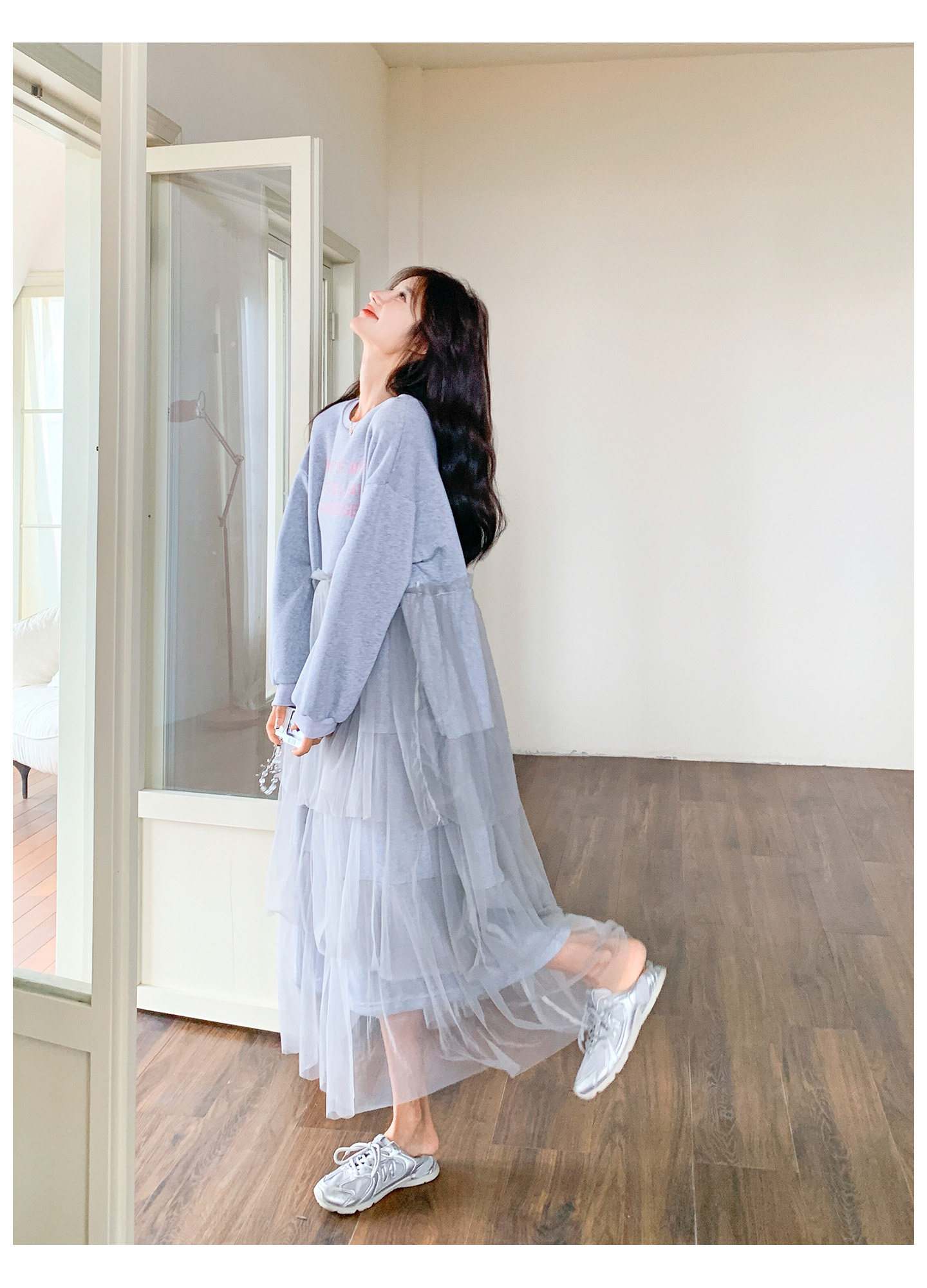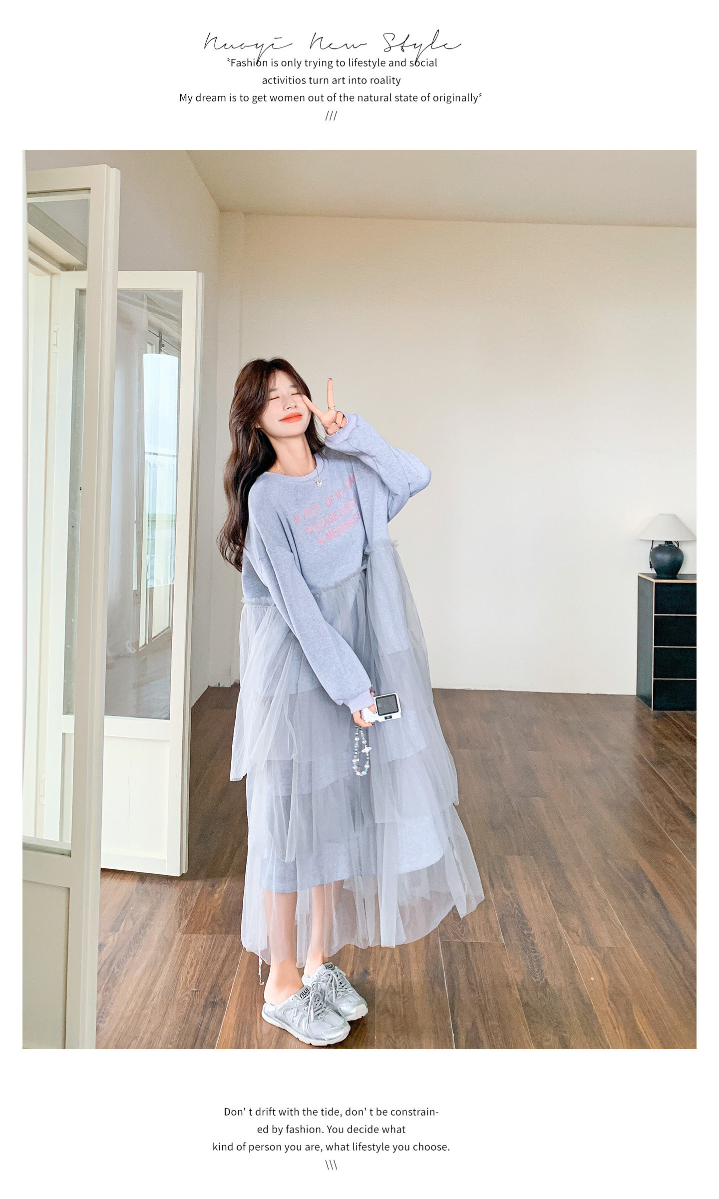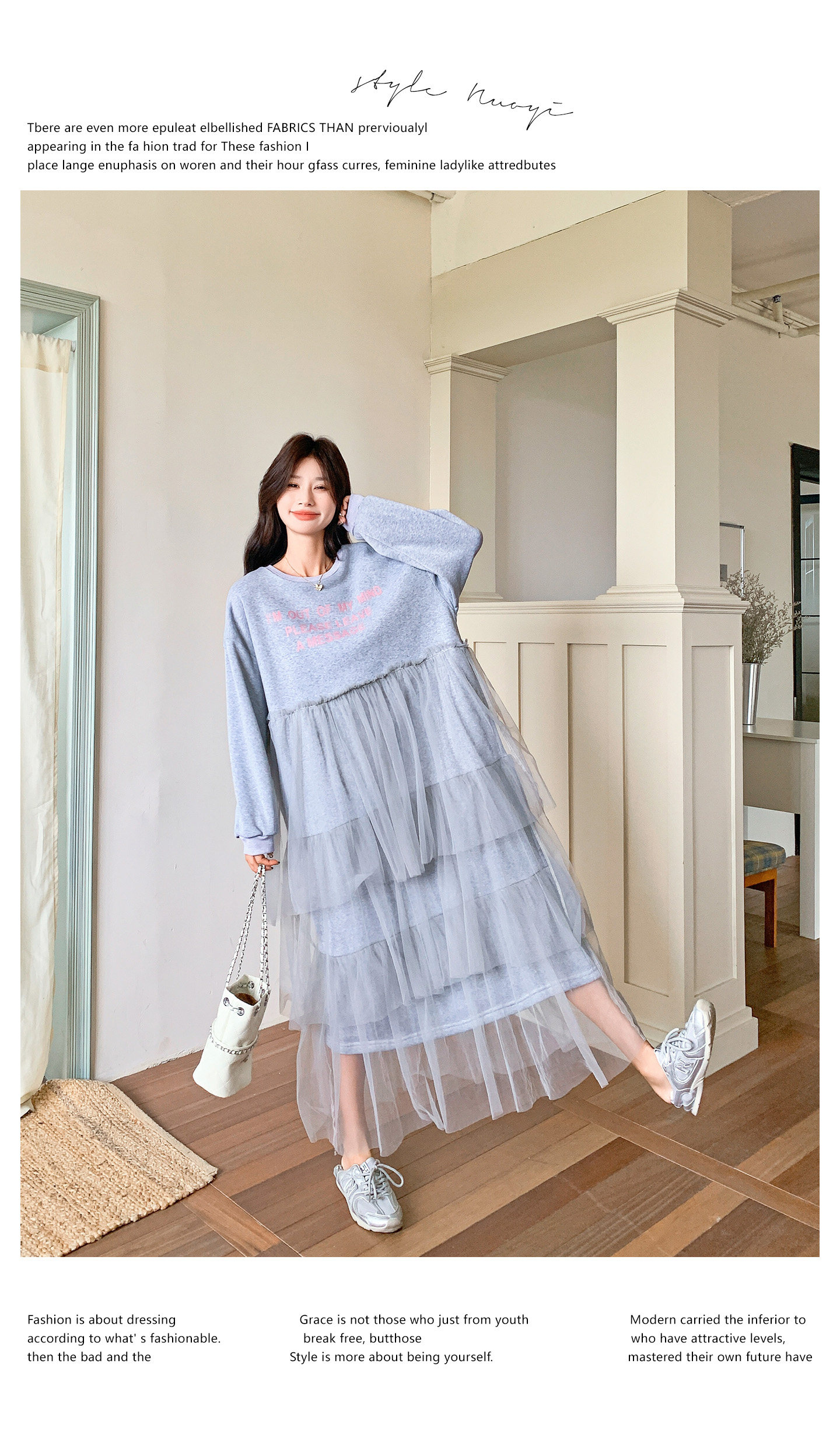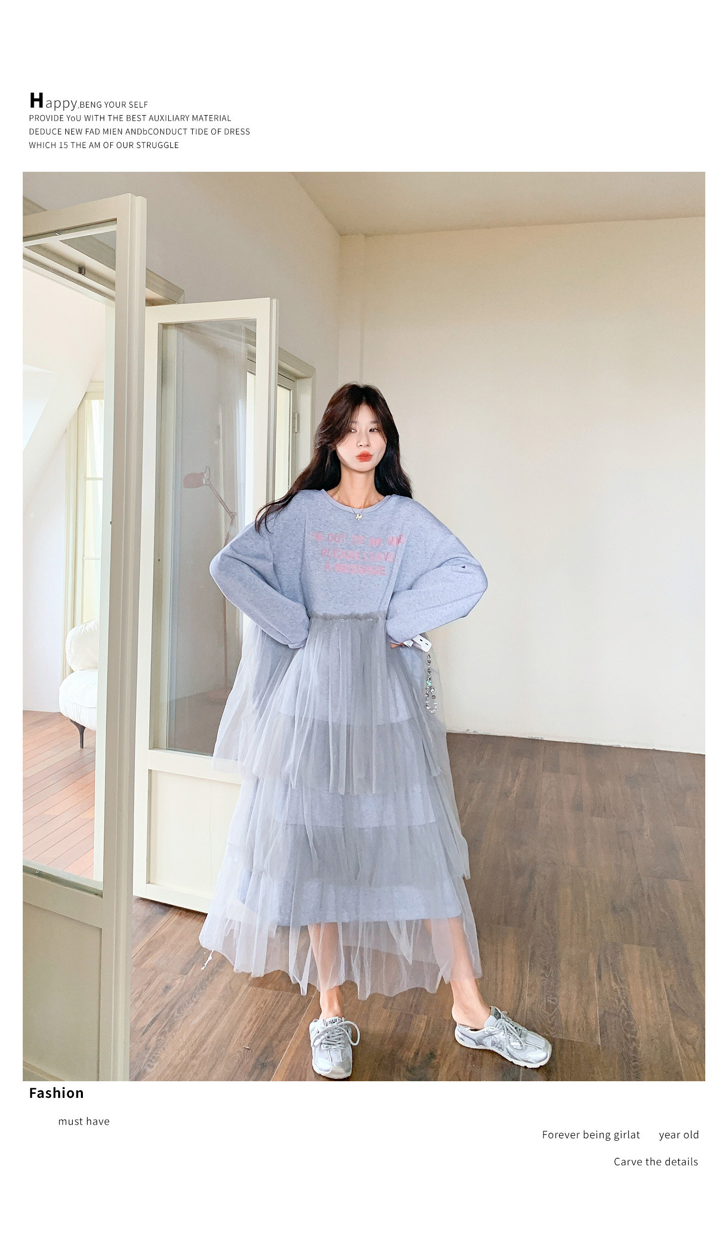 【ワンピース】カジュアル スリム見え チュール ミックス アルファベット 長袖ワンピース【JZシリーズ】