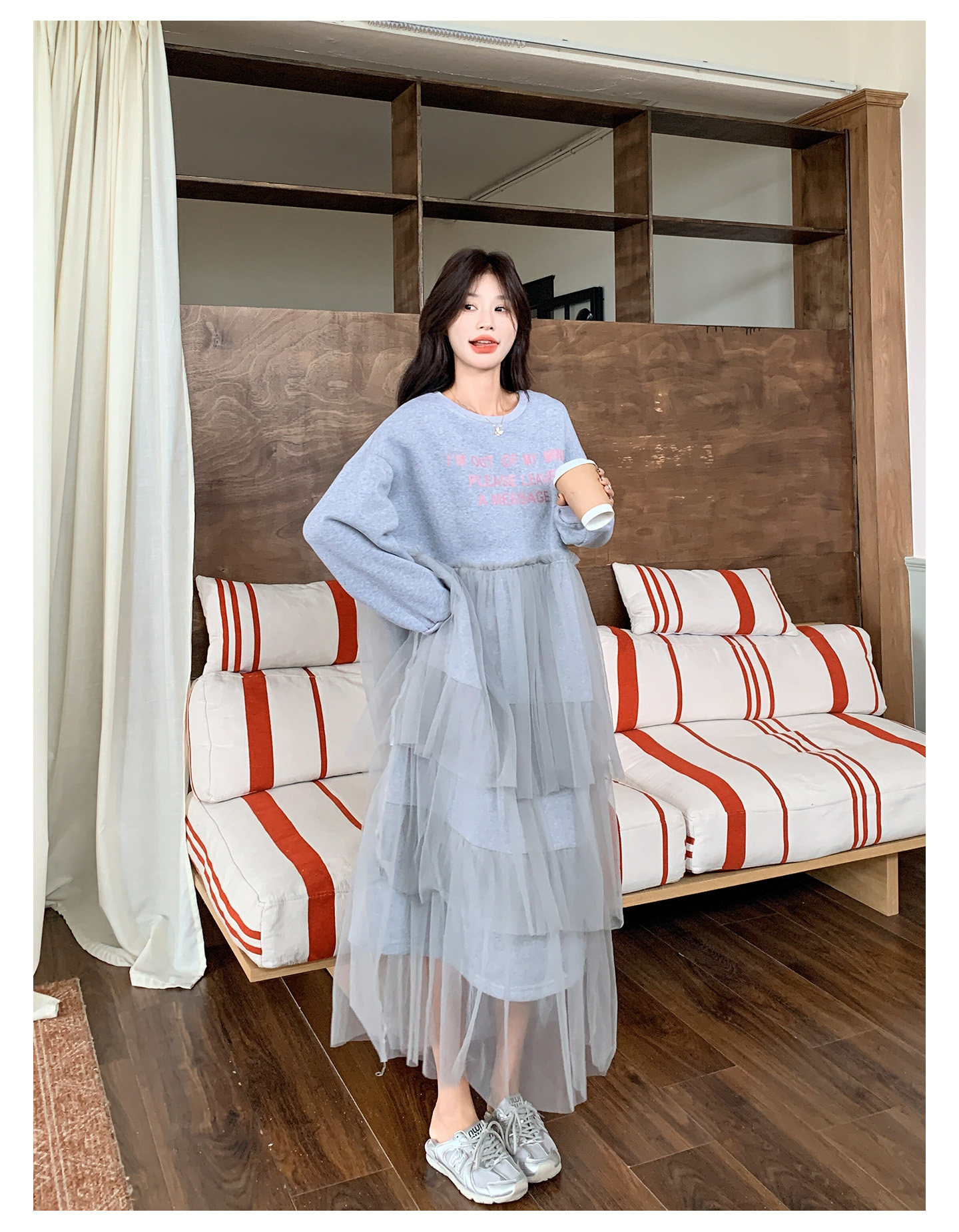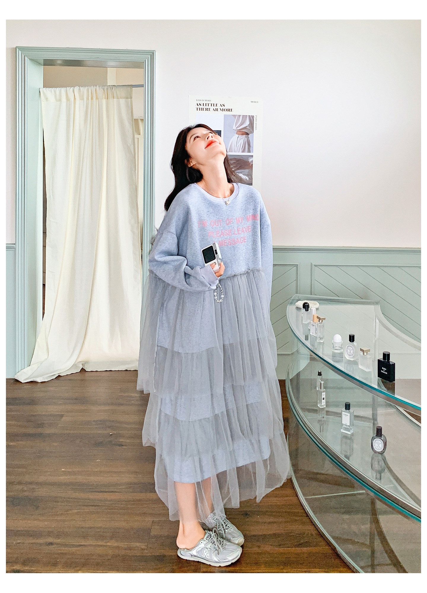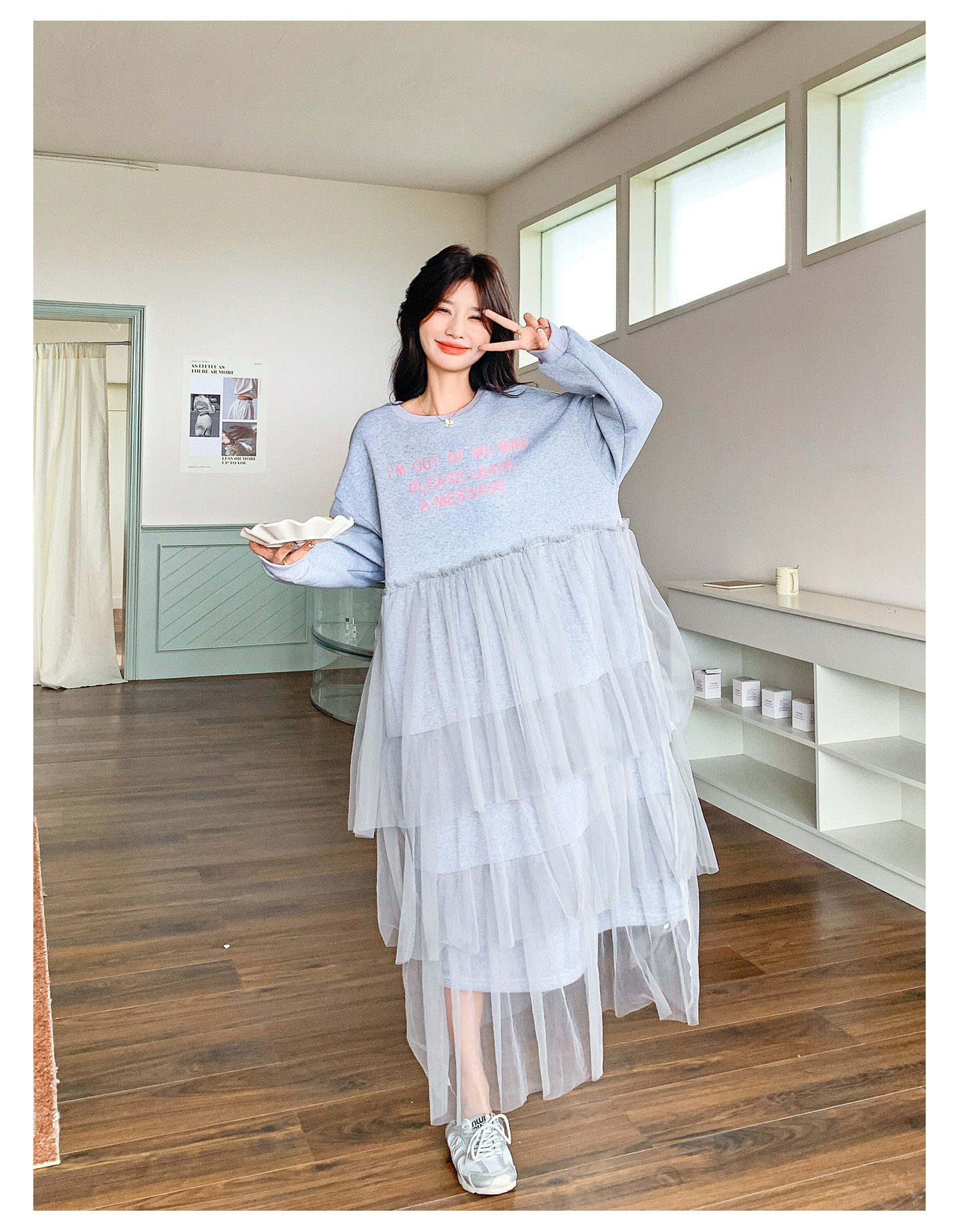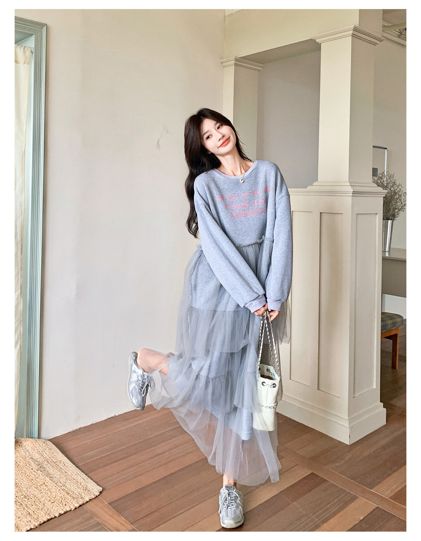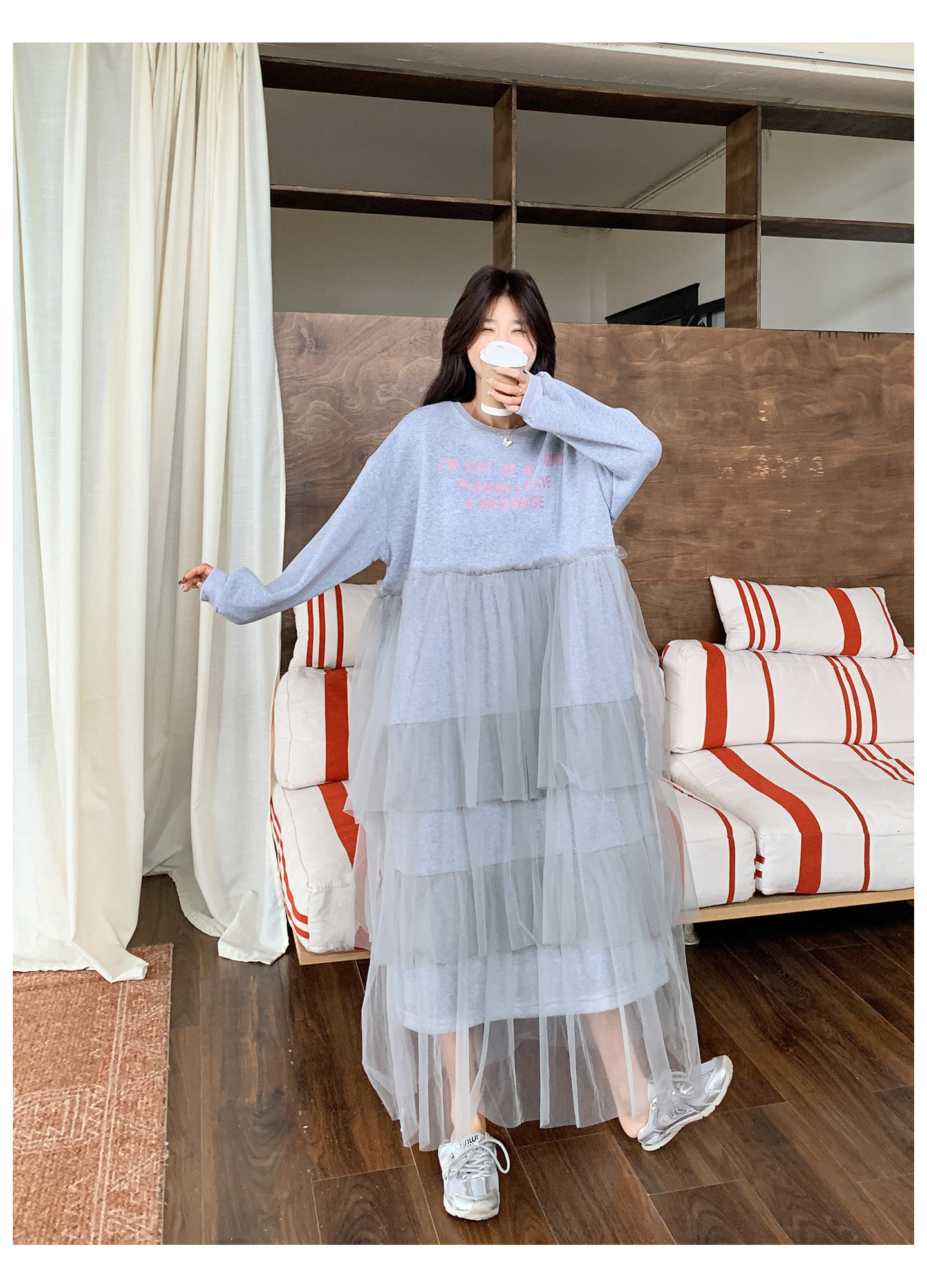 【ワンピース】カジュアル スリム見え チュール ミックス アルファベット 長袖ワンピース【JZシリーズ】