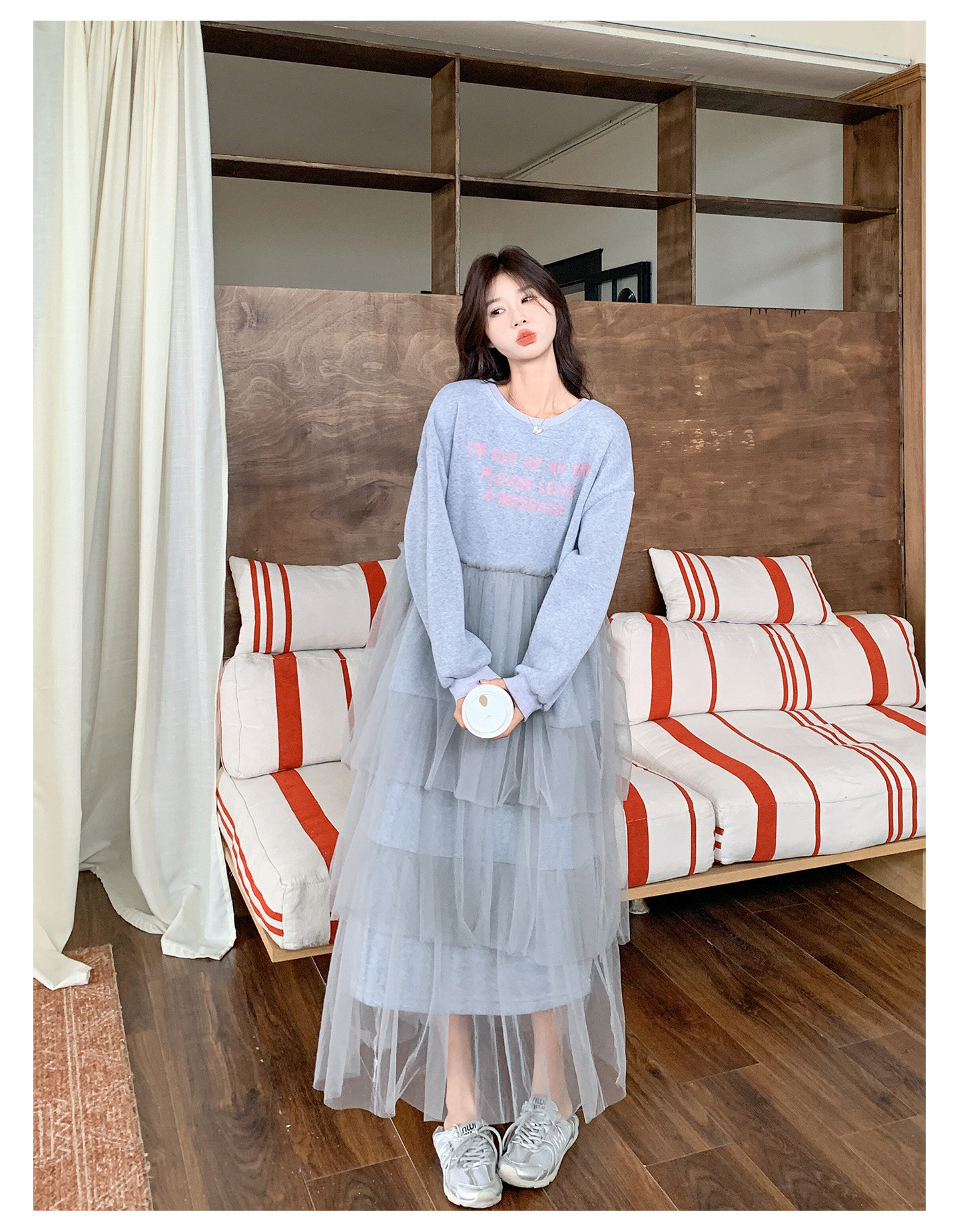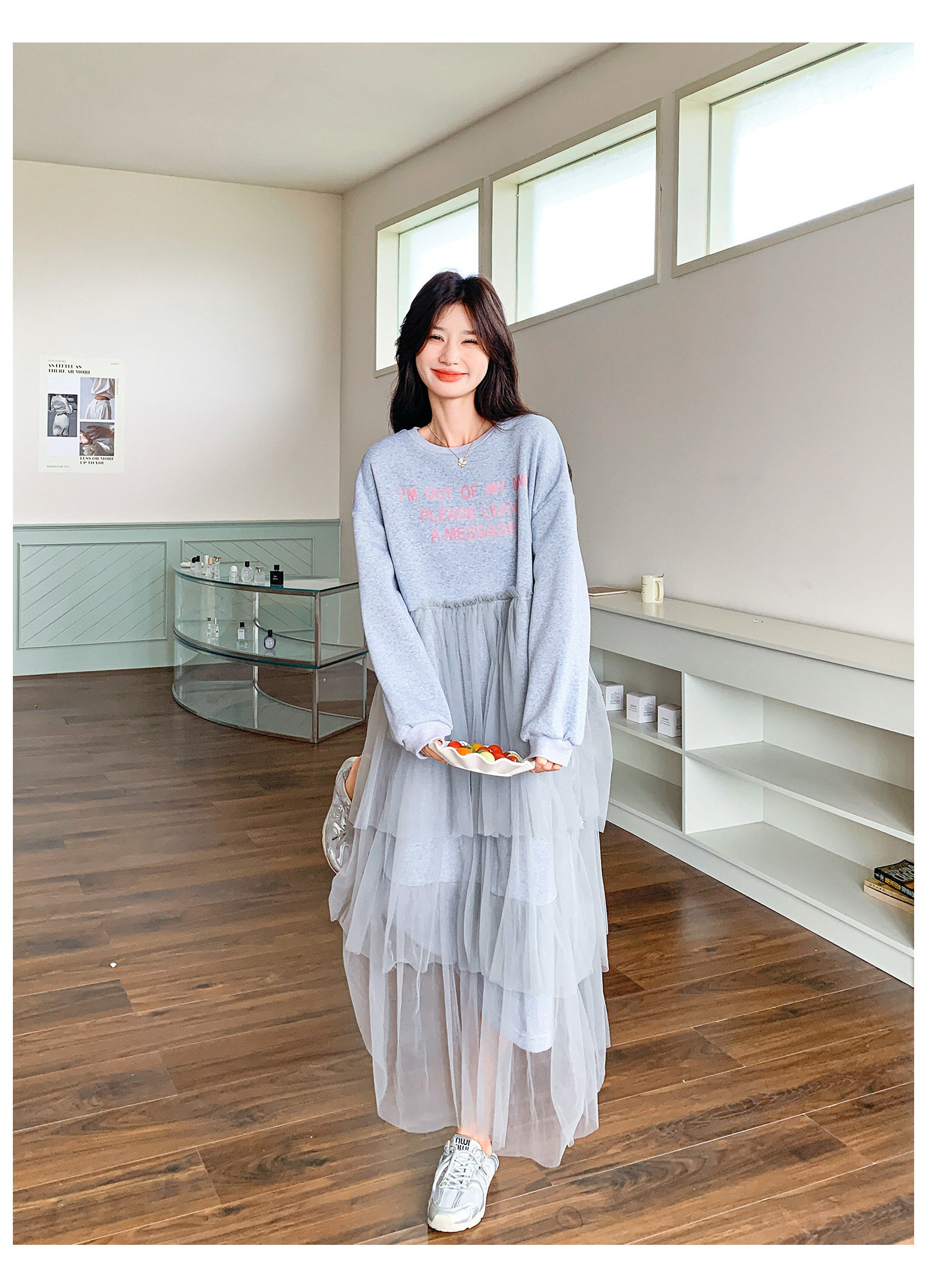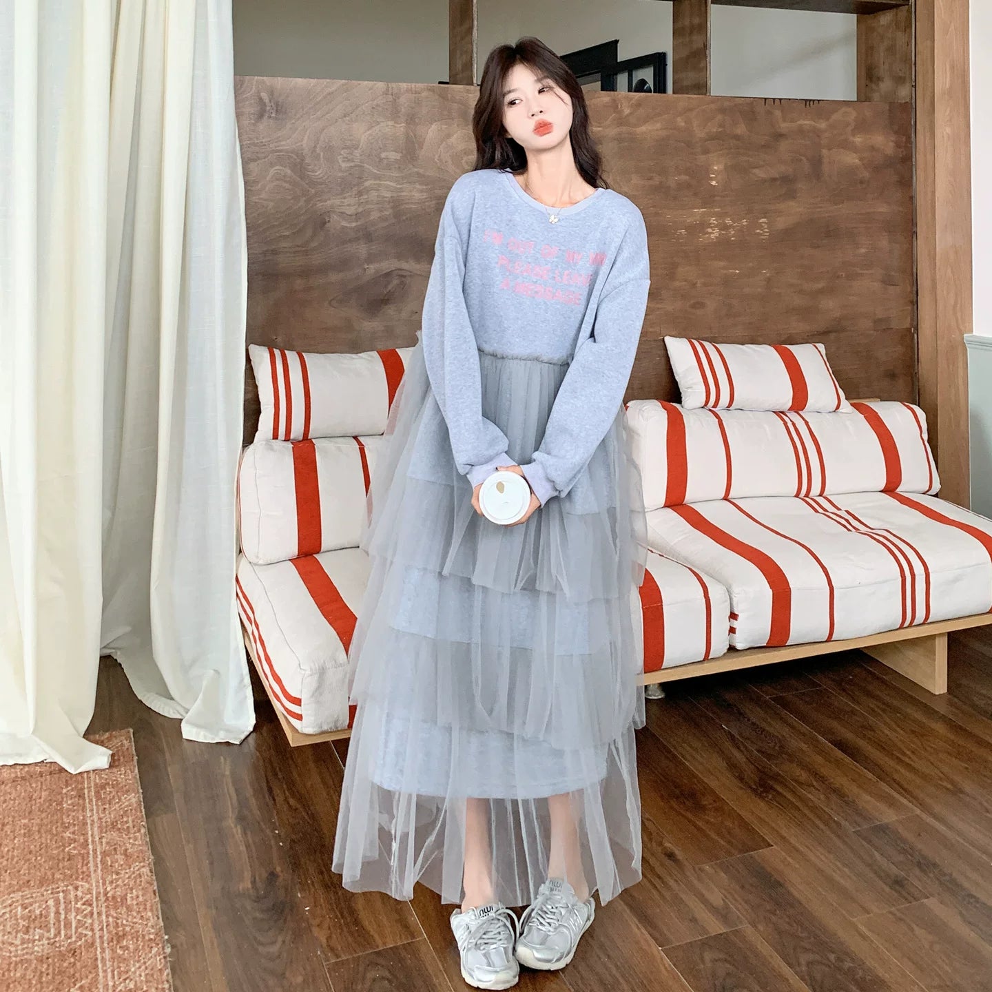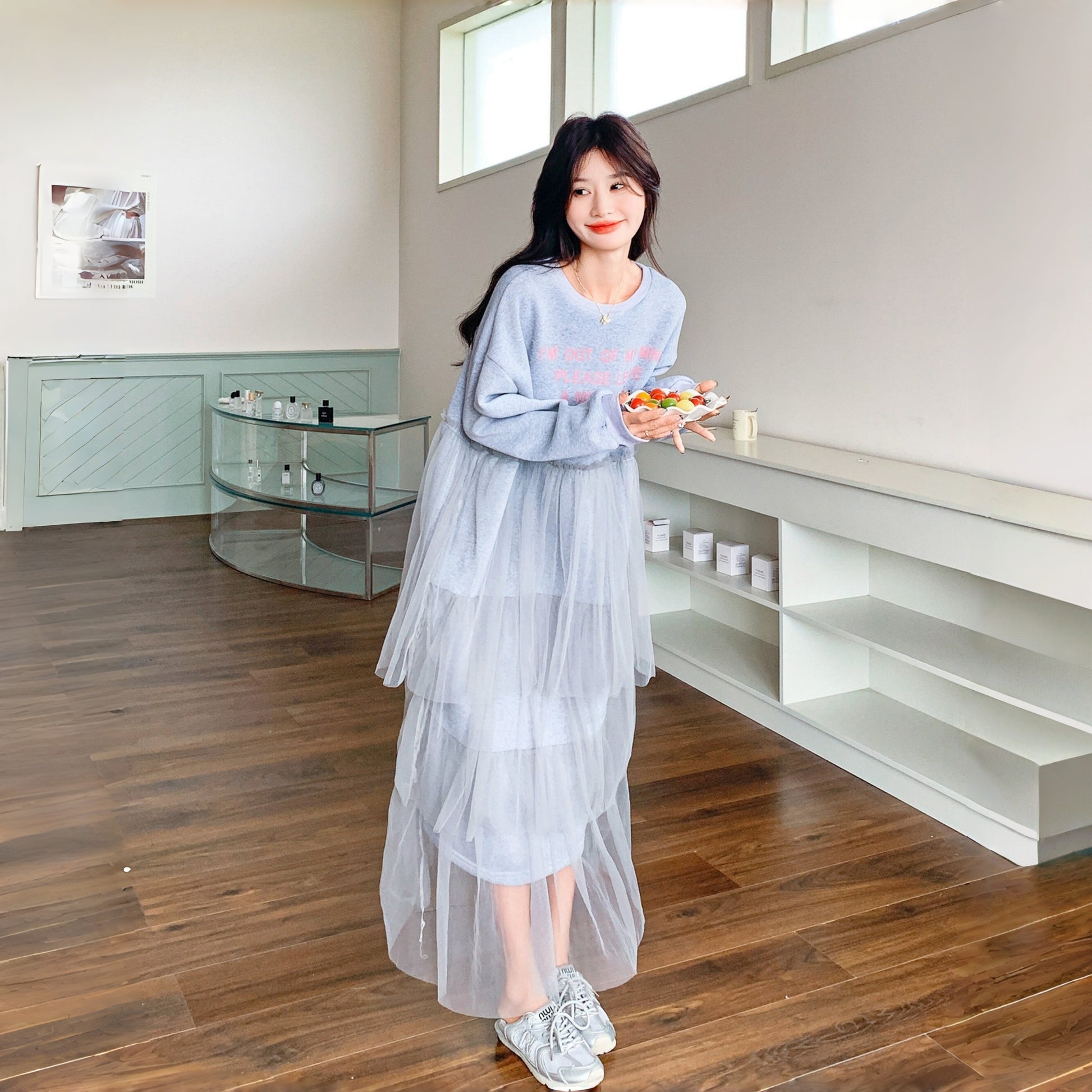 【ワンピース】カジュアル スリム見え チュール ミックス アルファベット 長袖ワンピース【JZシリーズ】