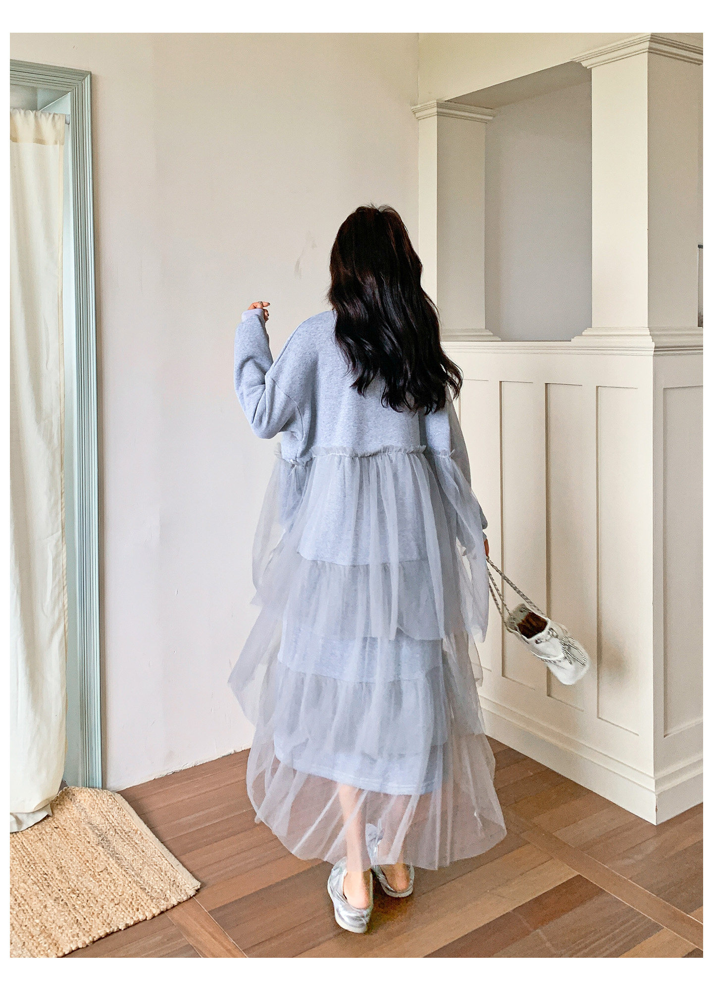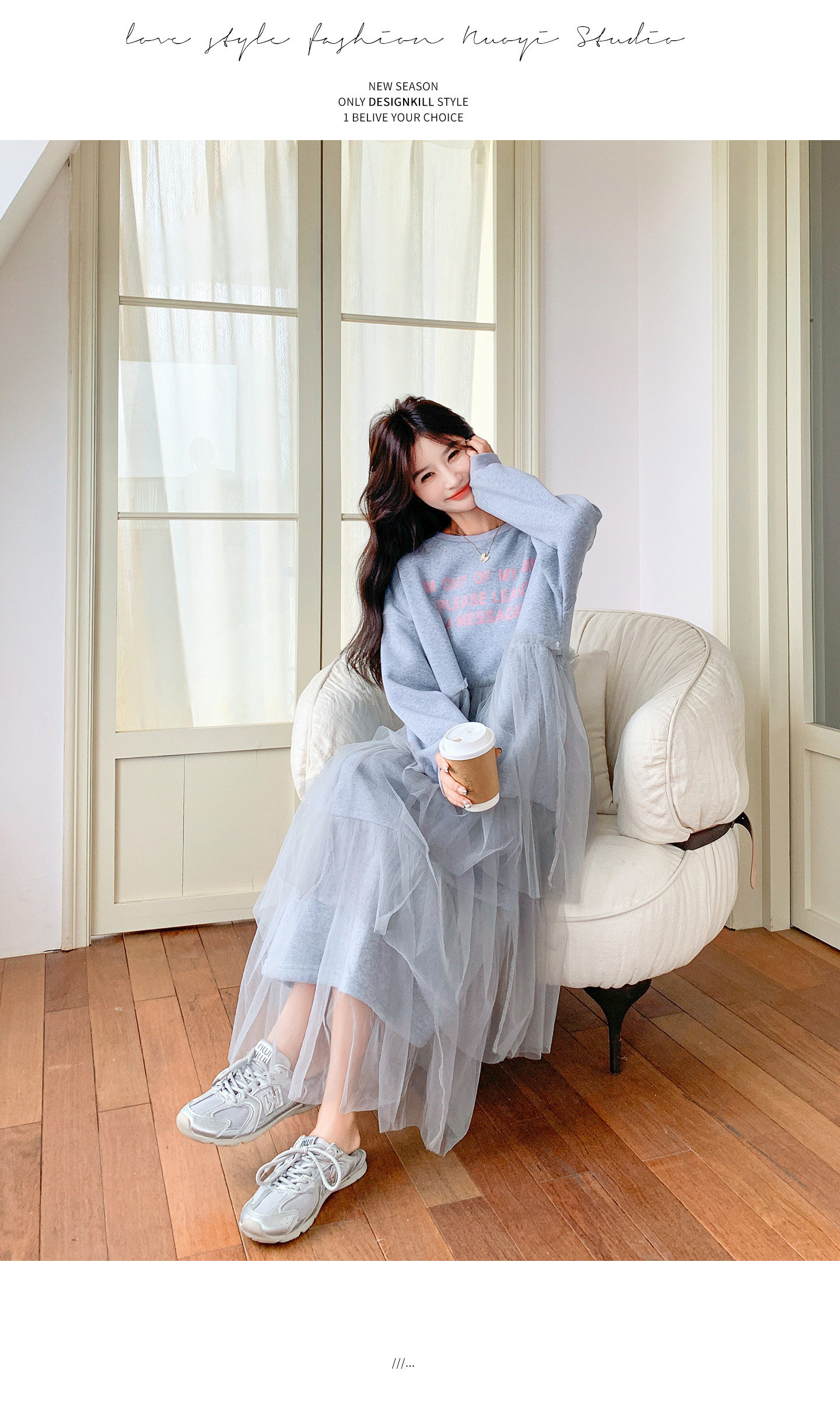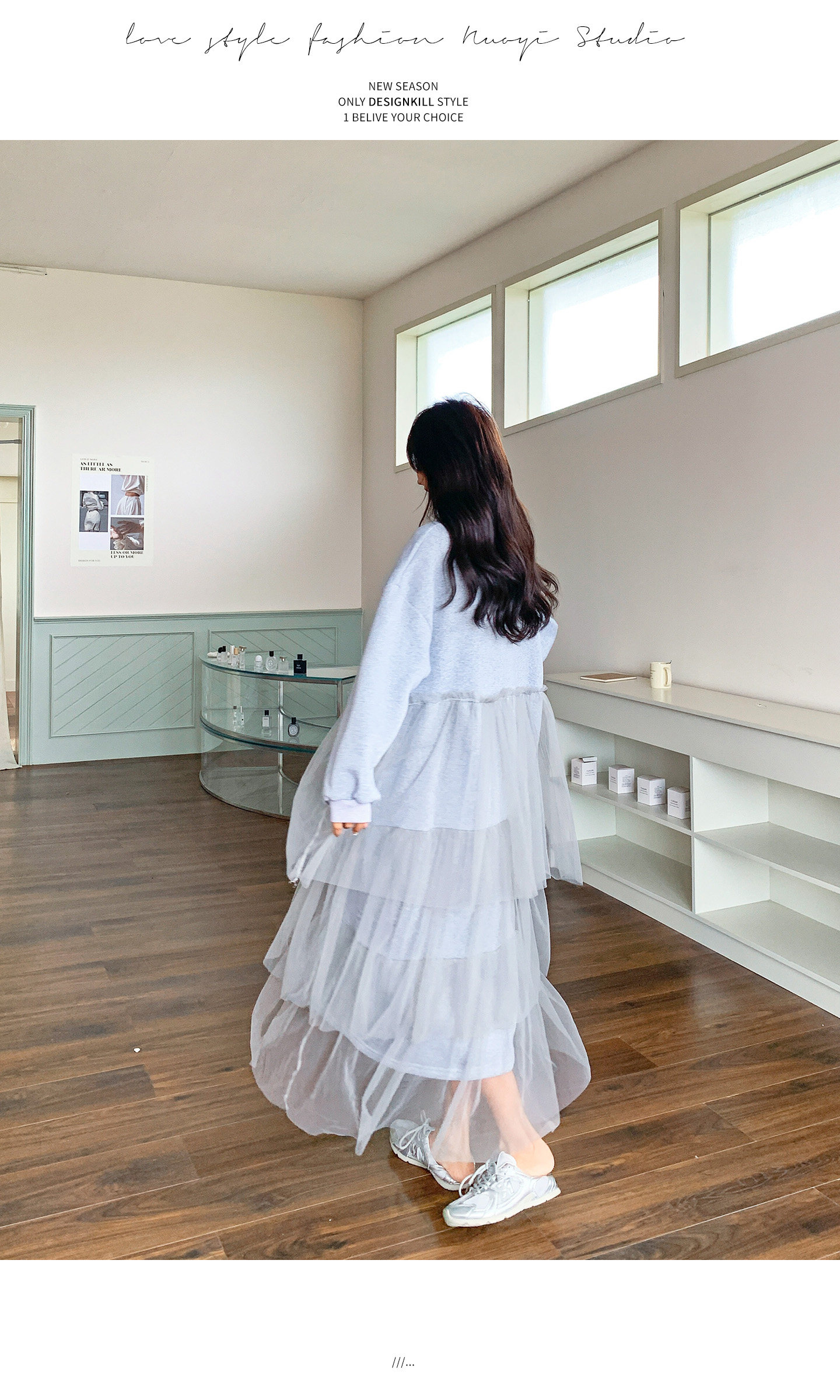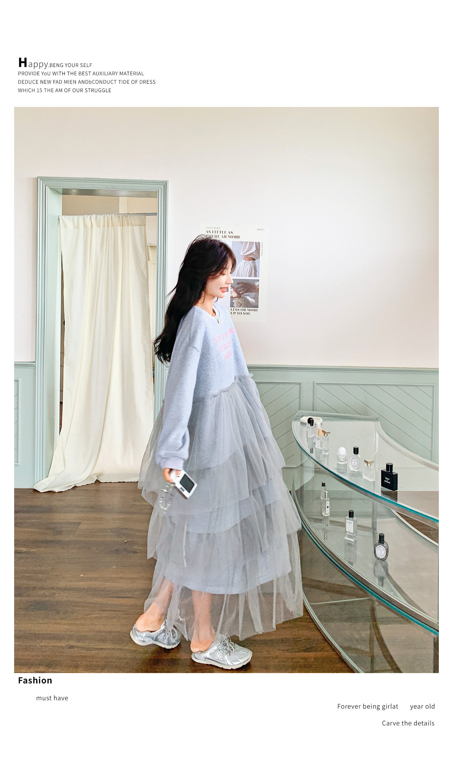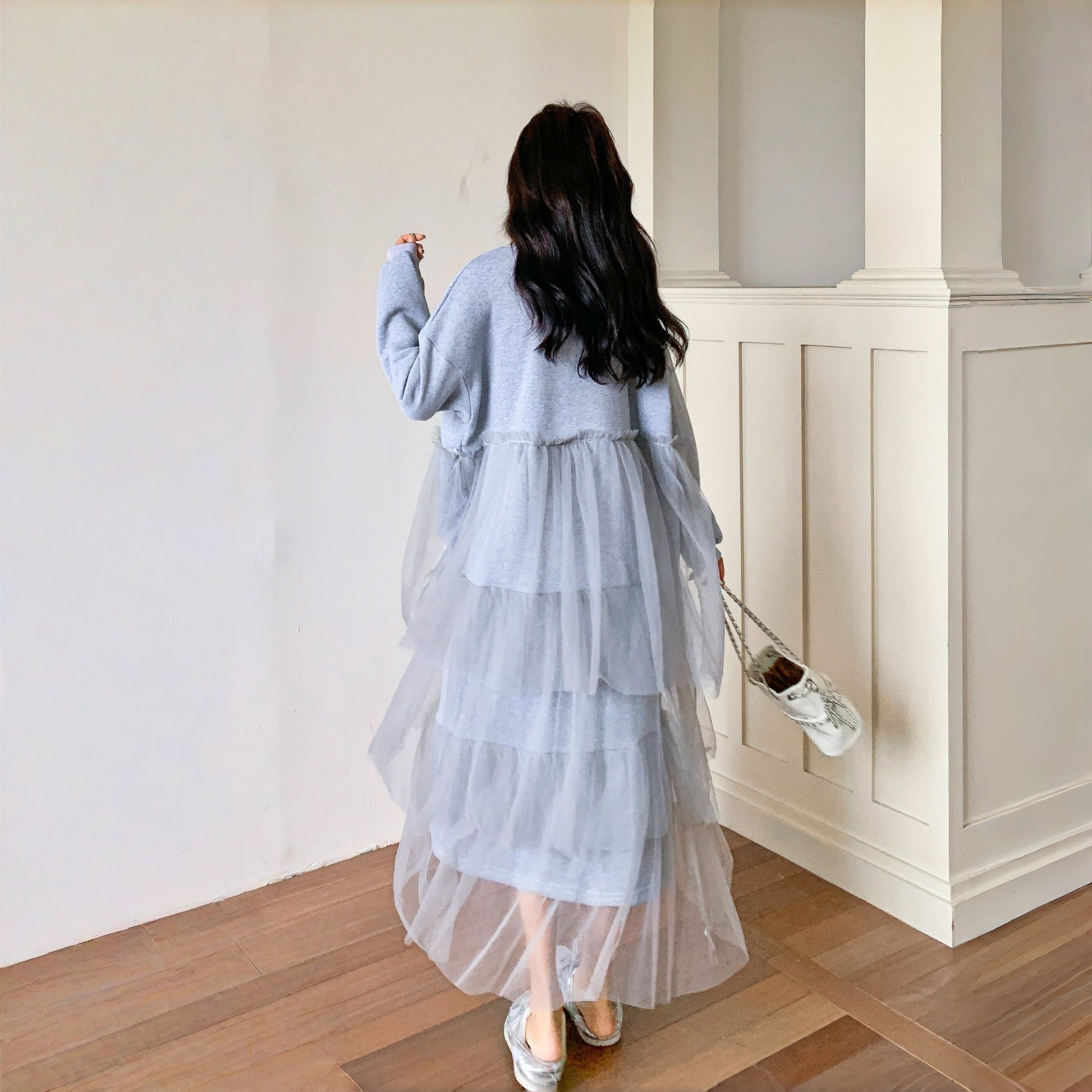 【ワンピース】カジュアル スリム見え チュール ミックス アルファベット 長袖ワンピース【JZシリーズ】