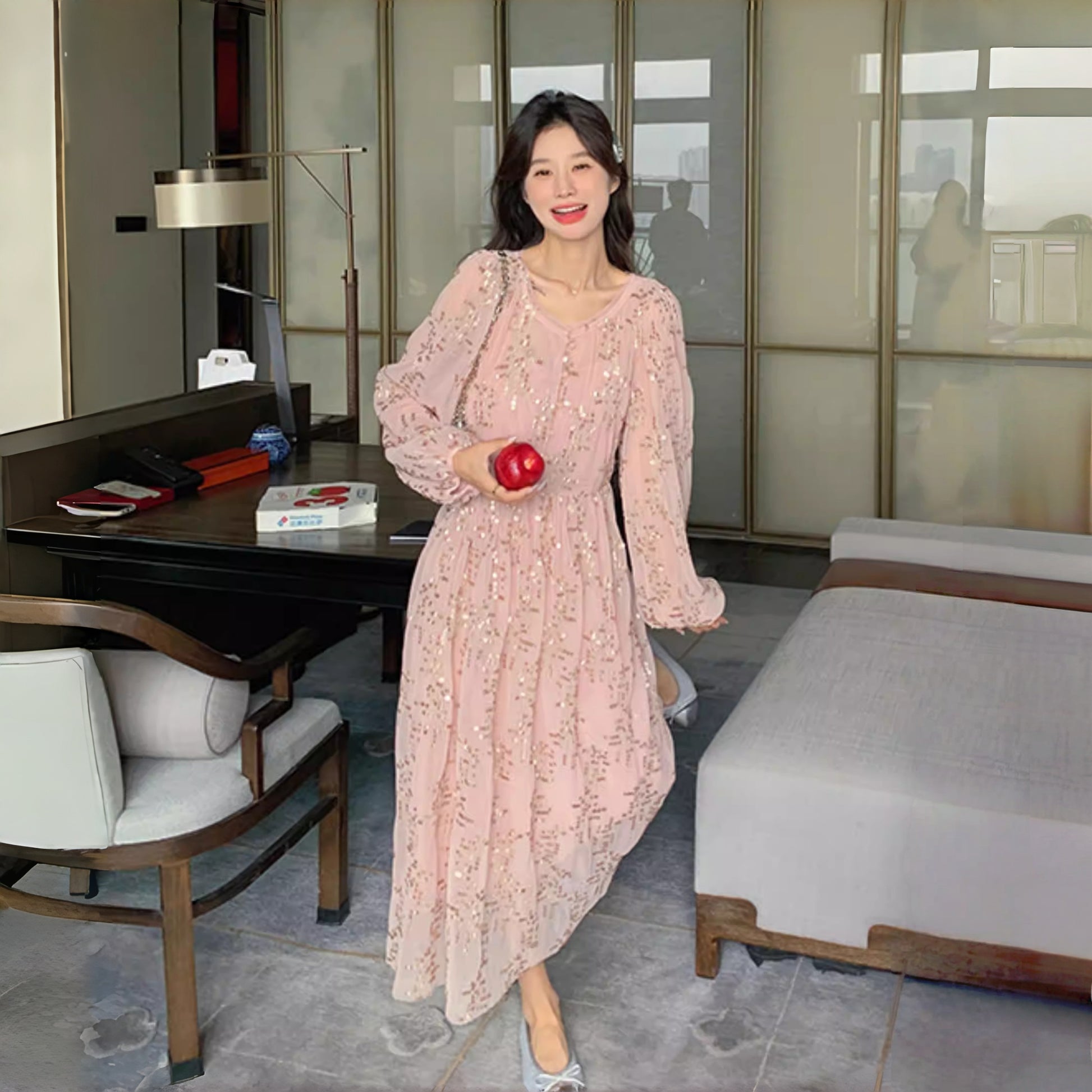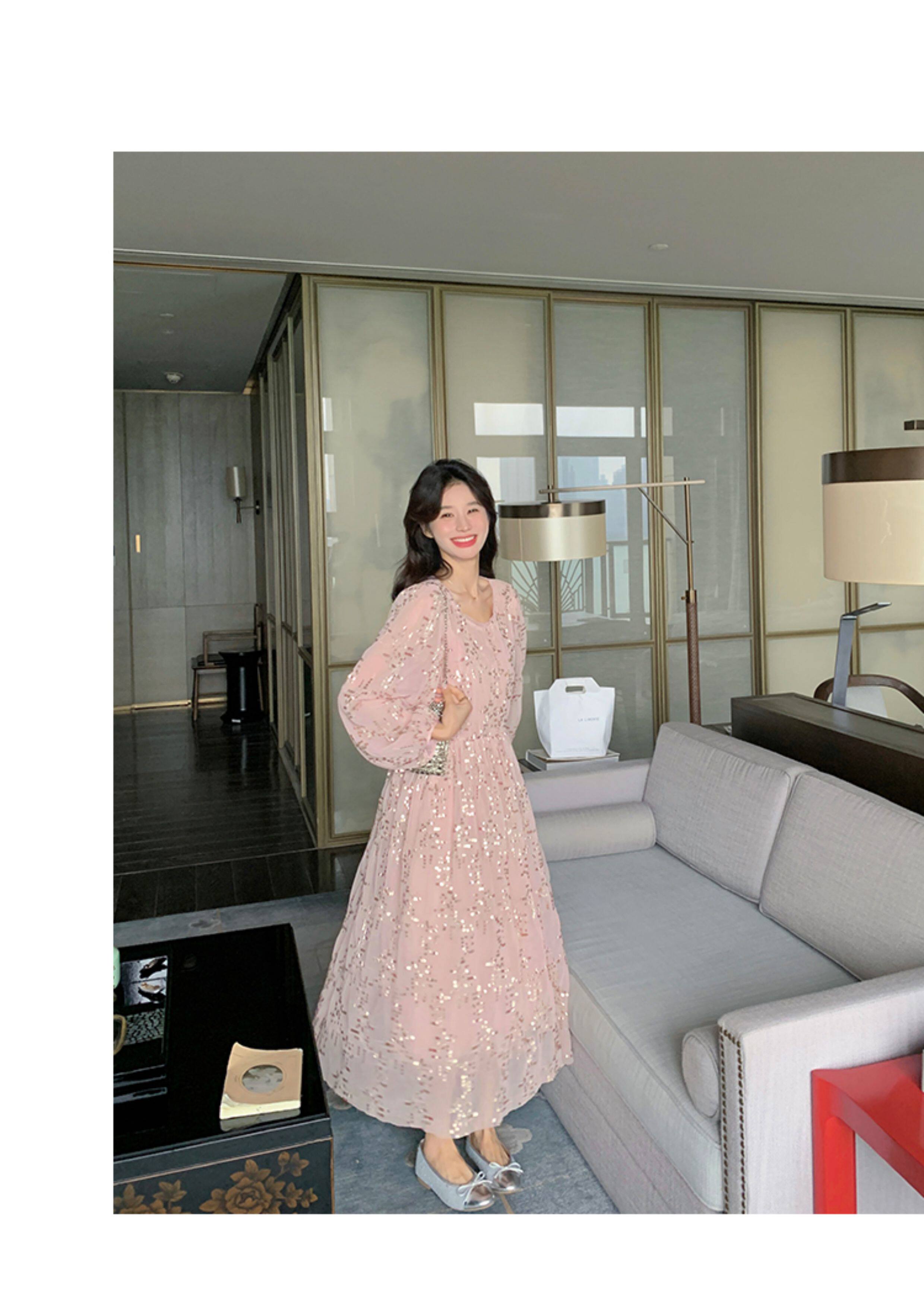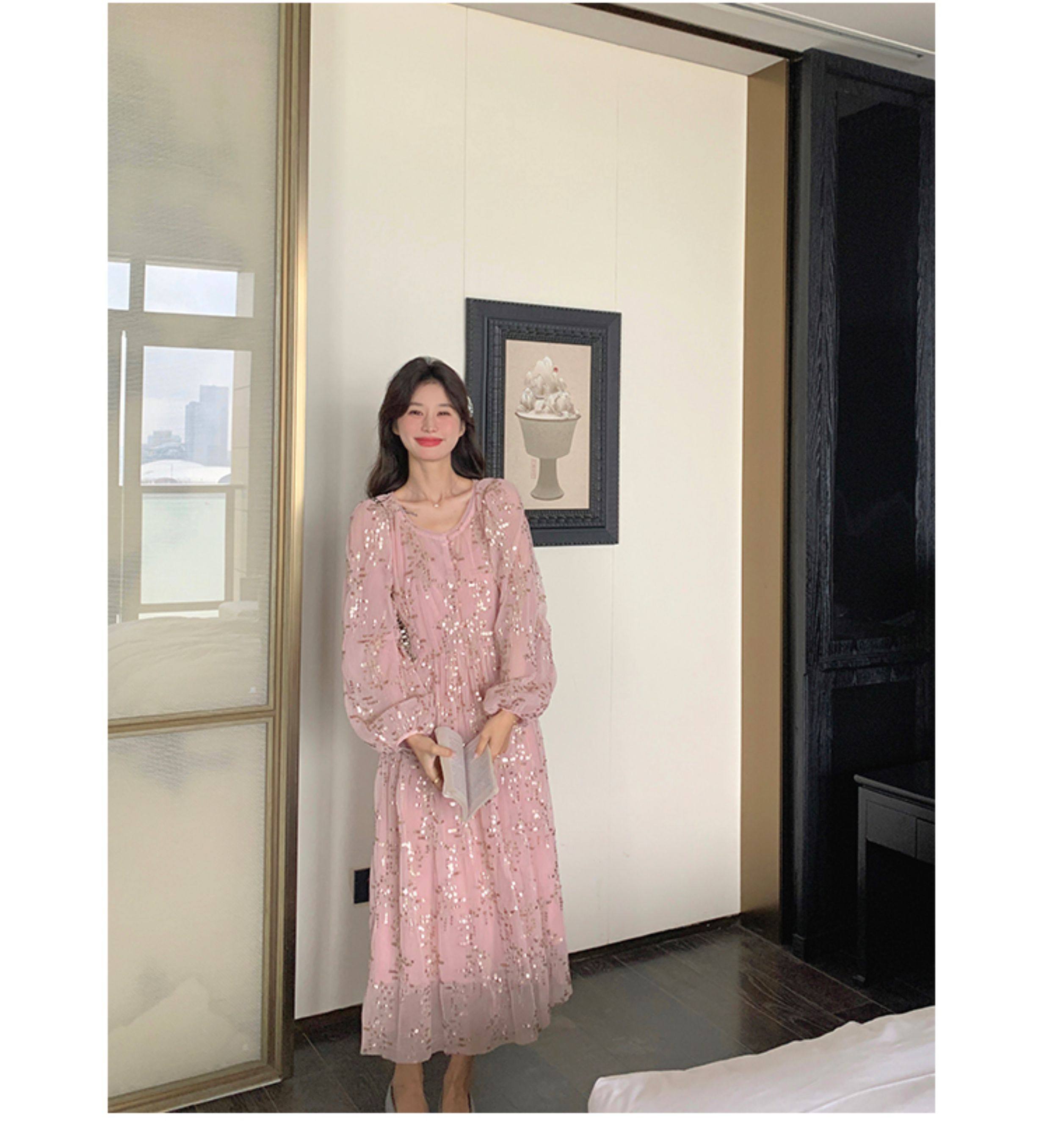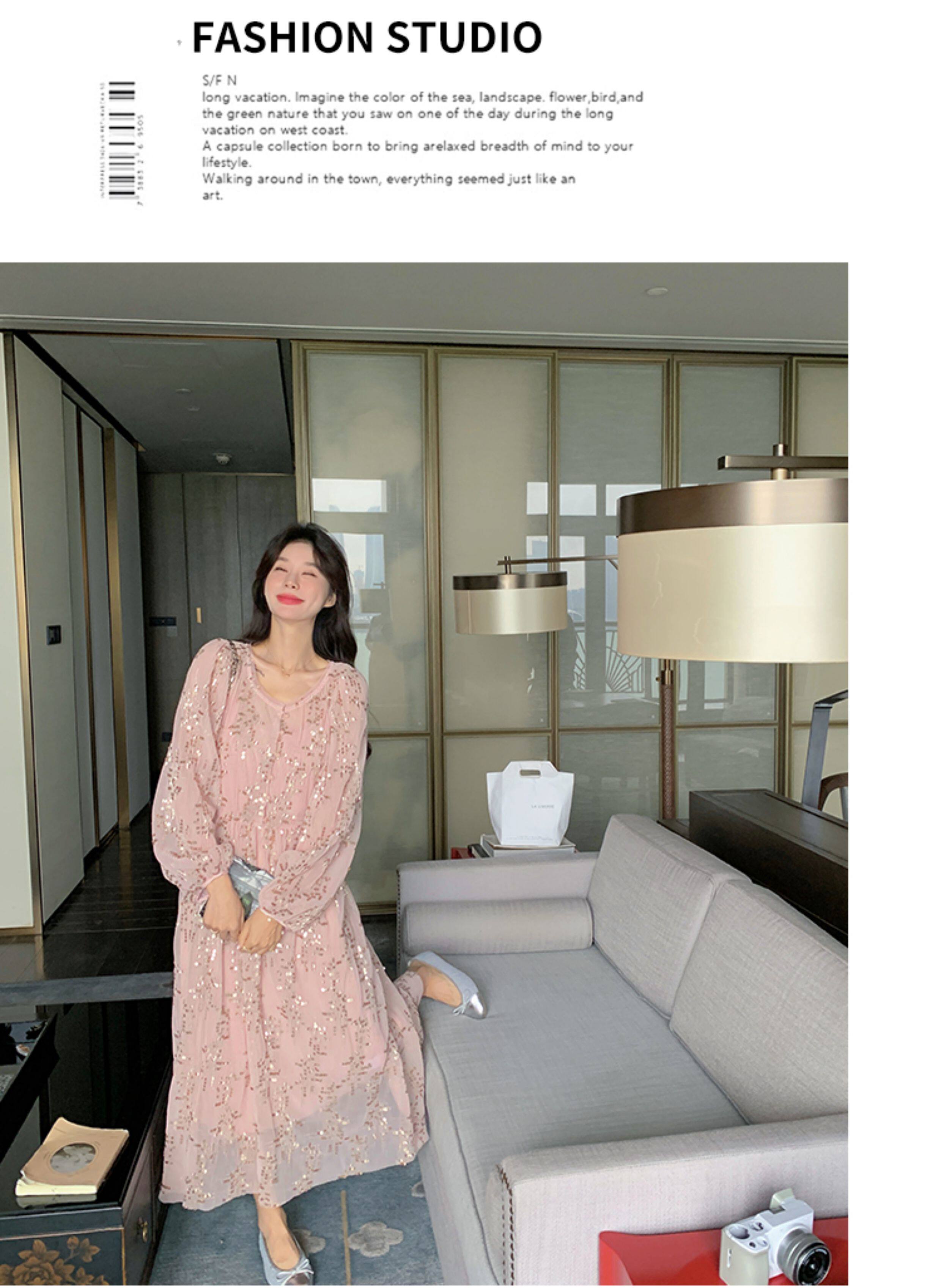 🔥人気急上昇中【ワンピース】刺繍長袖ワンピース 春秋冬 レディース フィット&フレア ウエストマーク エレガント ロングワンピ おしゃれ映え【SHシリーズ】