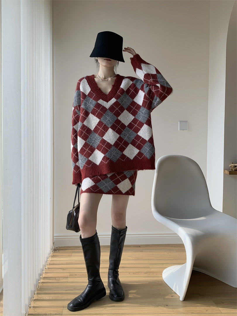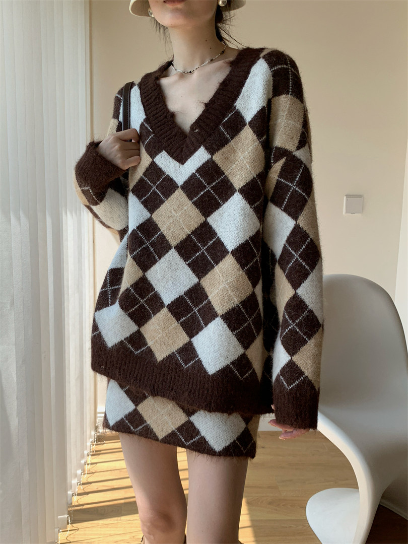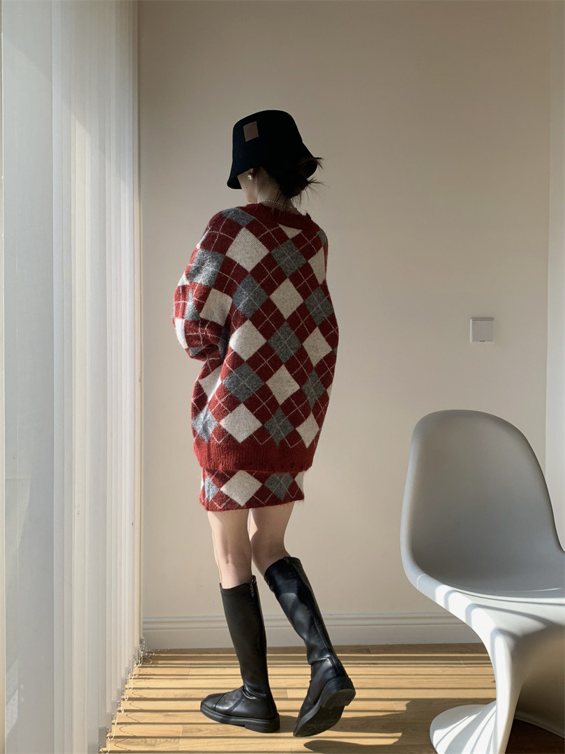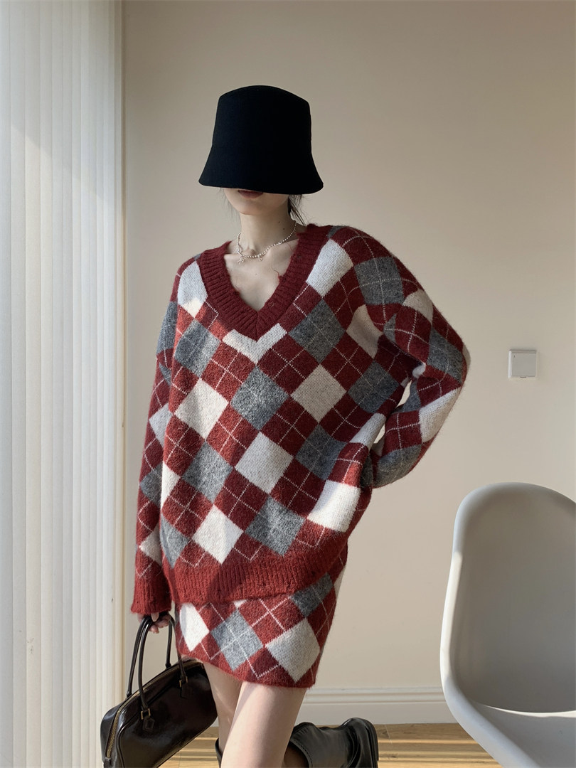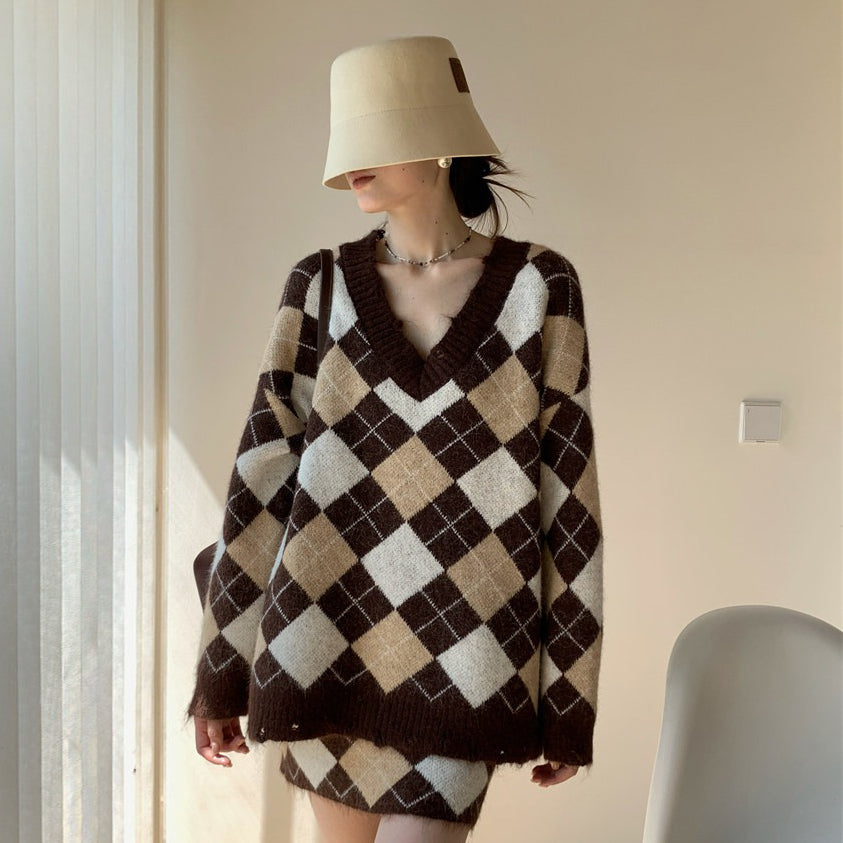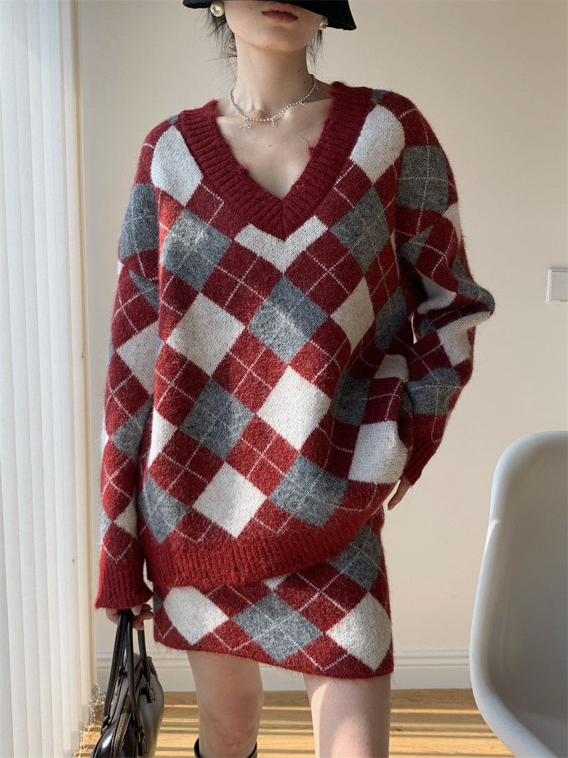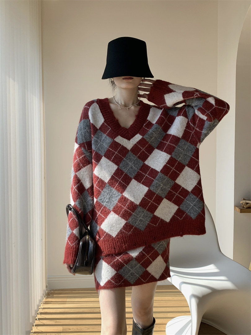 【セットアップ】Vネック プルオーバー ダメージ加工 ゆったり レトロ ダイヤ柄 ニット + Aライン ニットミニスカート 上下セット【JZシリーズ】