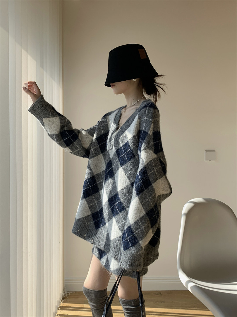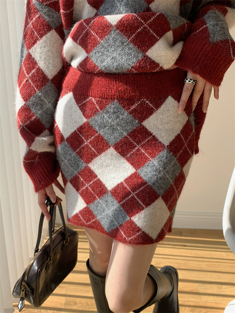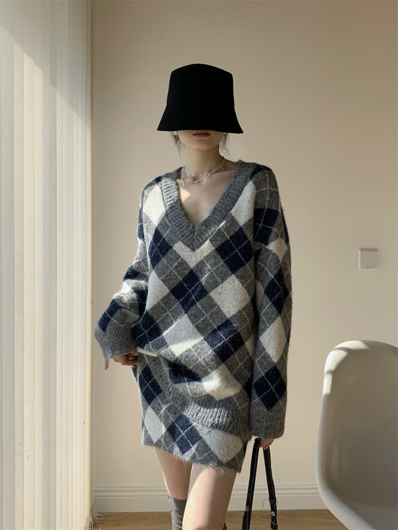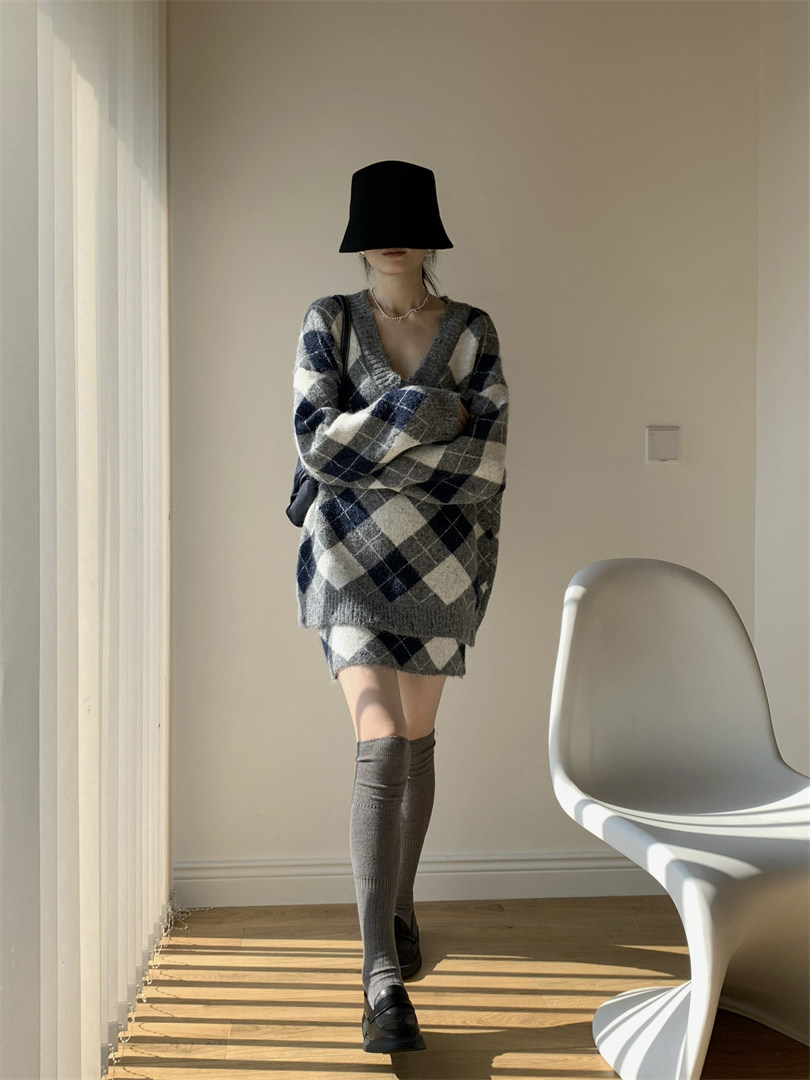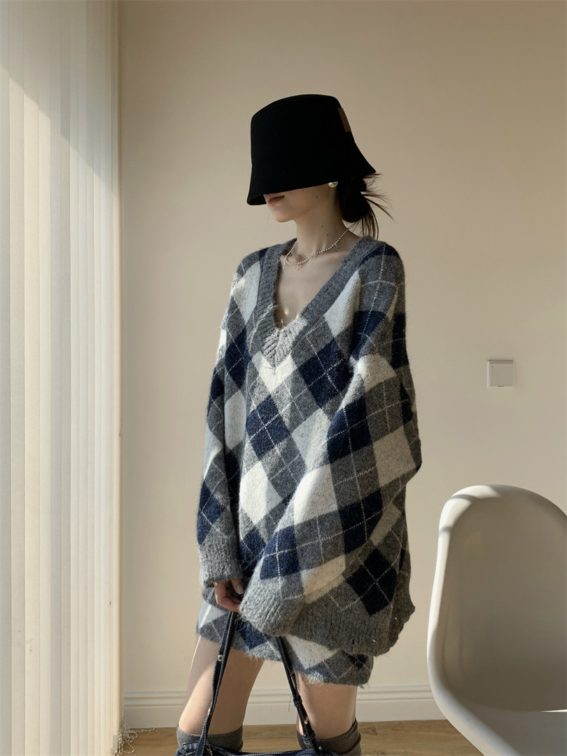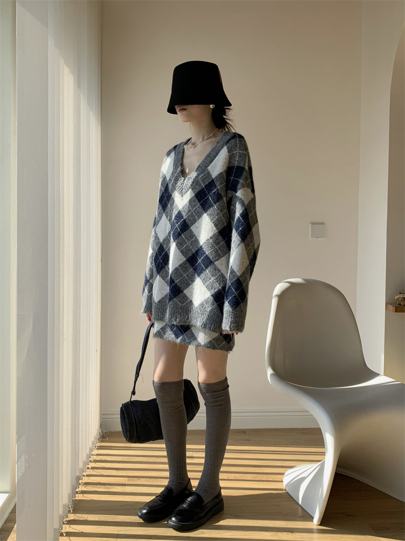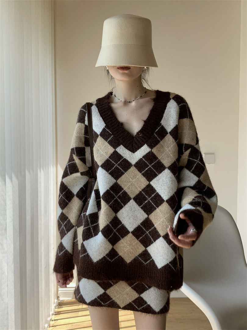 【セットアップ】Vネック プルオーバー ダメージ加工 ゆったり レトロ ダイヤ柄 ニット + Aライン ニットミニスカート 上下セット【JZシリーズ】