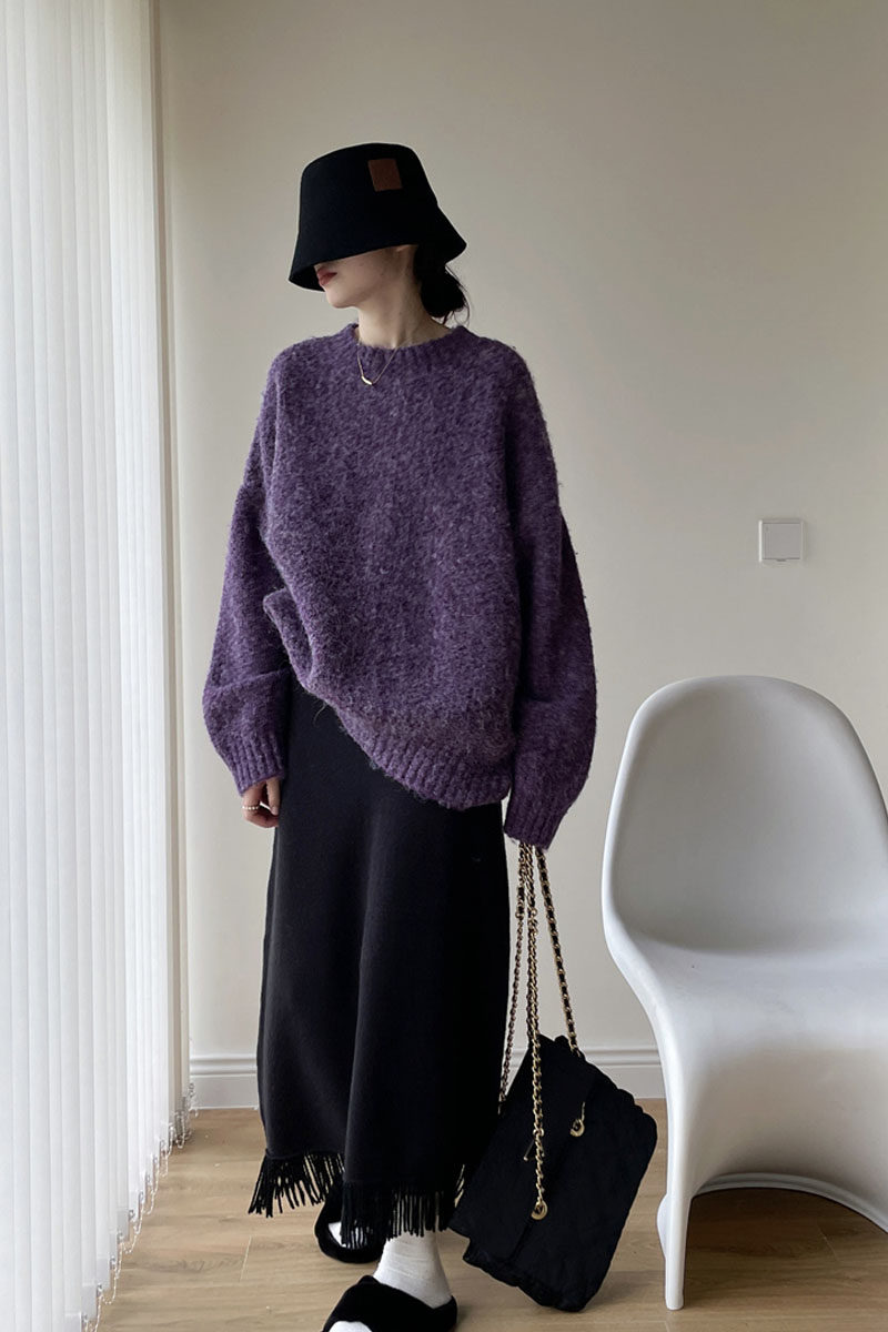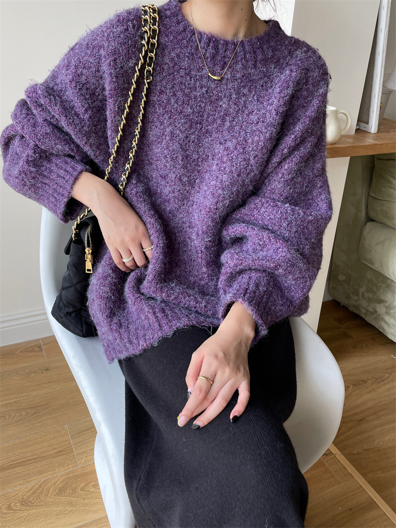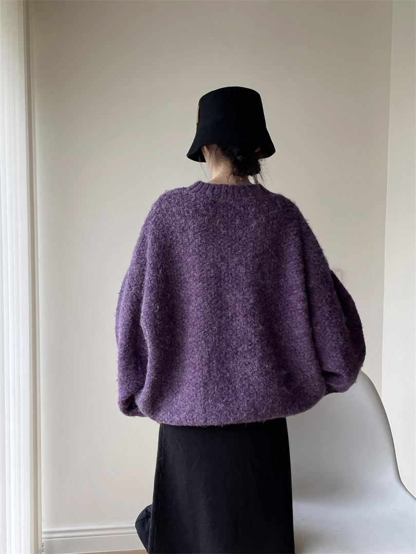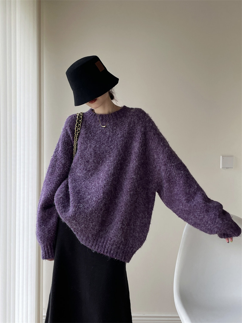 【トップス】シンプル ラフ サークルフリース ふわふわ ゆったり 丸首 プルオーバー ニット パープル レディース【JZシリーズ】