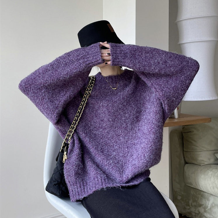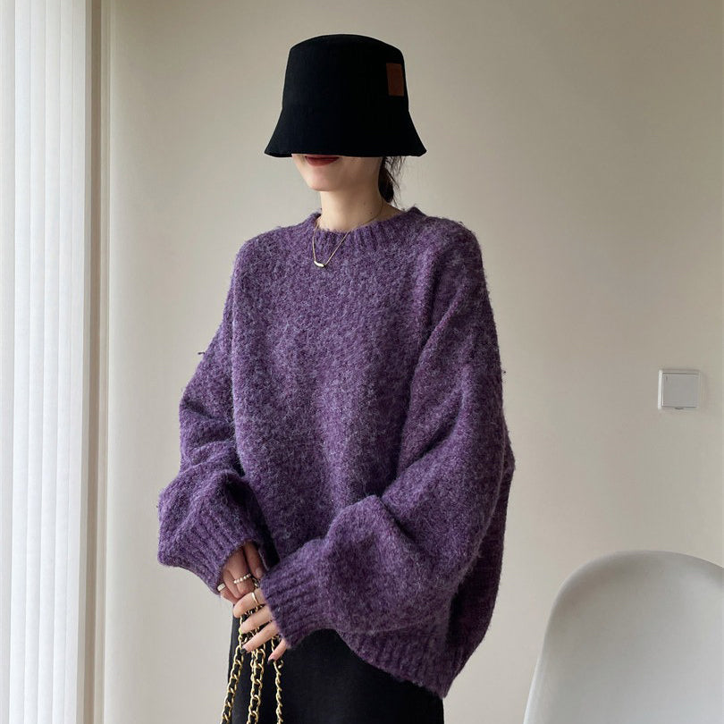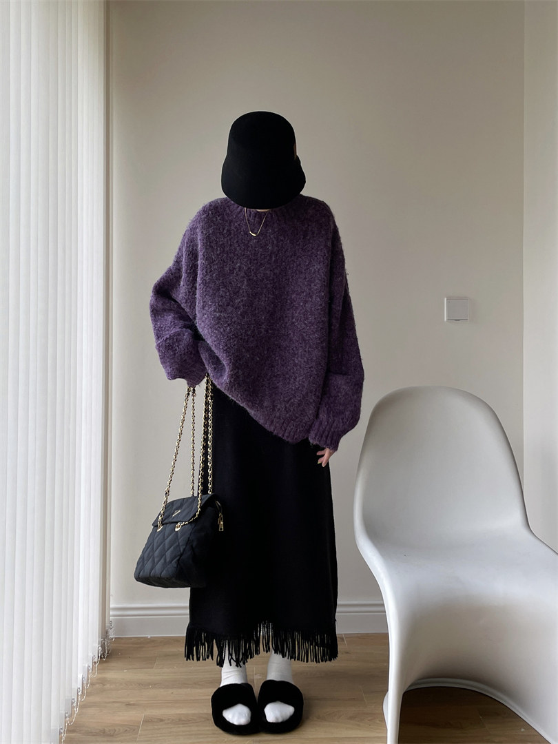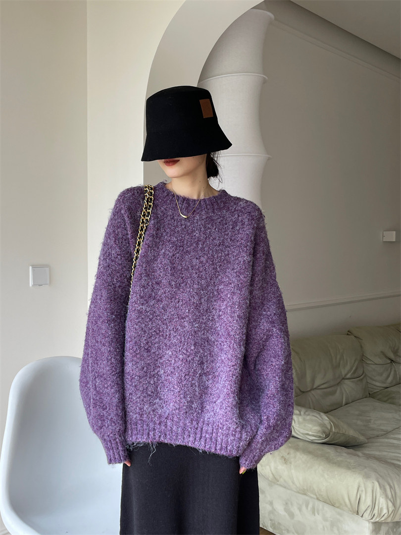 【トップス】シンプル ラフ サークルフリース ふわふわ ゆったり 丸首 プルオーバー ニット パープル レディース【JZシリーズ】
