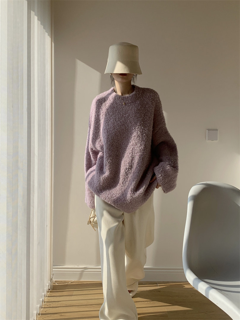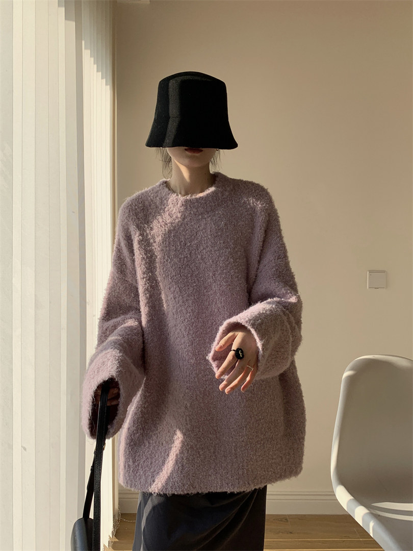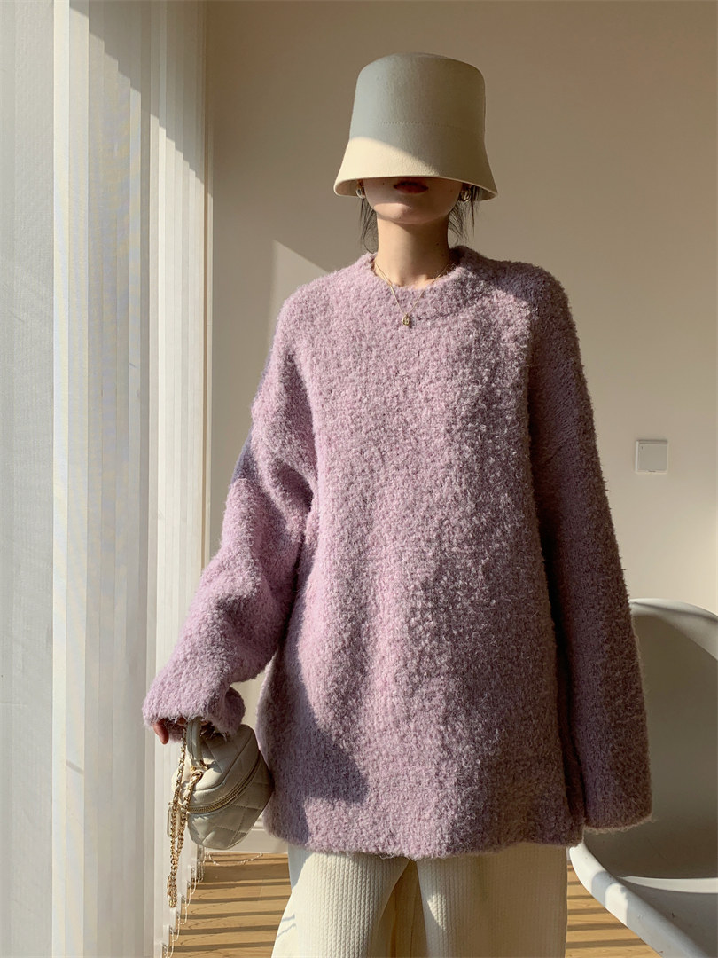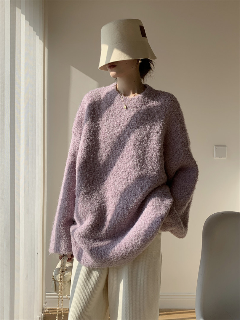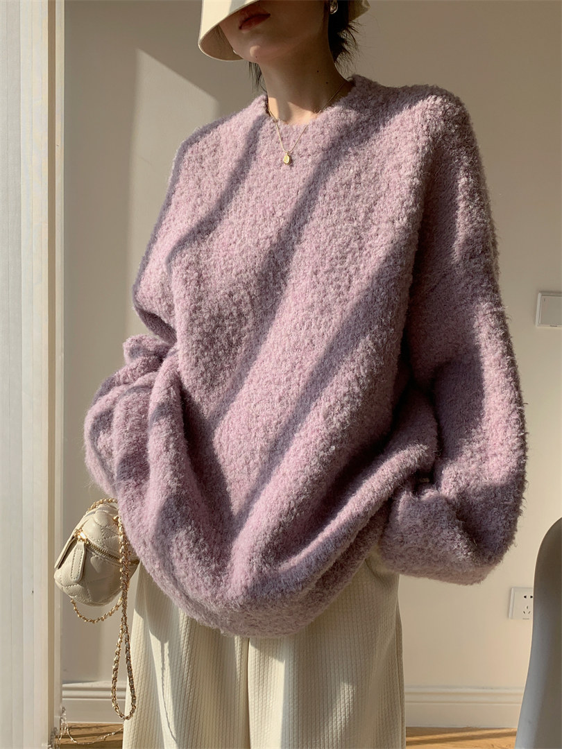 【トップス】シンプル ラフ サークルフリース ふわふわ ゆったり 丸首 プルオーバー ニット パープル レディース【JZシリーズ】